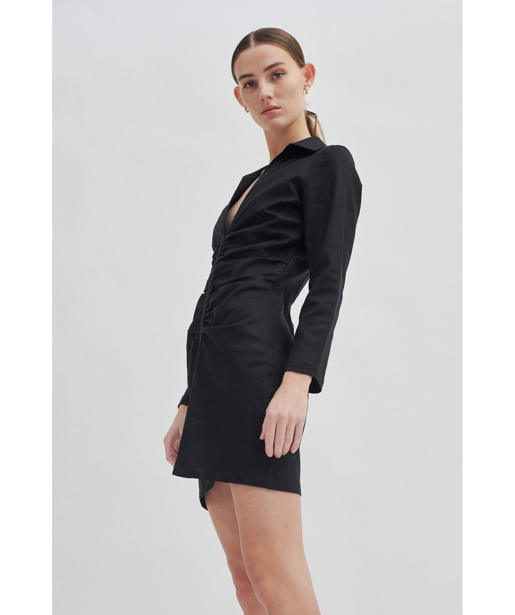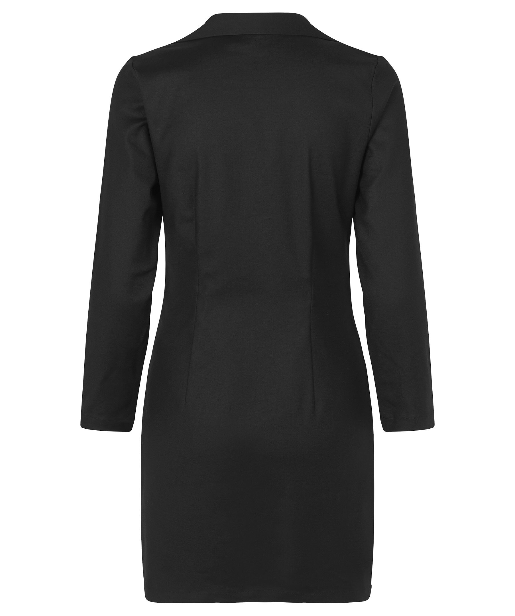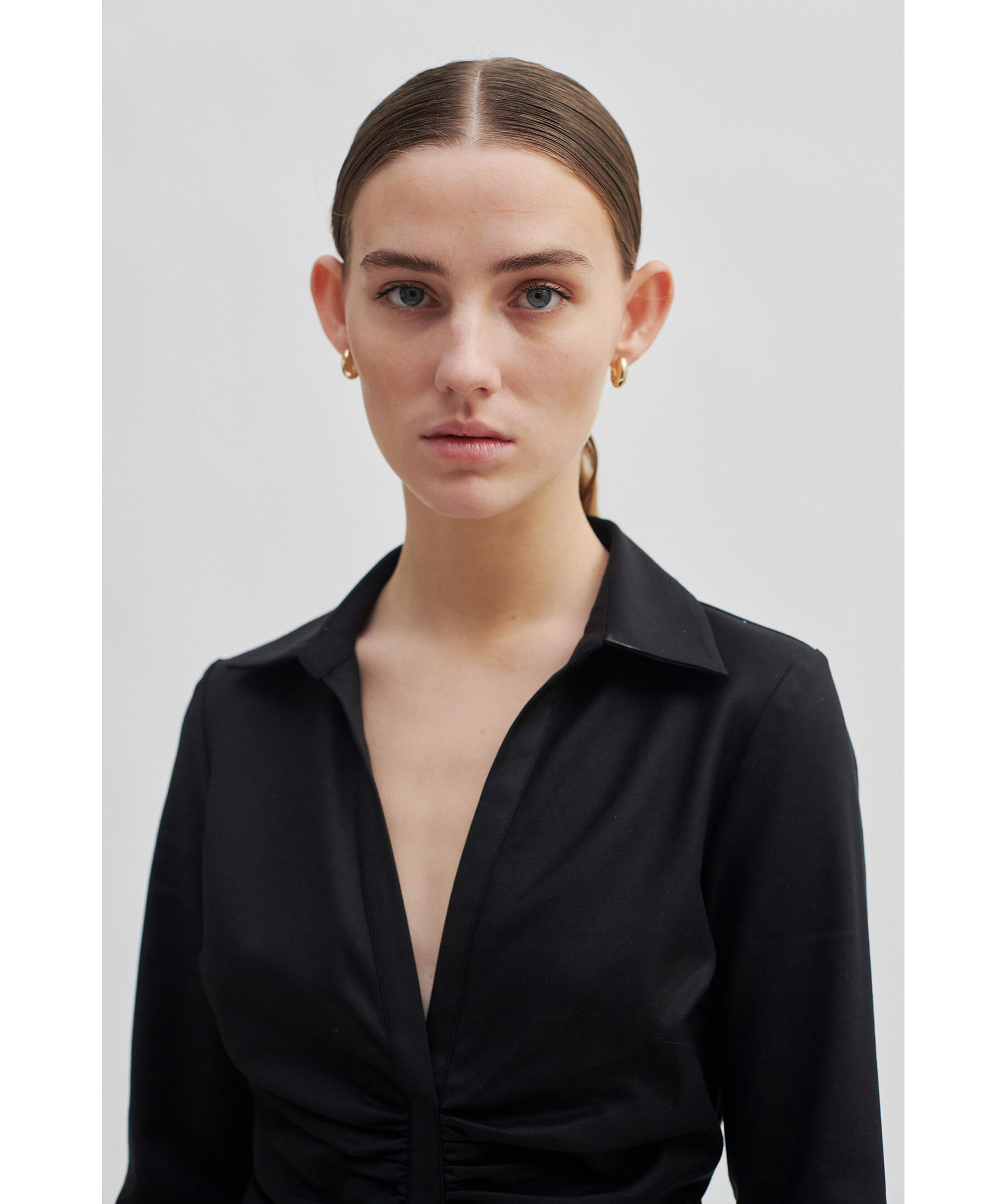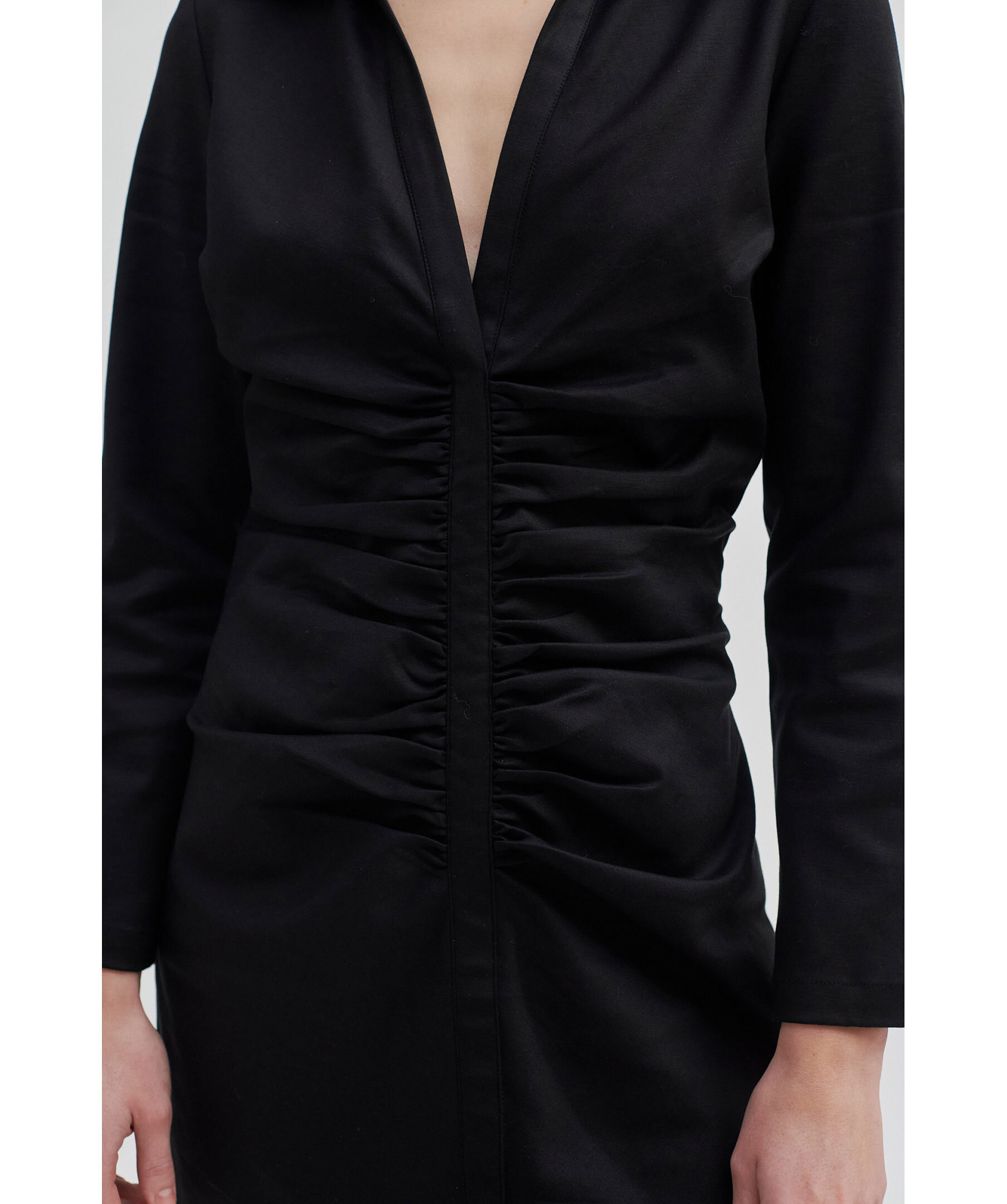 Svart, kvinnlig klänning med smal passform och minilängd från Second Female. Klänningen har en krage och falsk knappslå med rynkor framtill, vilket skapar en snygg, draperad passform. I sidan finns en osynlig dragkedja. Ärmarna är långa och smala.