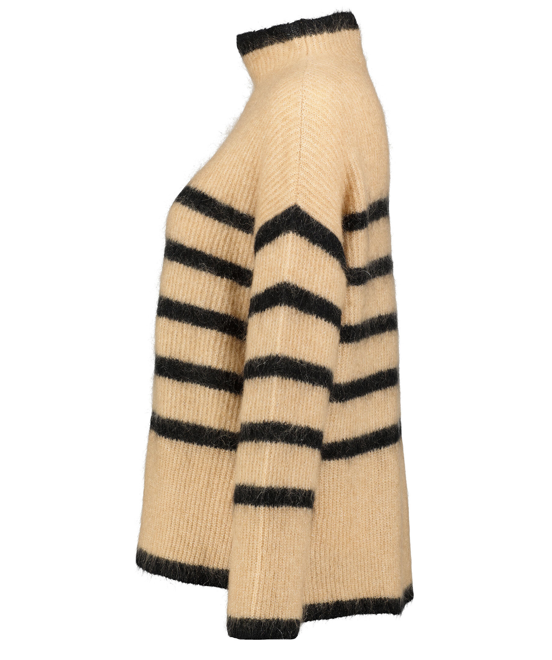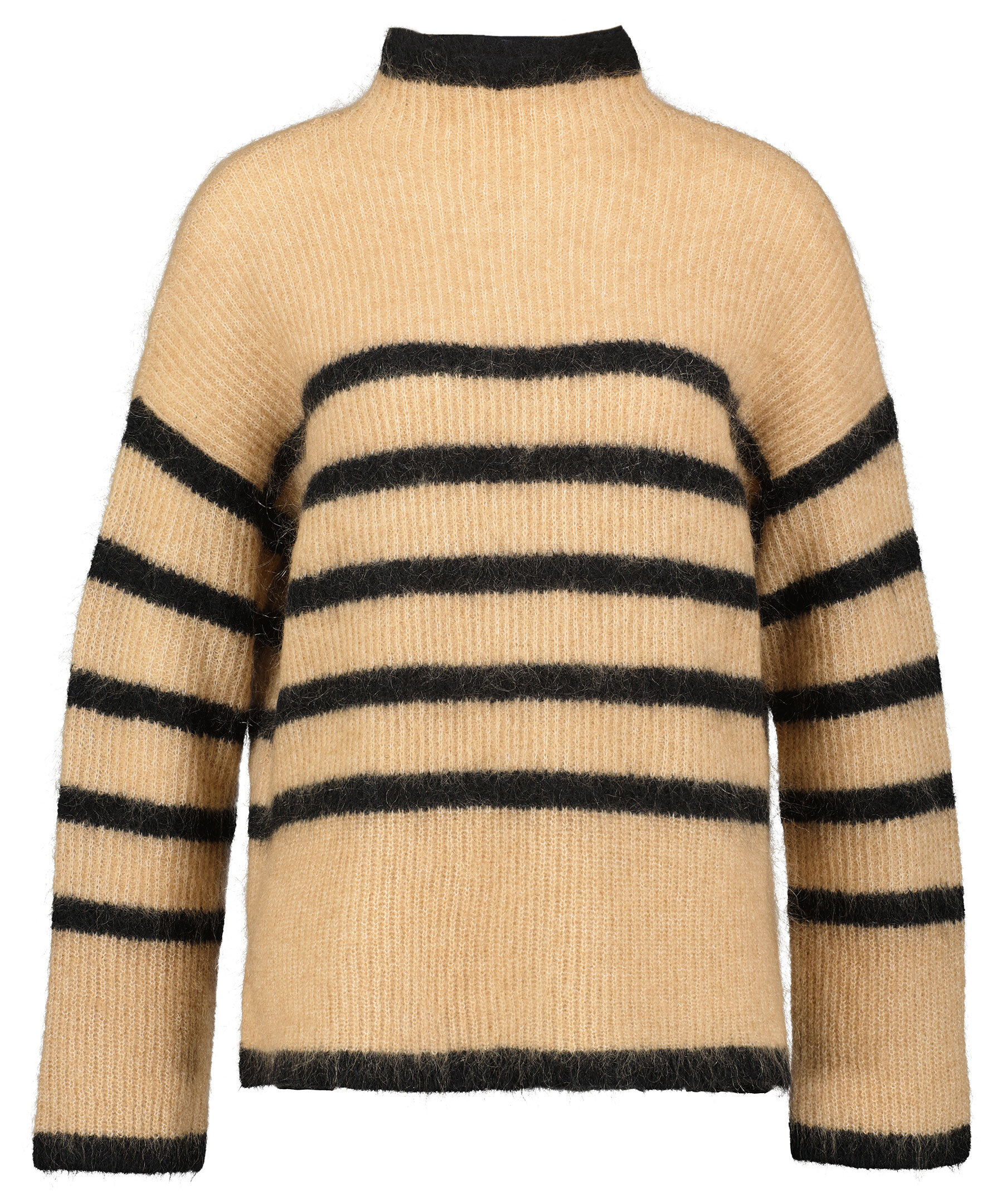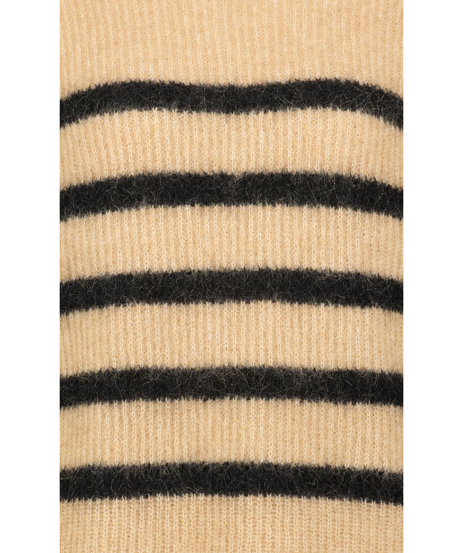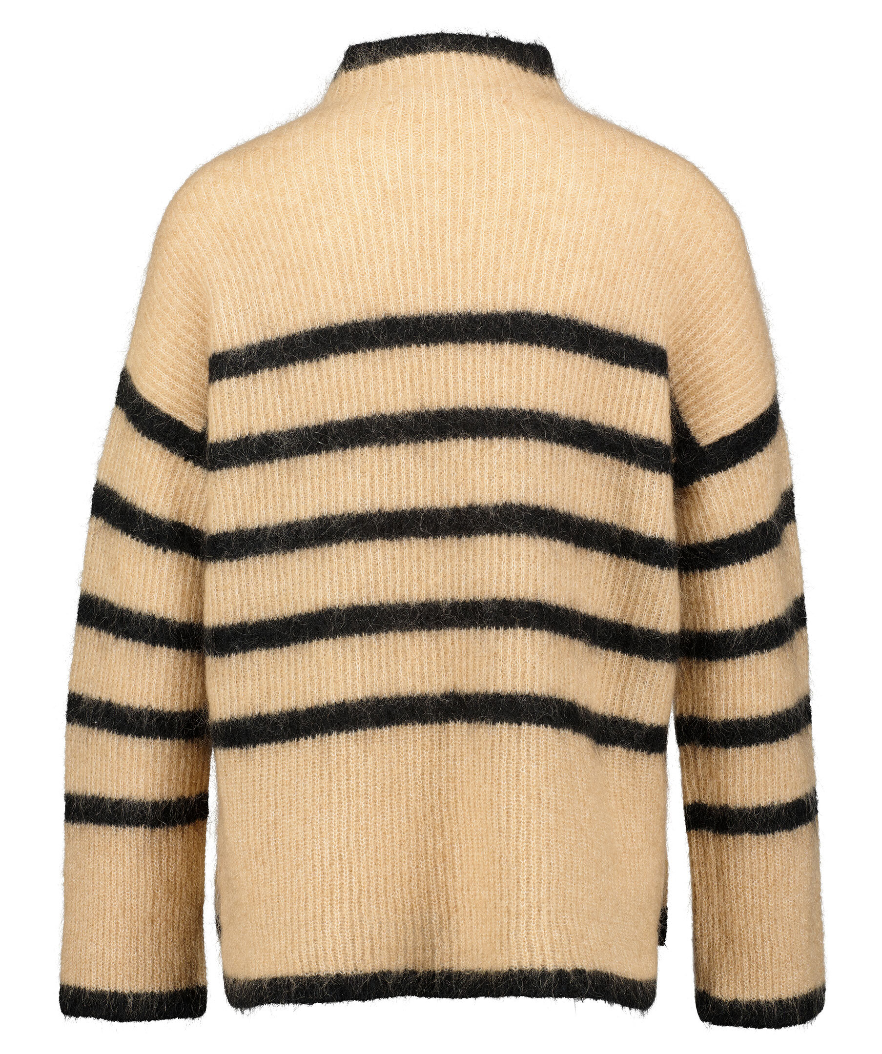 Beige finstickad tröja från Second Female. Avslappnad passform. Tröjan har en halv polokrage, randigt mönster i svart, små sidoslitsar och gjord i en ull och mohair blandning.