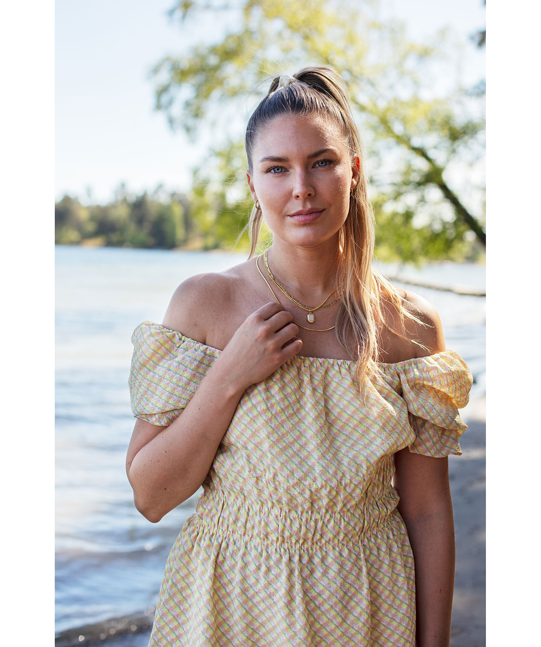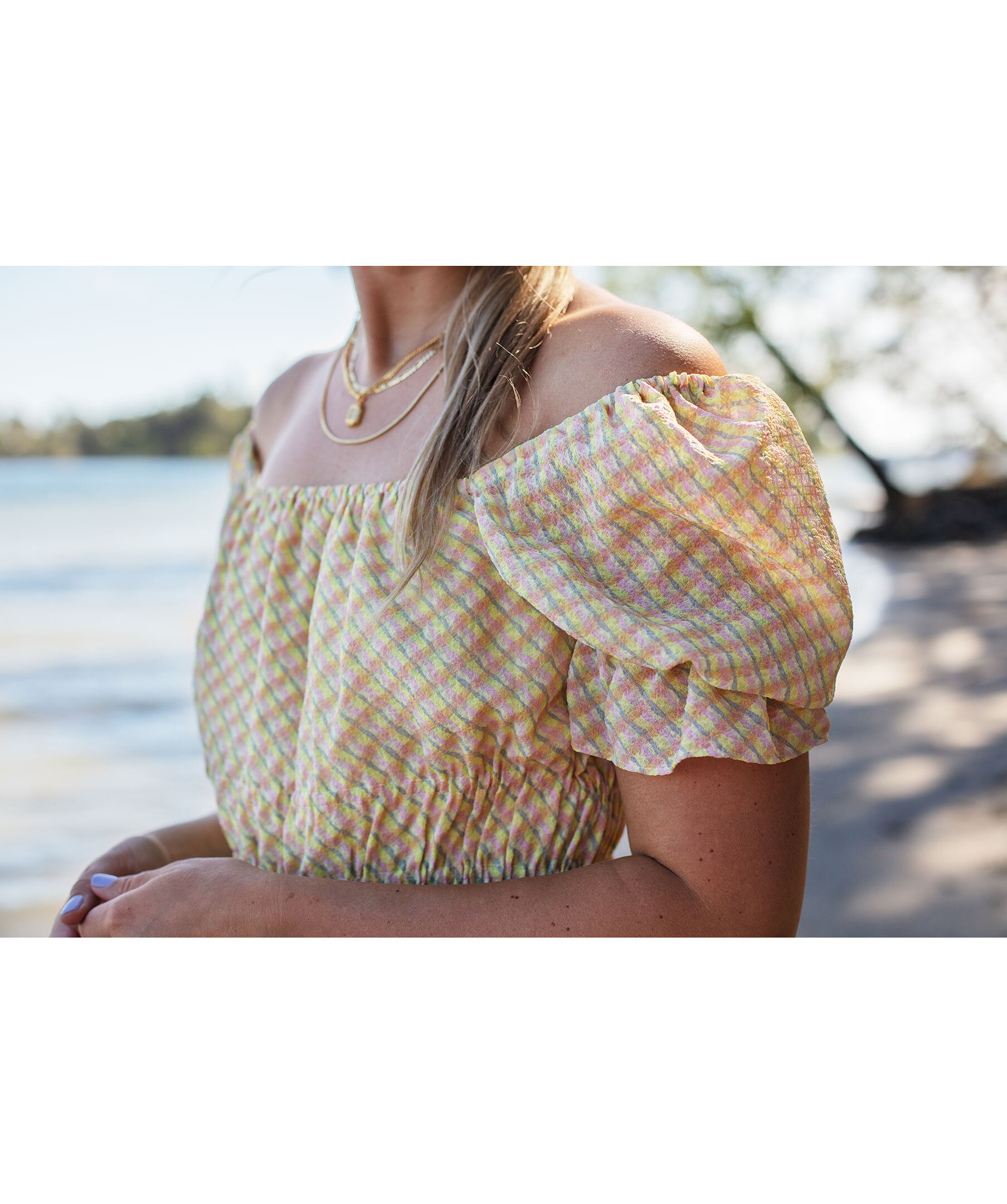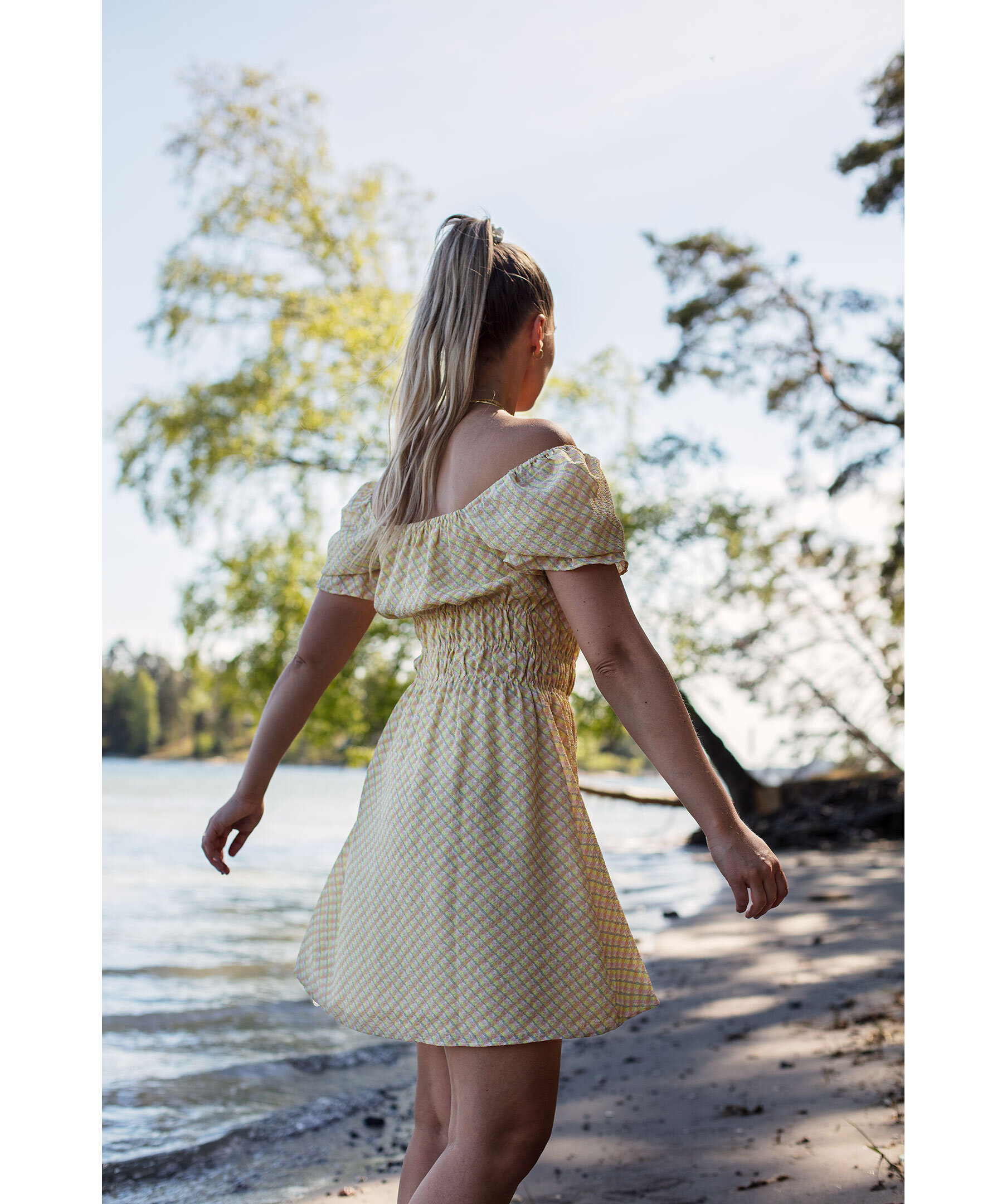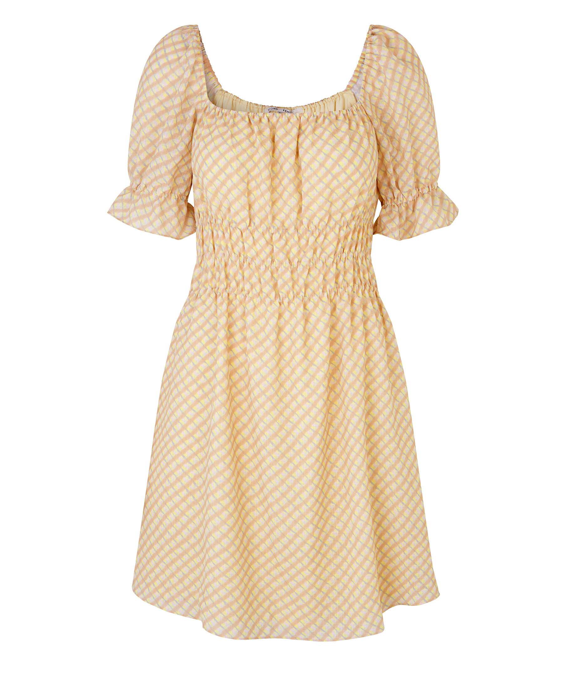 Flerfärgad, rutig klänning som slutar vid knät från Second Female. I färgerna gult, ljusrosa och grått. Tillverkad i ett lätt, semi-transparent tyg. Med fyrkantig halsringning fram och bak med resårkanter och puffade ärmar med resårslut. Elastisk detalj runt midjan som skapar en rynkig effekt för att definiera siluetten. Helfodrad och tryckknappar med litet snöre under axelpartiet på varje sida så att man kan knäppa in bh bandet så att axlarna inte åker ner. Modellen är 175 cm lång och har på sig storlek S.