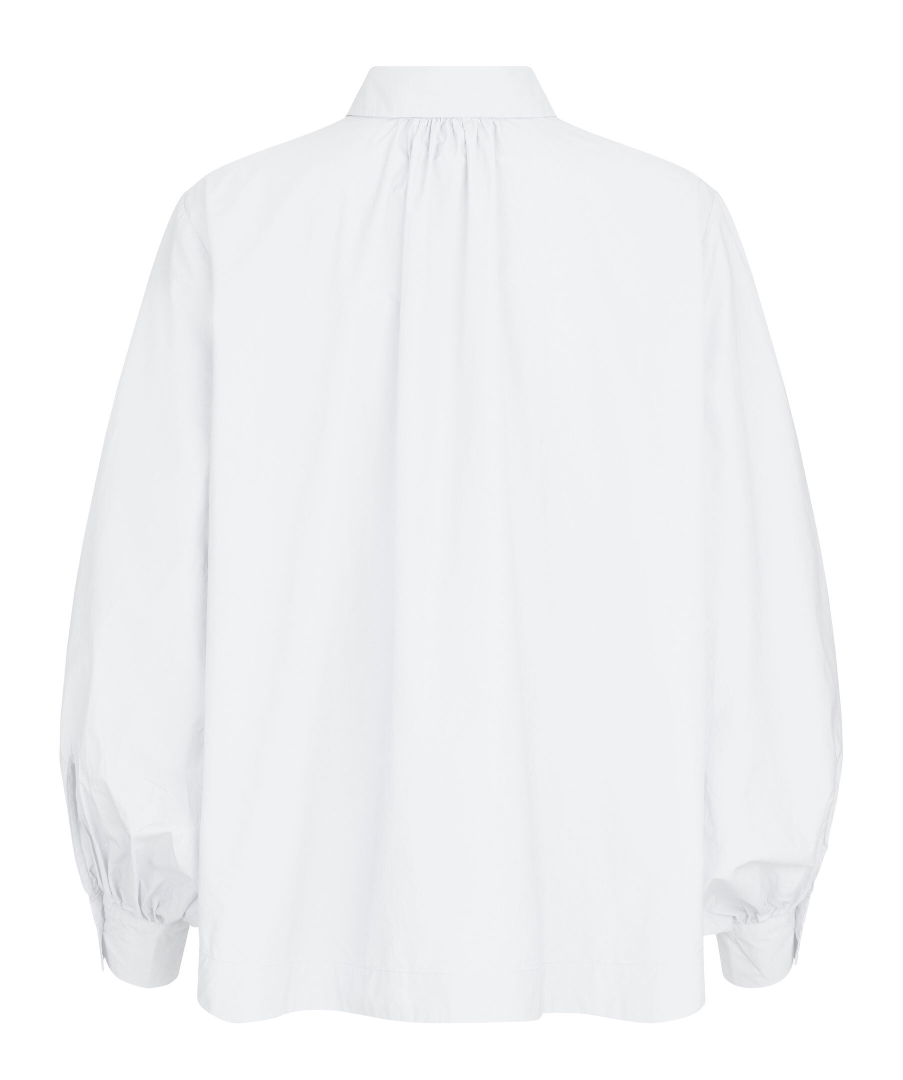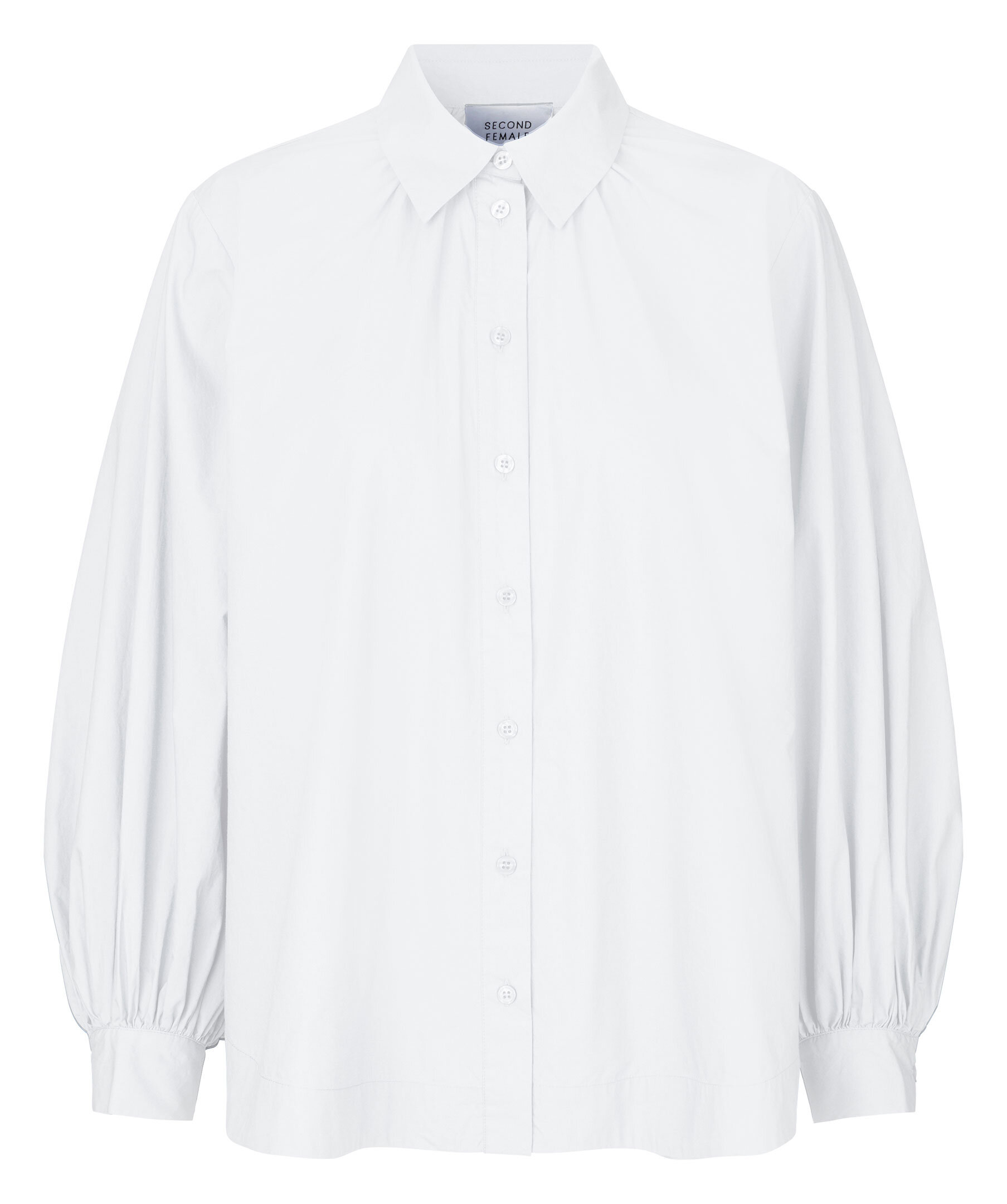 Vit skjorta från Second Female. Stängs framtill med knappar. Veckade detaljer vid kragen och manschetterna. Spetsig krage. Tillverkad i 100% ekologisk bomull.