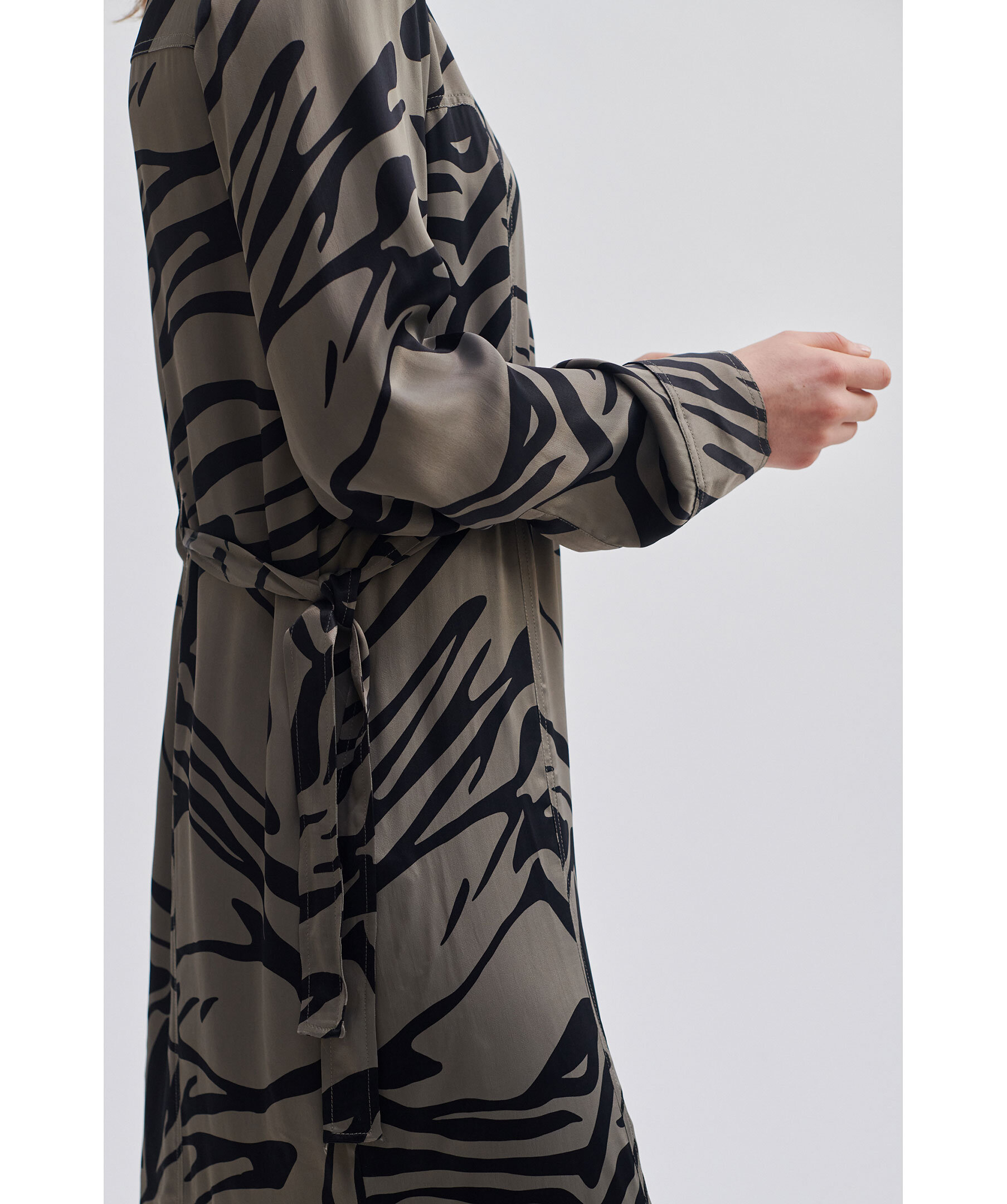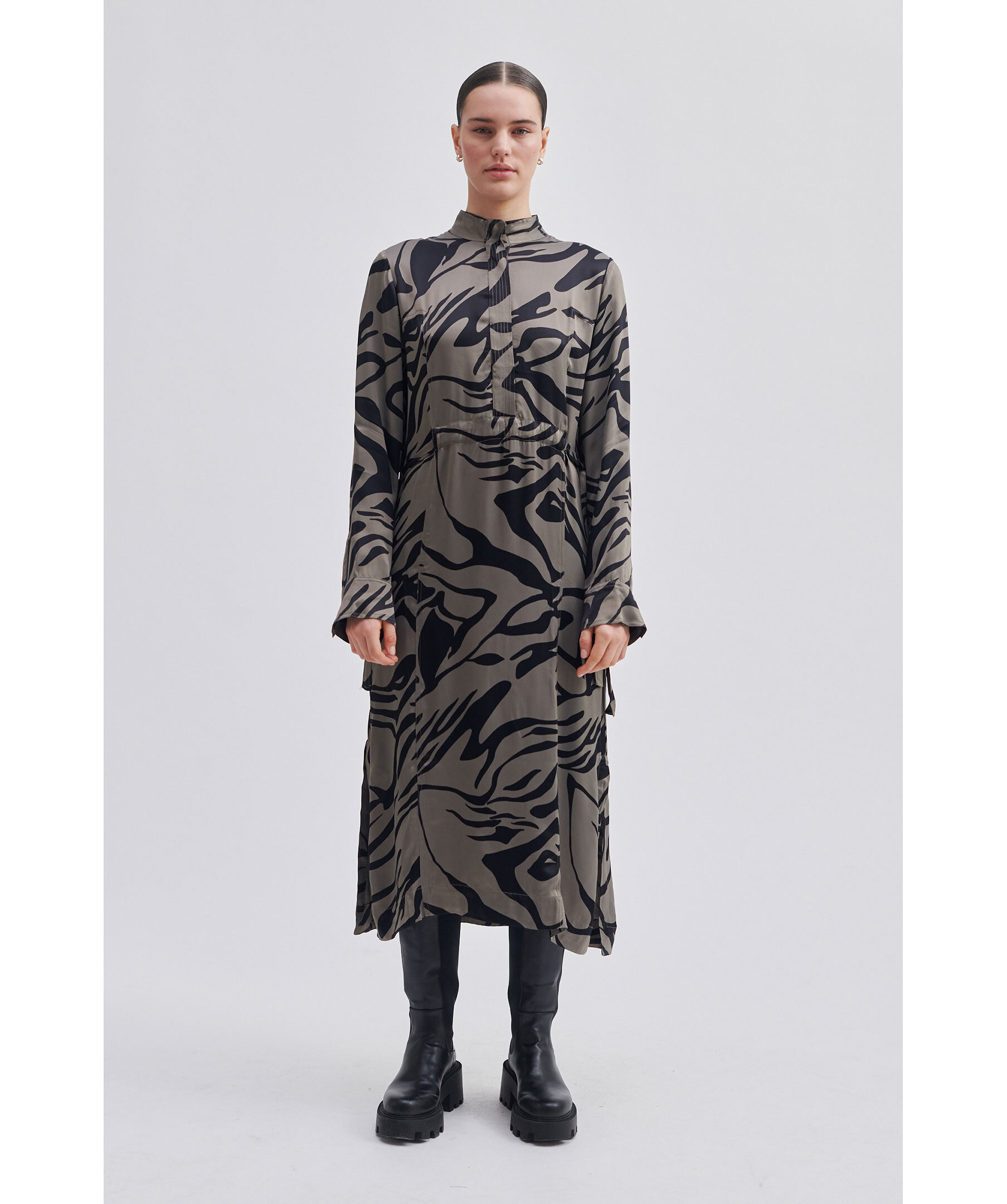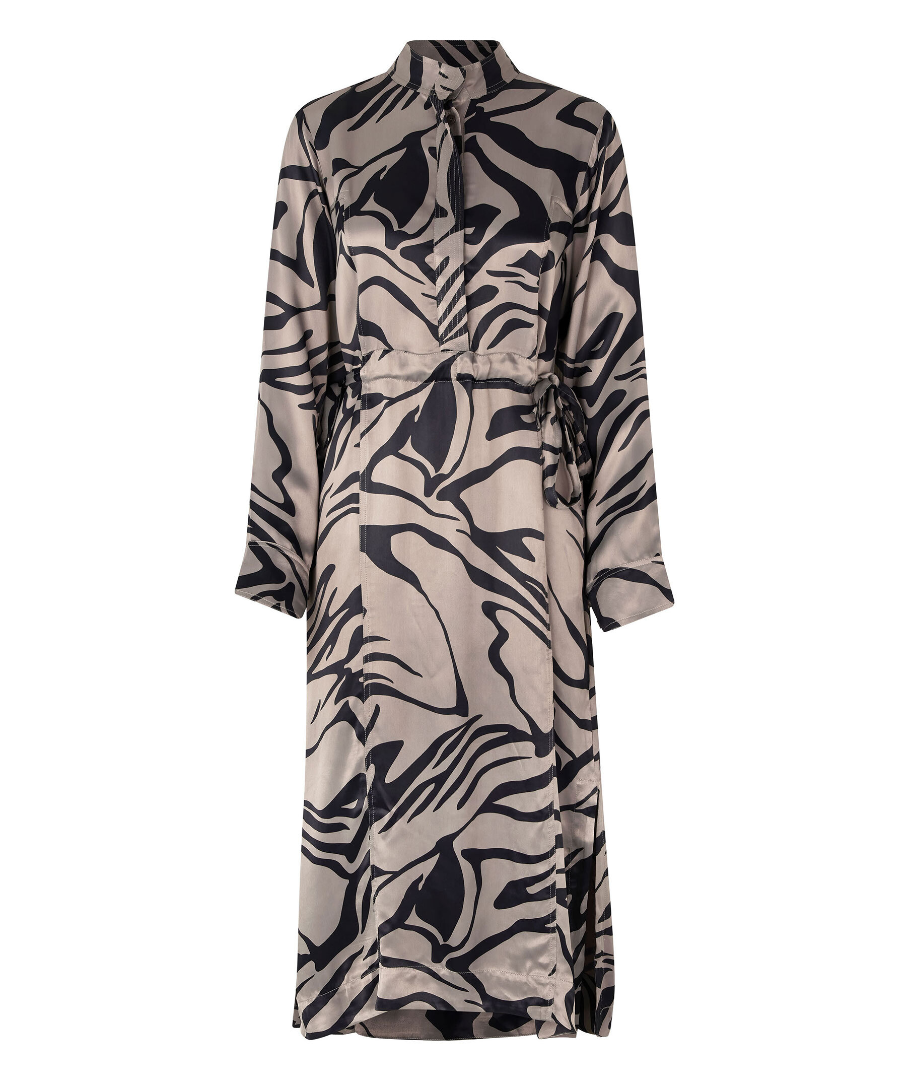 Gråbeige och svart mönstrad klänning från Second Female. Stängs framtill med dold knäppning. Dragsko med band i midjan. Slitsar i sidorna. Manschetter vid ärmslut. Tillverkad i Viscose.