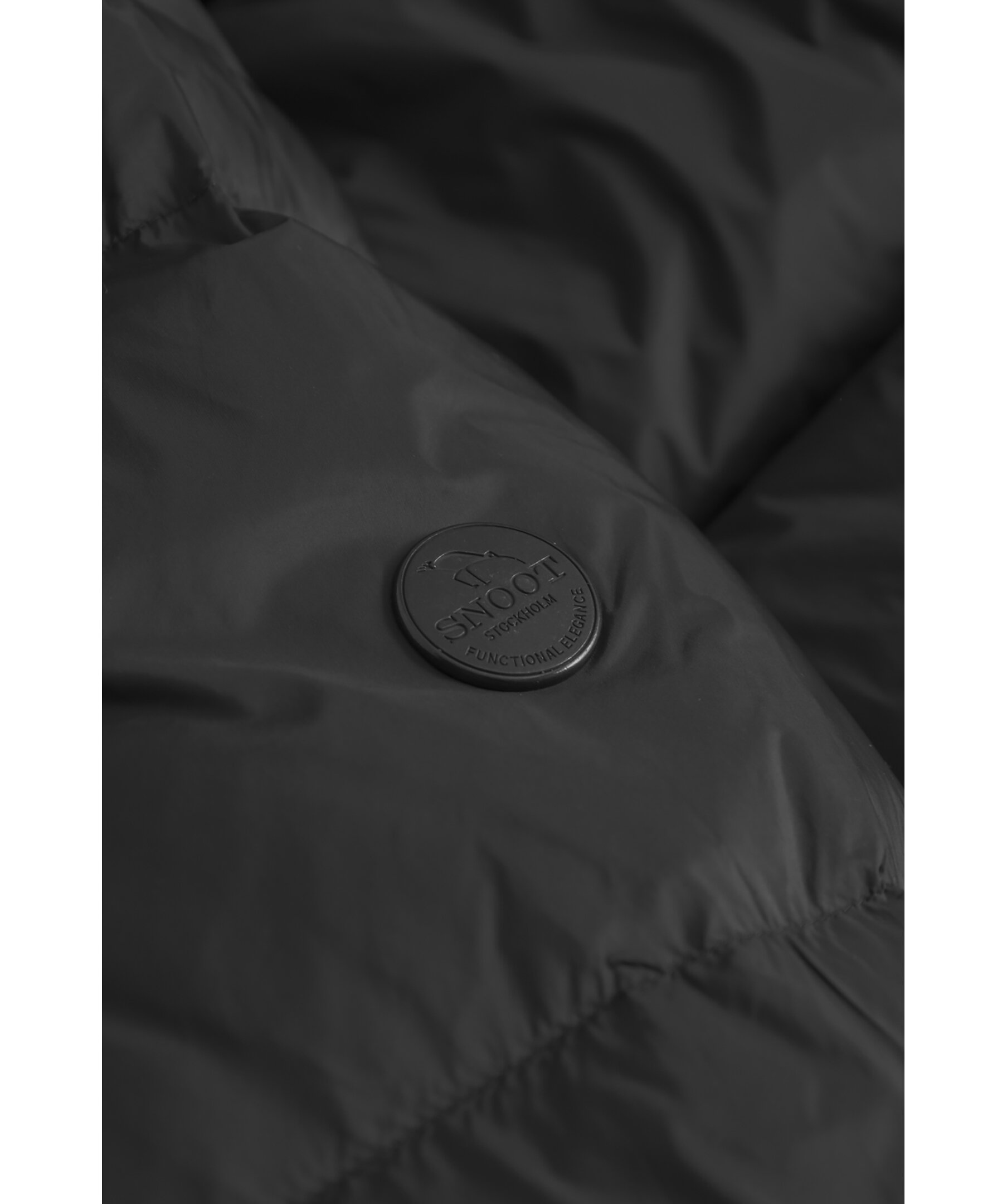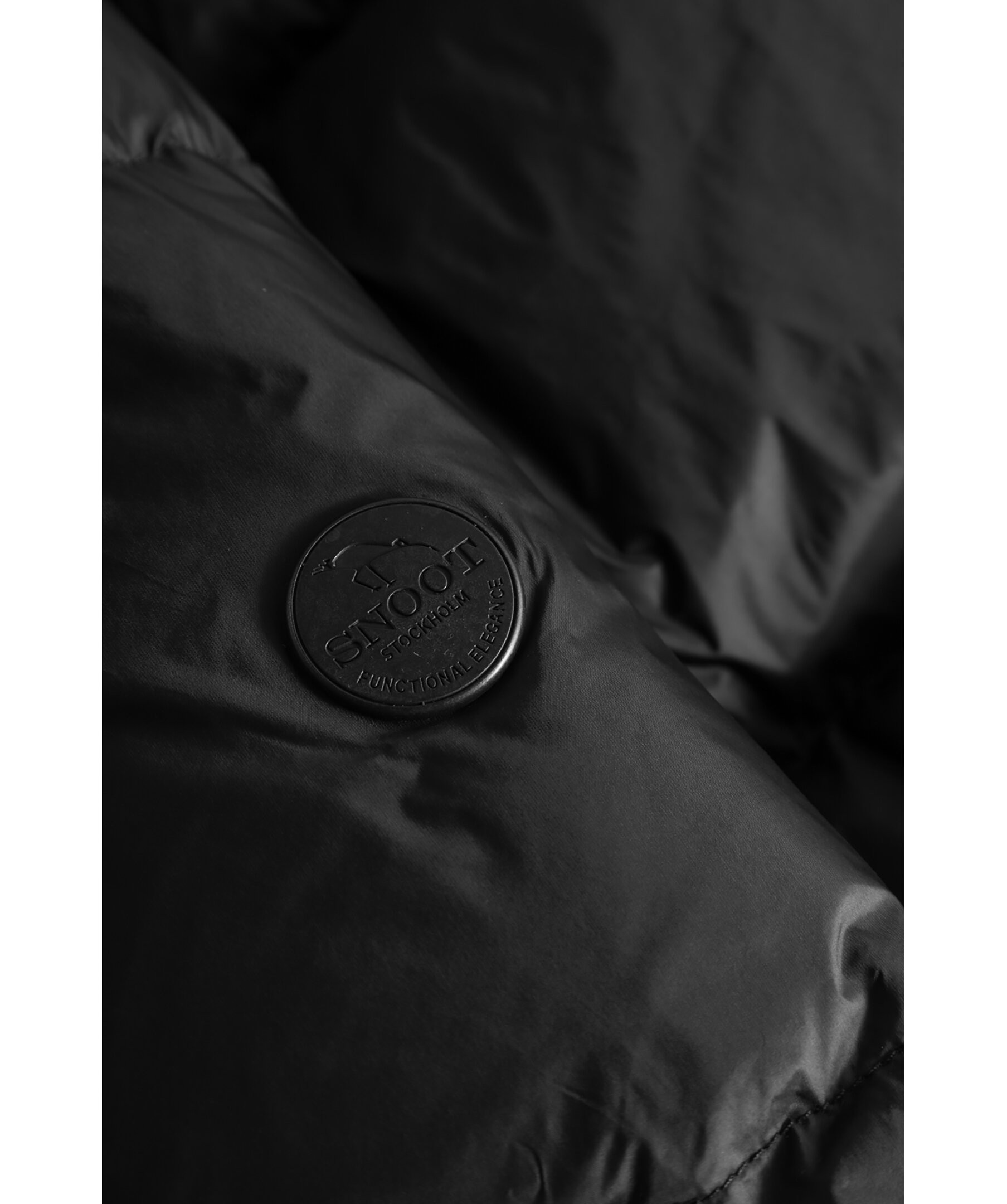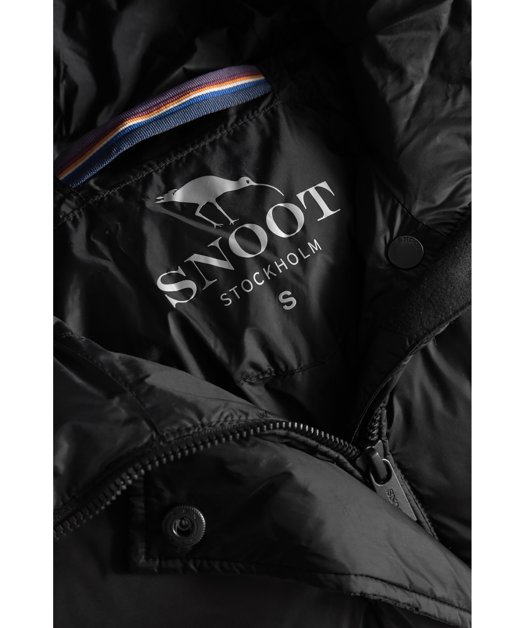 Svart kort pufferjacka från Snoot. Jackan stängs med dold dragkedja och tryckknappar och har huva med dragsko, dragsko i plaggslut, två sidfickor med dragkedja samt två innerfickor varav en med dragkedja. Liten metalllogotyp på vänster ärm. Tillverkad i polyamid med dunfyllning.
