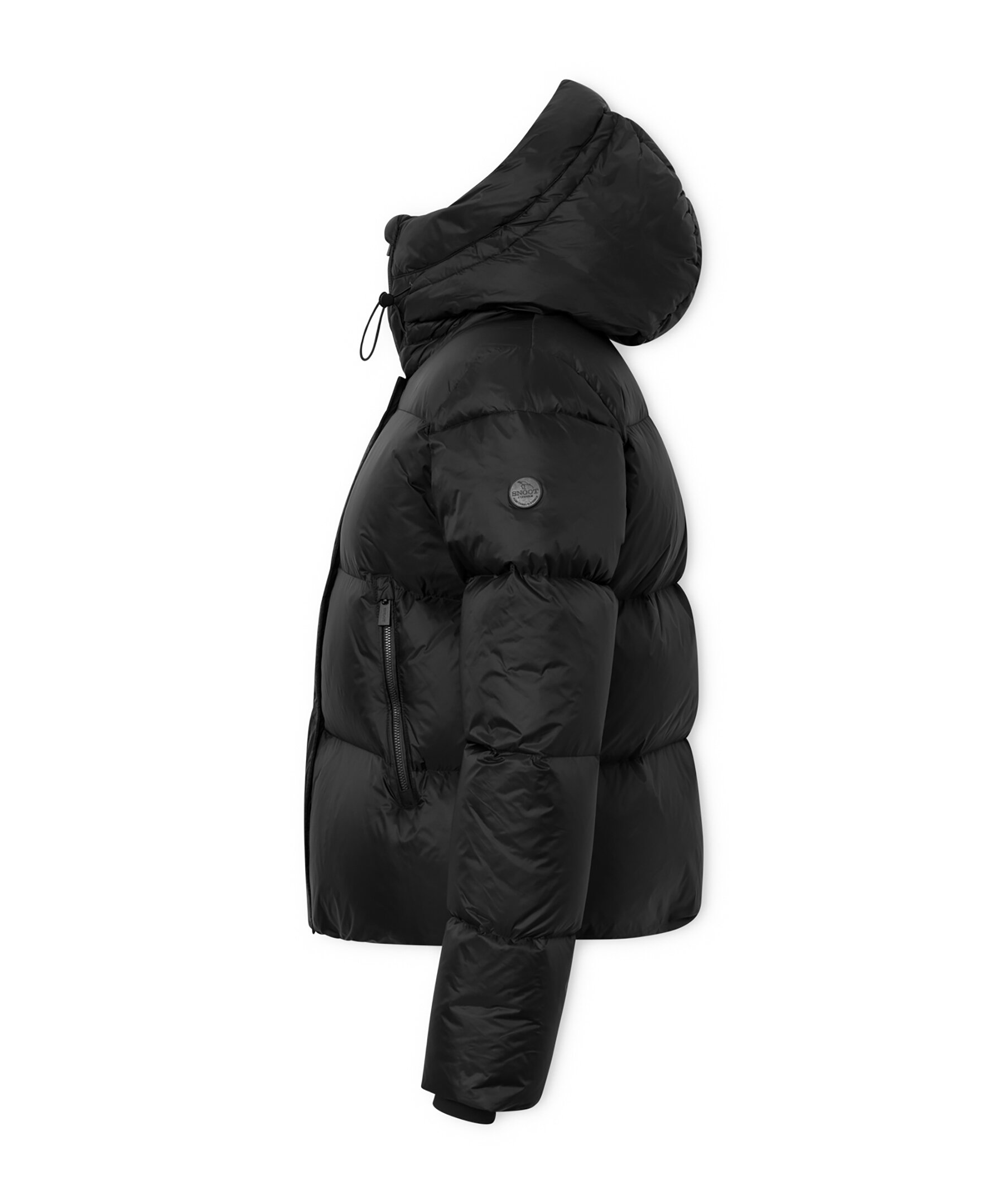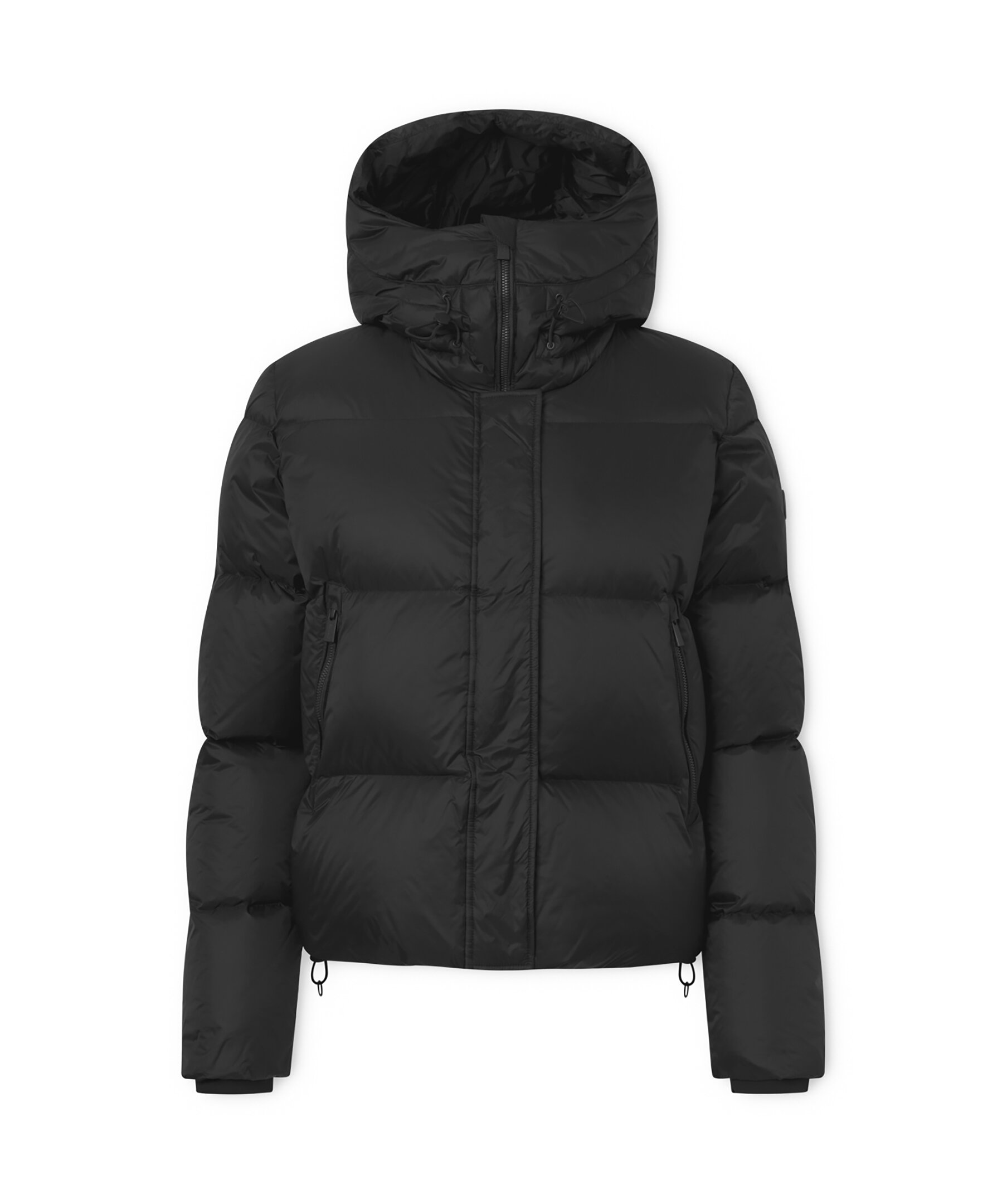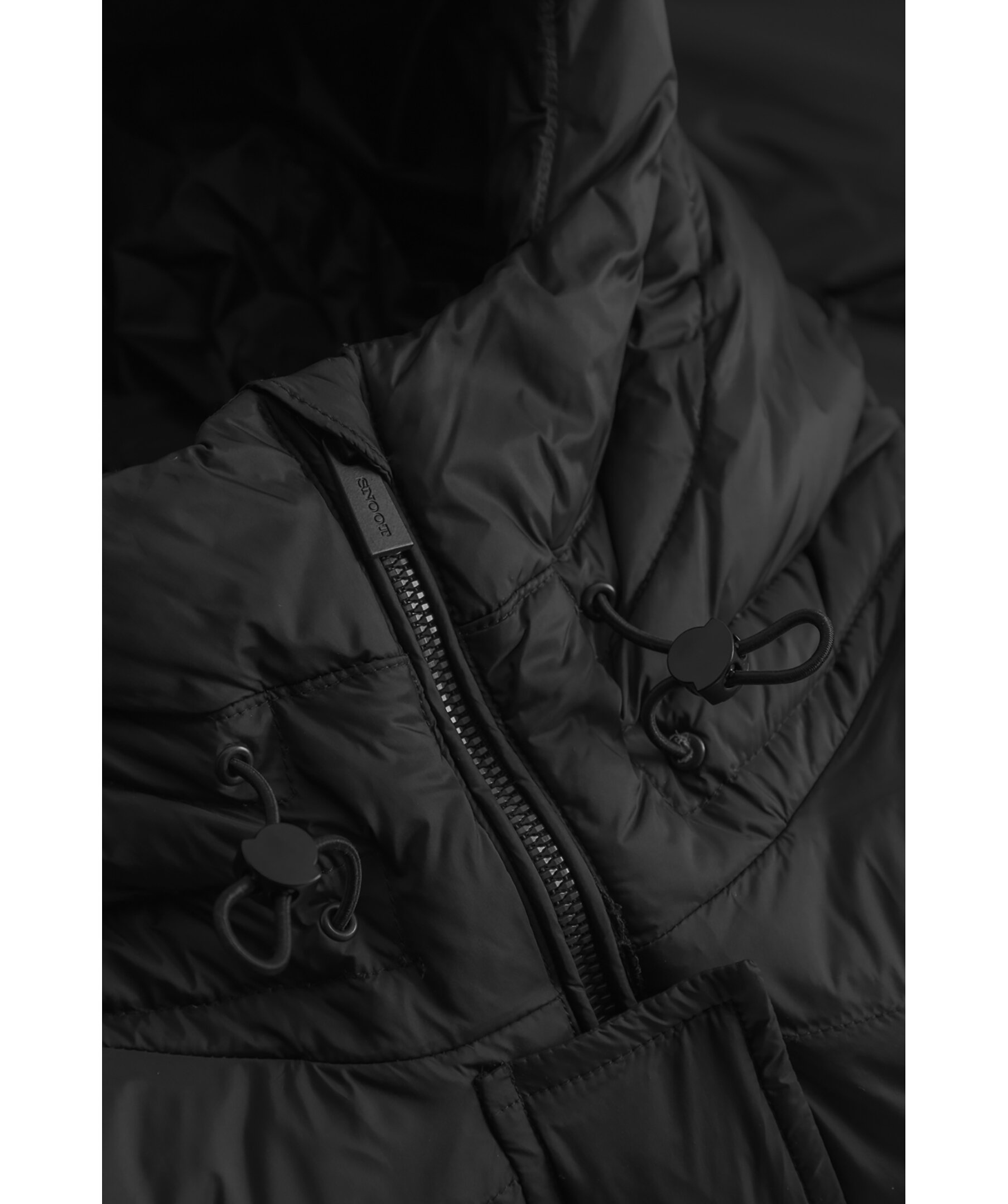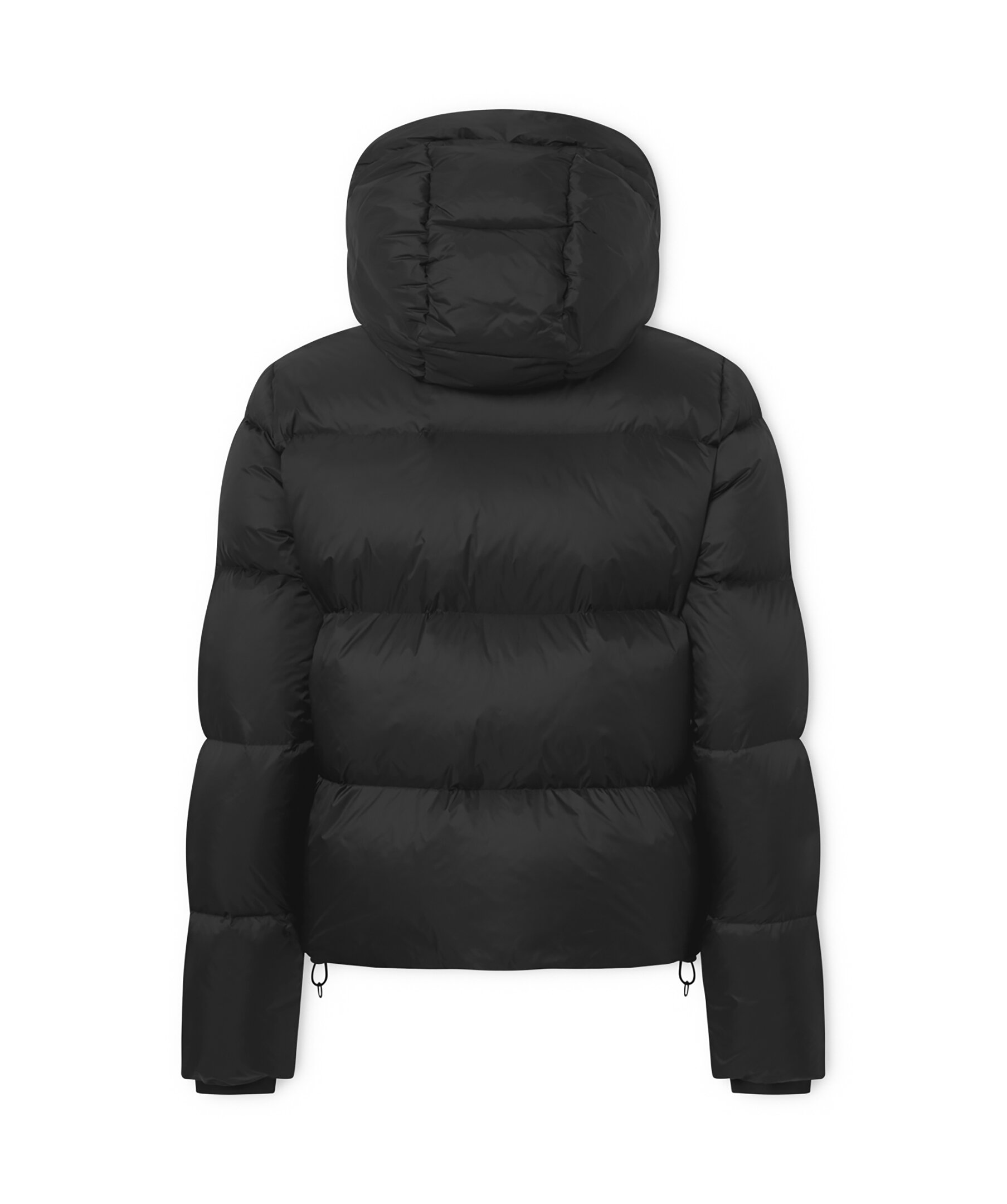 Svart kort pufferjacka från Snoot. Jackan stängs med dold dragkedja och tryckknappar och har huva med dragsko, dragsko i plaggslut, två sidfickor med dragkedja samt två innerfickor varav en med dragkedja. Liten metalllogotyp på vänster ärm. Tillverkad i polyamid med dunfyllning.