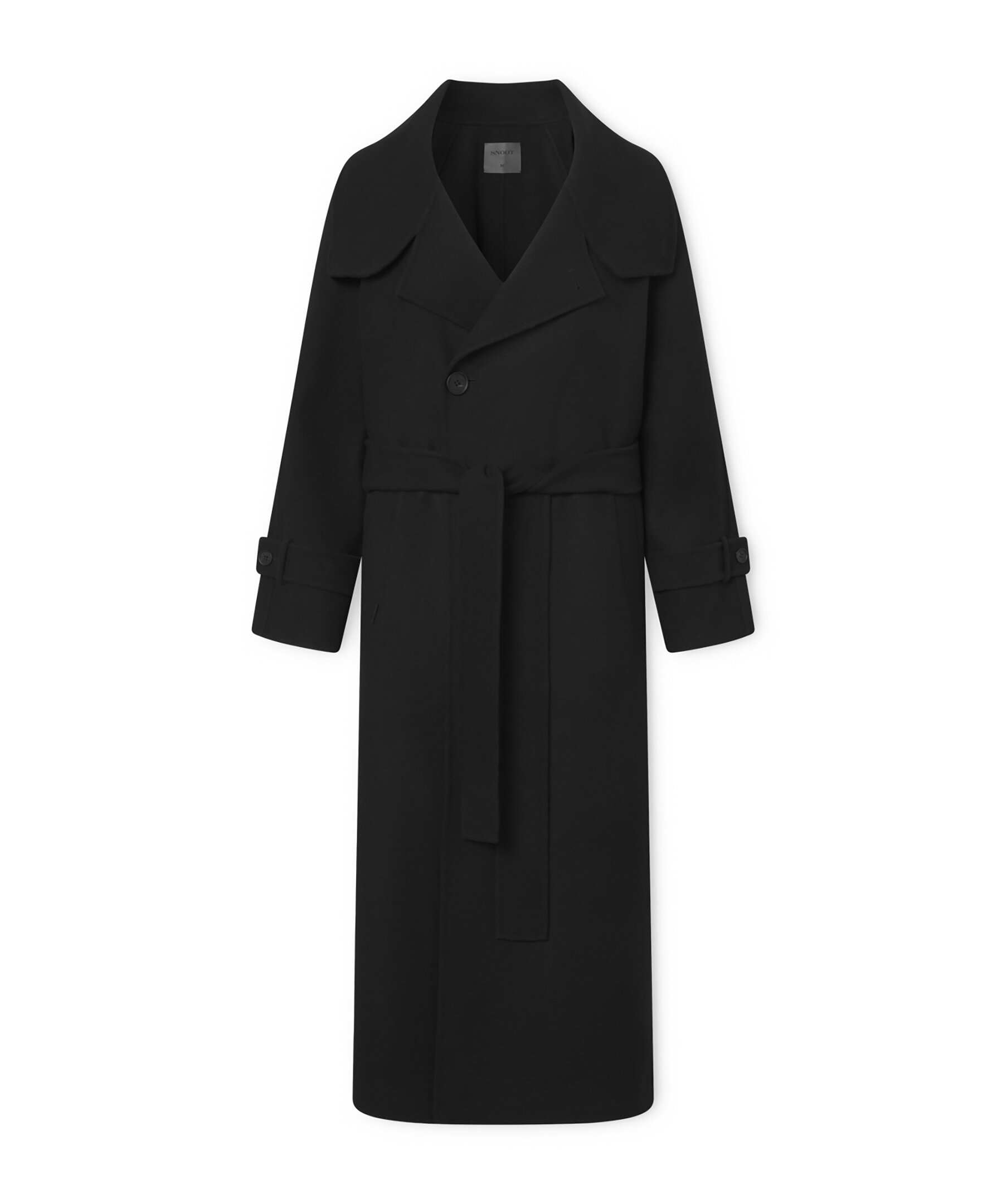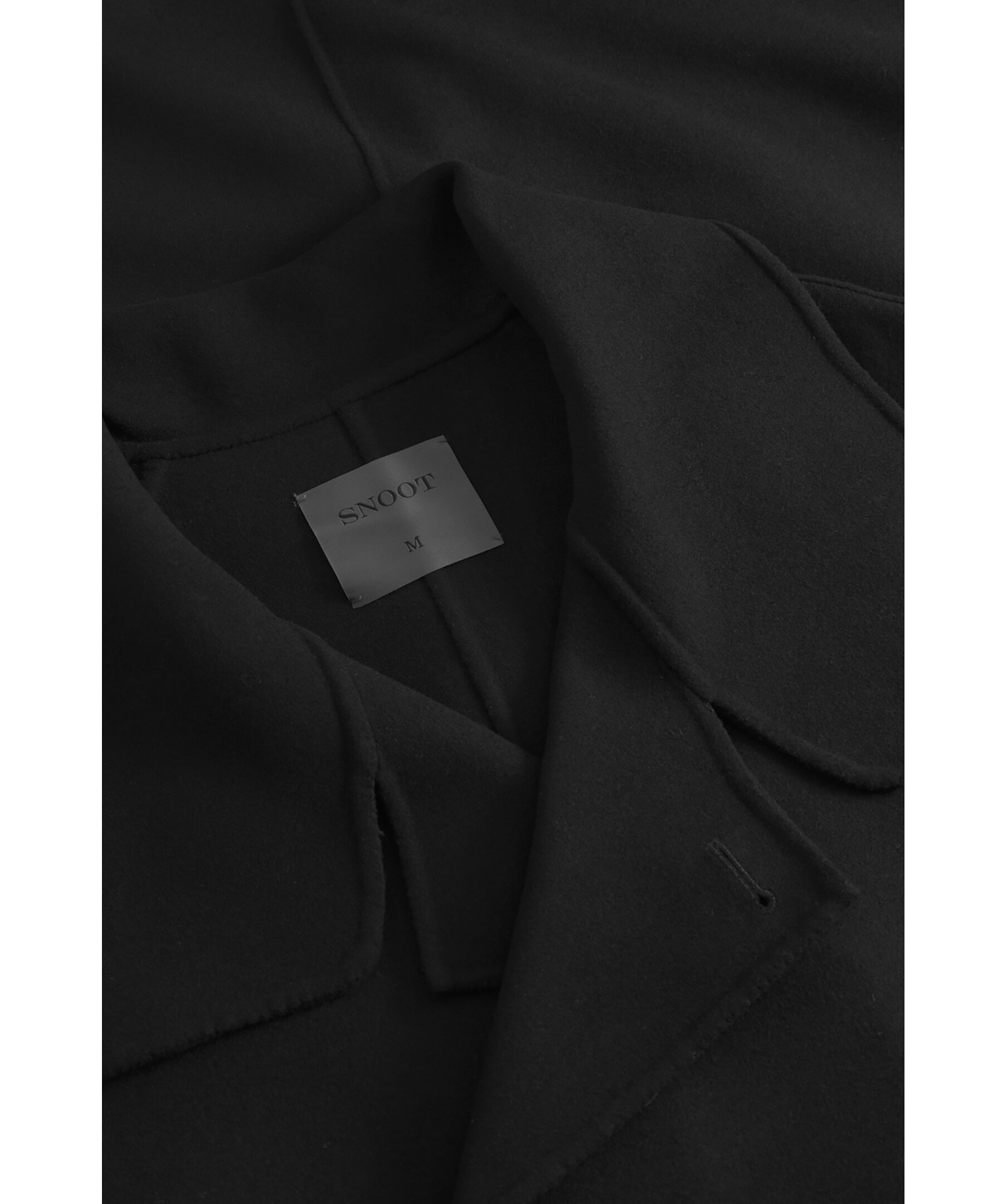 Svart kappa från Snoot. Kappan stängs med en knapp framtill samt bälte och har två sidfickor varav en har en liten logotyp i metall. Tillverkad i en ullblandning.