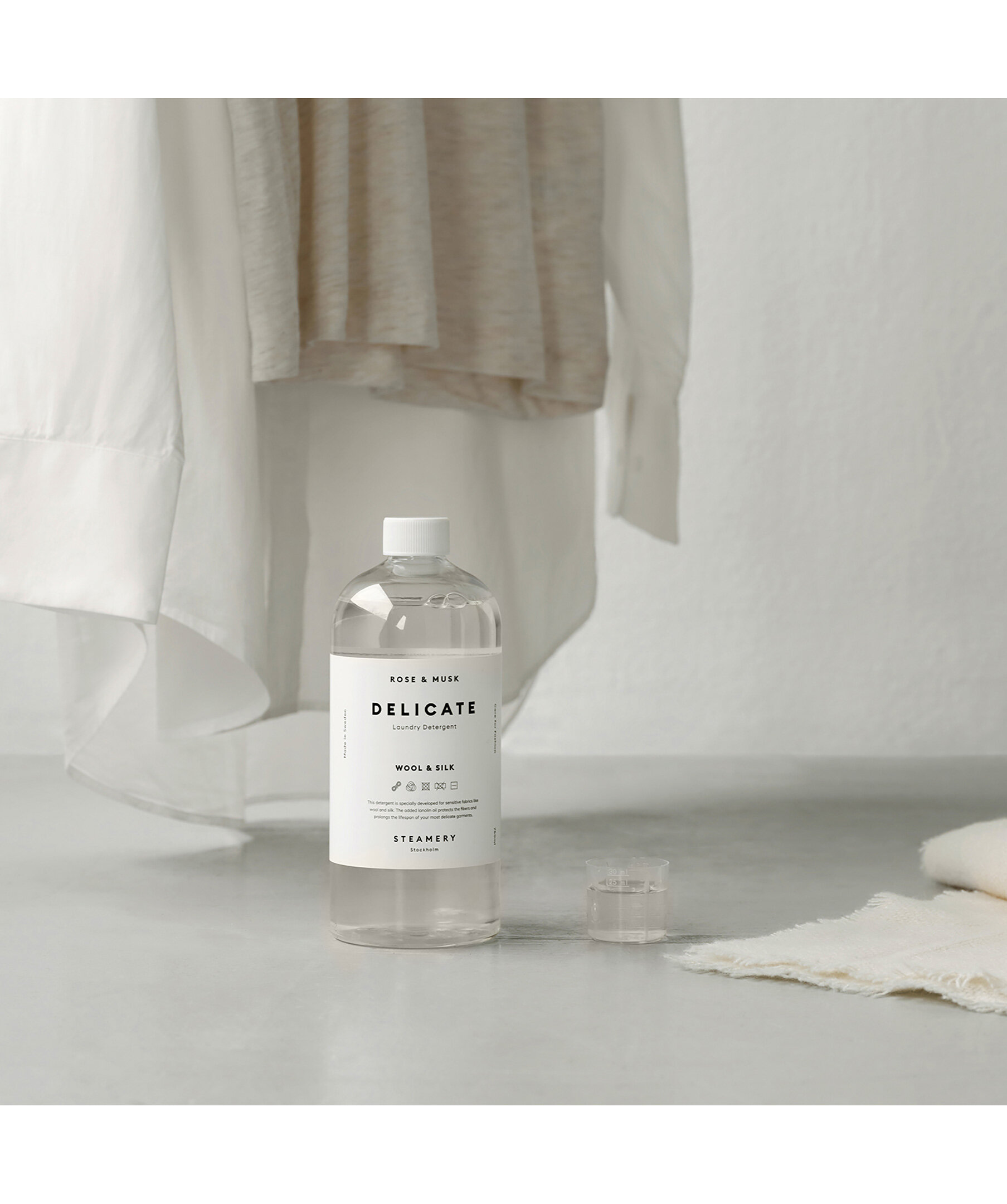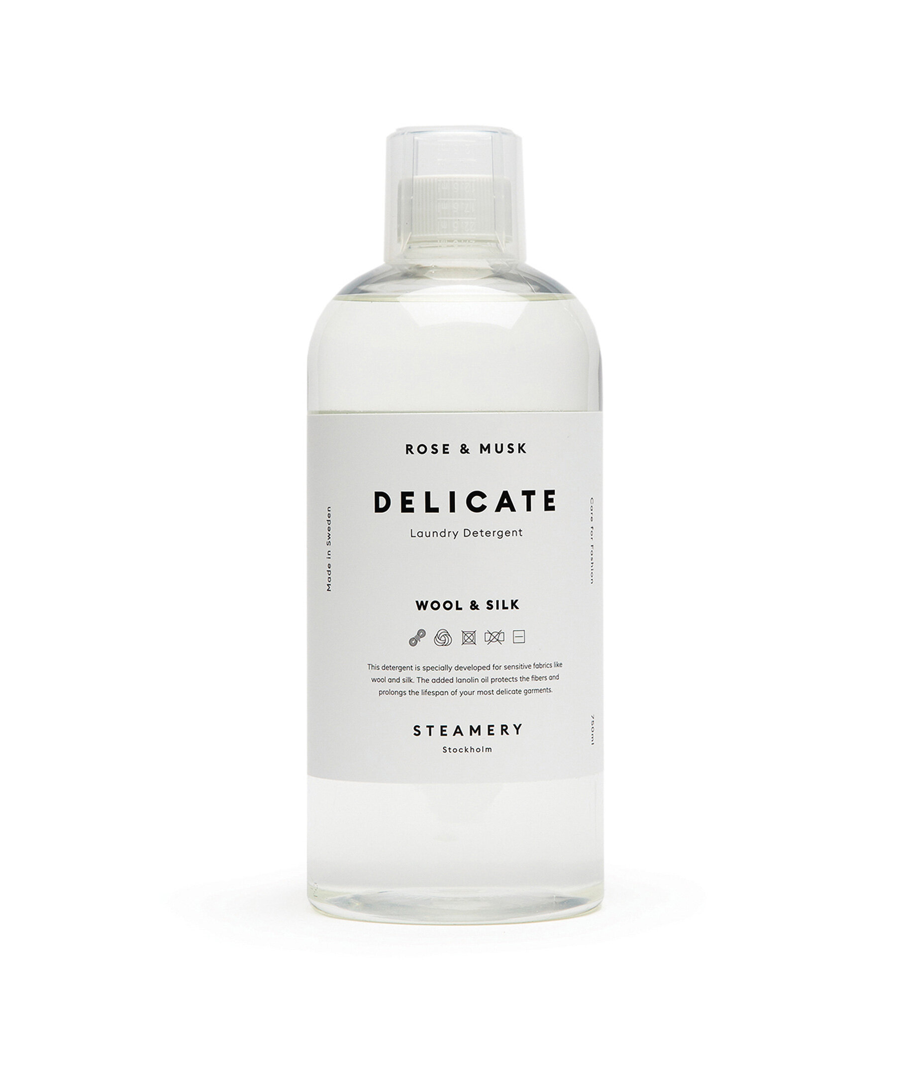 Skonsamt tvättmedel från Steamery Stockholm. Tvättmedlet vårdar och skyddar känsliga material som ull och siden. Den innehåller inga enzymer och är förstärkt med lanolinolja som vårdar och skyddar fibrerna i känsliga tyger, samtidigt som det gör dem mjukare och bevarar plaggens lyster. Innehåller inga färgämnen, zeoliter eller fosfater. Passar för både maskin- och handtvätt. Flaskan är på 750 ml och doseringsmått medföljer. Doft av ros & mysk.