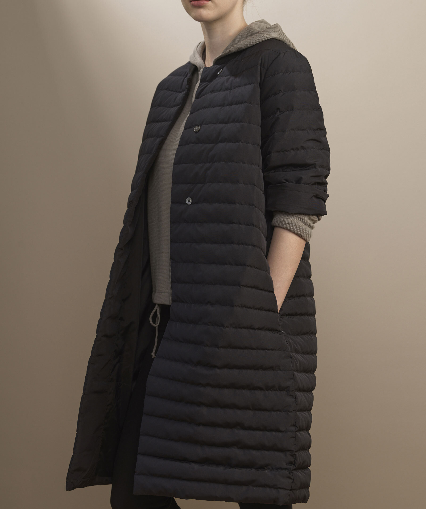 Cadenza är en lång dunkappa med sidfickor, tryckknappar framtill och rund hals.