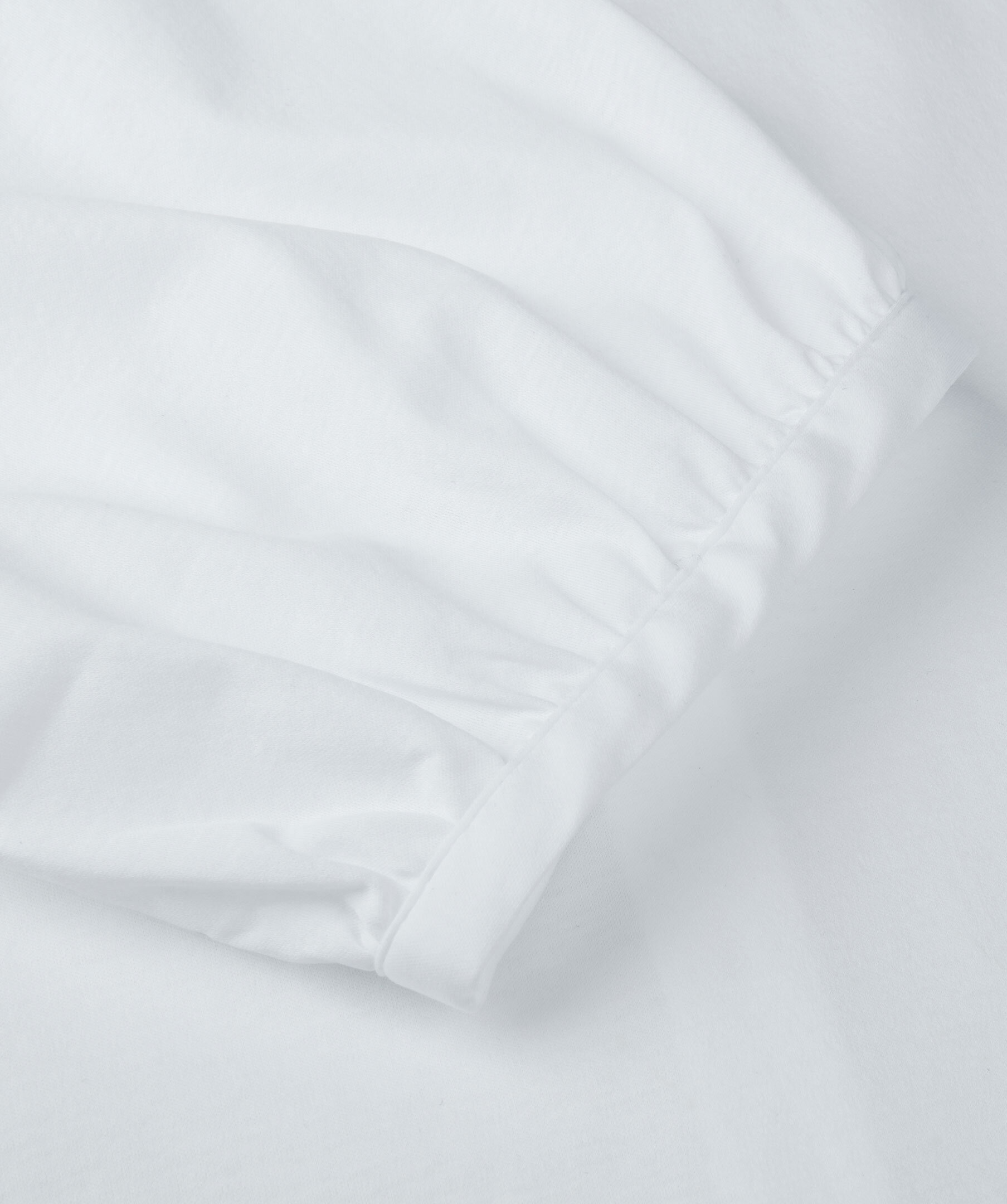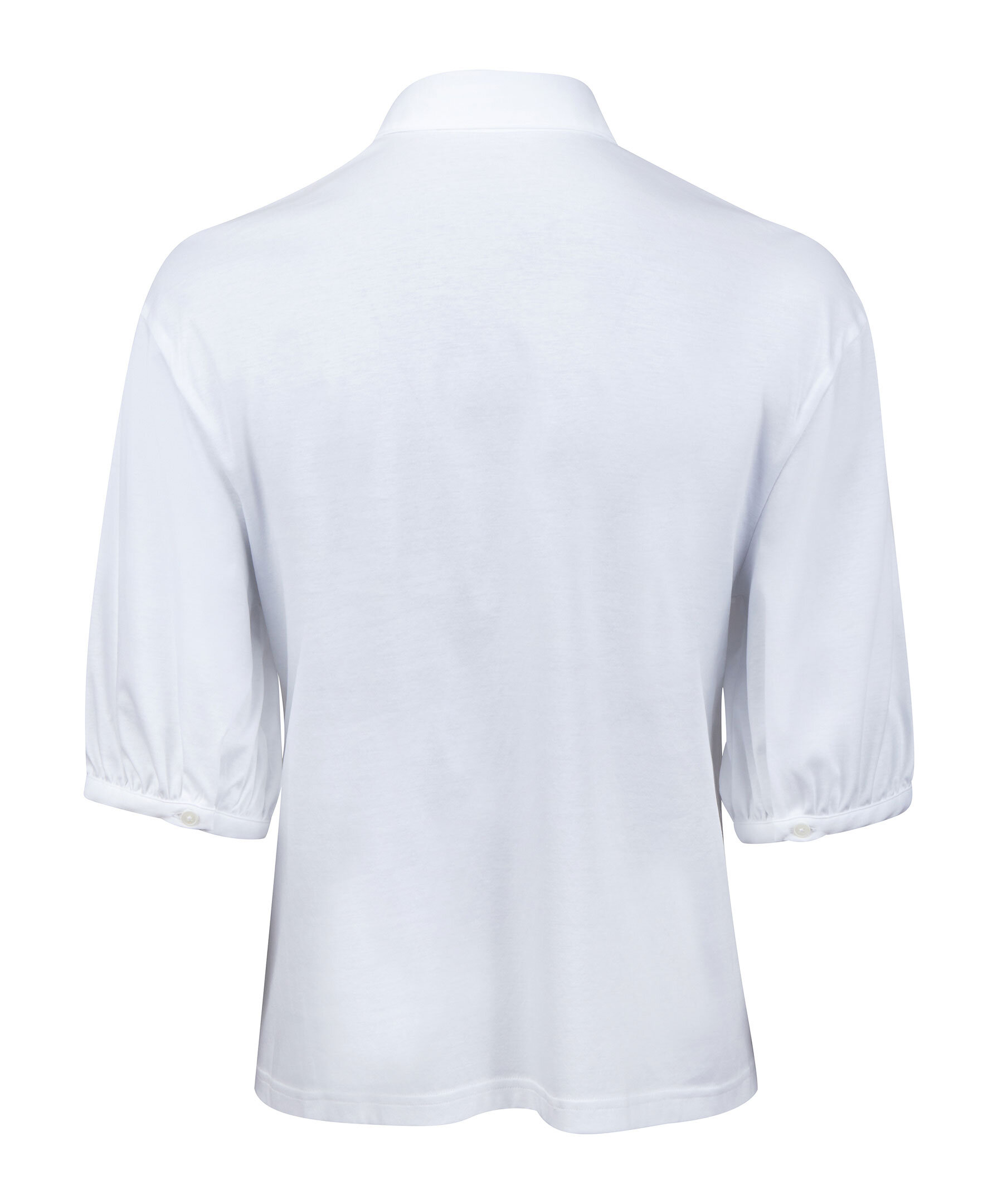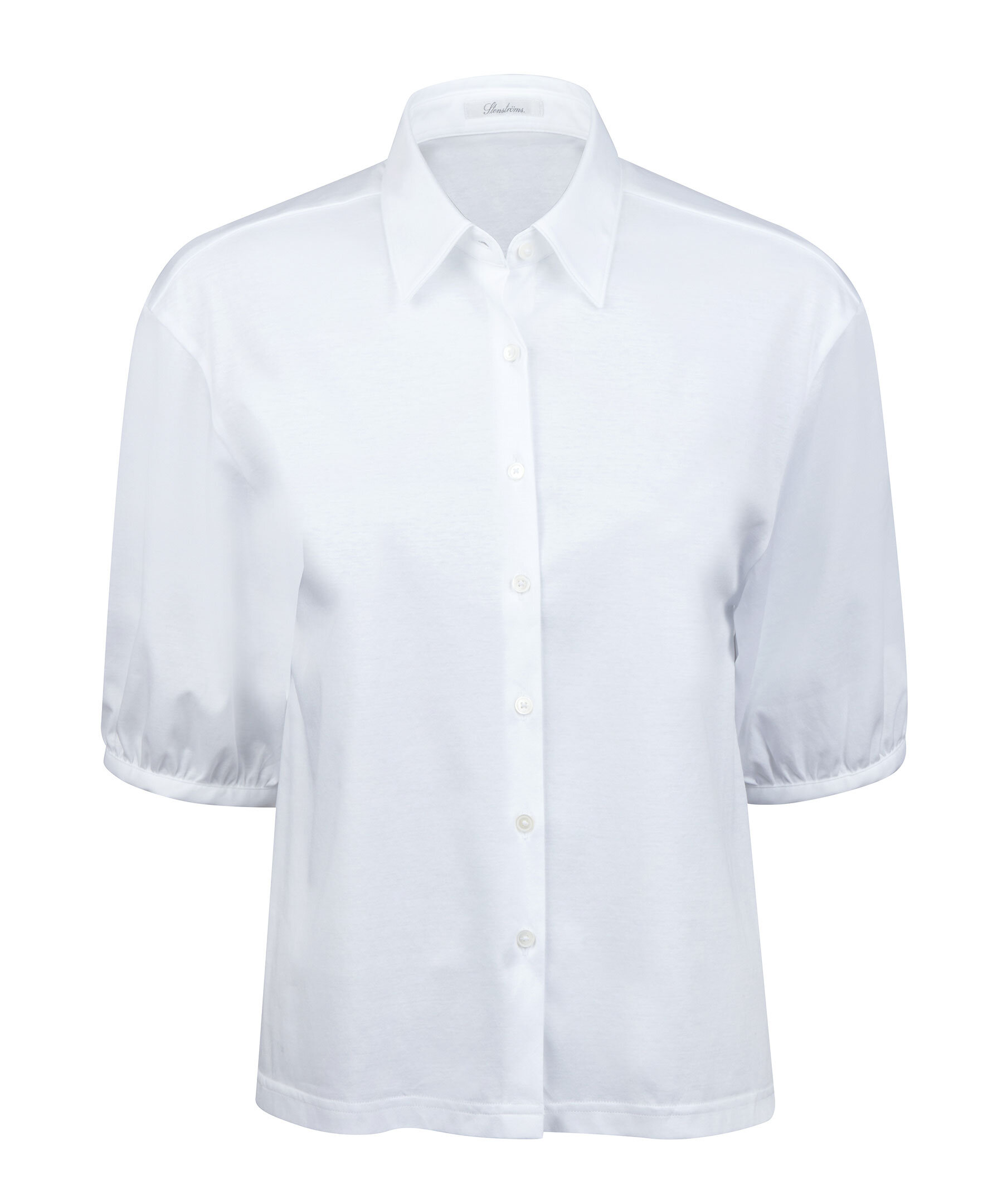 Skjortan Chessie från Stenströms i bomullsjersey har en croppad avslappnad passform med sluttande axlar, korta puffärmar och knappar i pärlemor.