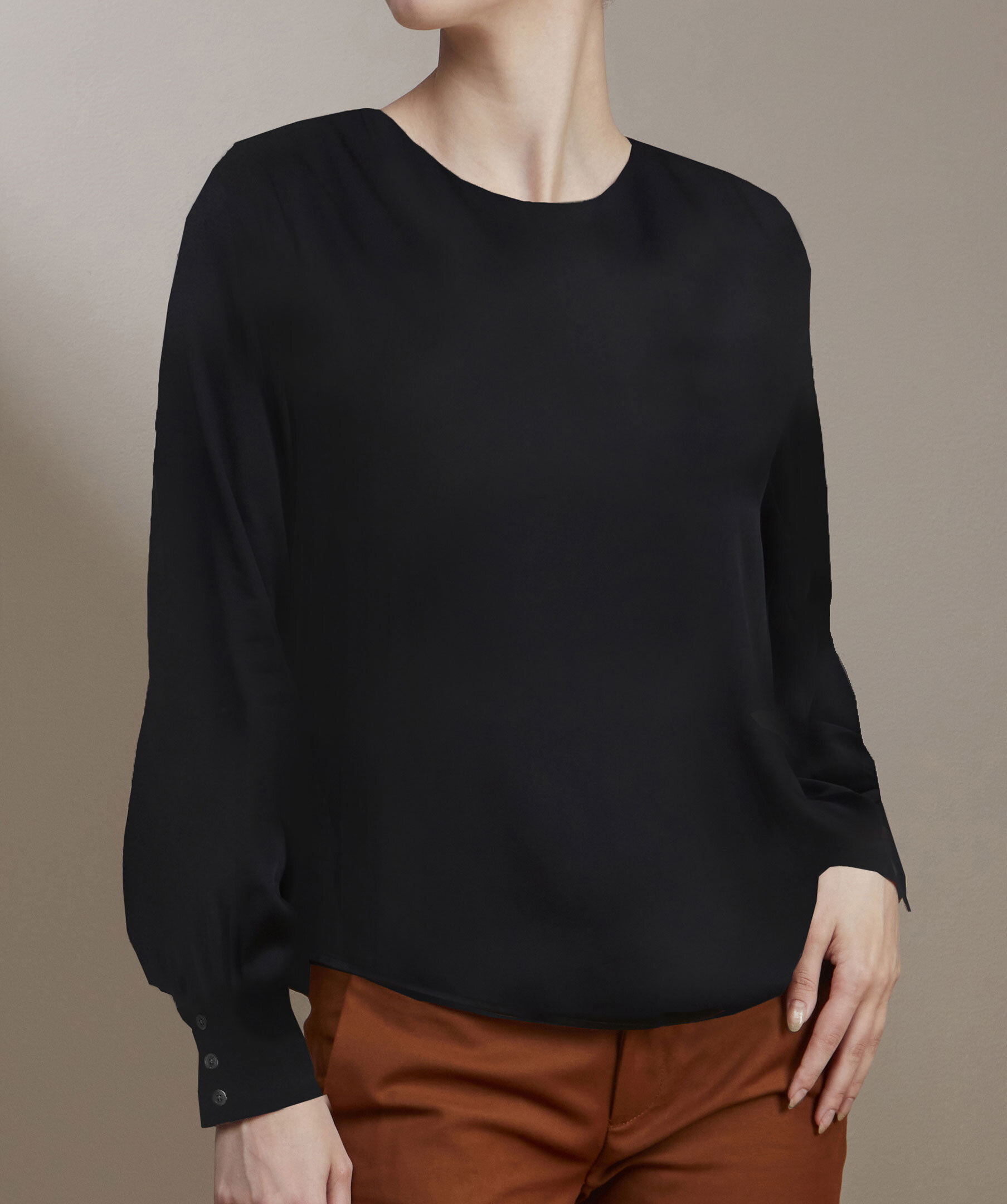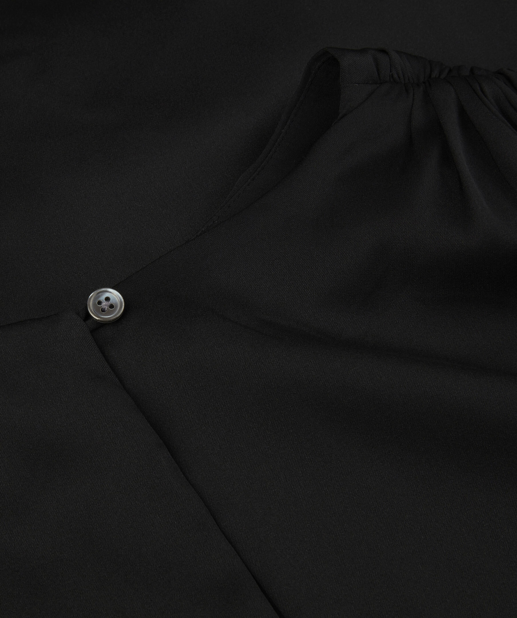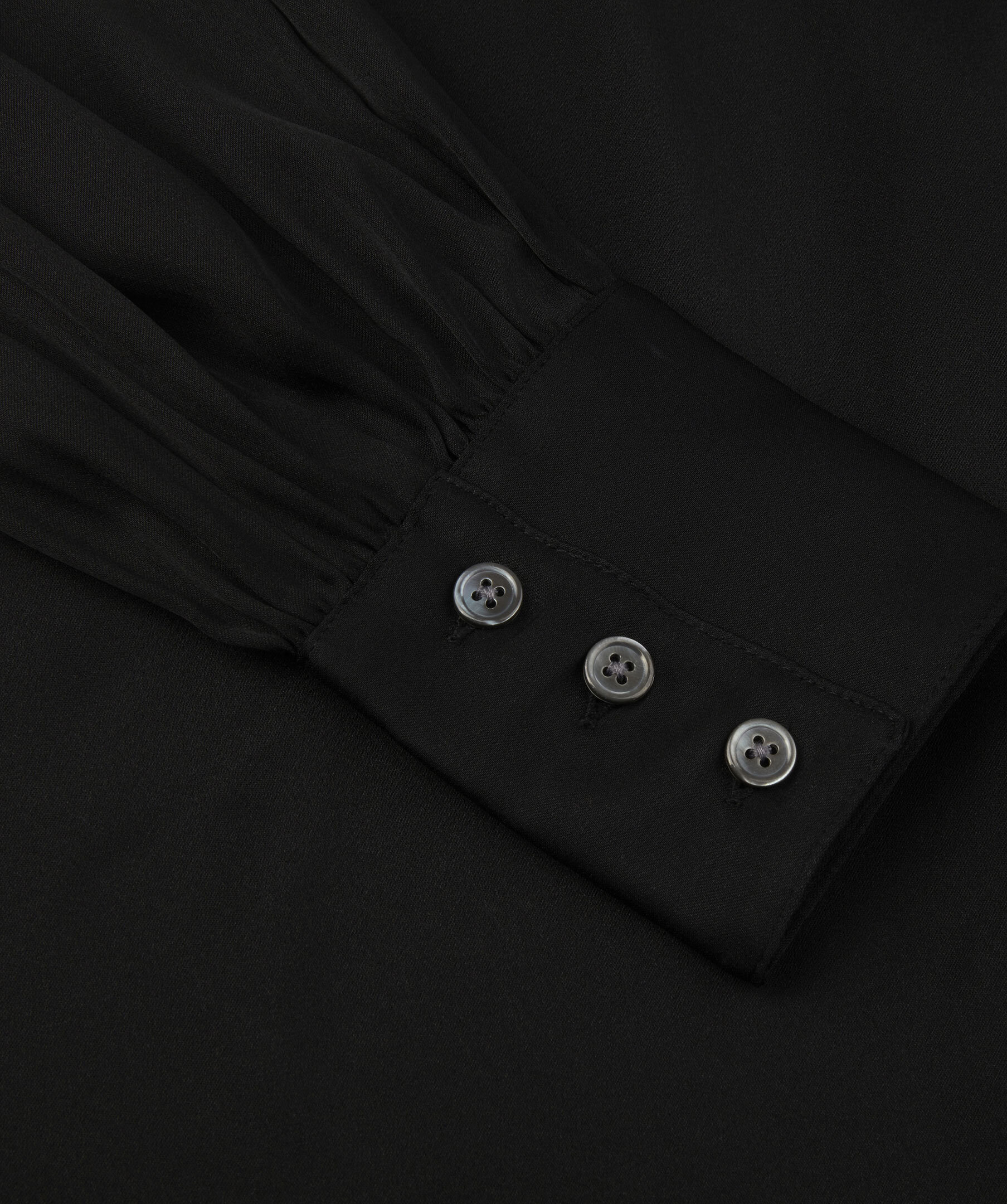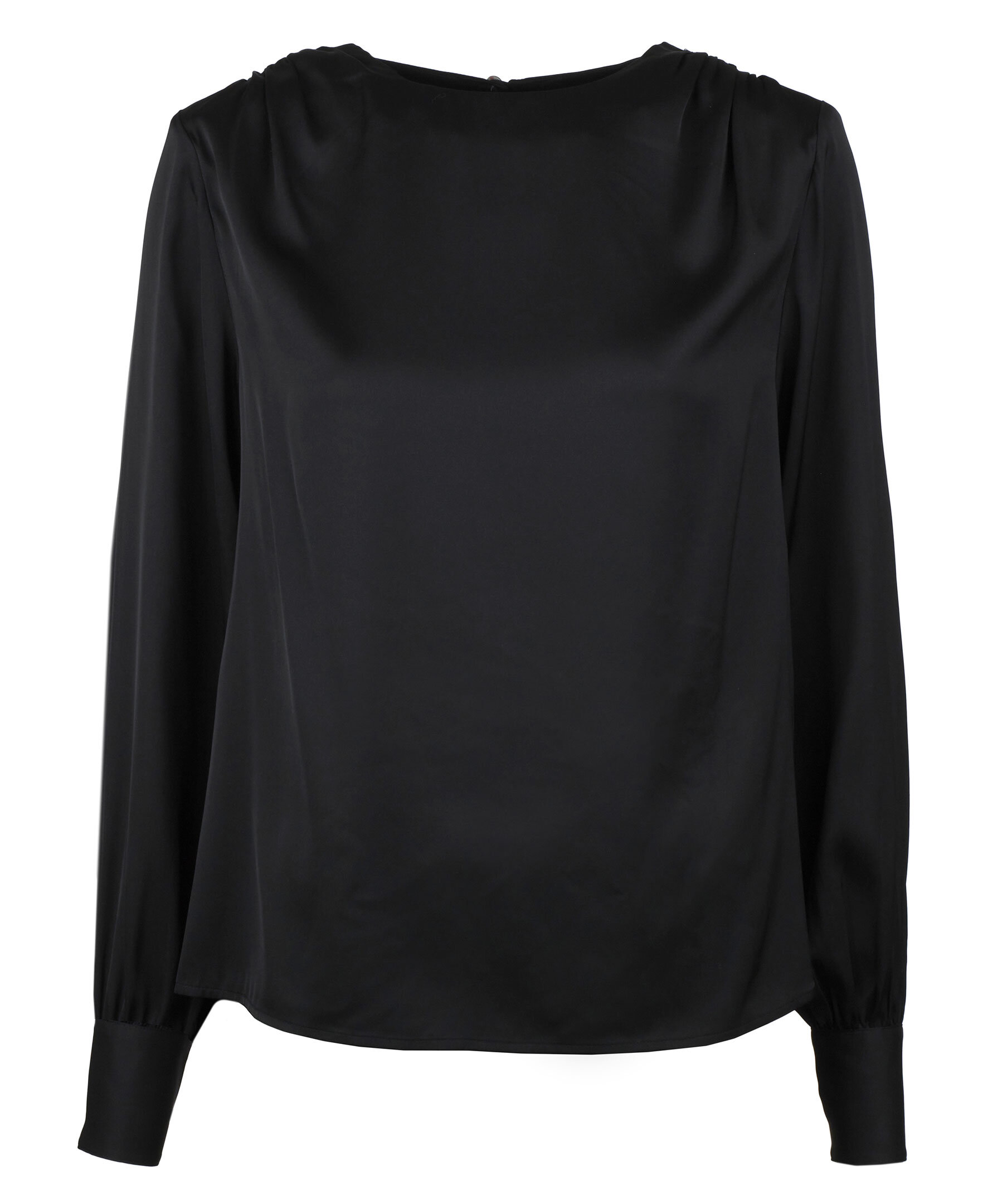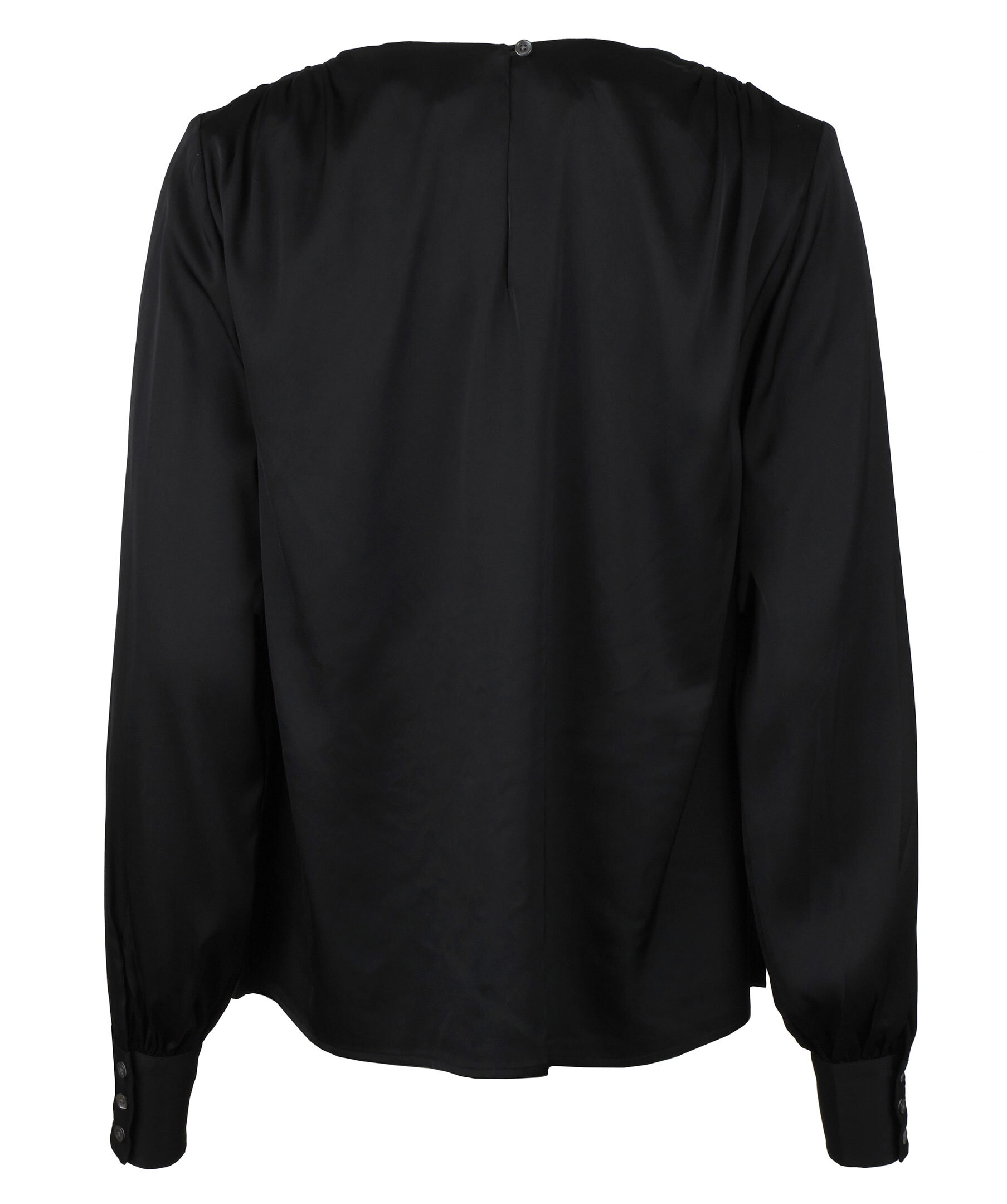Beige blus med en feminin passform, tillverkad i siden. Blusen är detaljerad med axelvaddar och långa manschetter.