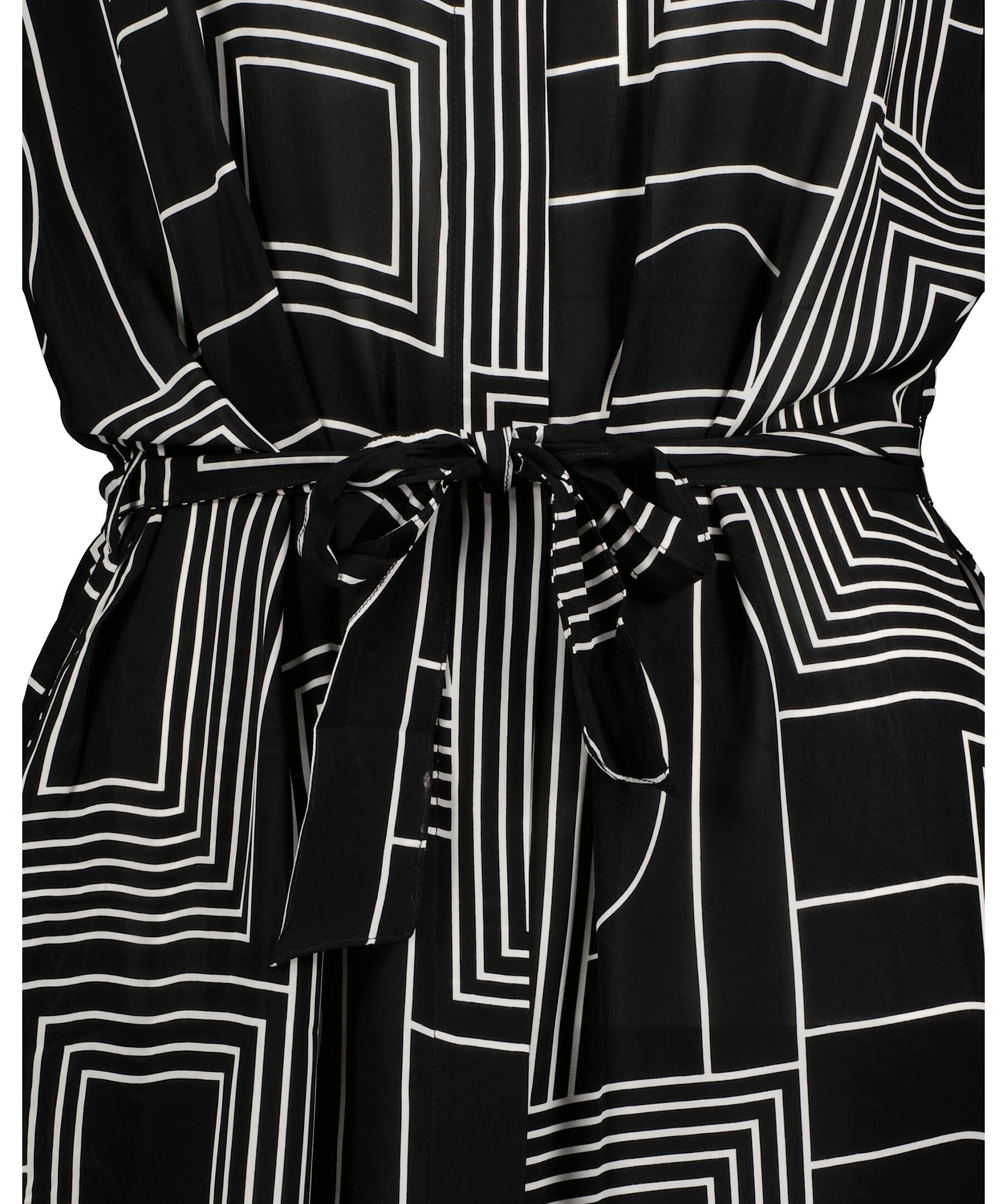 Svart skjortklänning från Stenströms. Tillverkad i 100% viskos. Dold knäppning i fram samt snörning. Vitt grafiskt mönster över hela klänningen.