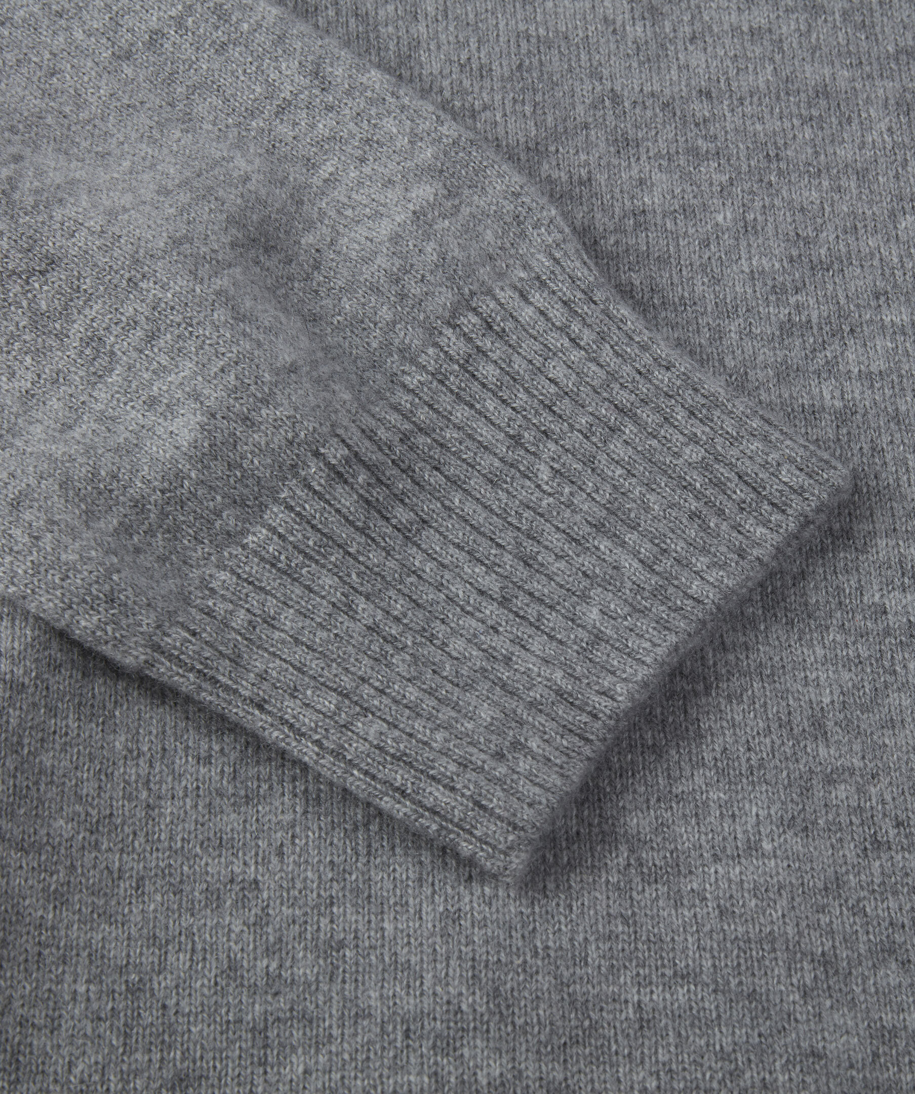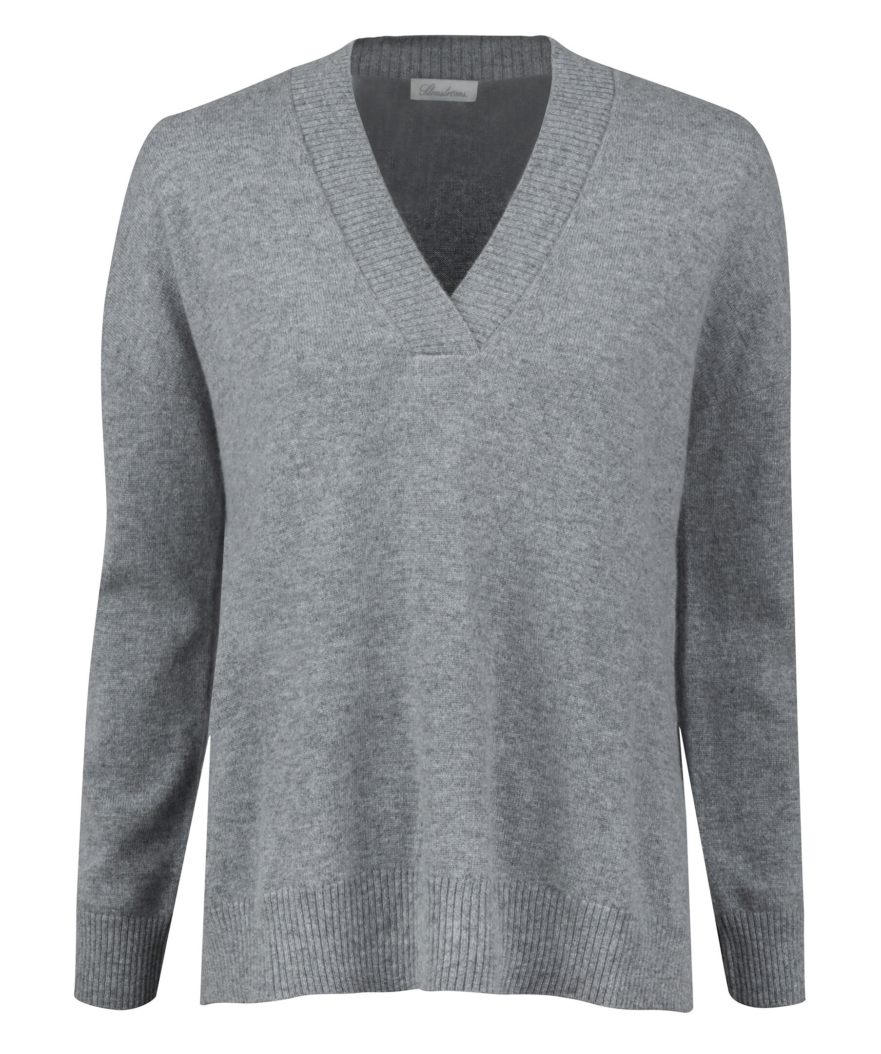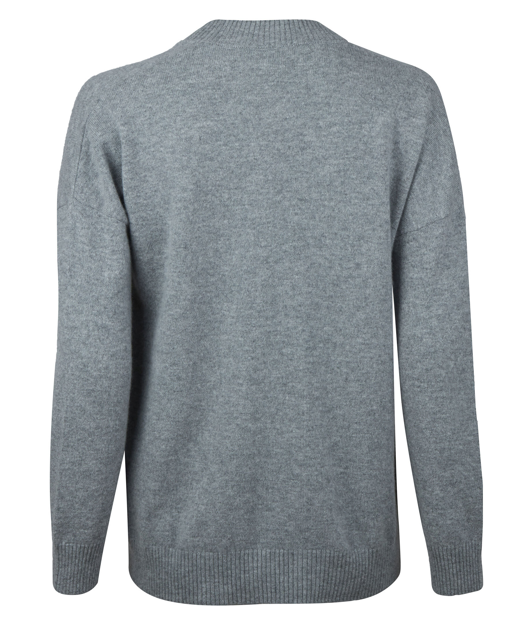 Grå Duvet v-ringad tröja, tillverkad i kashmir. Tröjan är designad med ribbstickad krage, ärmslut samt fåll.