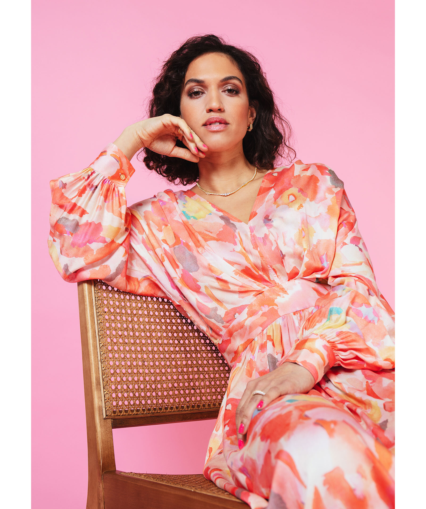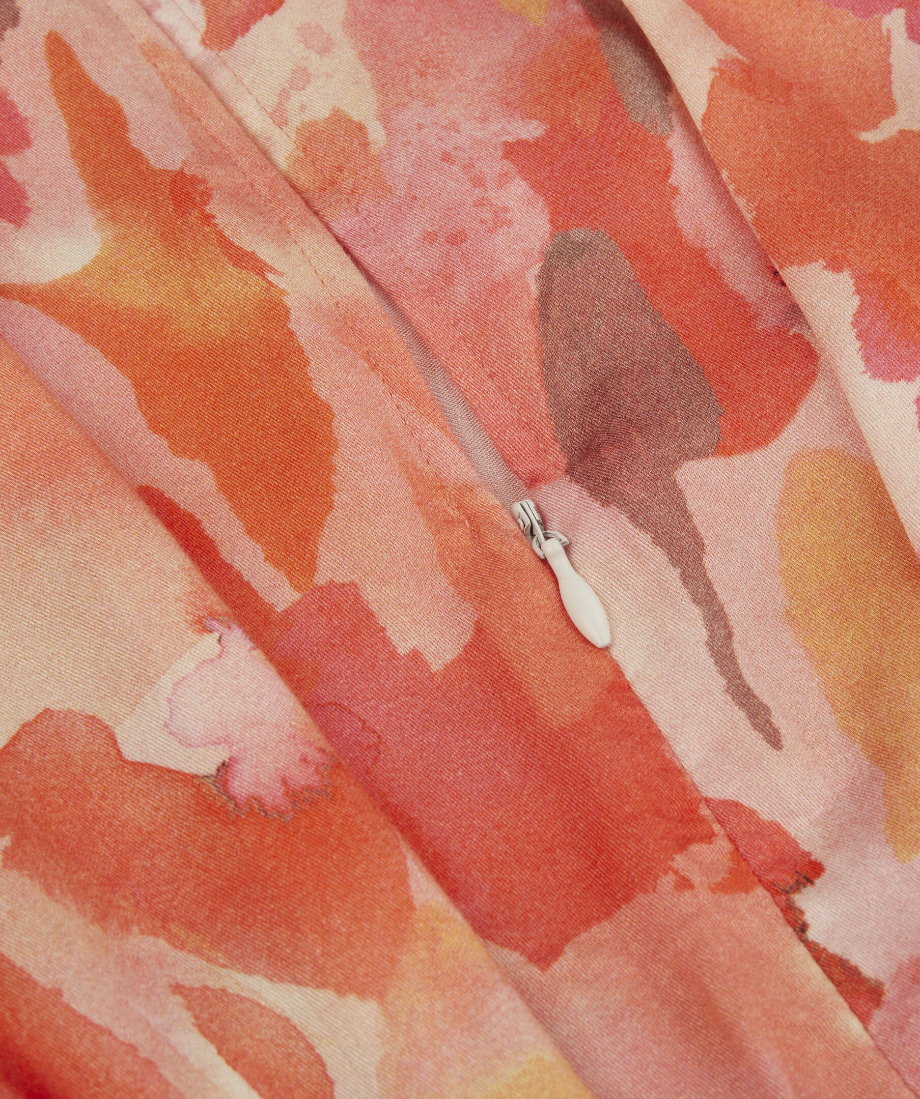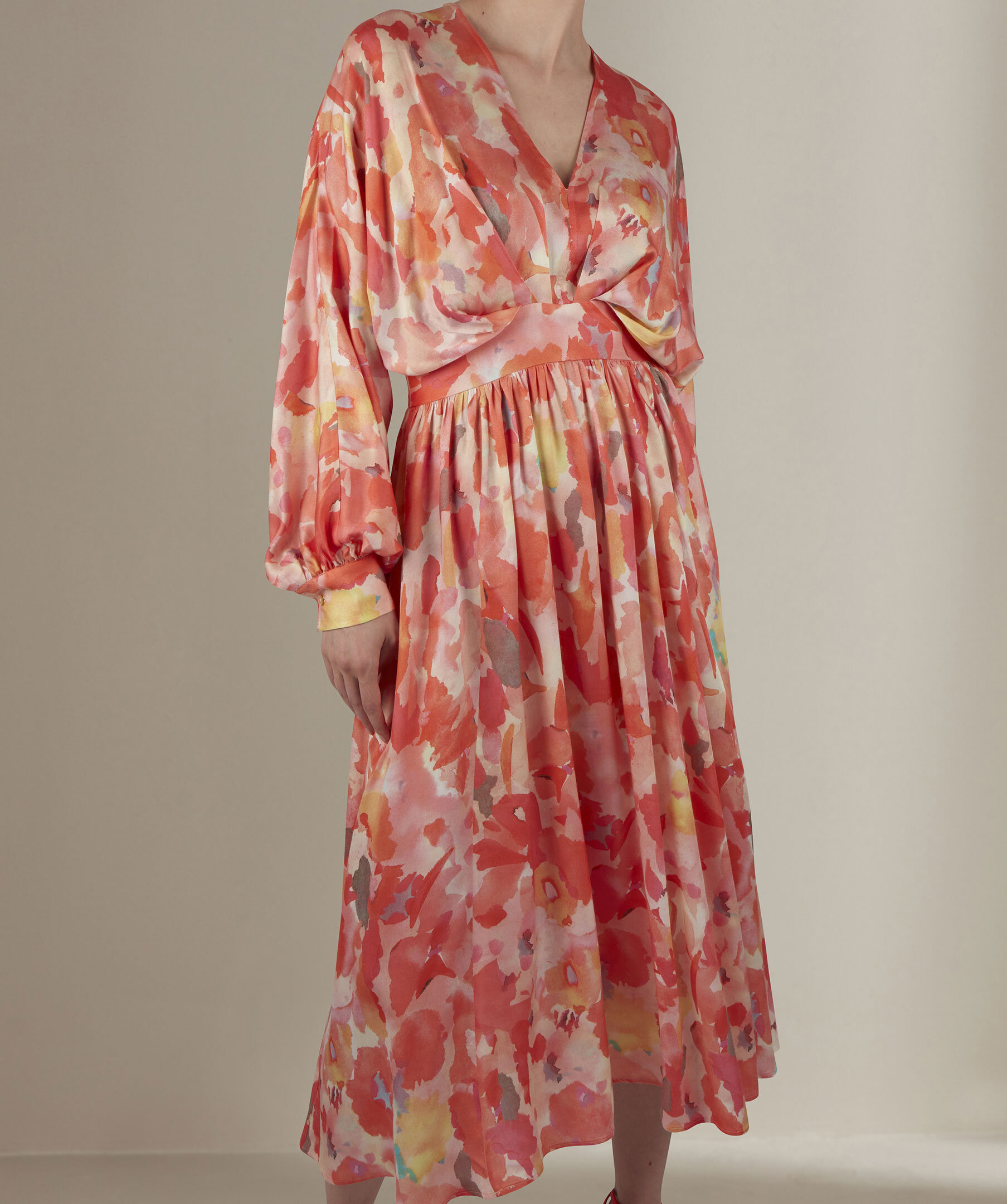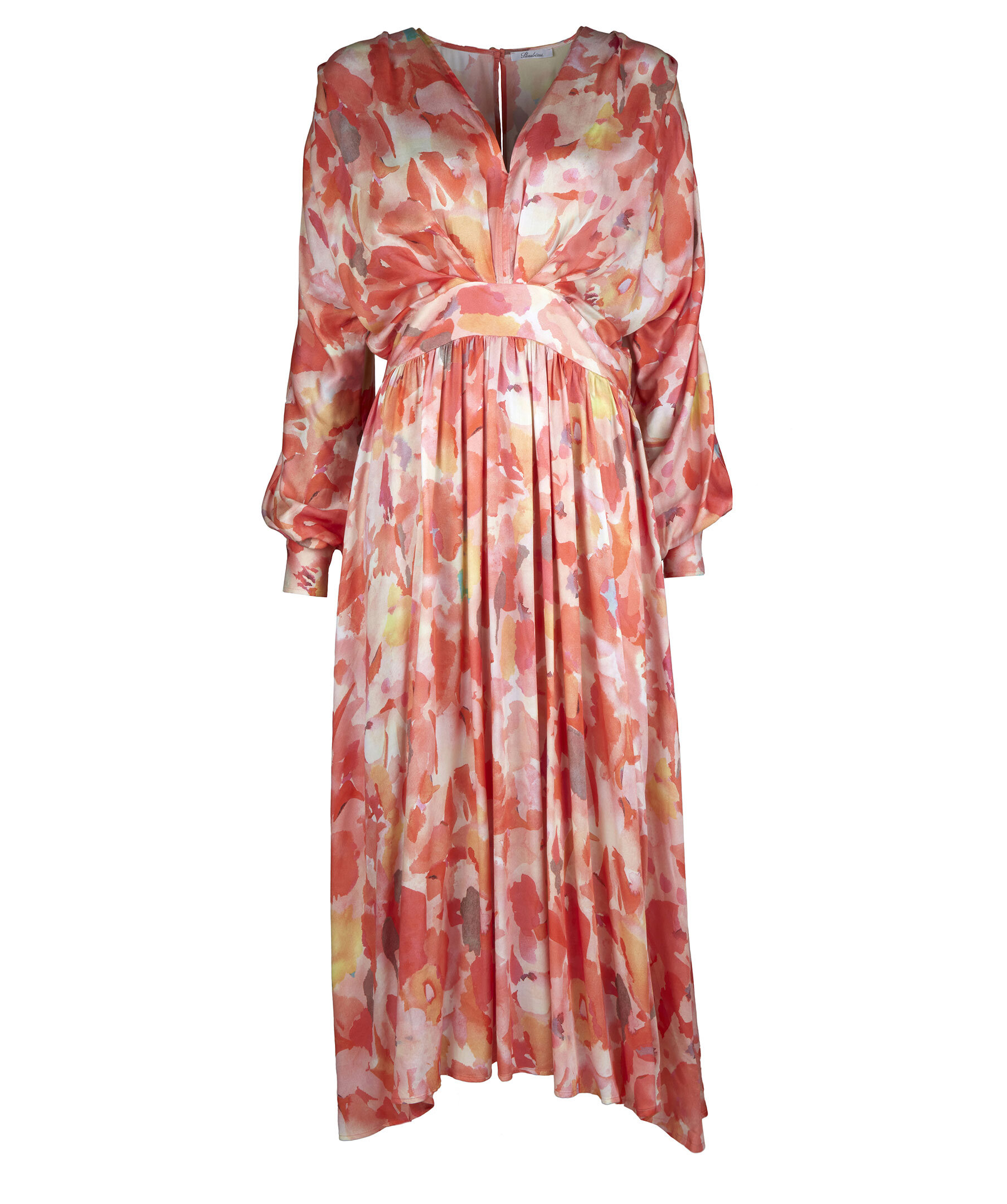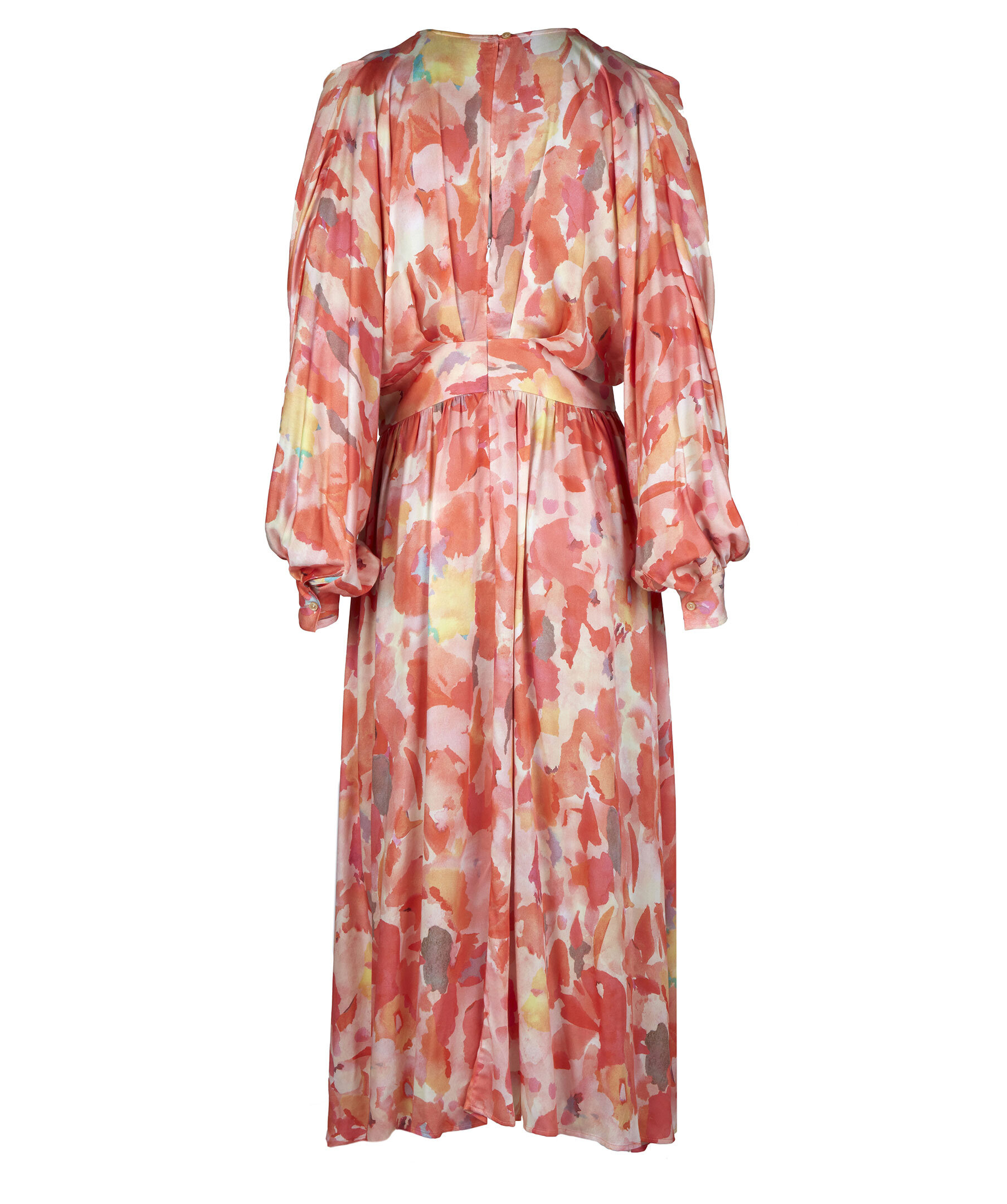 Orange halvlång klänning, tillverkad av viskos. Detaljerad med ett mönster, en V-ringning och långa puffärmar.