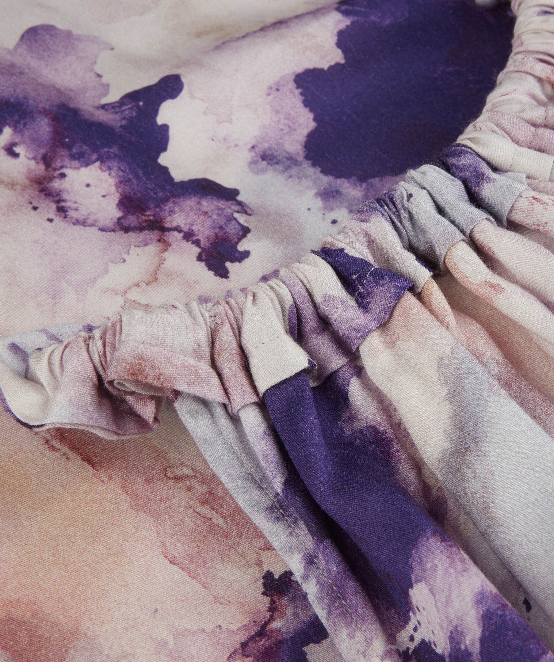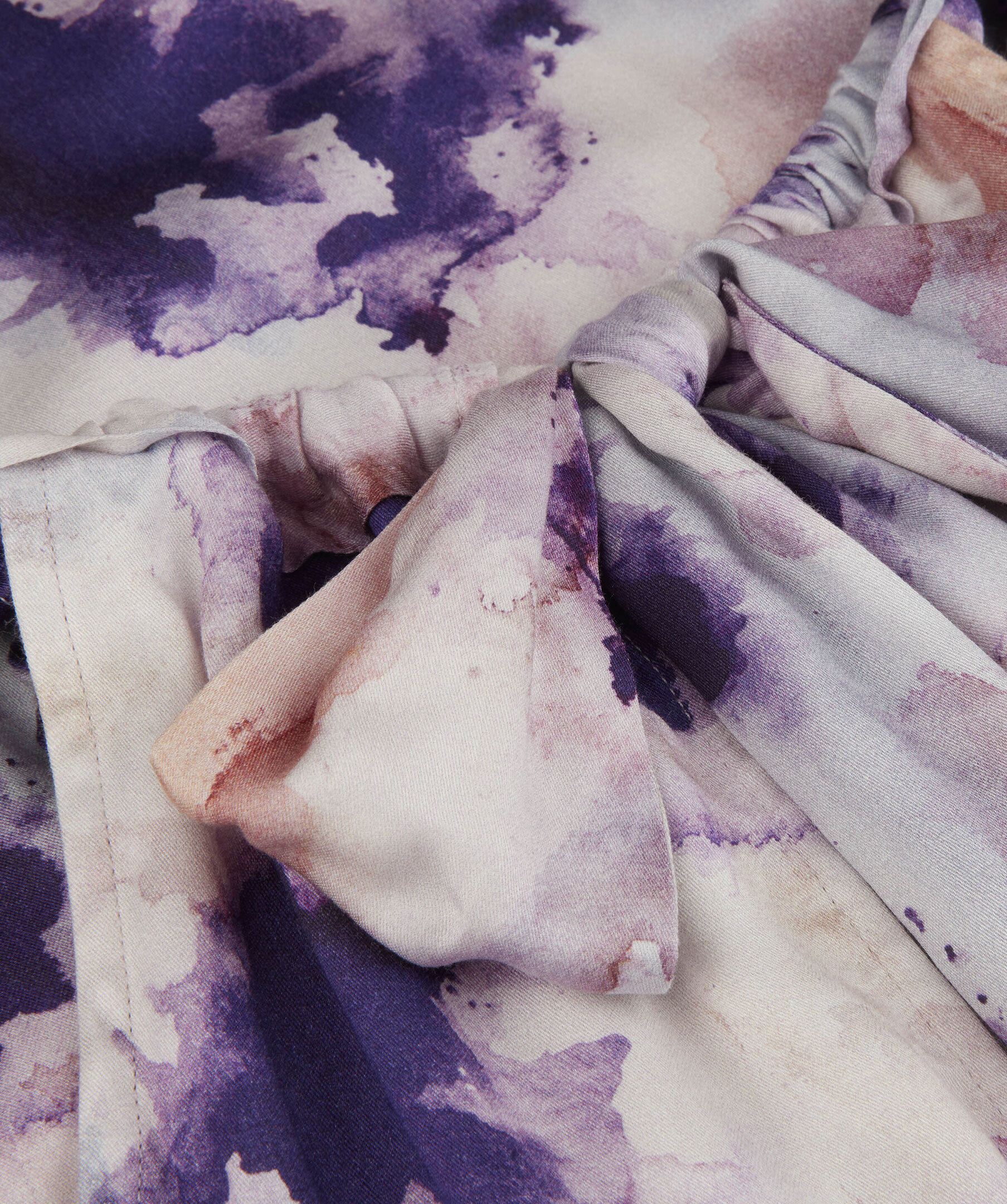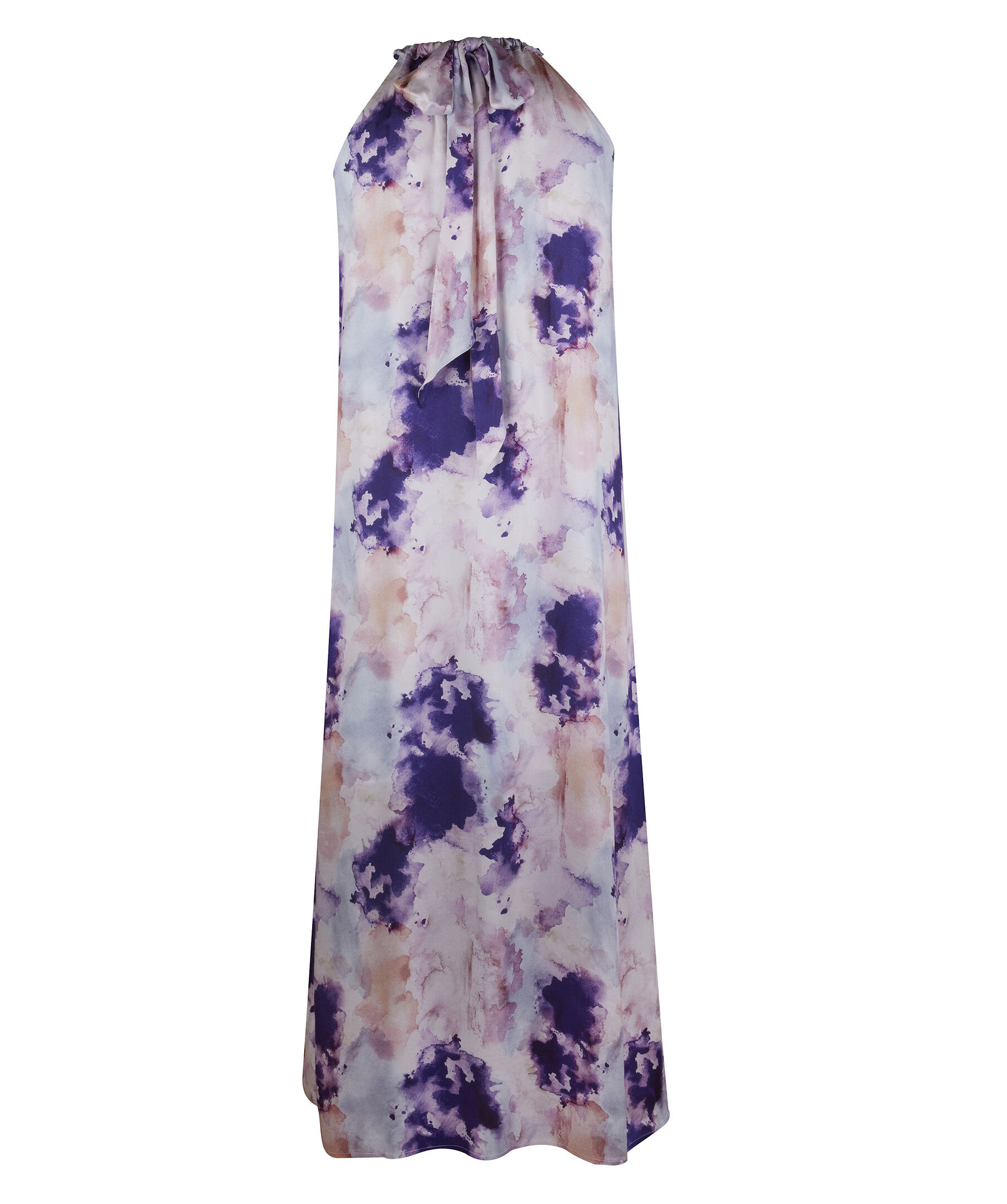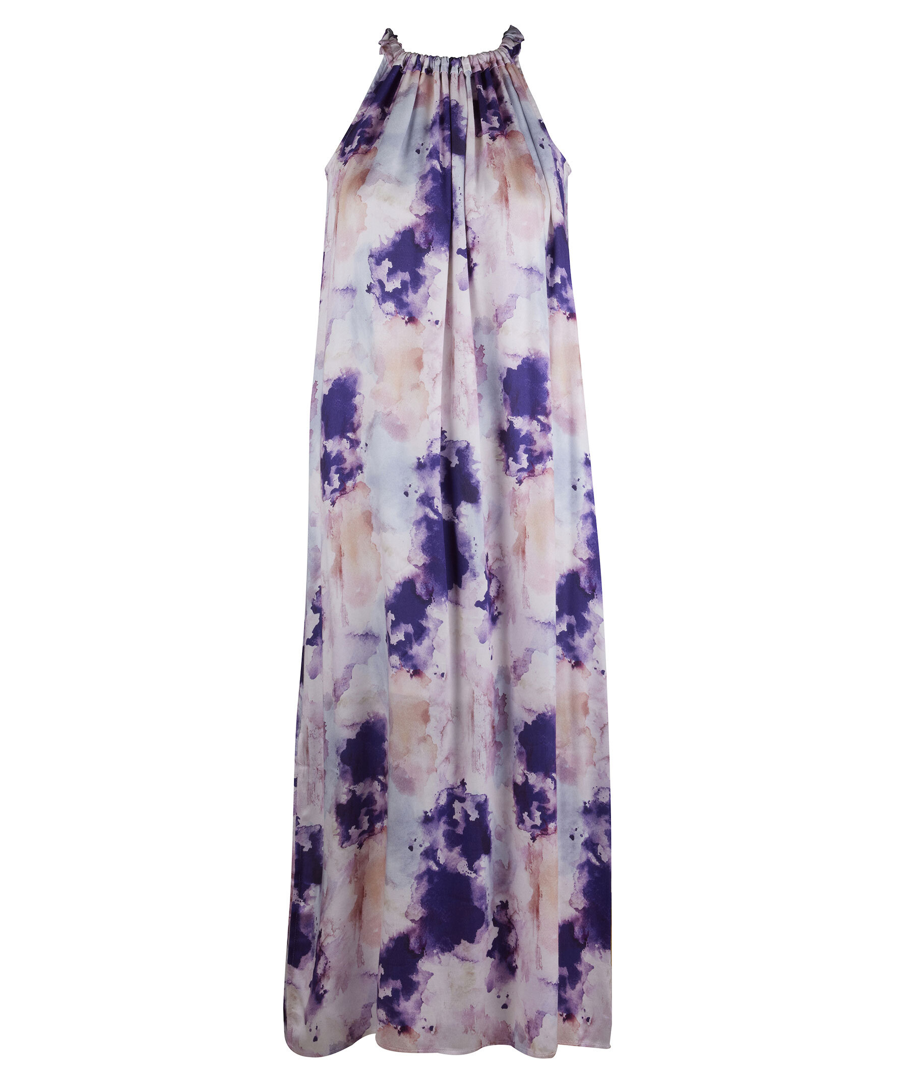 Lila lång ärmlös klänning, tillverkad av viskos. Detaljerad med ett blommigt mönster, halterneck och rosett i ryggen.