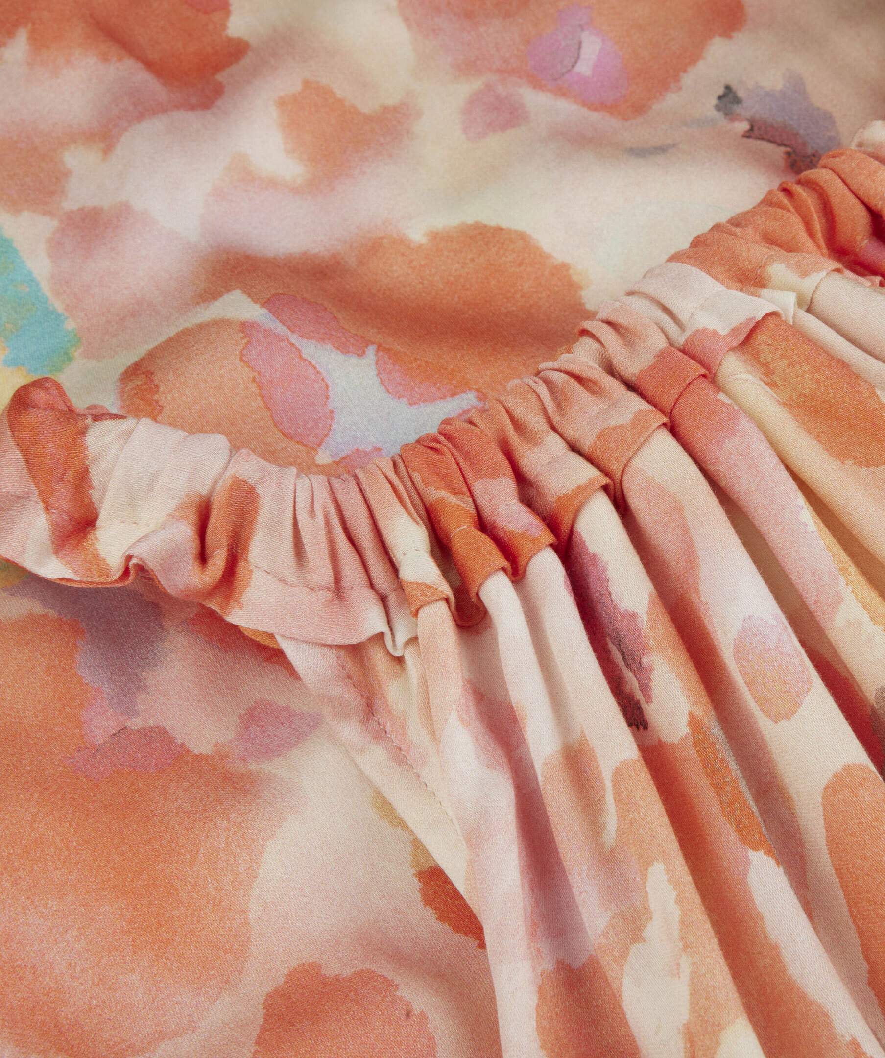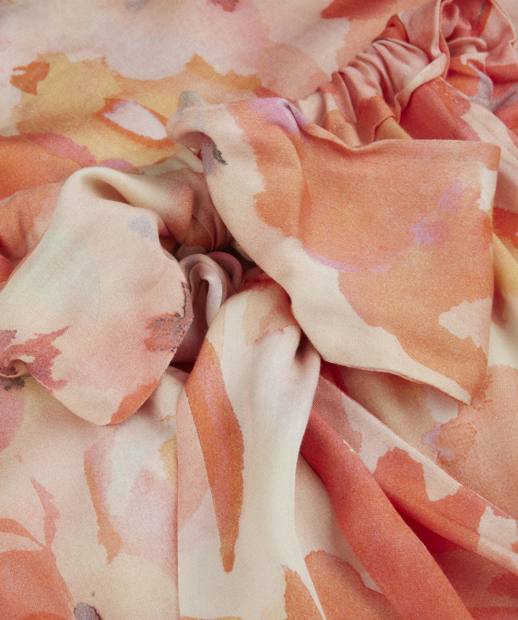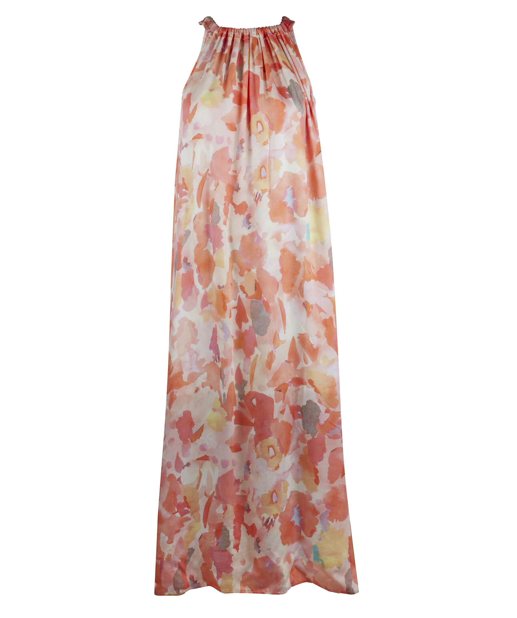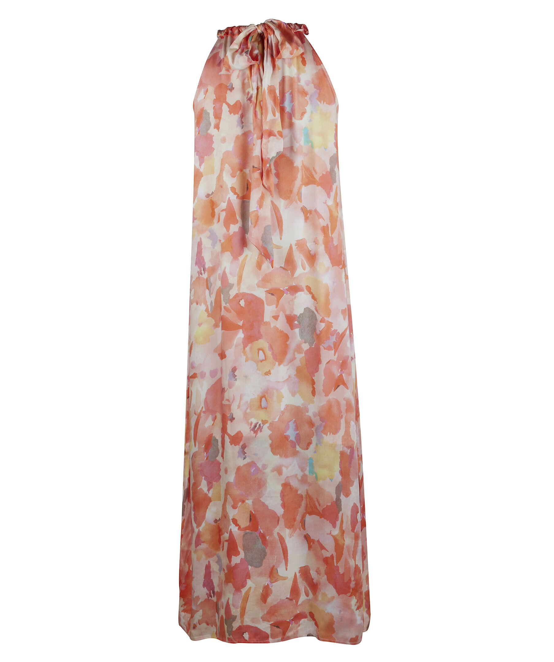Orange lång ärmlös klänning, tillverkad av viskos. Detaljerad med ett blommigt mönster, halterneck och rosett i ryggen.