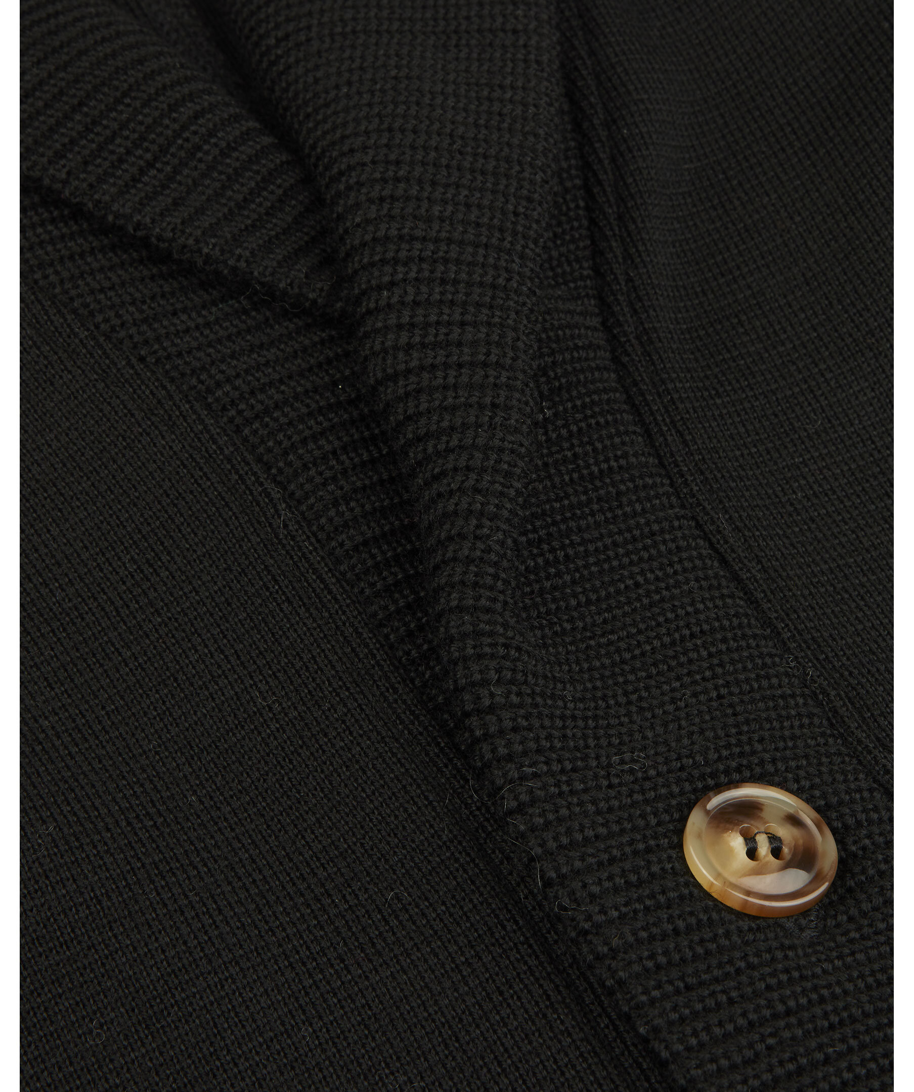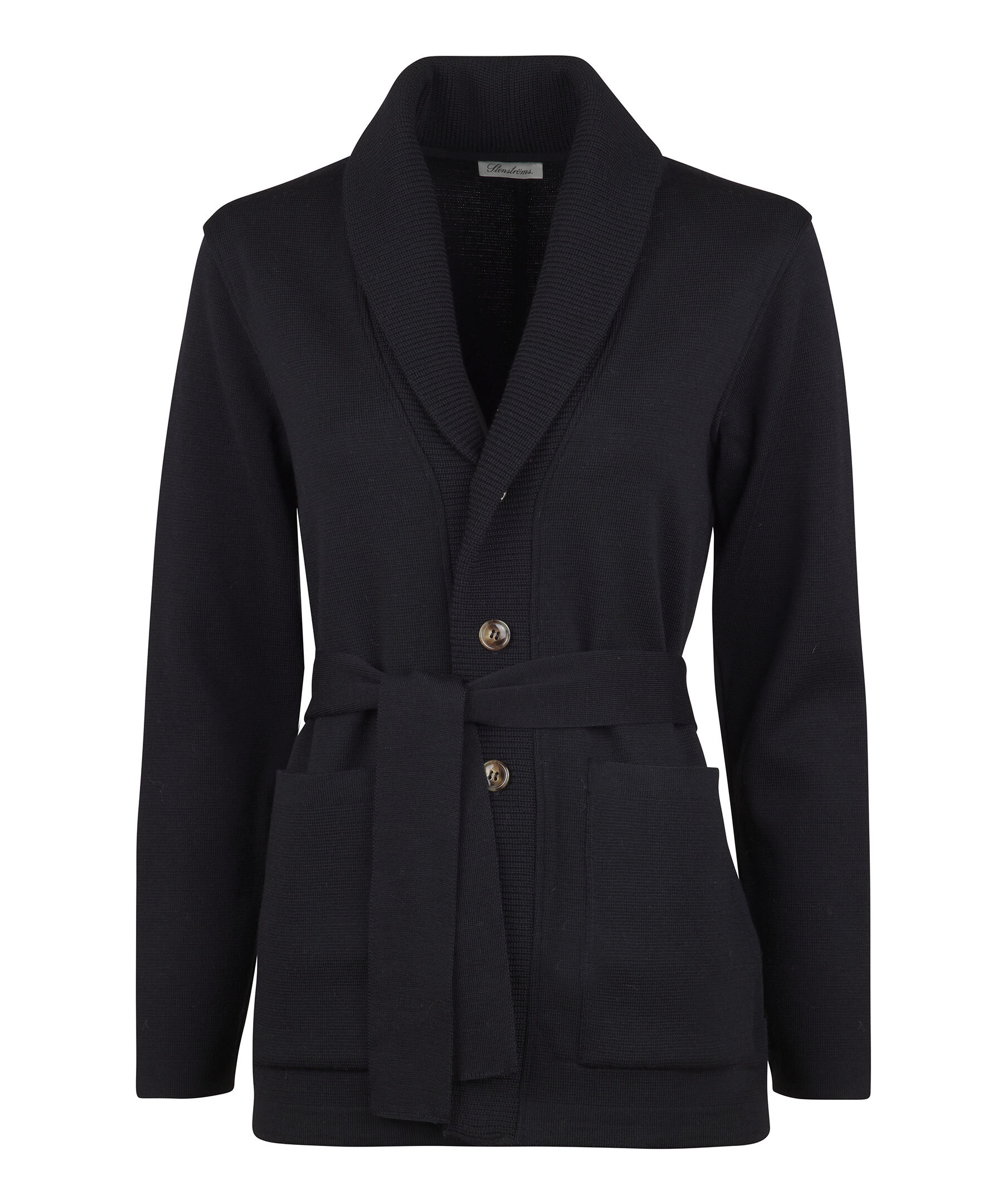 Svart, stickad cardigan från Stenströms. Tillverkad i merinoull. Två fickor och ett bälte i midjan. Bruna knappar.
