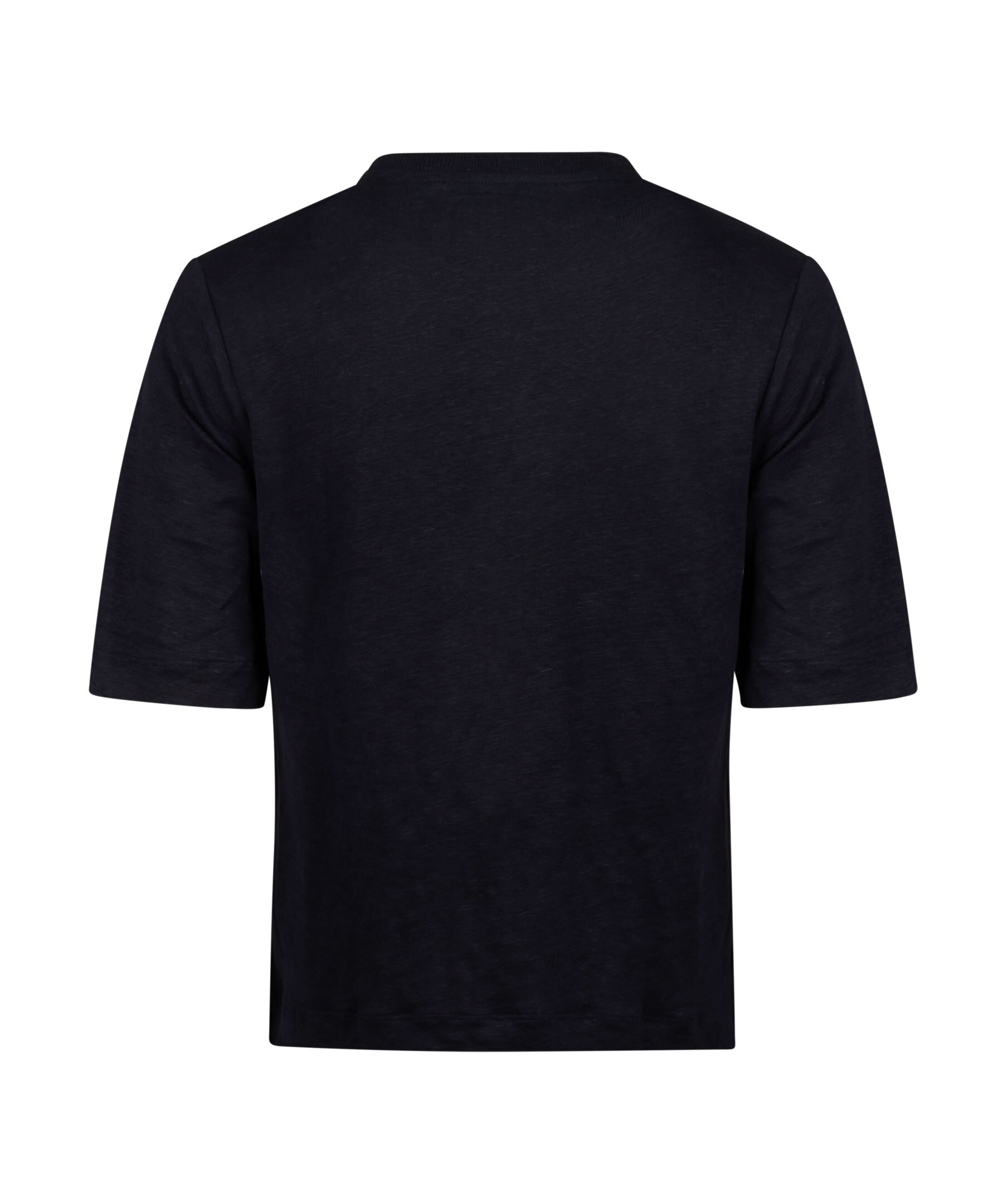 Denna topp är tillverkad av linne och har rundad halsringning och korta ärmar.