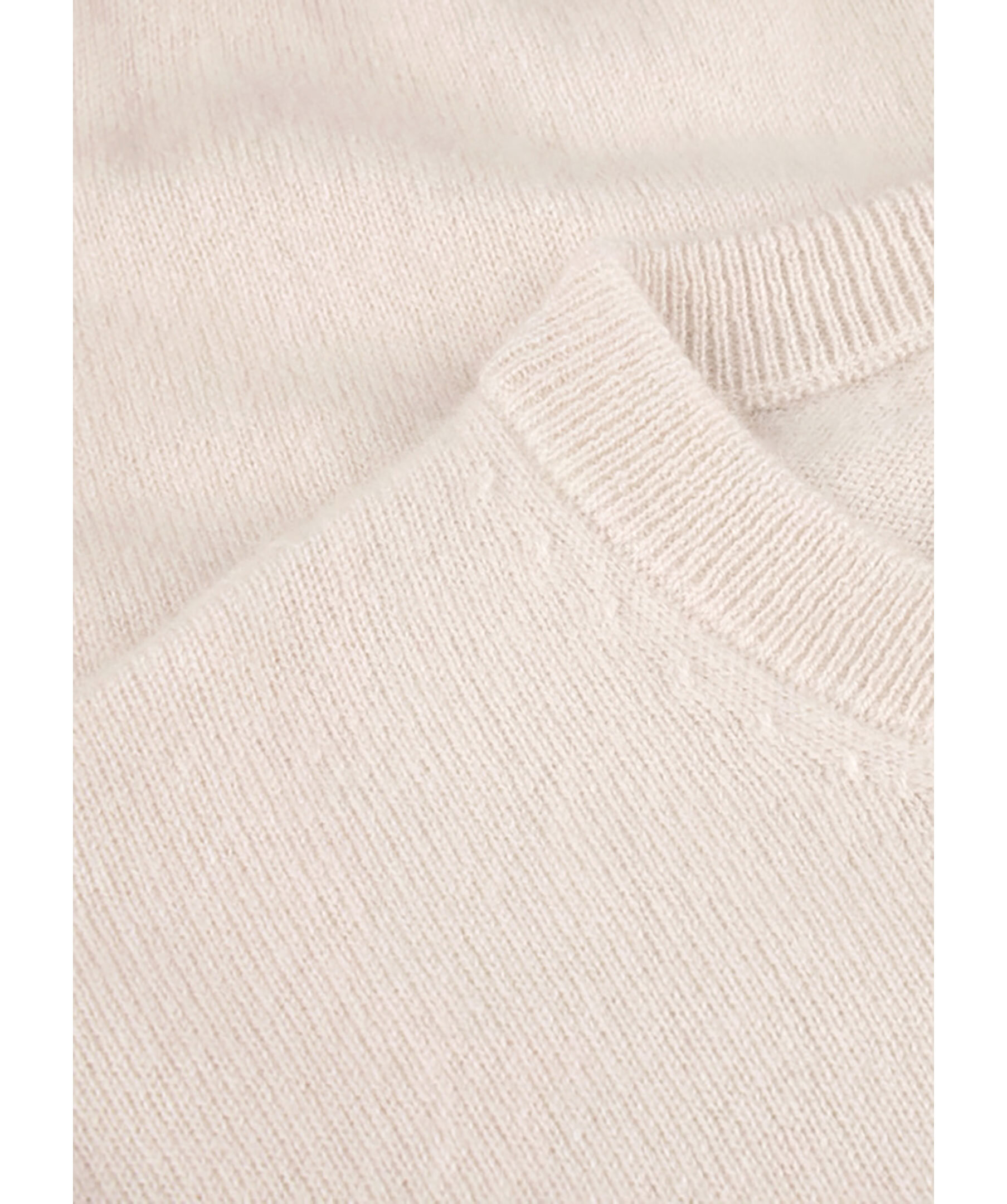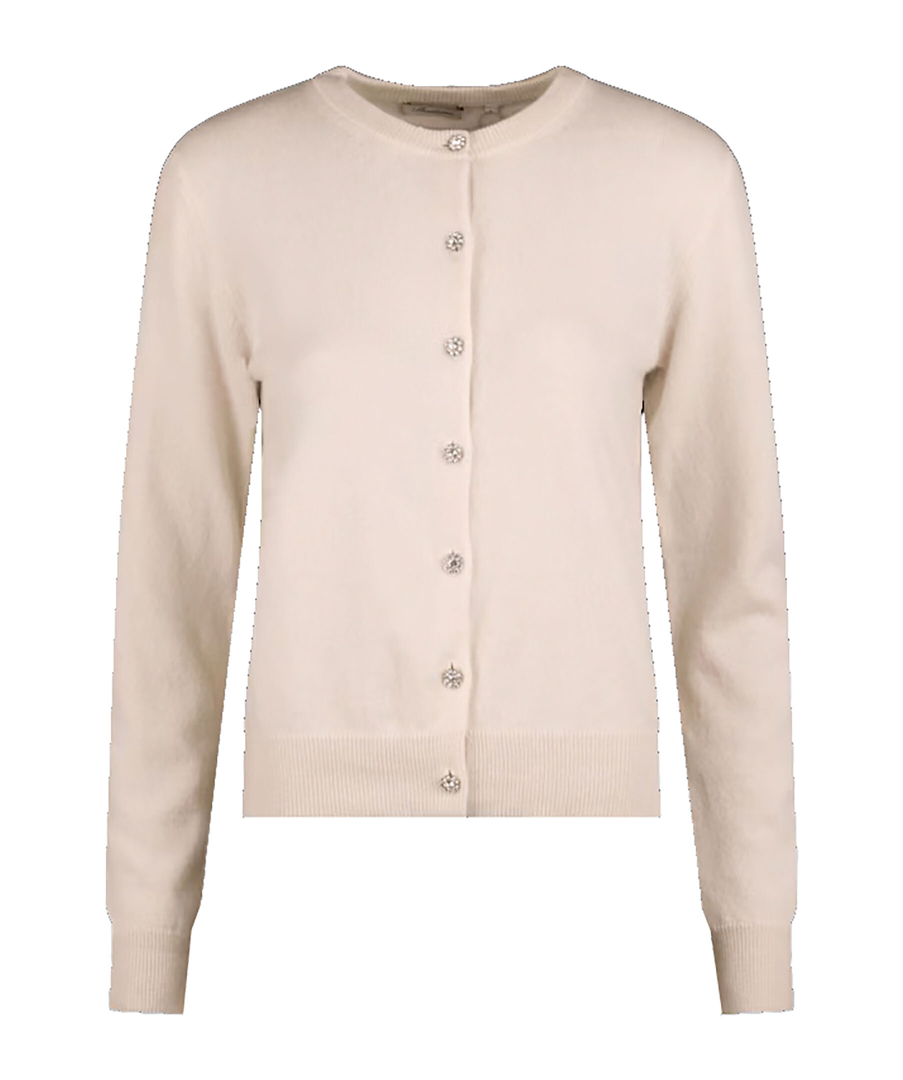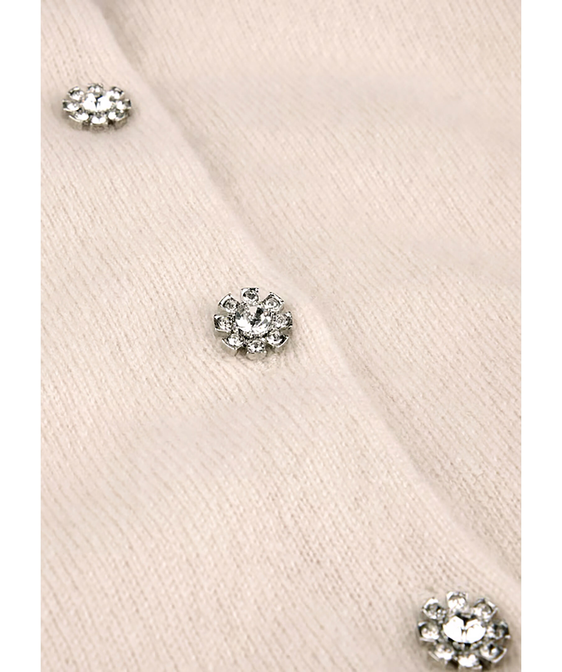 Offwhite kofta från Stenström. Koftan har vackra blomliknande strassknappar, rundad halsringning och ribbade detaljer vid krage, tröj- och ärmslut. Tillverkad i 100% Kashmir.