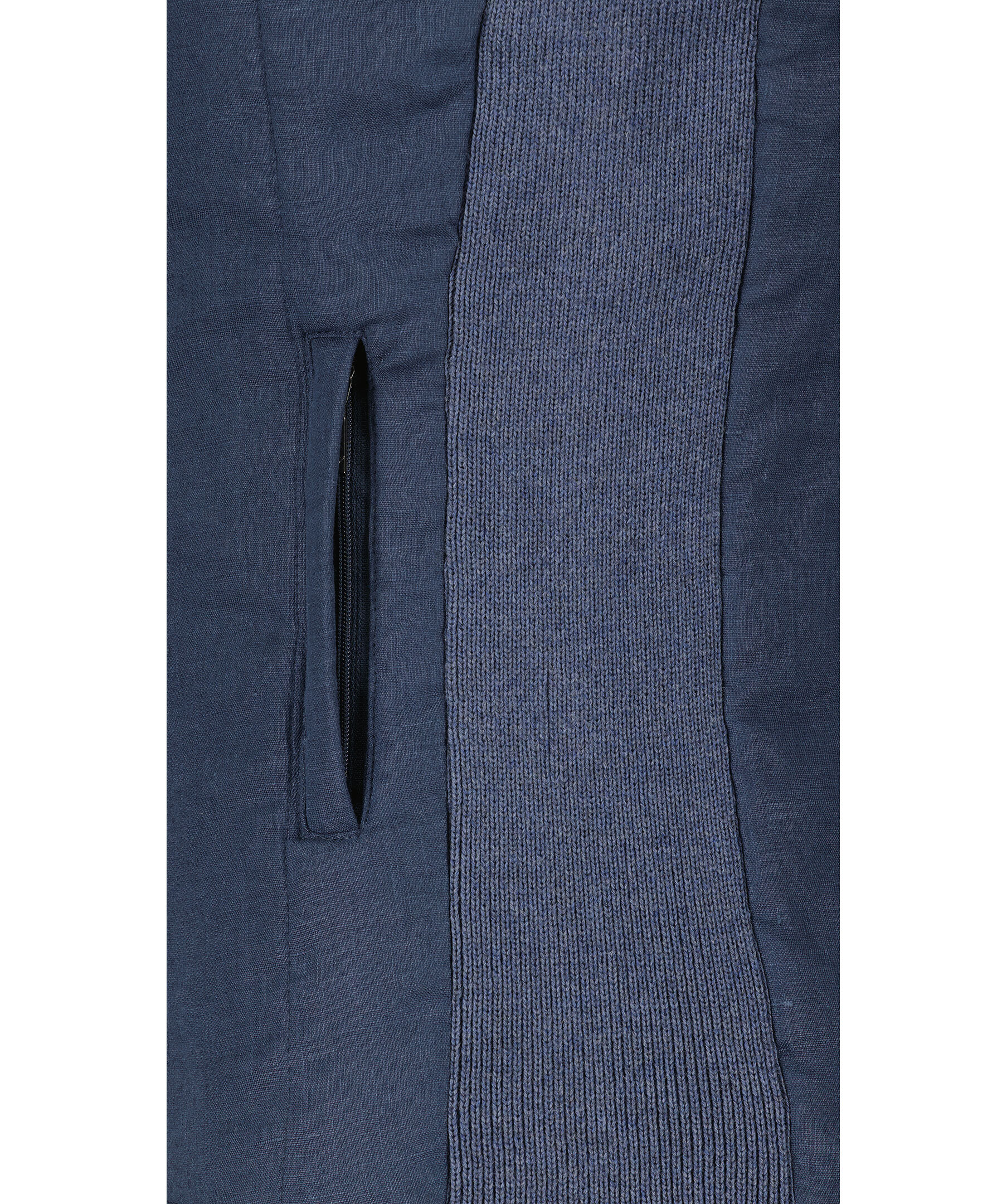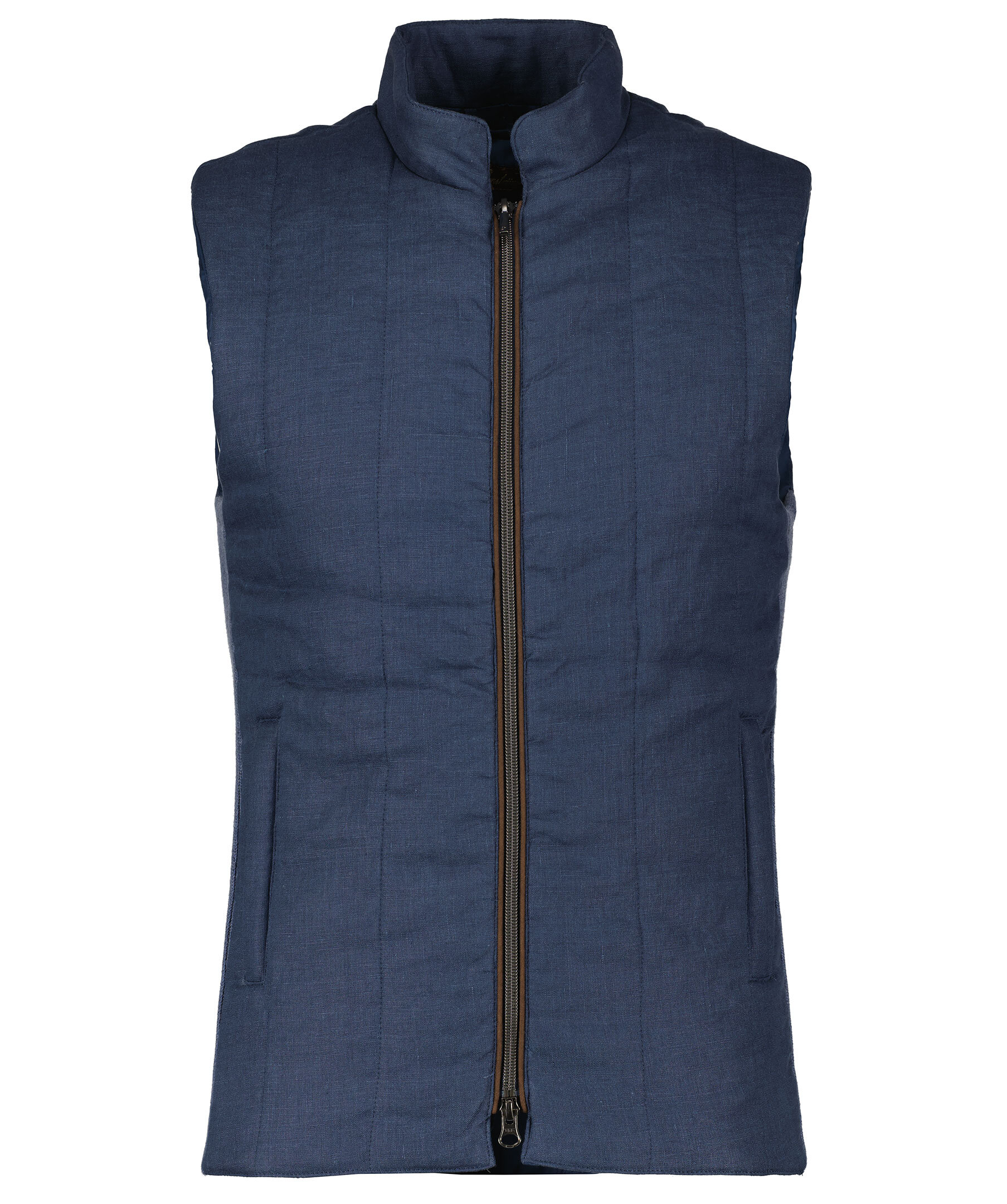 Blå vadderad väst med en rak passform, tillverkad i Linne. Stängs framtill med tvåvägsdragkedja. Västen är detaljerad med en stickad sida, dragkedja framtill samt två sidfickor och en innerficka som stängs med magnet.