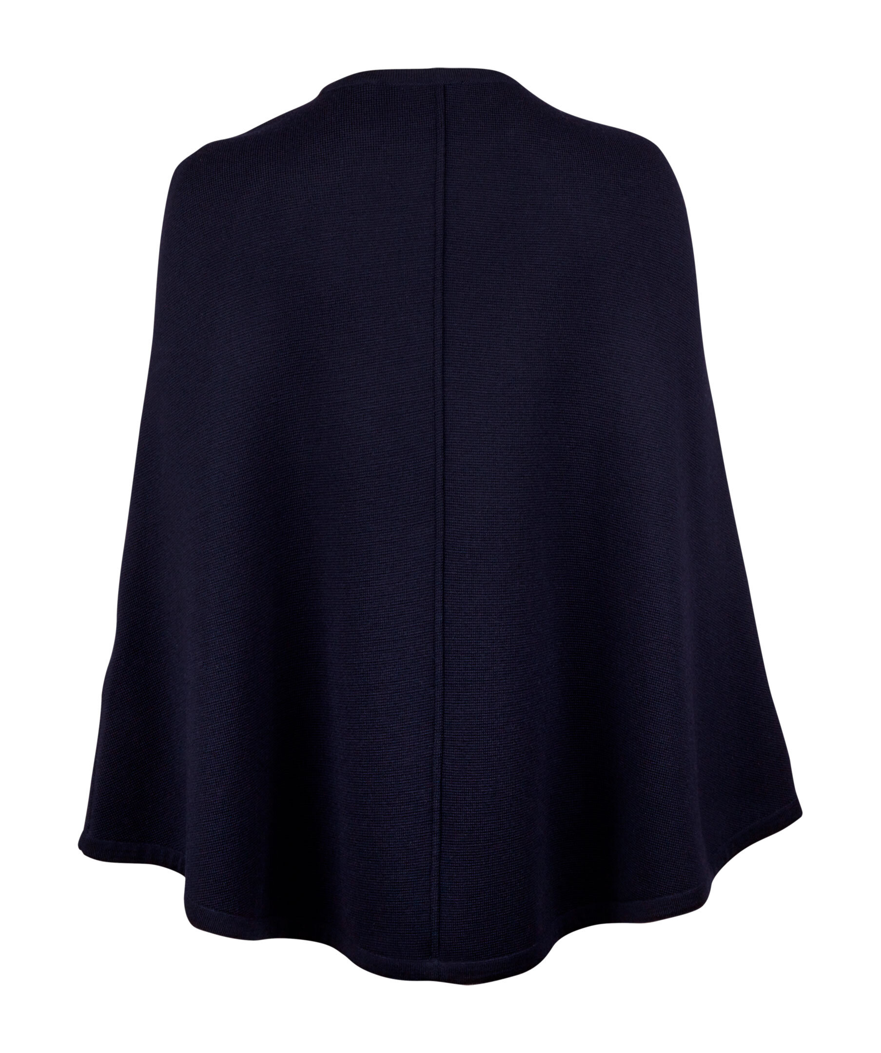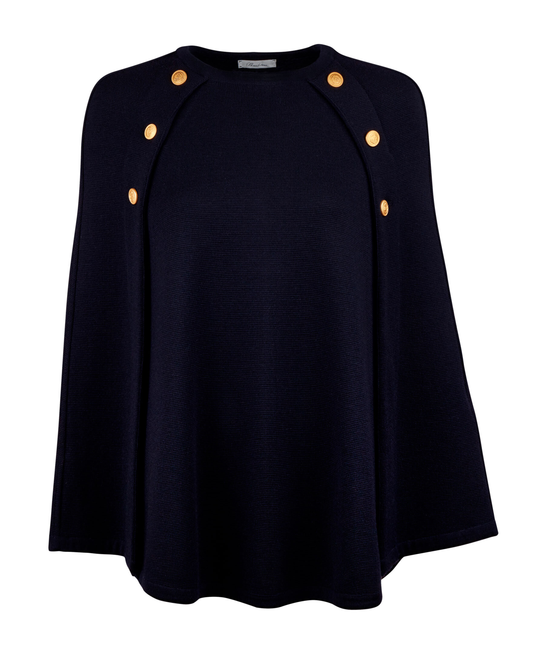 Denna cape är tillverkad av merinoull och är detaljerad med guldknappar på axlarna och slitsar i sidorna.