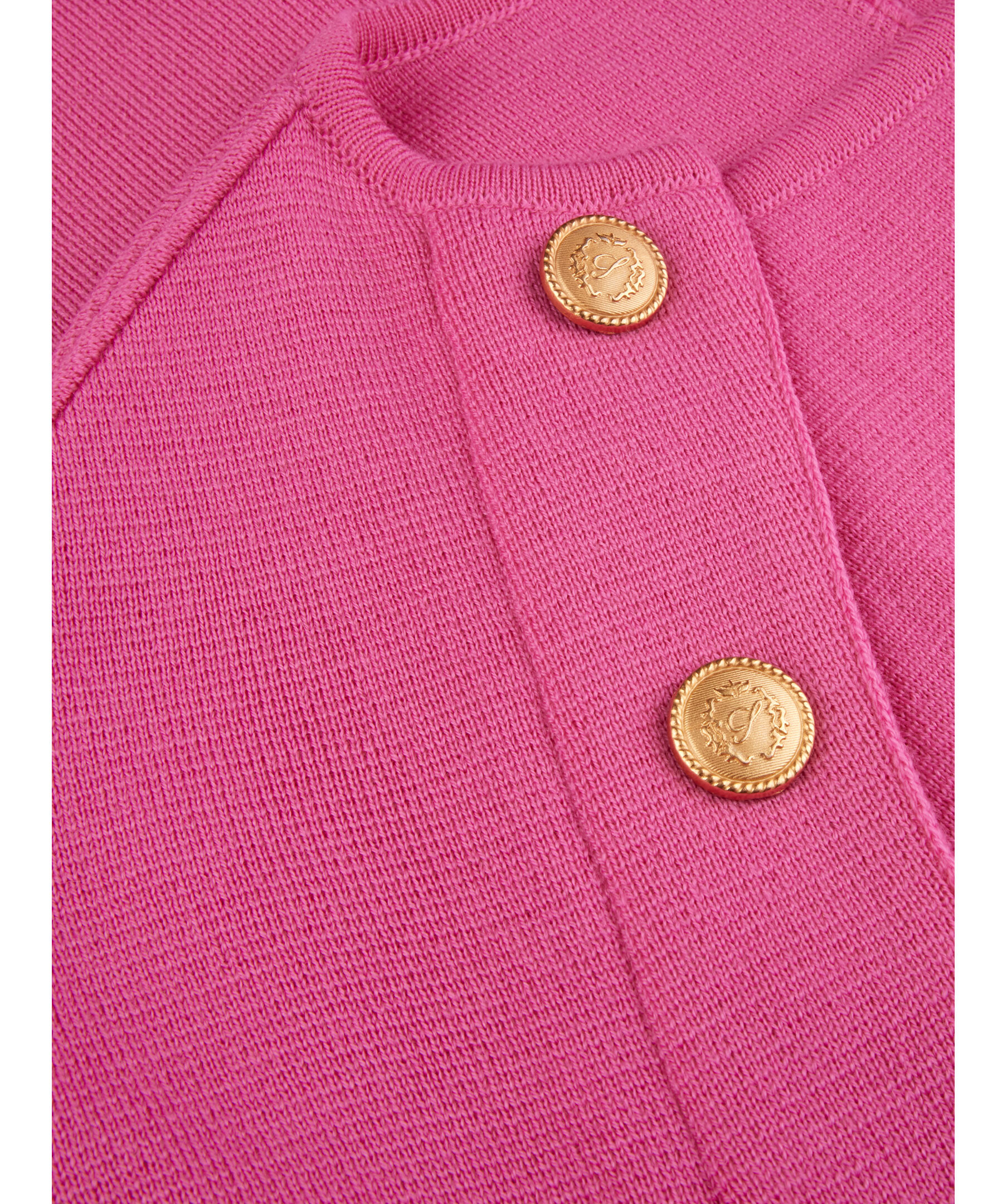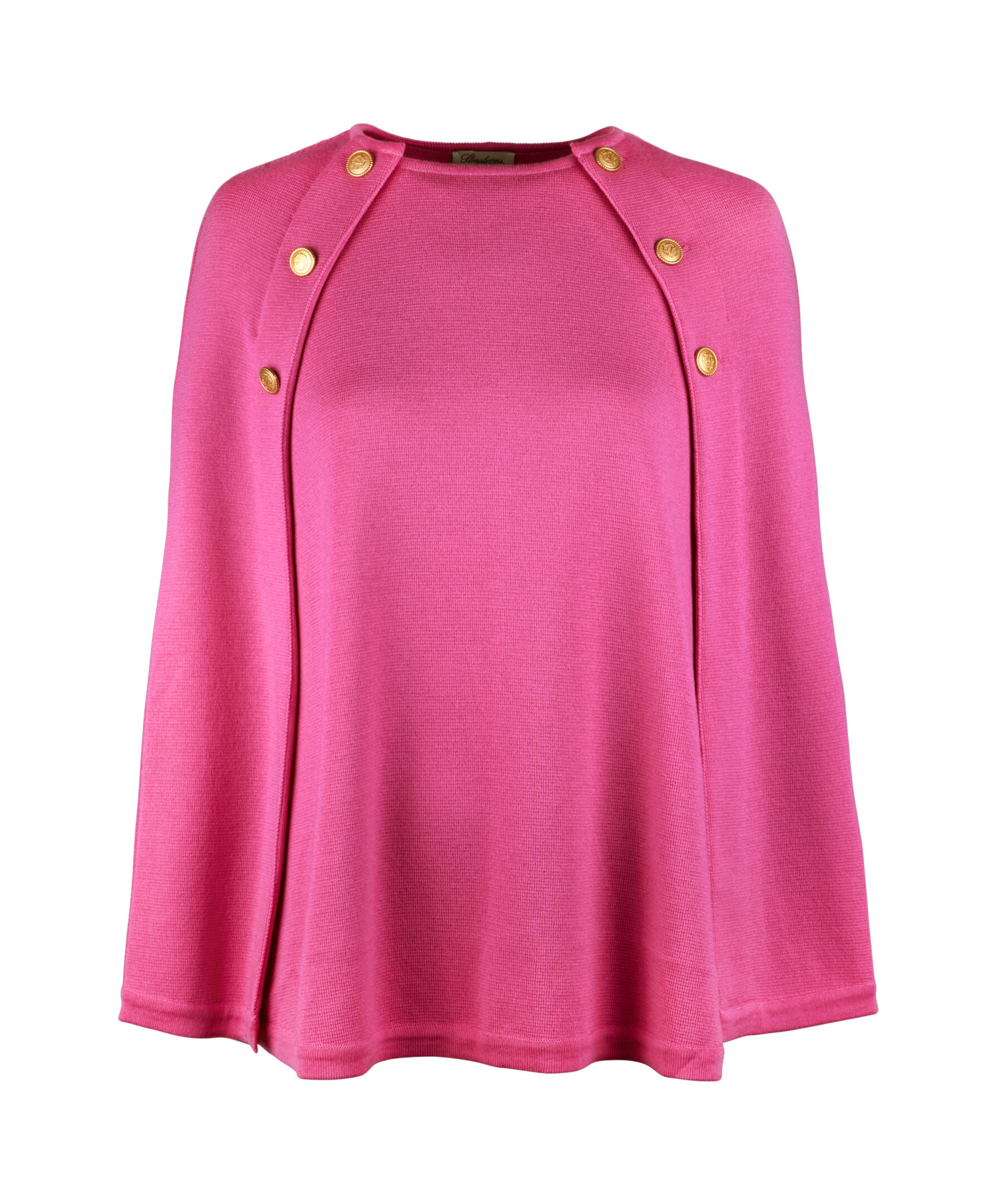 Denna cape är tillverkad av merinoull och är detaljerad med guldknappar på axlarna och slitsar i sidorna.