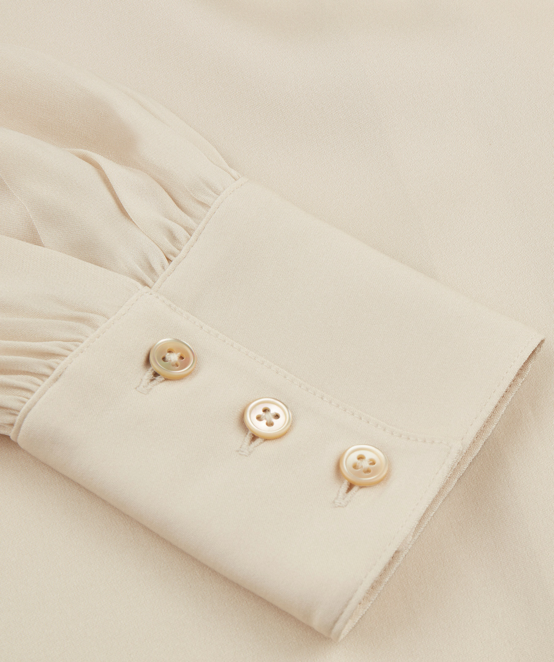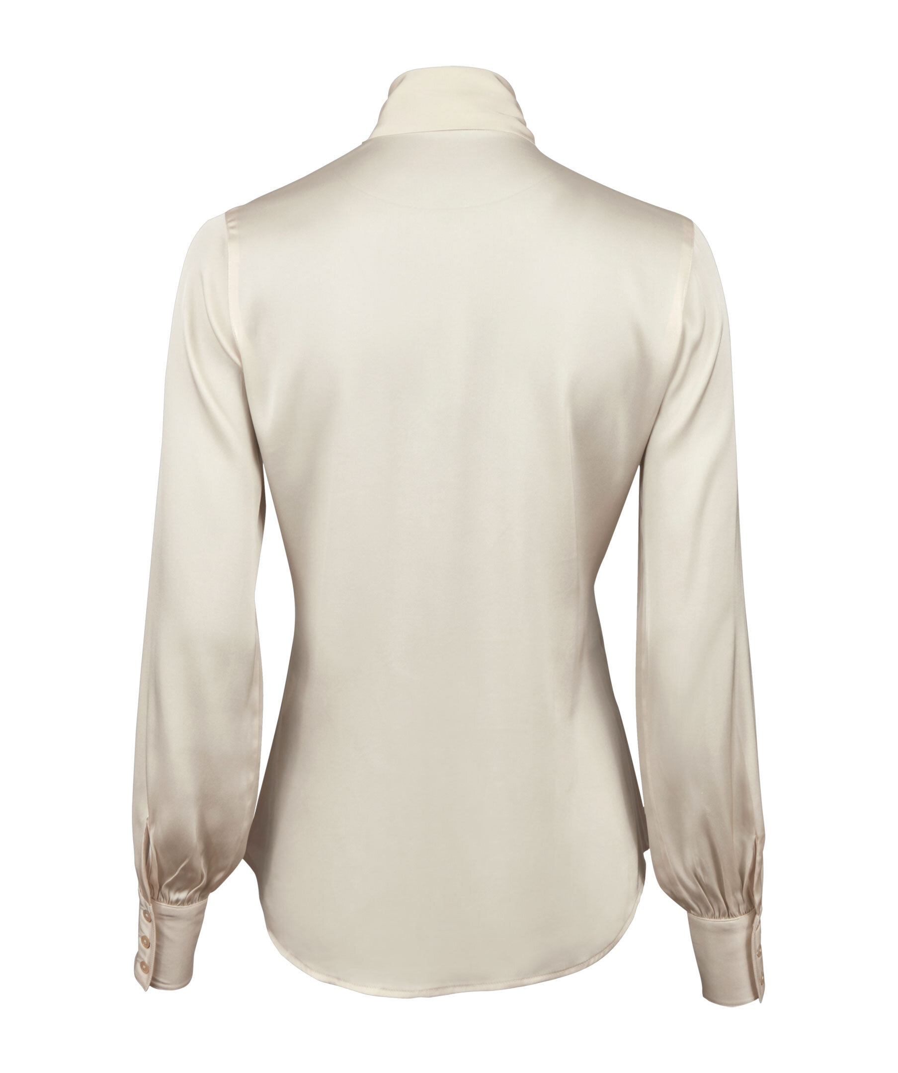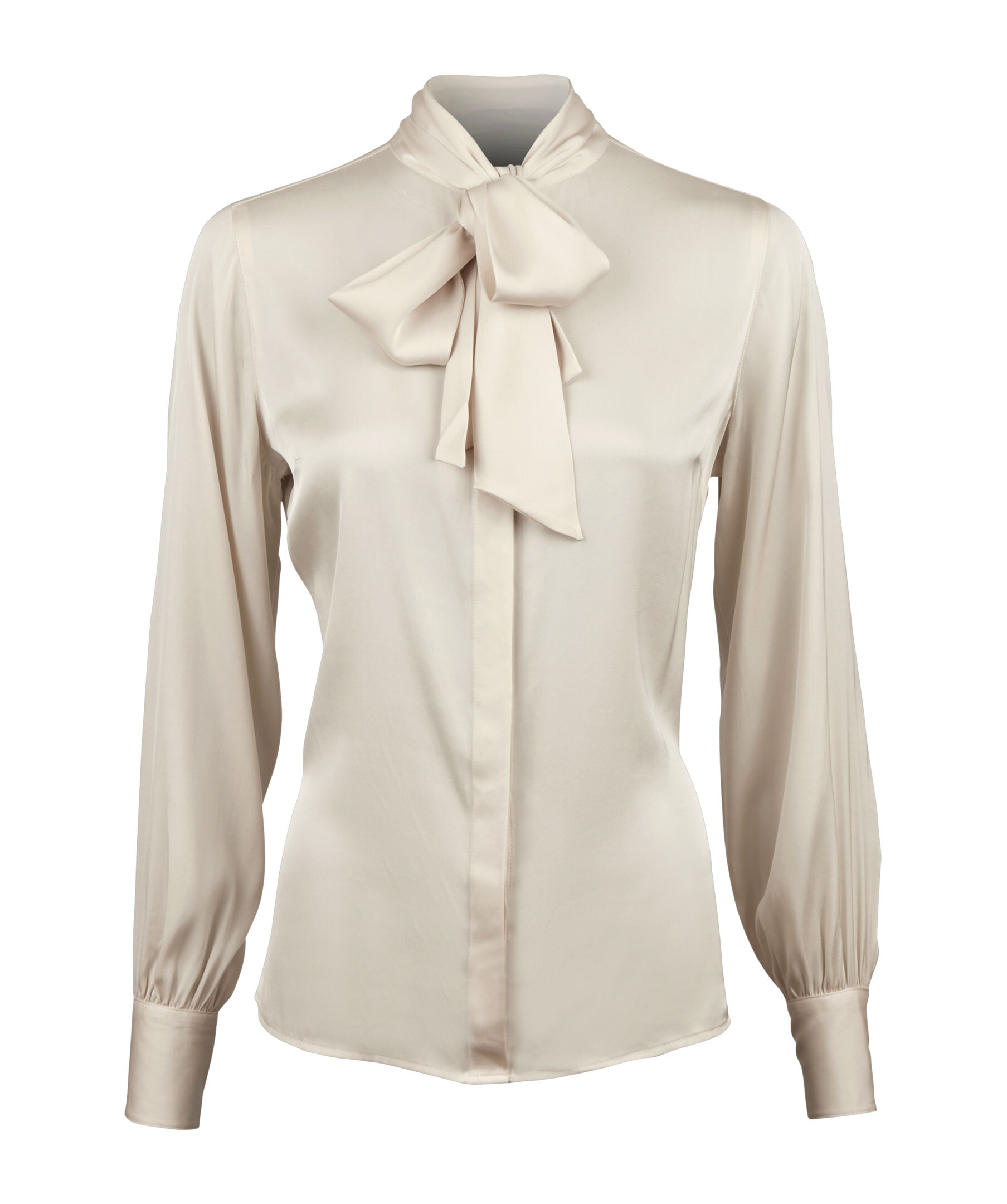 Denna blus är tillverkad av siden och har en feminin passform. Blusen har en dold knappslå och en knytkrage.