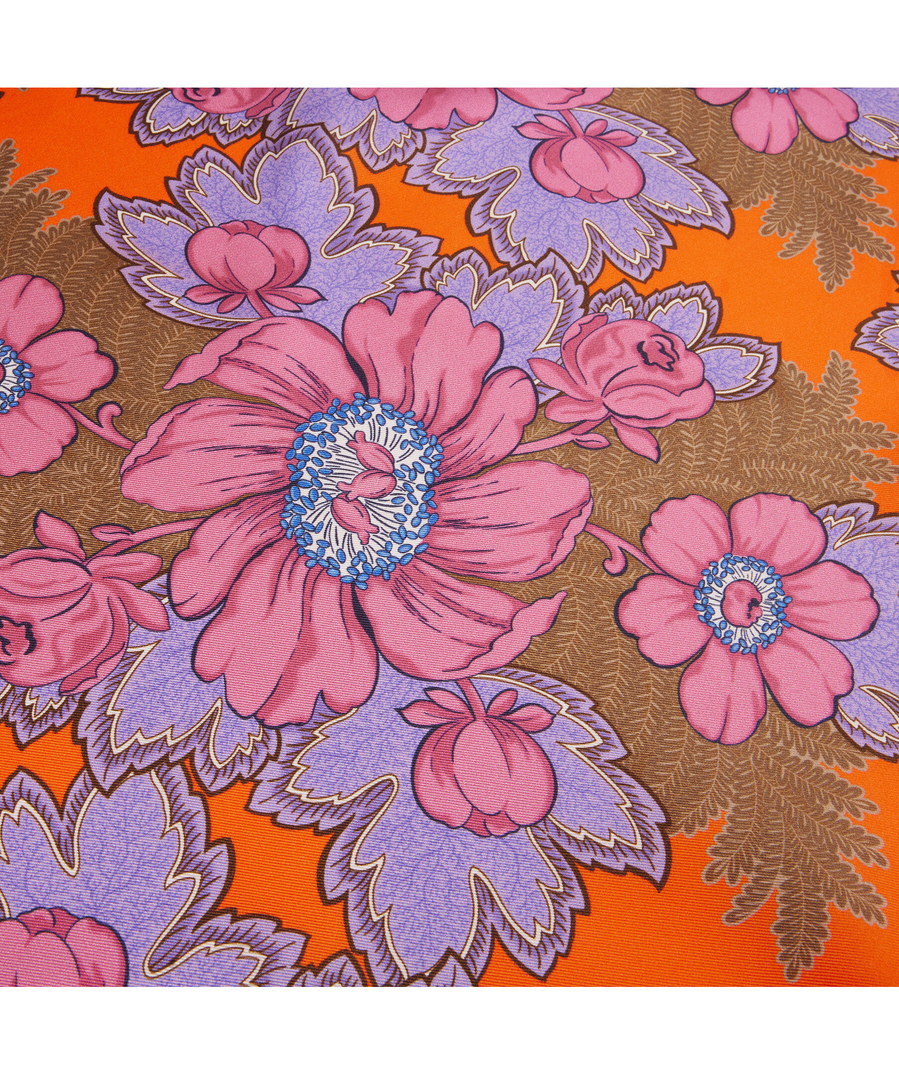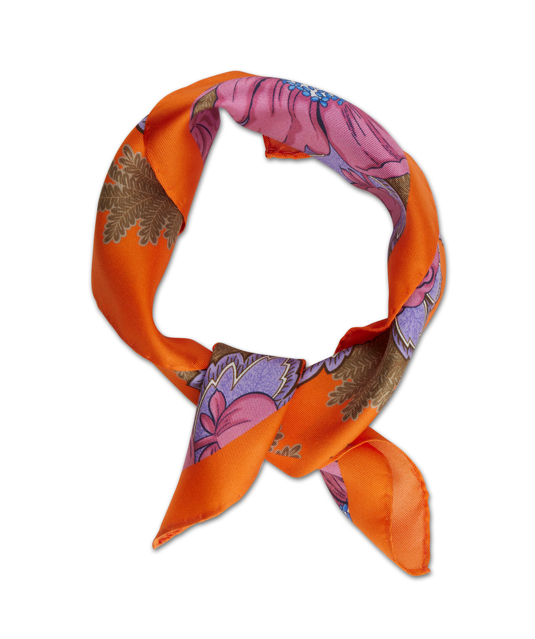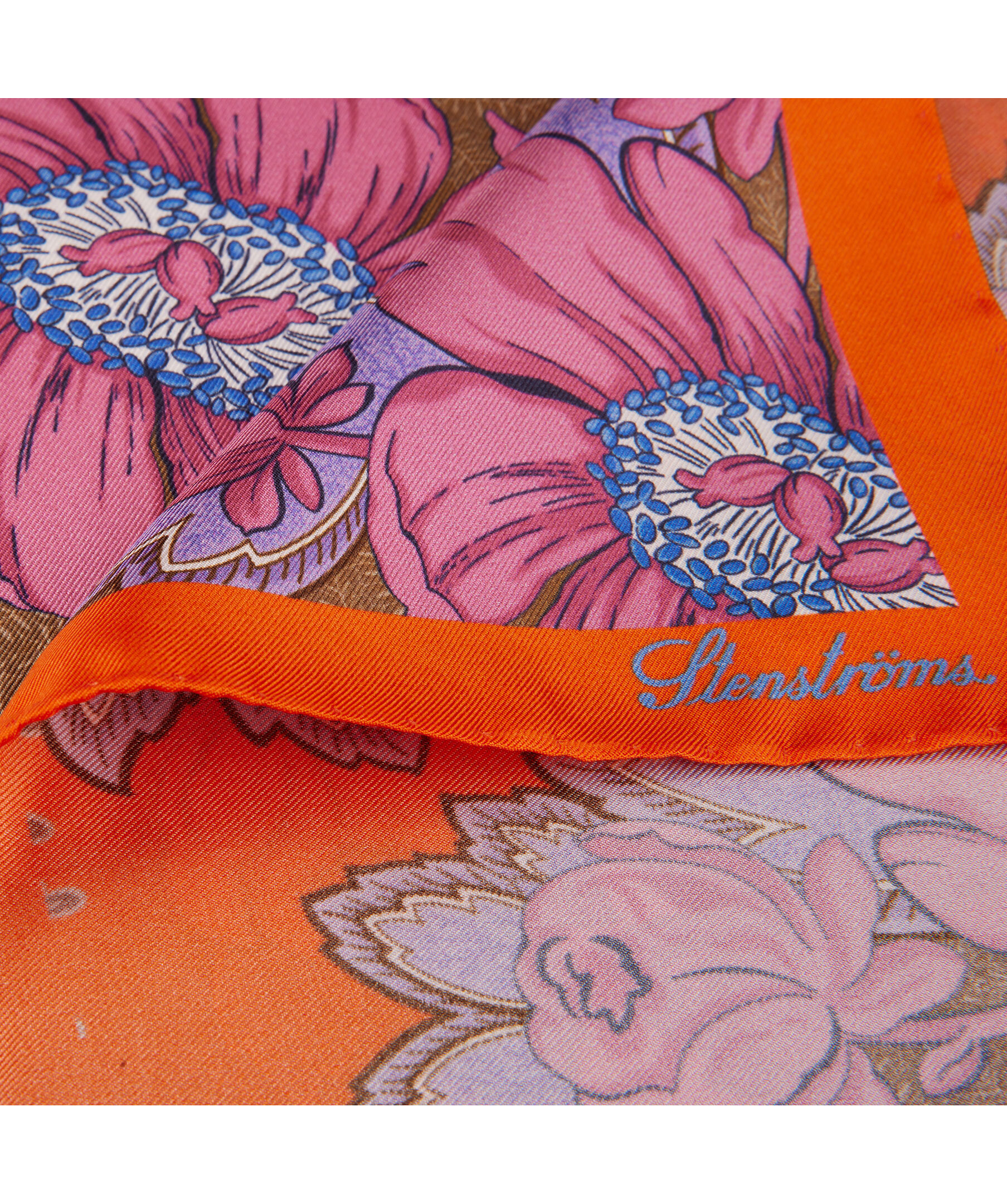 Orange sidenscarf, detaljerad med ett blommigt mönster från Stenströms. Mått: 44x44 cm.