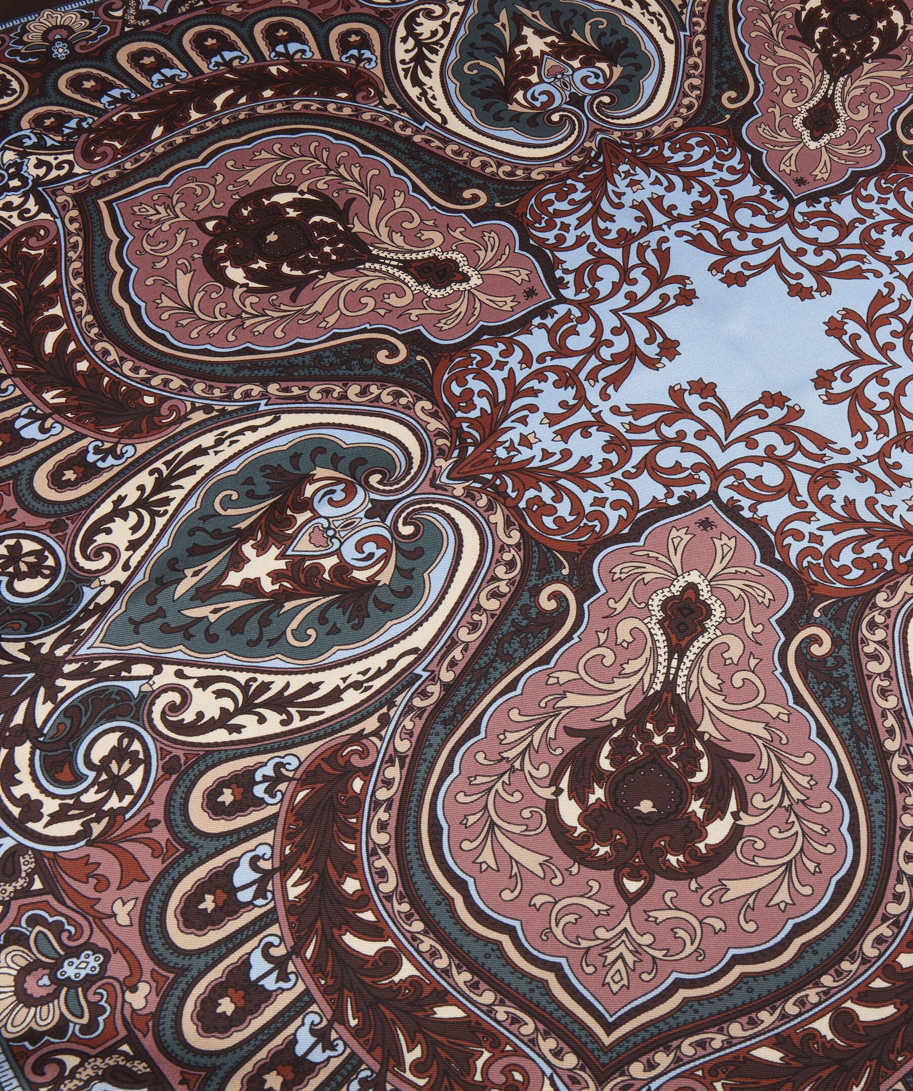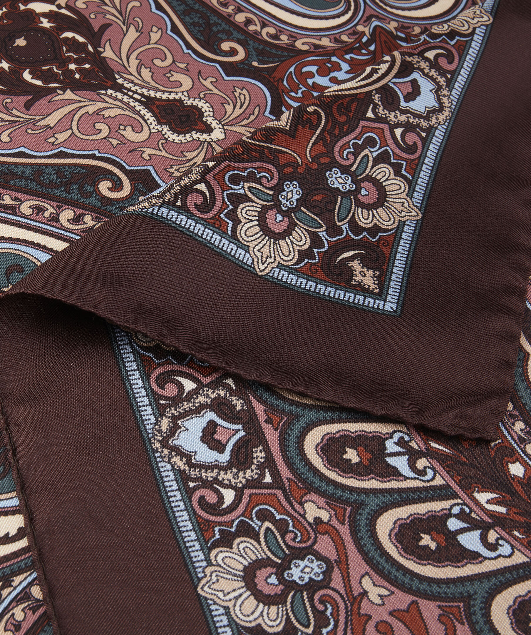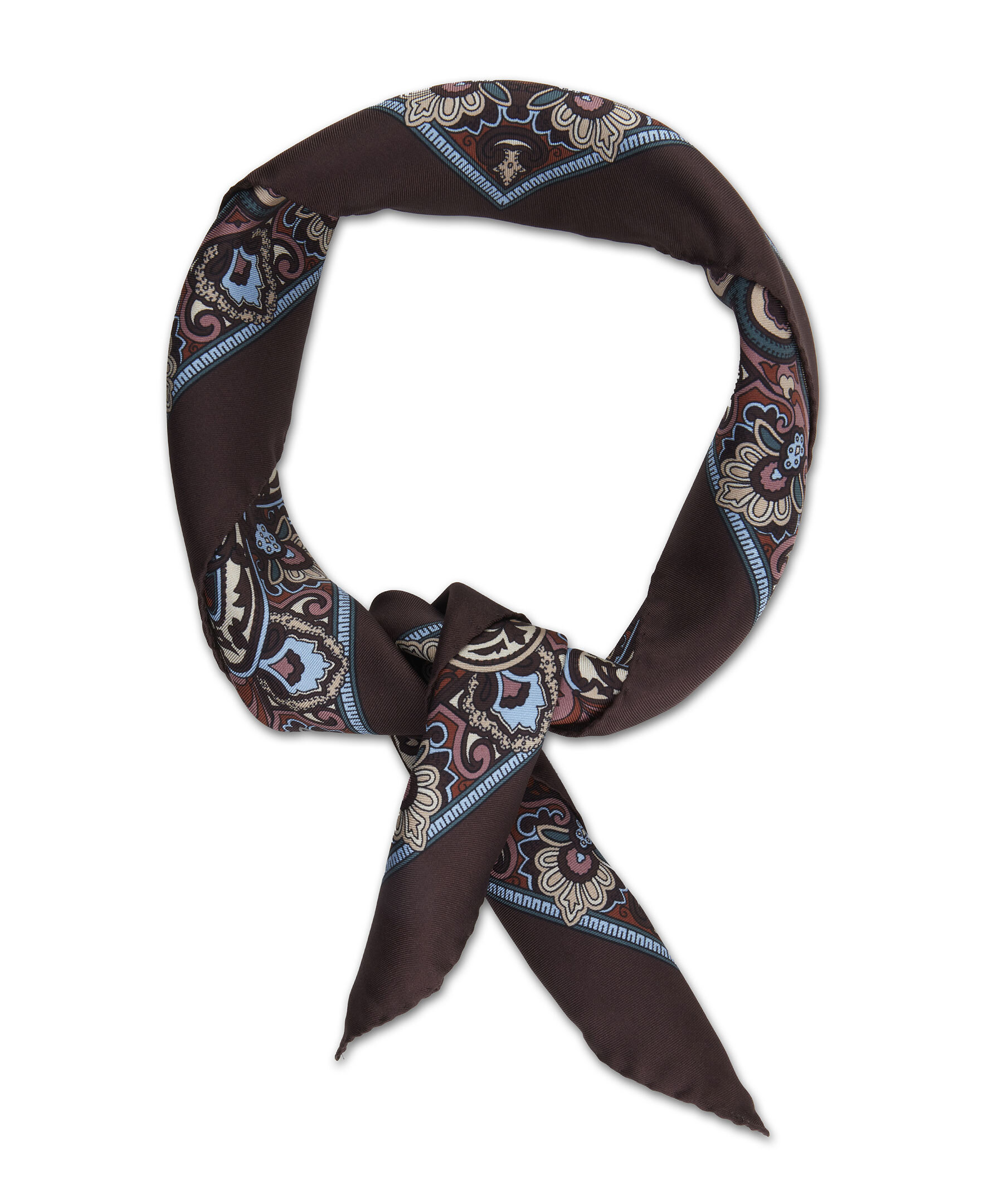Denna bruna scarf är tillverkad av siden. Scarfen är detaljerad med ett paisleymönster.