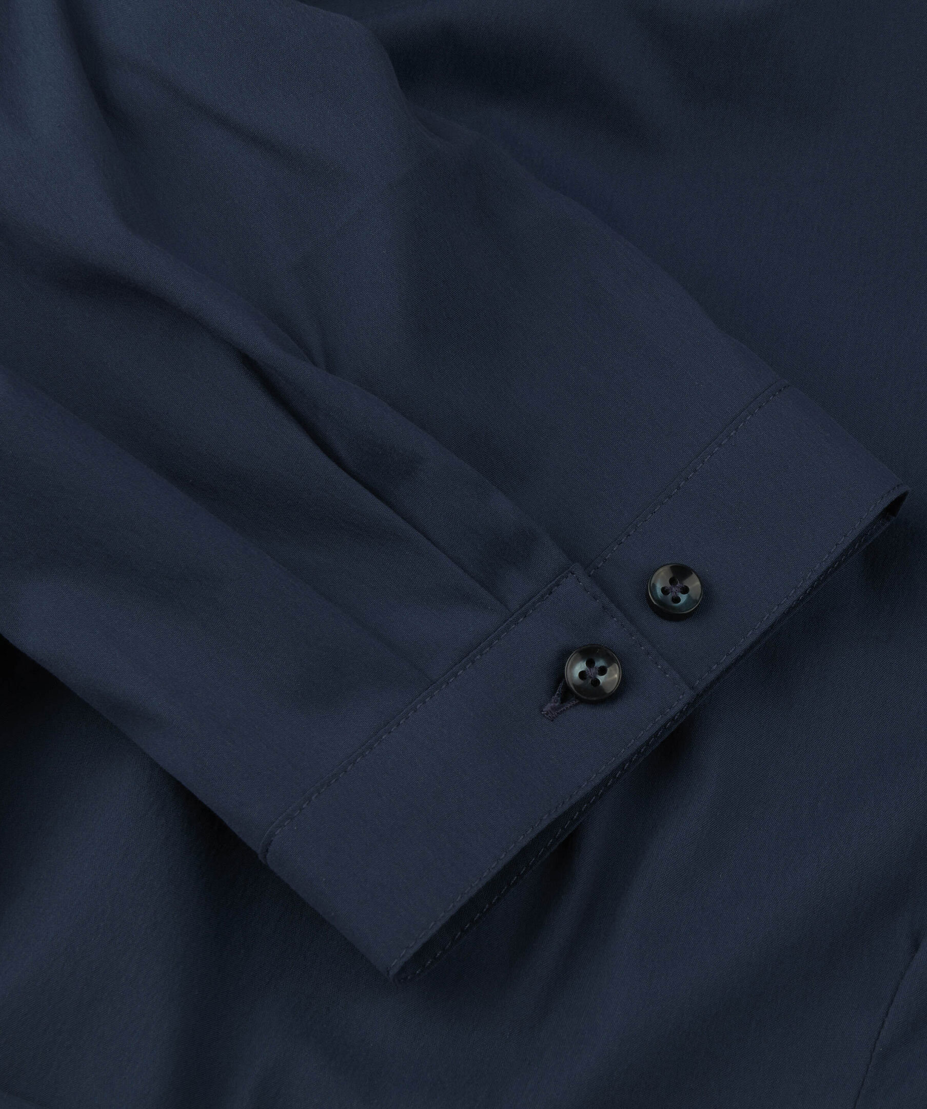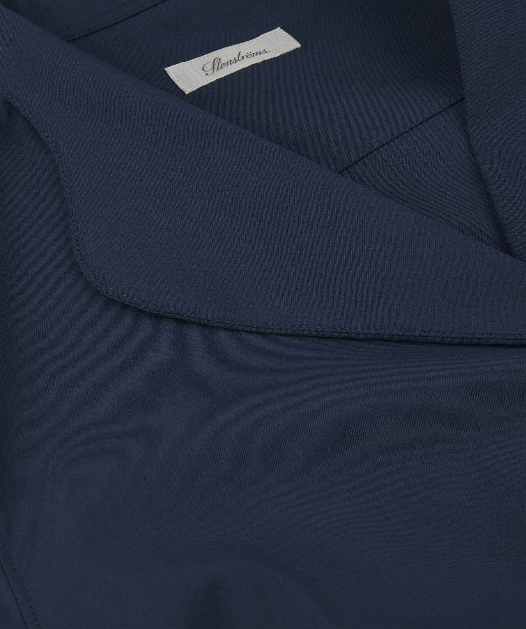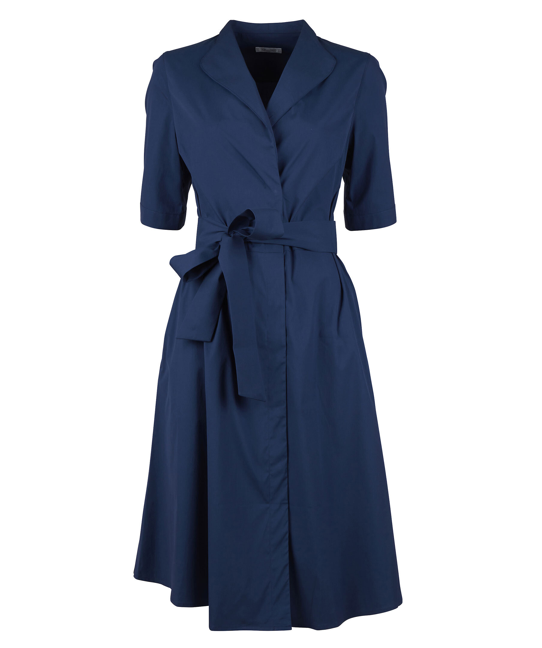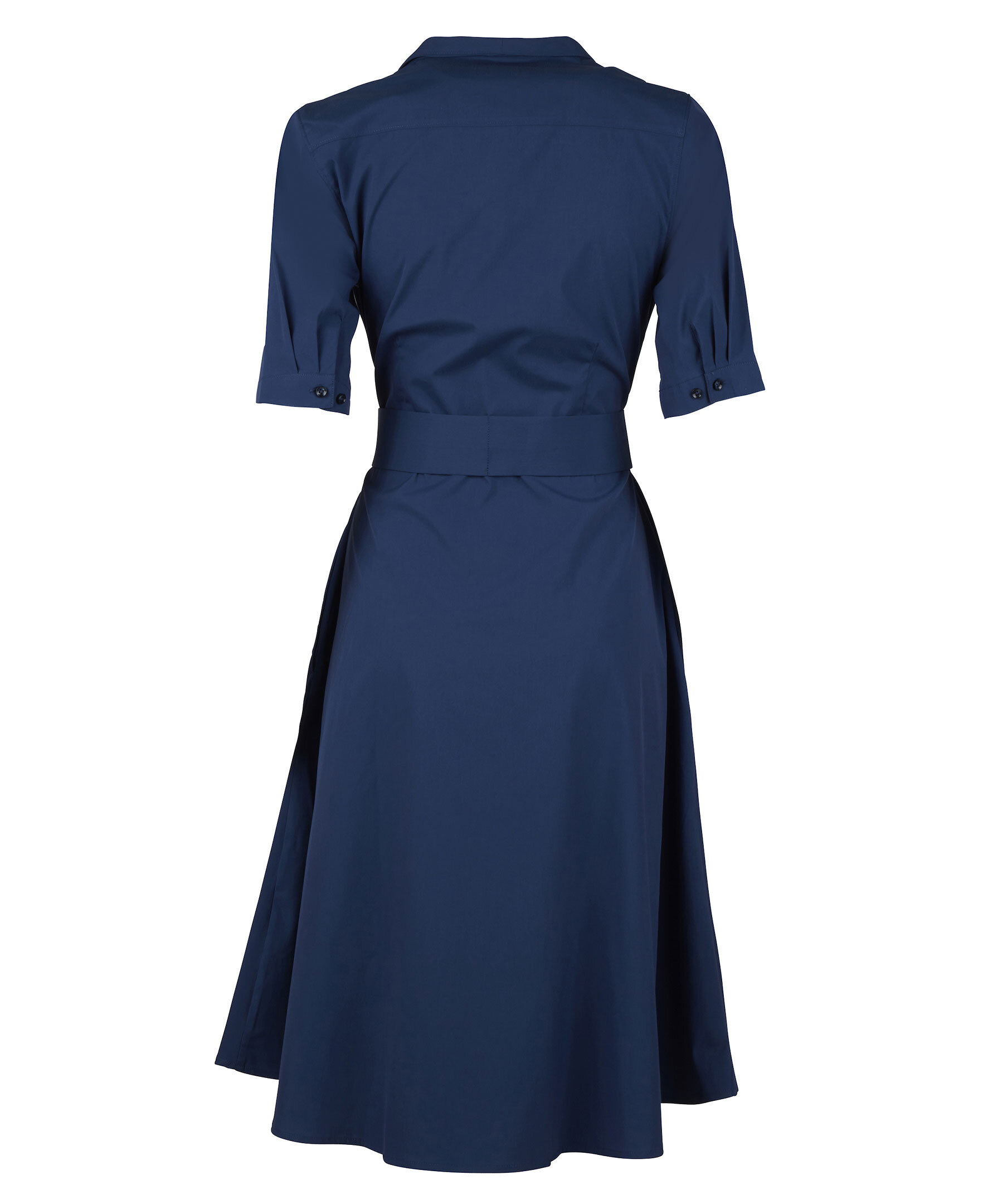 Mörkblå omlottklänning med en feminin passform, tillverkad i bomull. Klänningen är designad med dolda tryck knappar, ett bälte i midjan, kavaj krage samt halva ärmar.