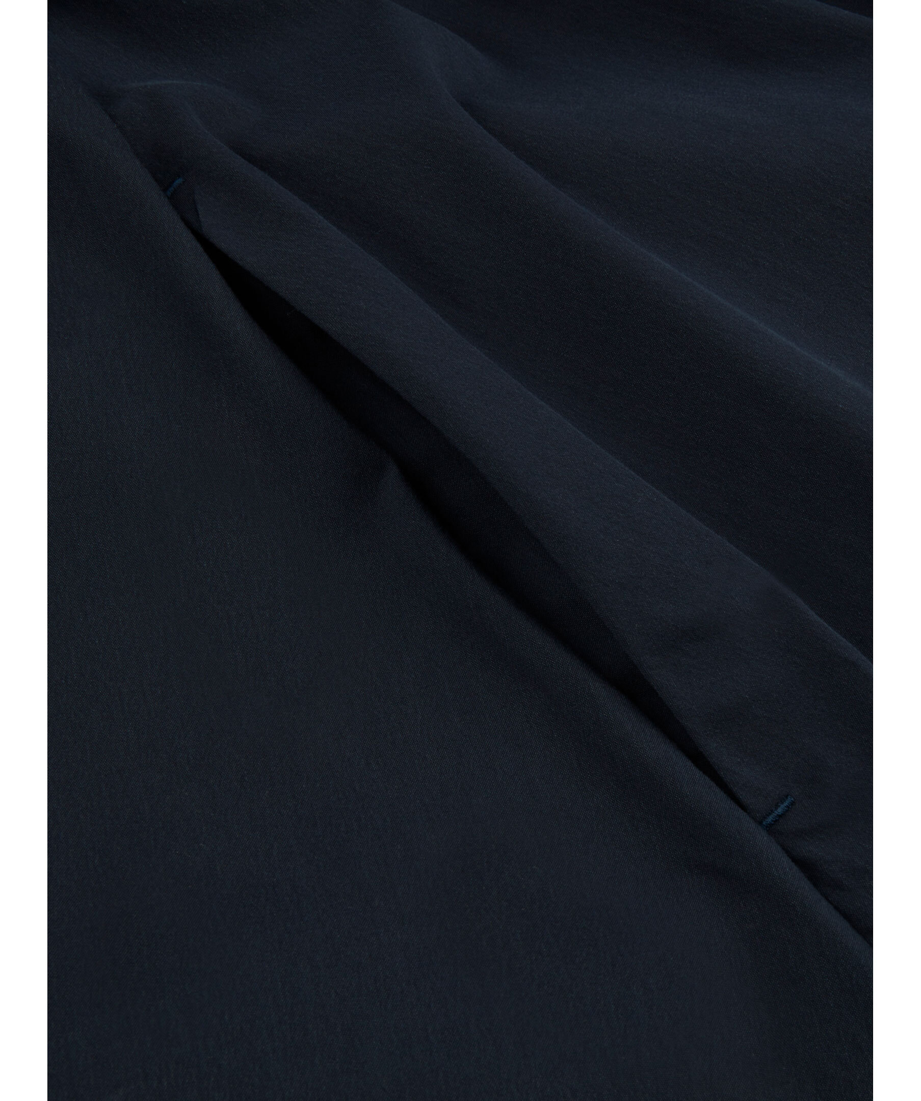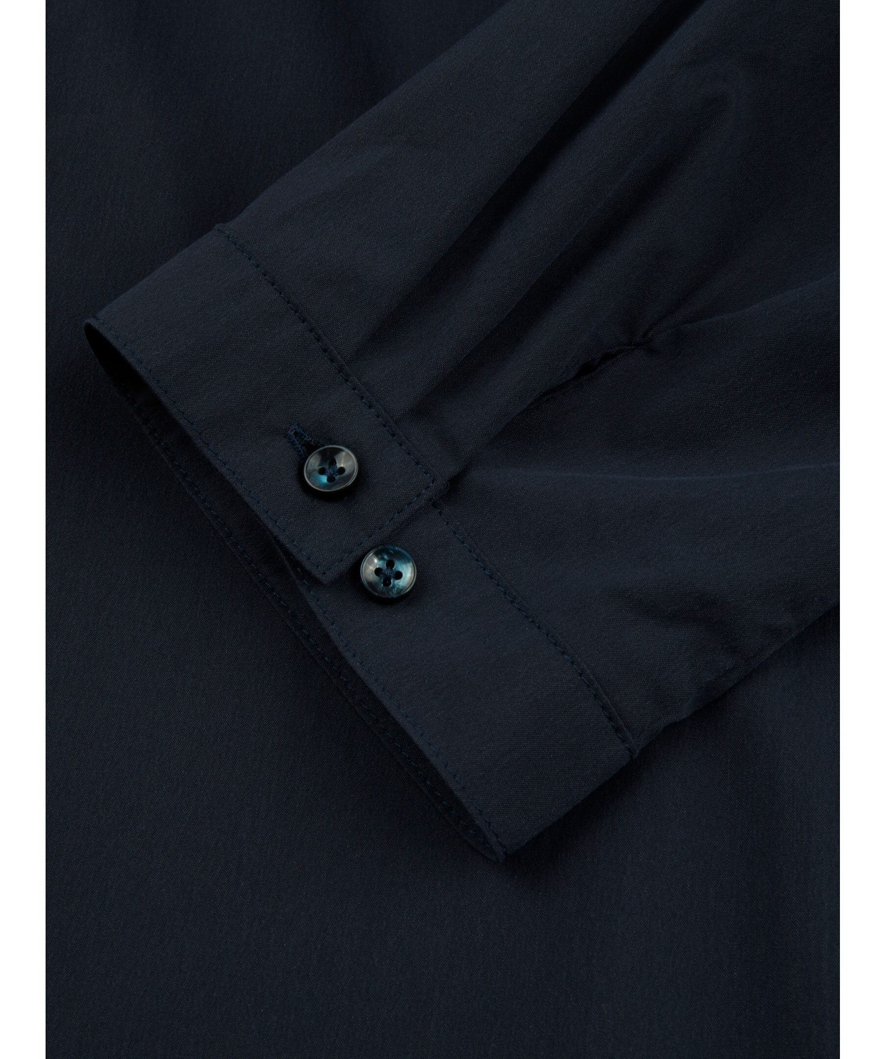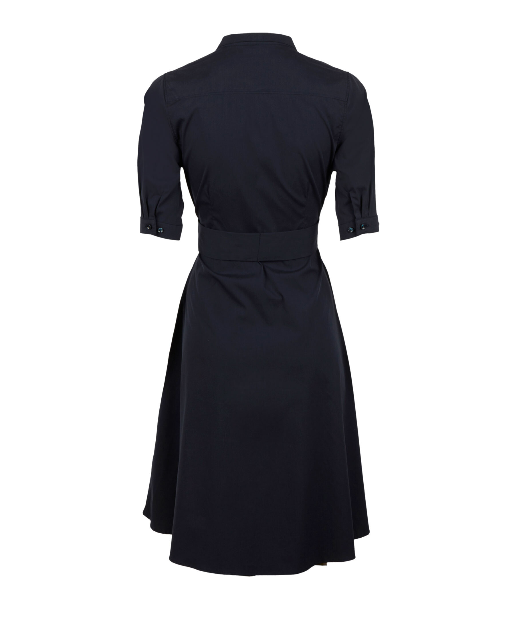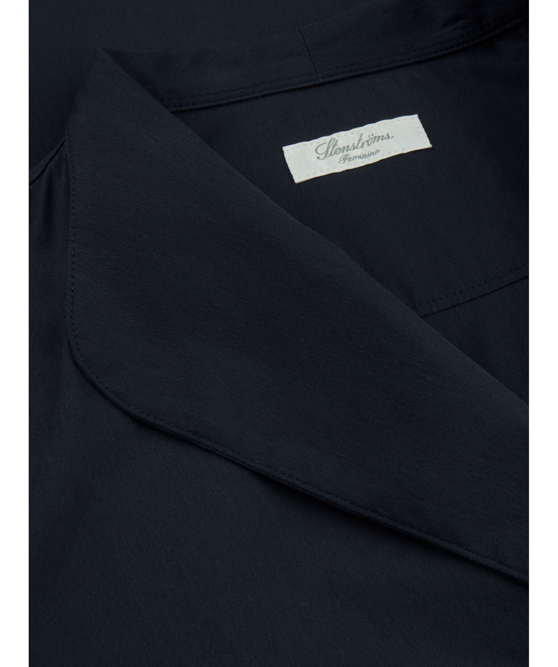 Marinblå klänning från Stenströms. Tillverkad i en bomull- och polyamidblandning. Klänningen har gömda tryckknappar, ett bälte i midjan, kavajkrage och korta ärmar. Dubbel manschett.