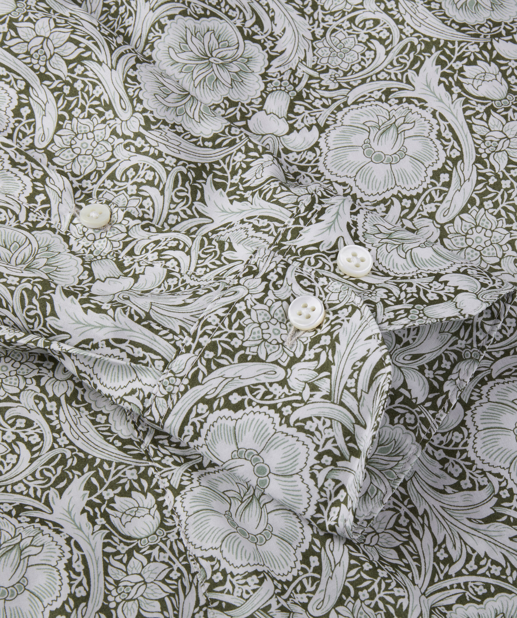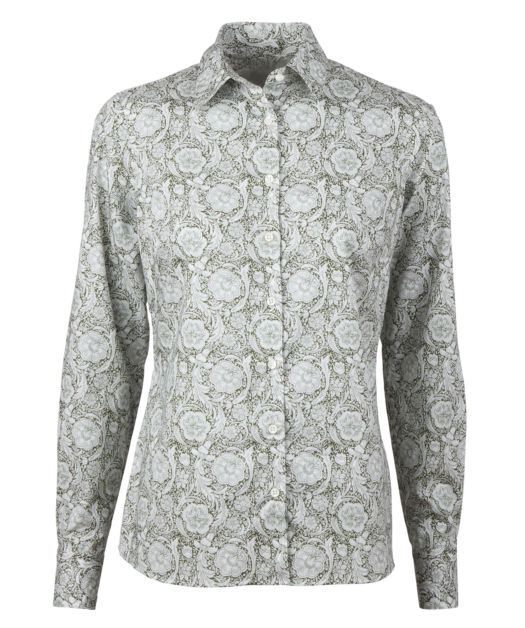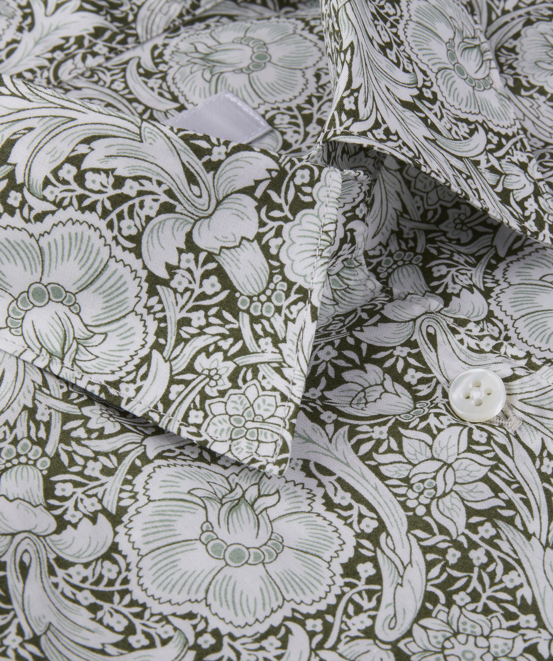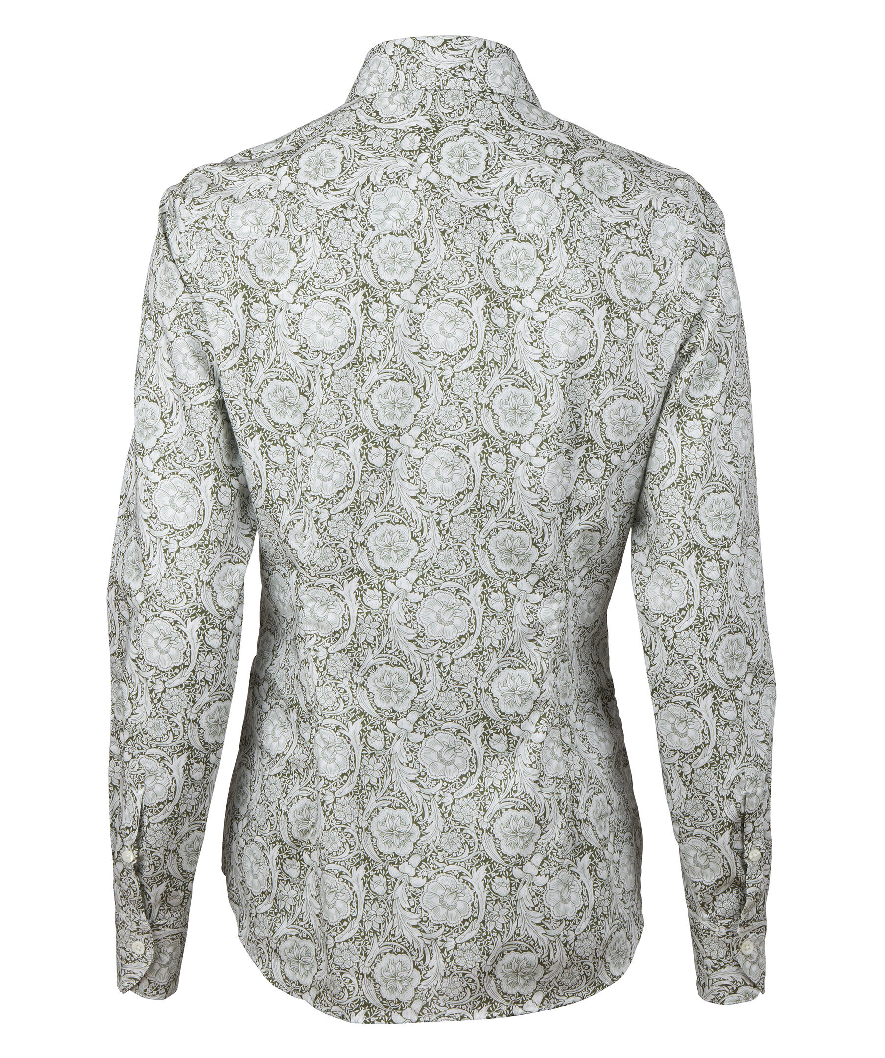 Sofie grön skjorta i bomull. Skjortan är detaljerad med ett blommönster, enkla manschetter, pärlemorknappar och en krage i modell cut away.