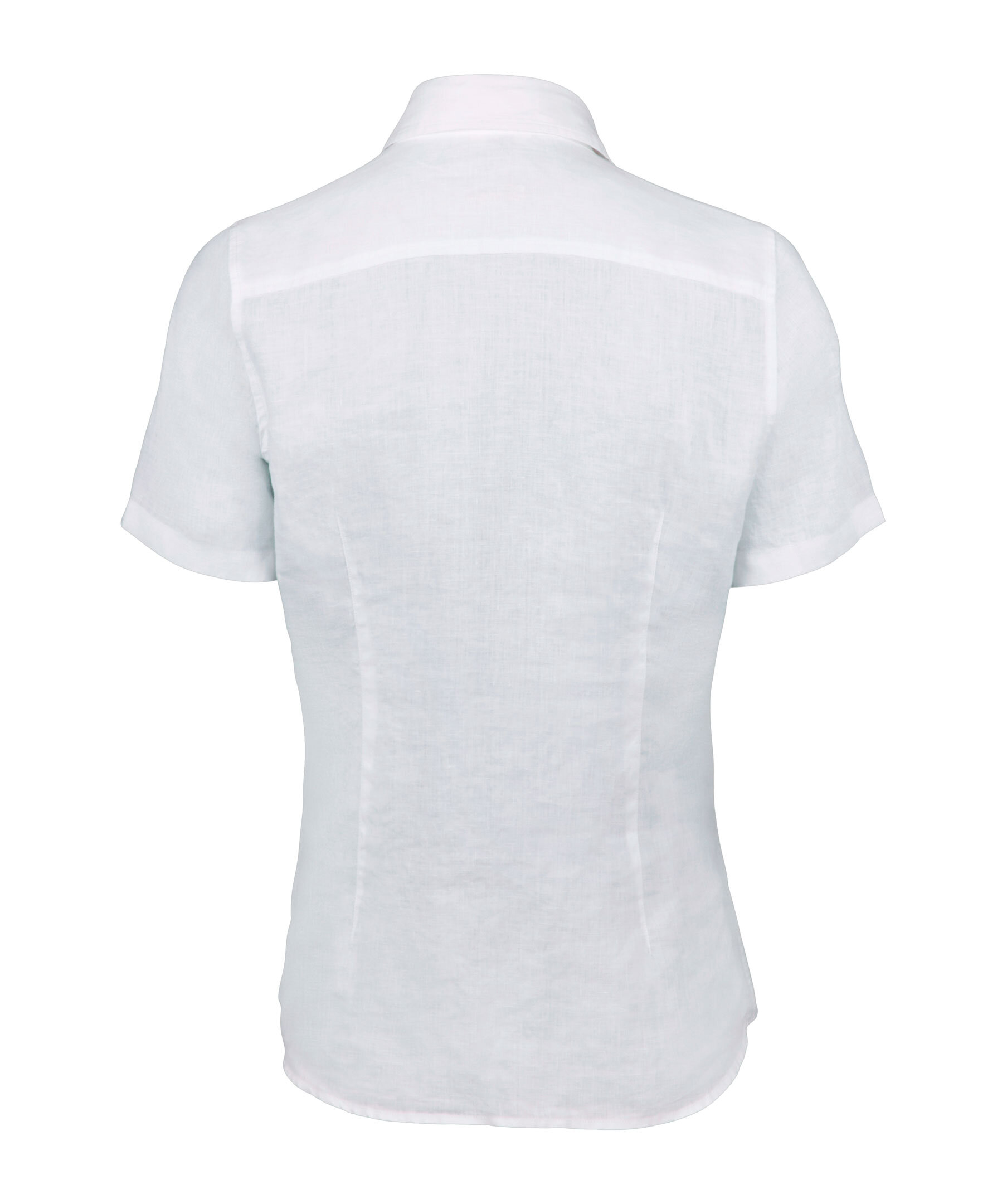 Denna skjorta är tillverkad av linne och har en feminin passform. Skjortan har korta ärmar och en klassisk krage.