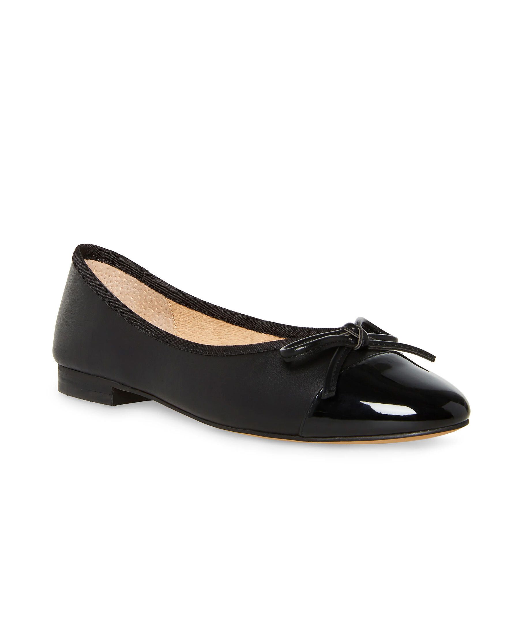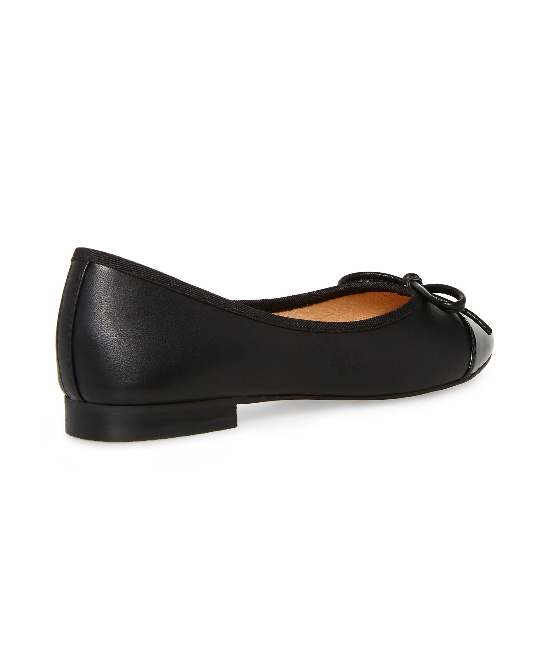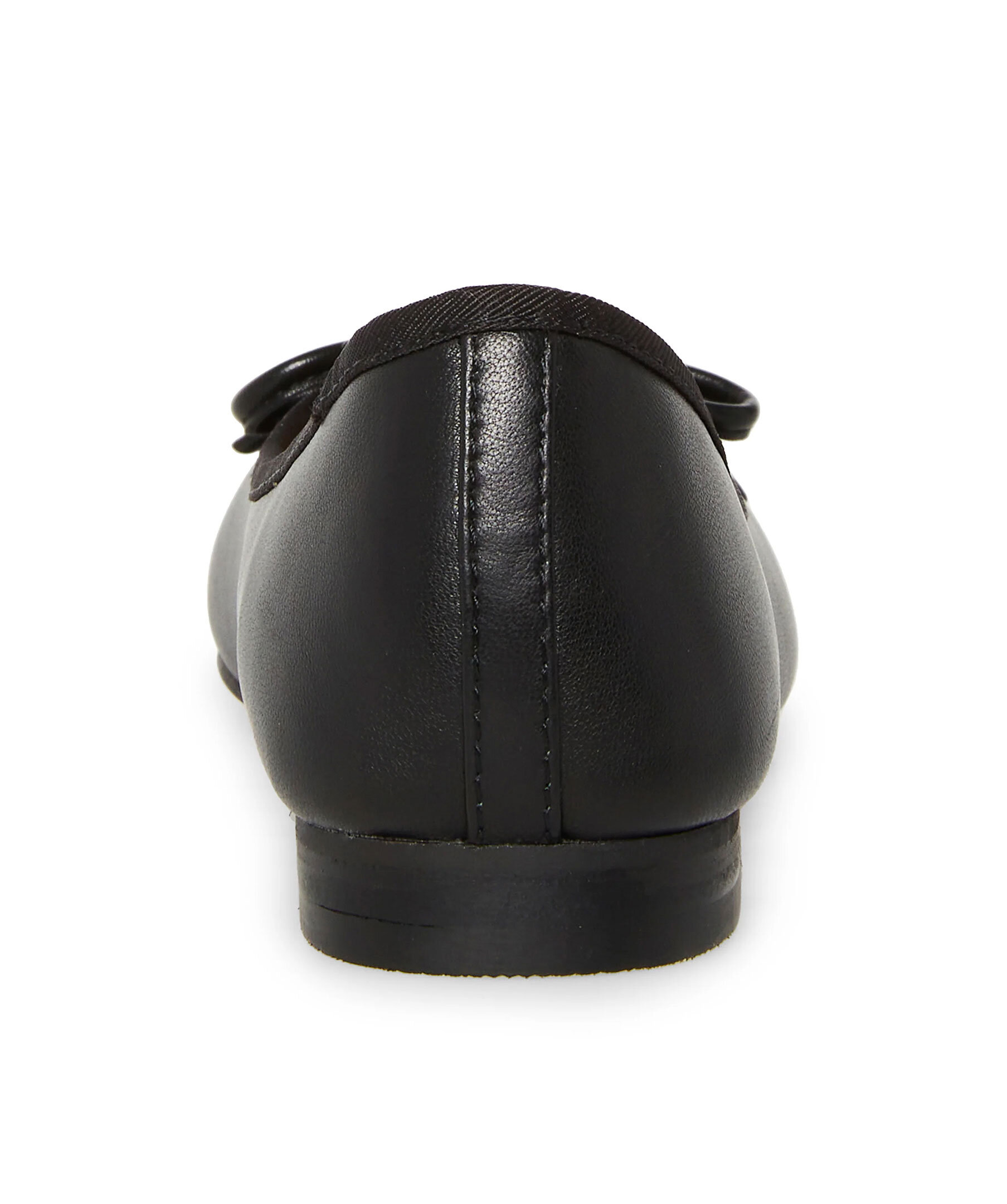 Stilren svart ballerinasko med liten klack från Steve Madden. Skon är gjord av läder med en glansig tå och rosett.