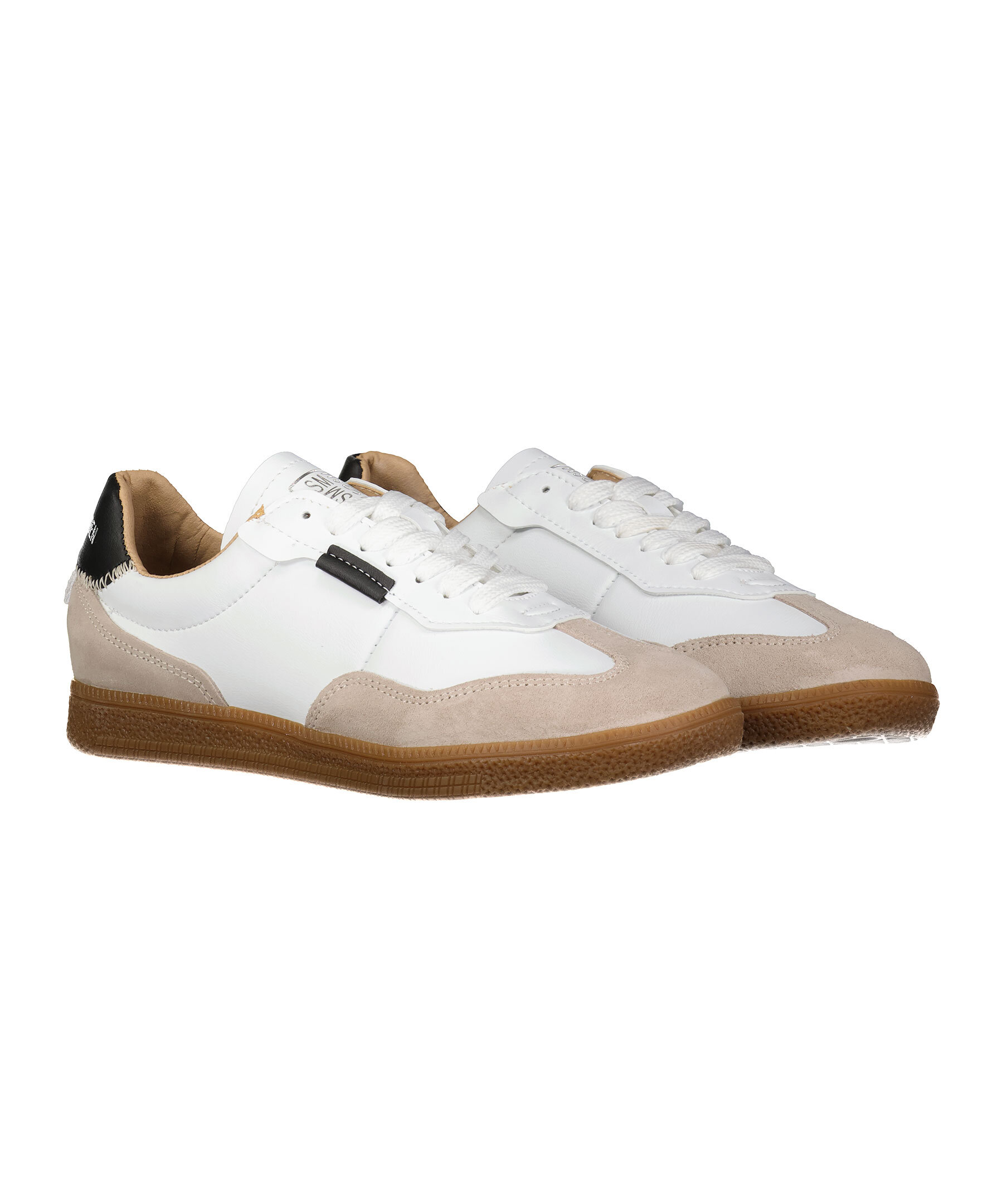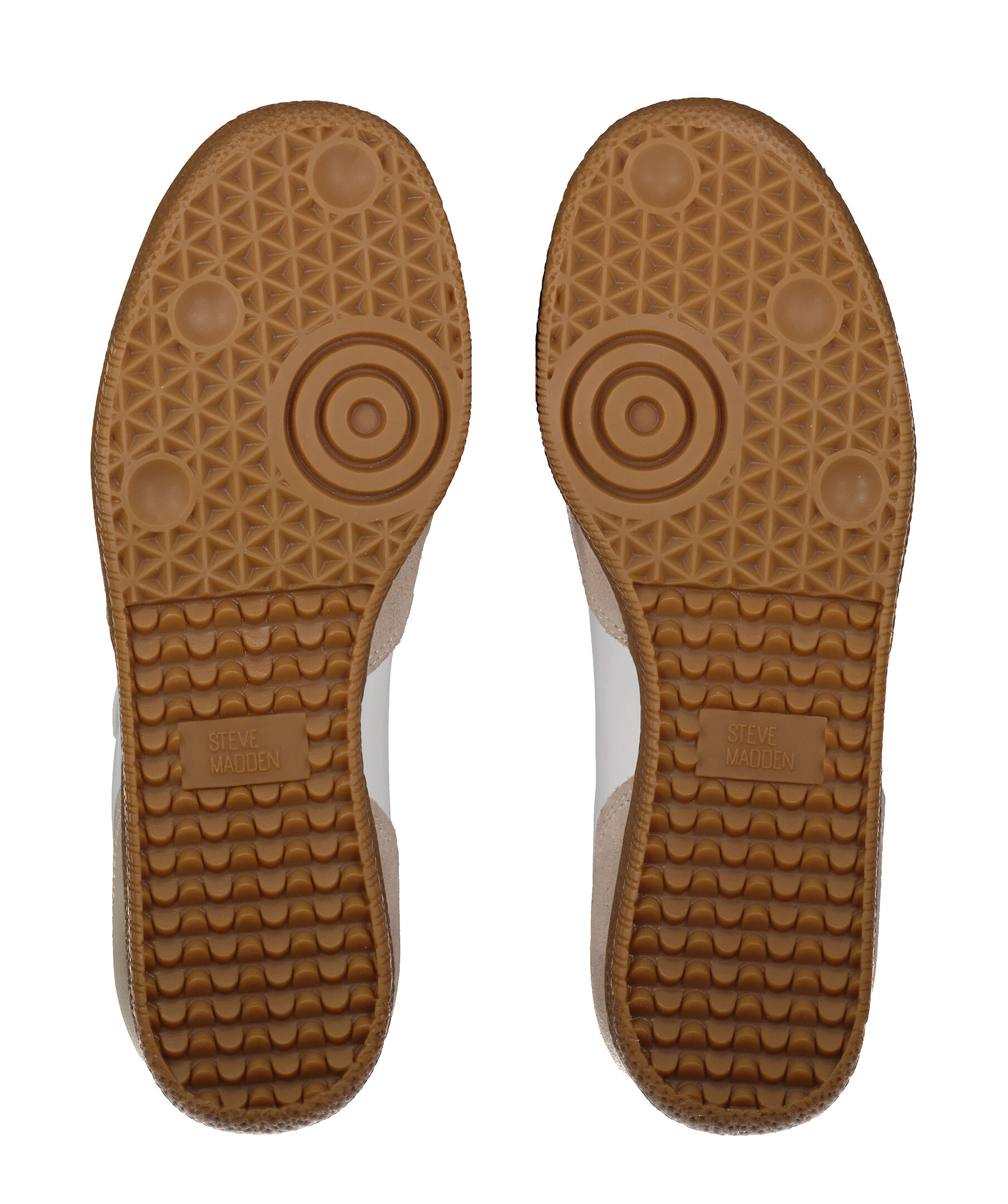 Vita sneakers från Steve Madden. Vita sneakers i läder med beigea detaljer i mocka. Platta skosnören. Silverfärgad logotyp på plösen. Svart detalj i läder på hälen med silverfärgad tryckt logotyp. Liten detalj i svart vid snörningen på skons yttersida. Diskret ögla i vävt material på hälen. Nätt sula i gummi.