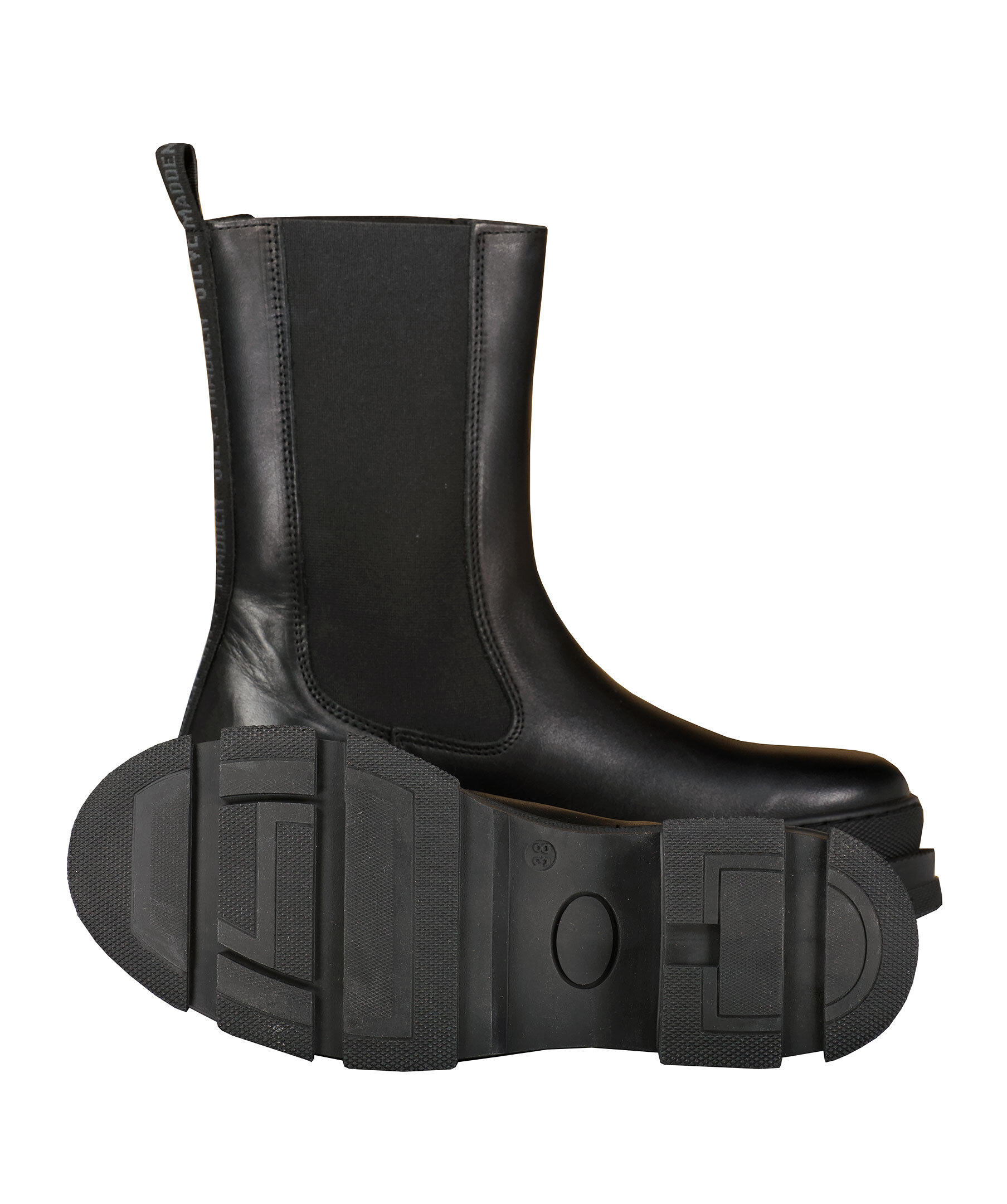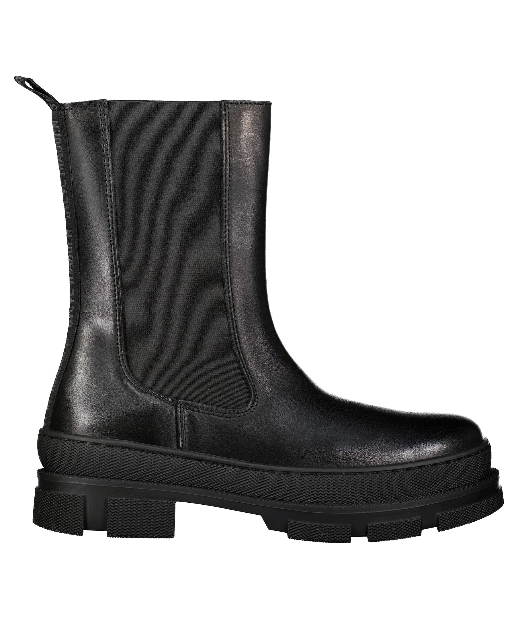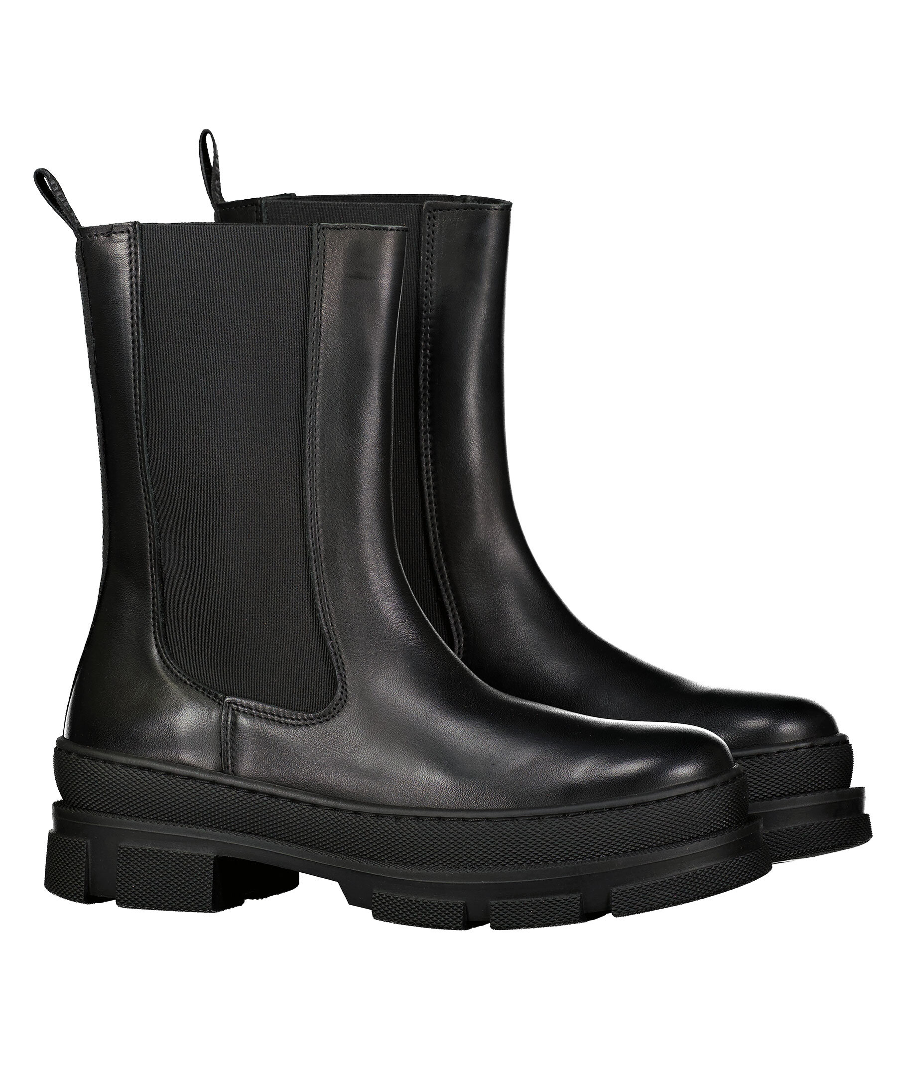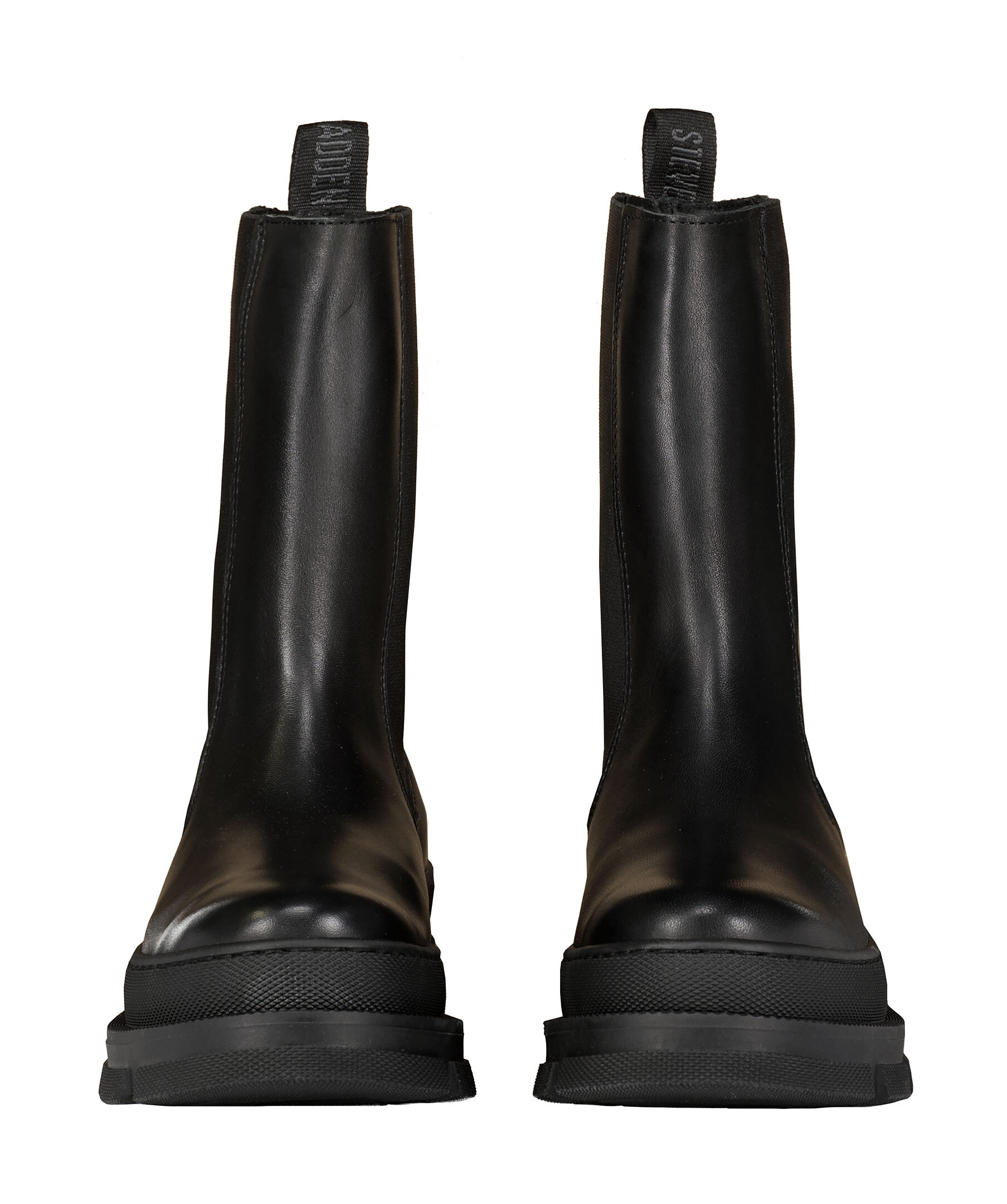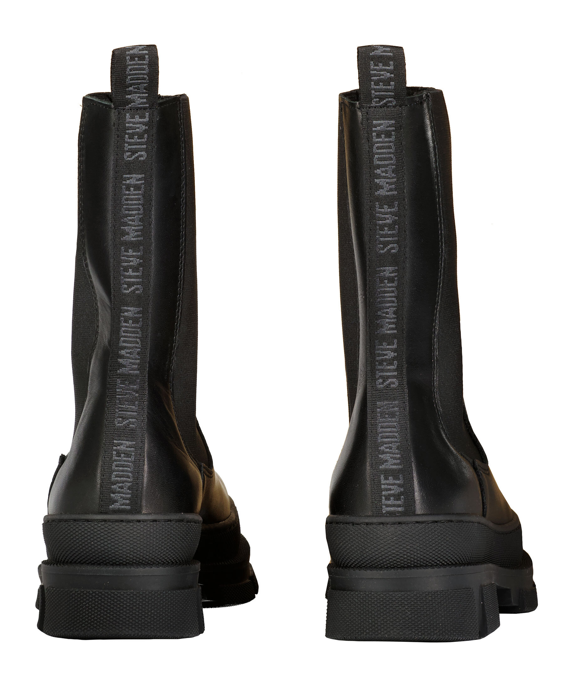 Svarta boots från Steve Madden med en grov sula och ett högt skaft. Tillverkad i läder och har en tjock sula i gummi och elastiska paneler på sidorna. Rundad tå och logotyp i textil längs med ankeln baktill. Normal i storlek. Skafthöjd: 19 cm, Skaftbredd: 27 cm, Klackhöjd: 6 cm.