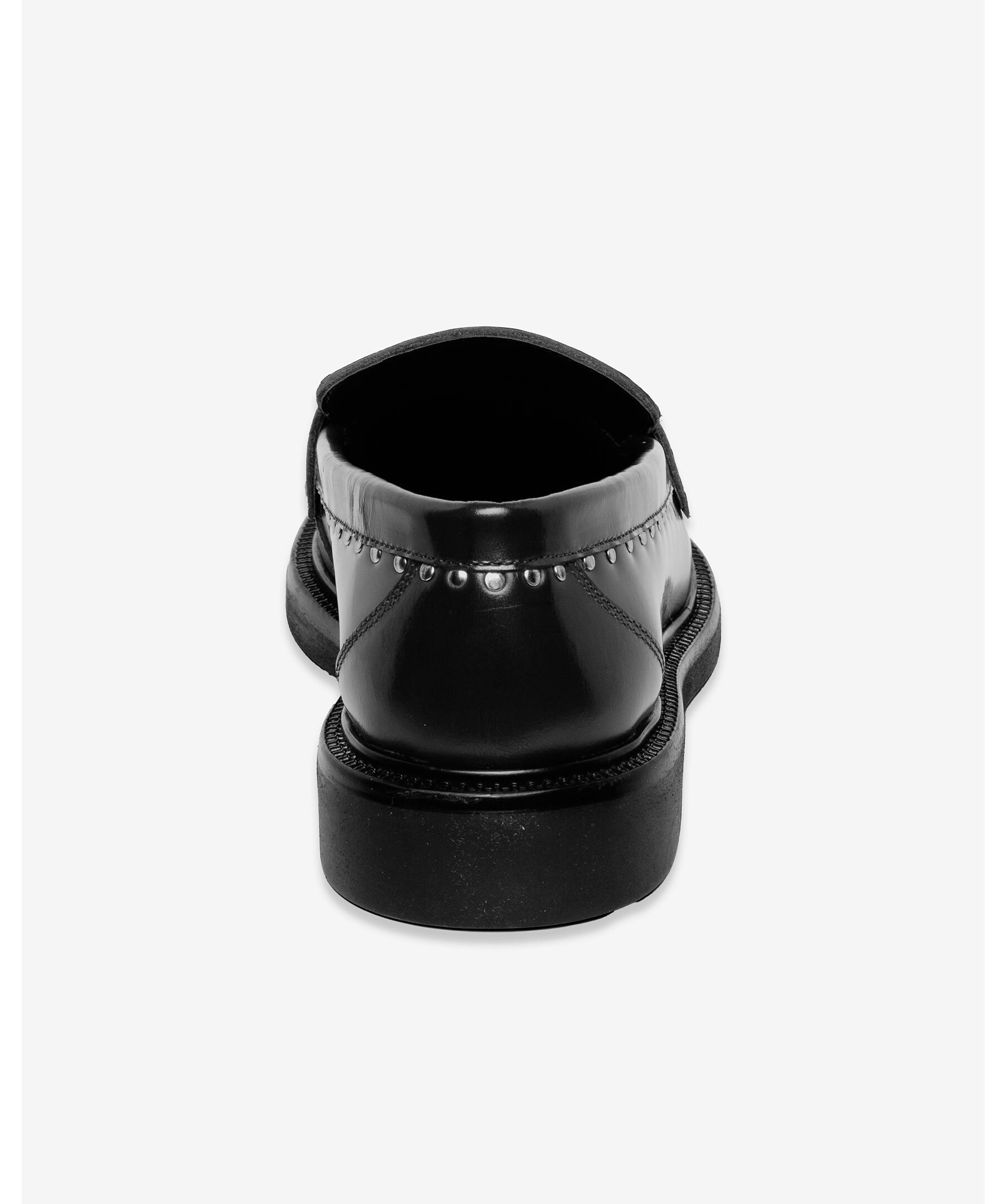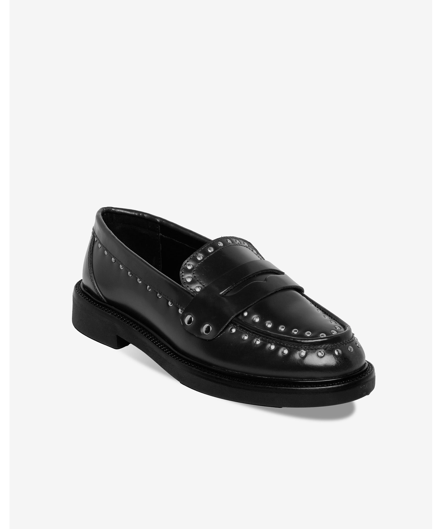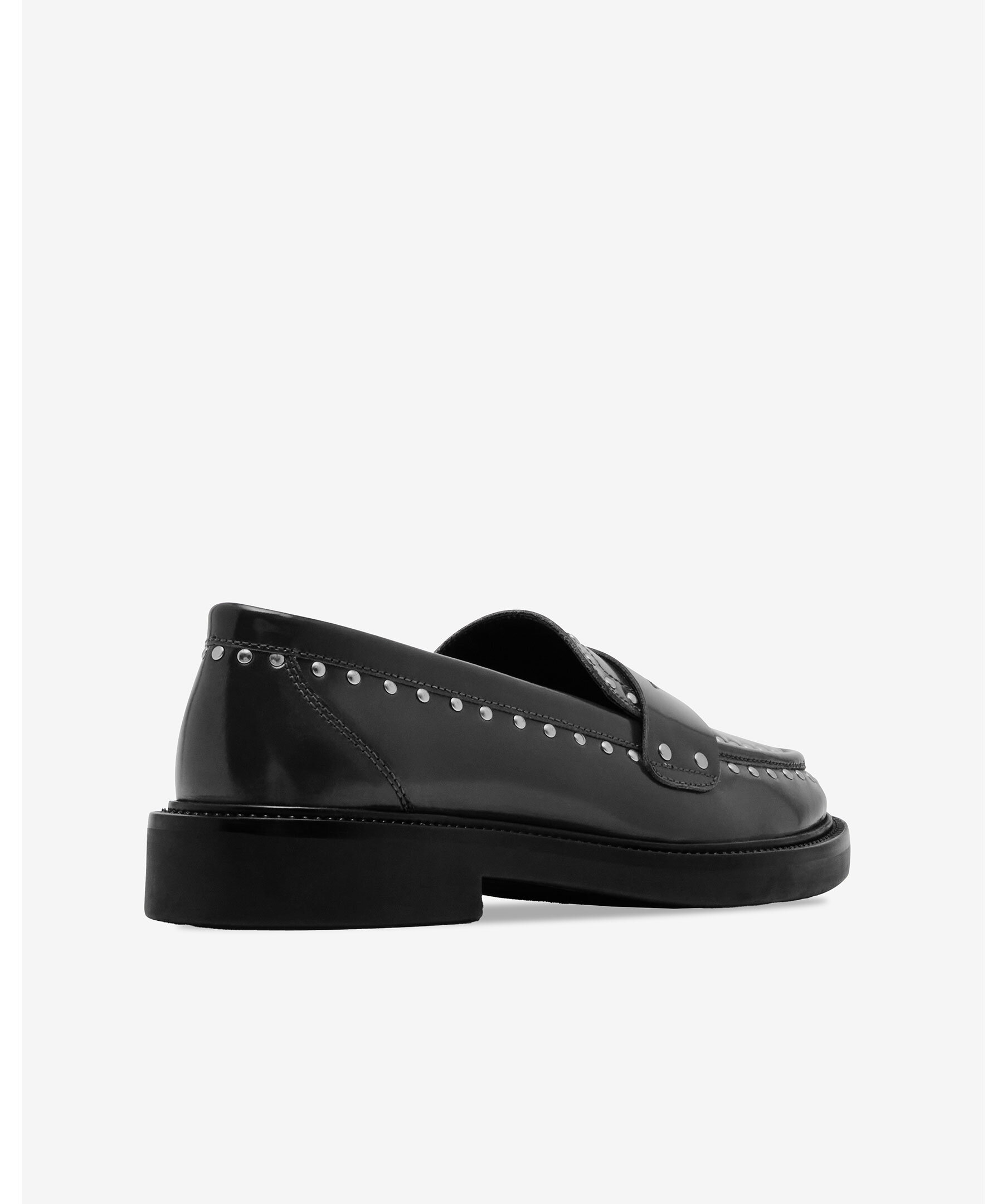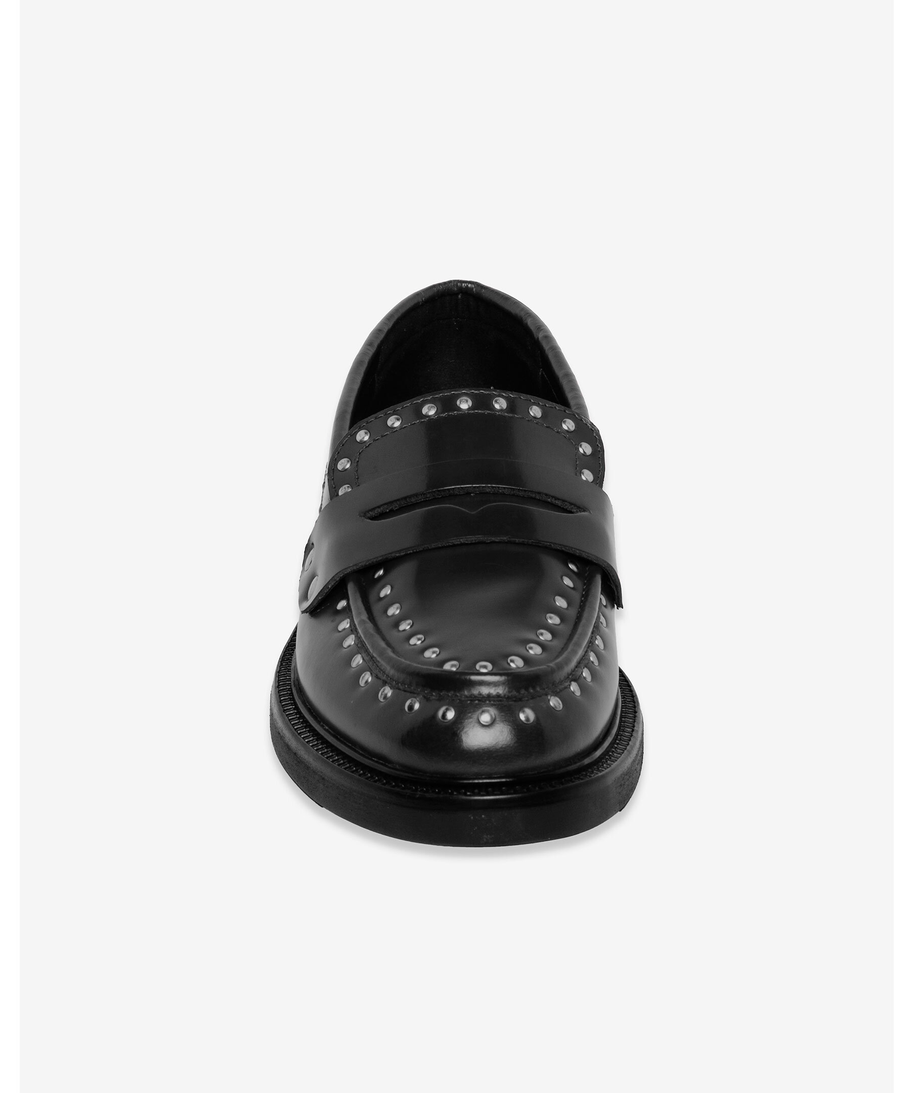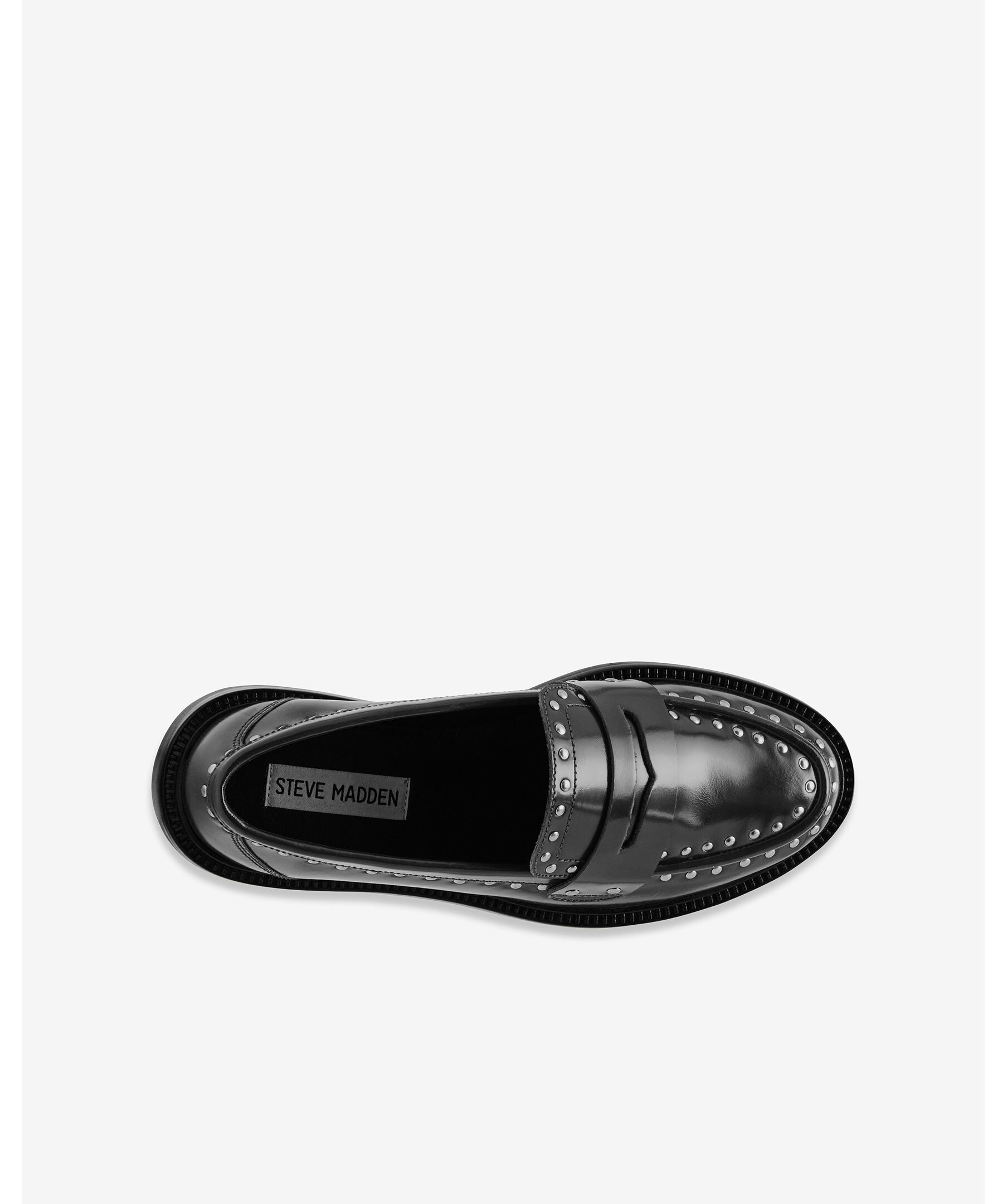 Svarta, glansiga loafers med nitar från Steve Madden. Dekorativ detalj över plösen. Skorna har en klackhöjd på 2,5 cm. Tillverkade i läder.