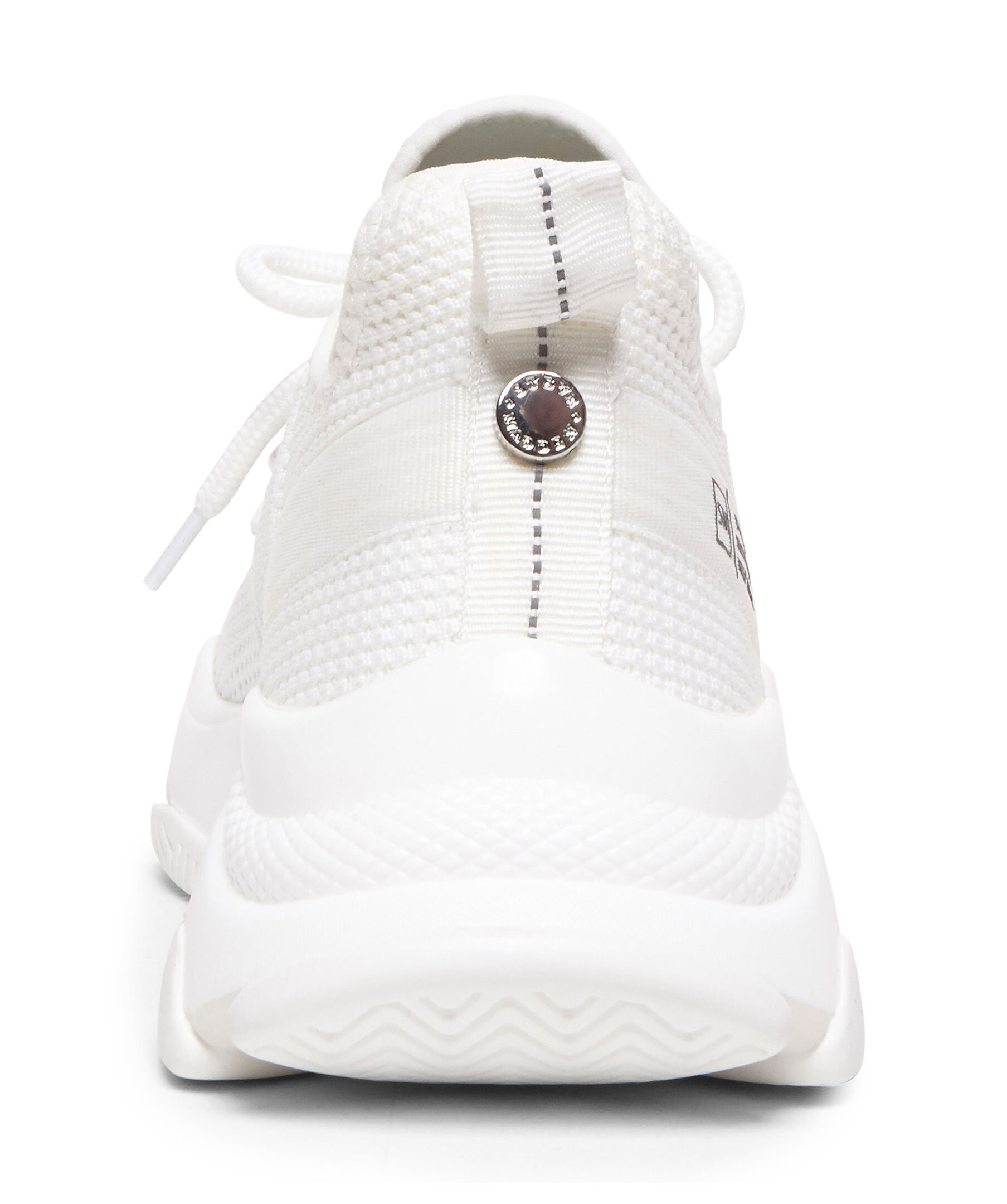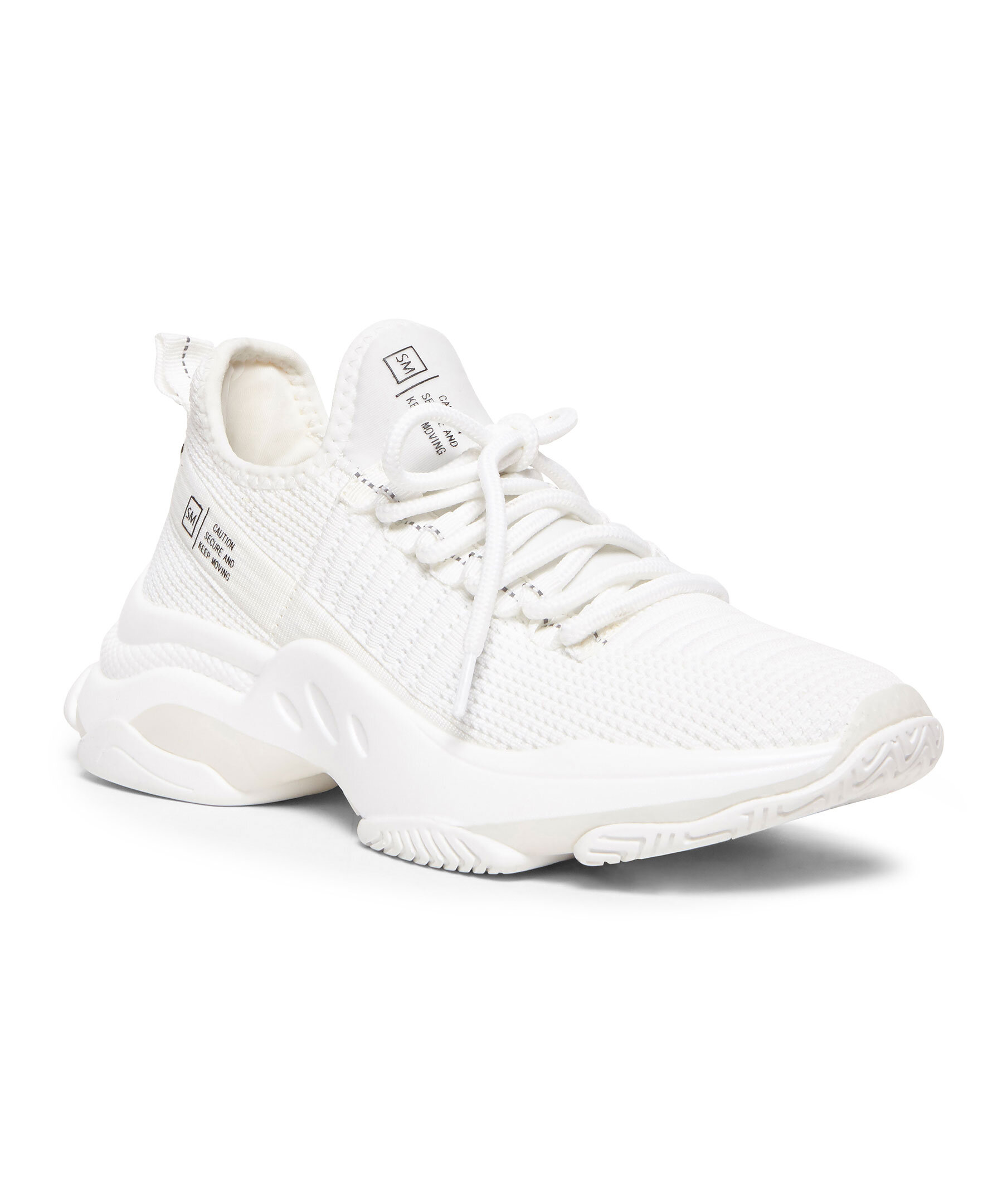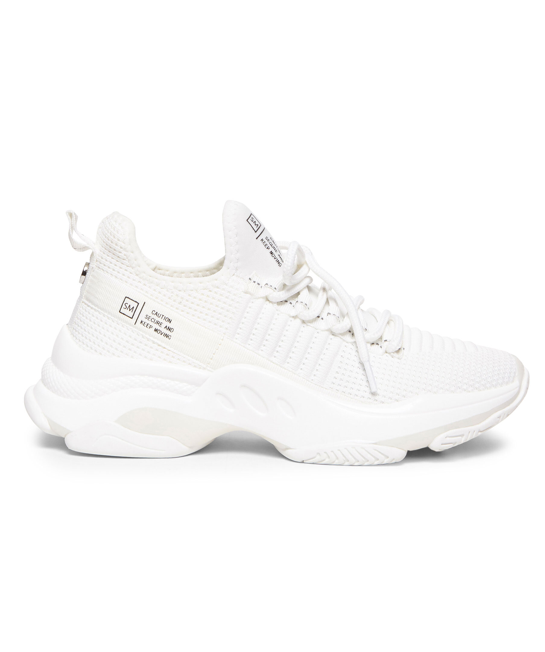 Vita sneakers med vita skosnören från Steve Madden. Designade med både stil och prestanda i åtanke och kommer att hålla dig chic och känna dig lätt på fötterna! Tygsko med tjock, vit gummisula som ger maximalt stöd. Smala sömmar med reflex längs snörningen och på plösen bak, metalldetalj med logotyp på snörningen fram och en rund metallbricka bak på hälen samt tunn svart text på plösen och utsidan.