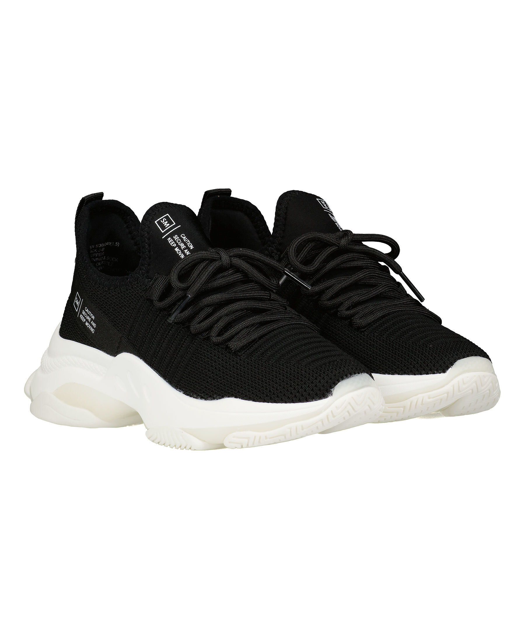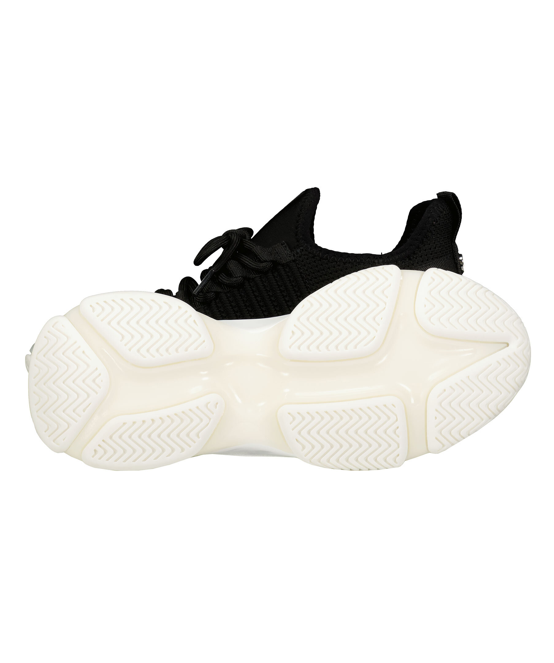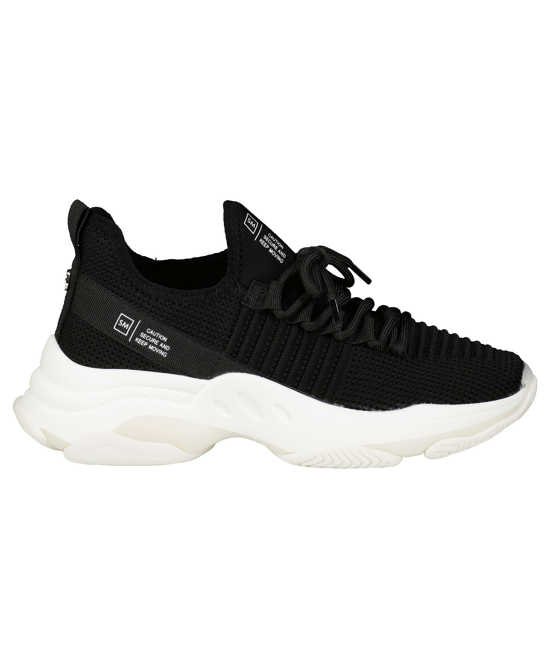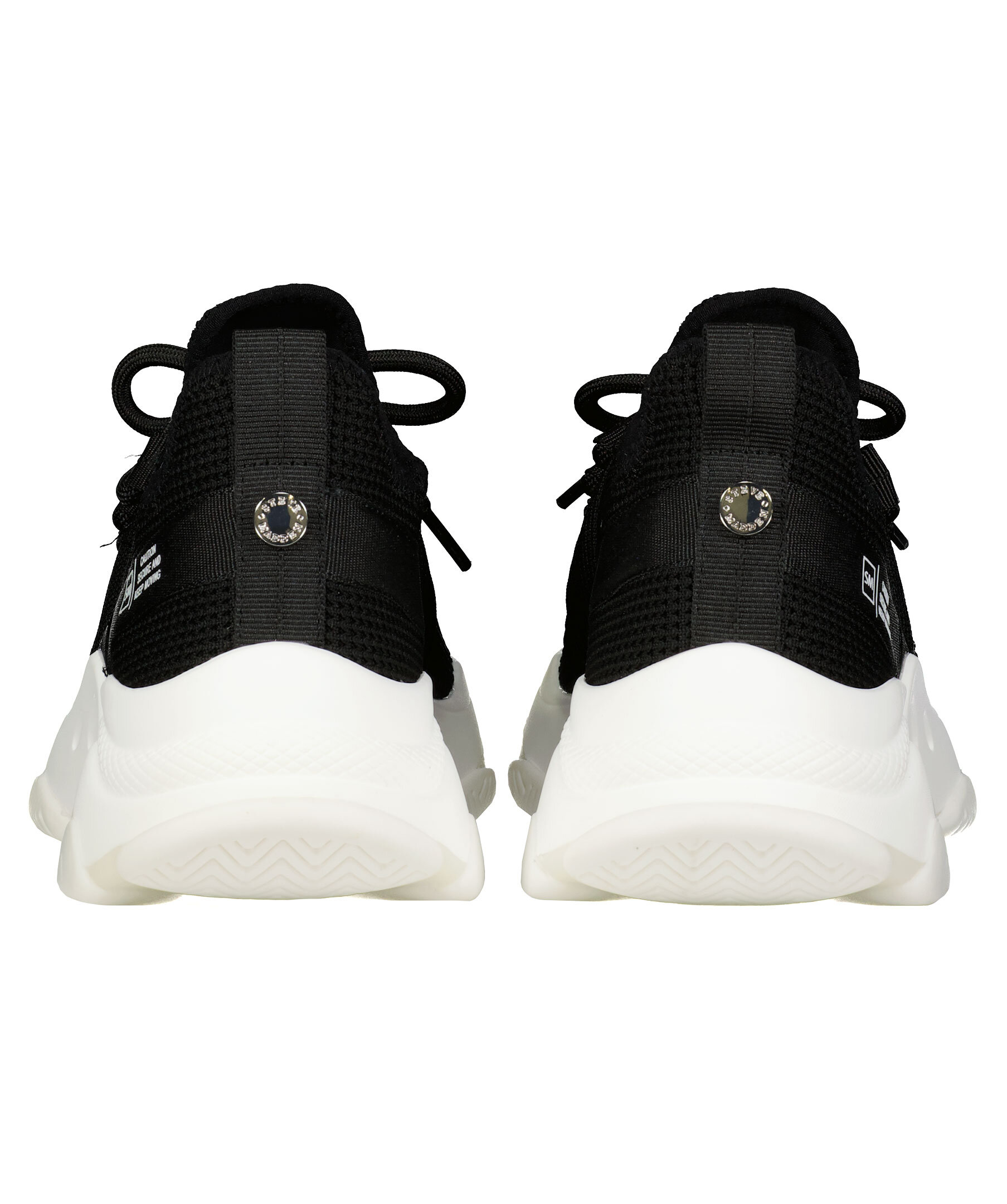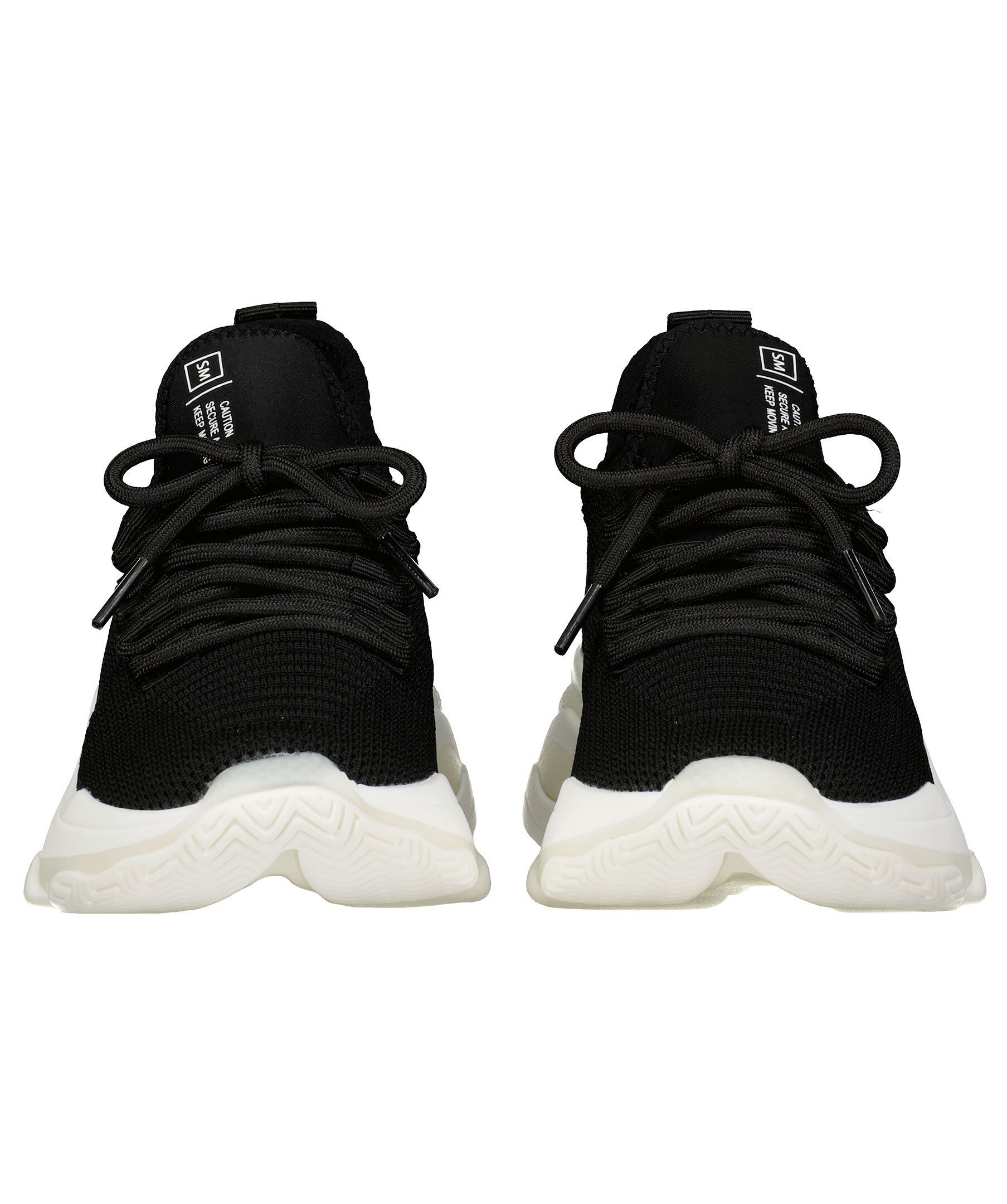 Svarta sneakers med svarta skosnören från Steve Madden. Designade med både stil och prestanda i åtanke och kommer att hålla dig chic och känna dig lätt på fötterna! Tygsko med tjock, vit gummisula som ger maximalt stöd. Rund metalldetalj med logotyp hälen och tunn vit text på plösen och utsidan.