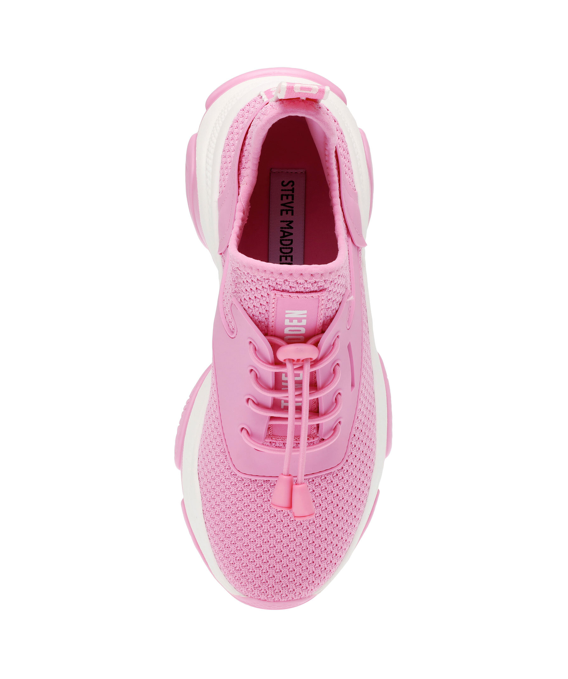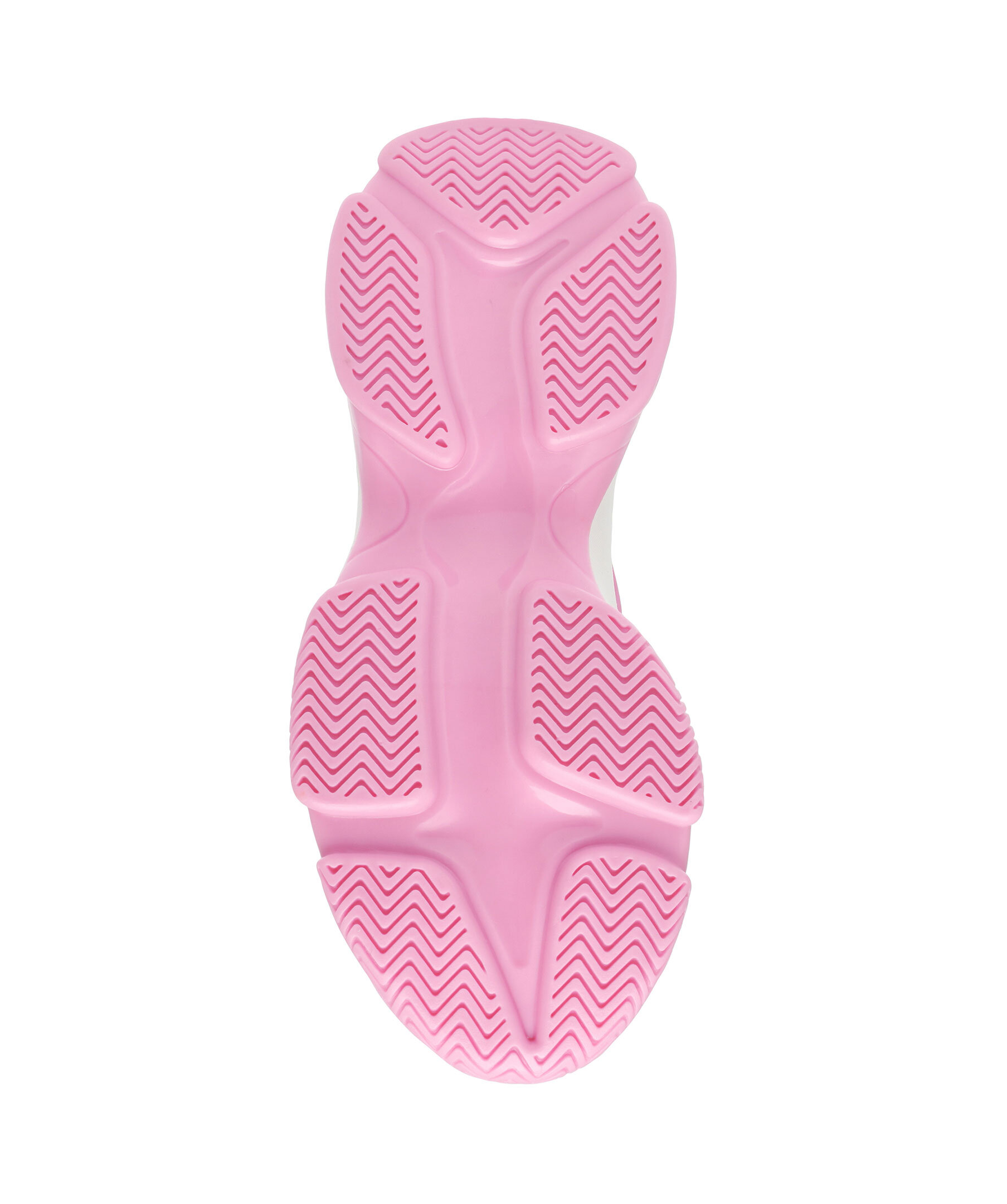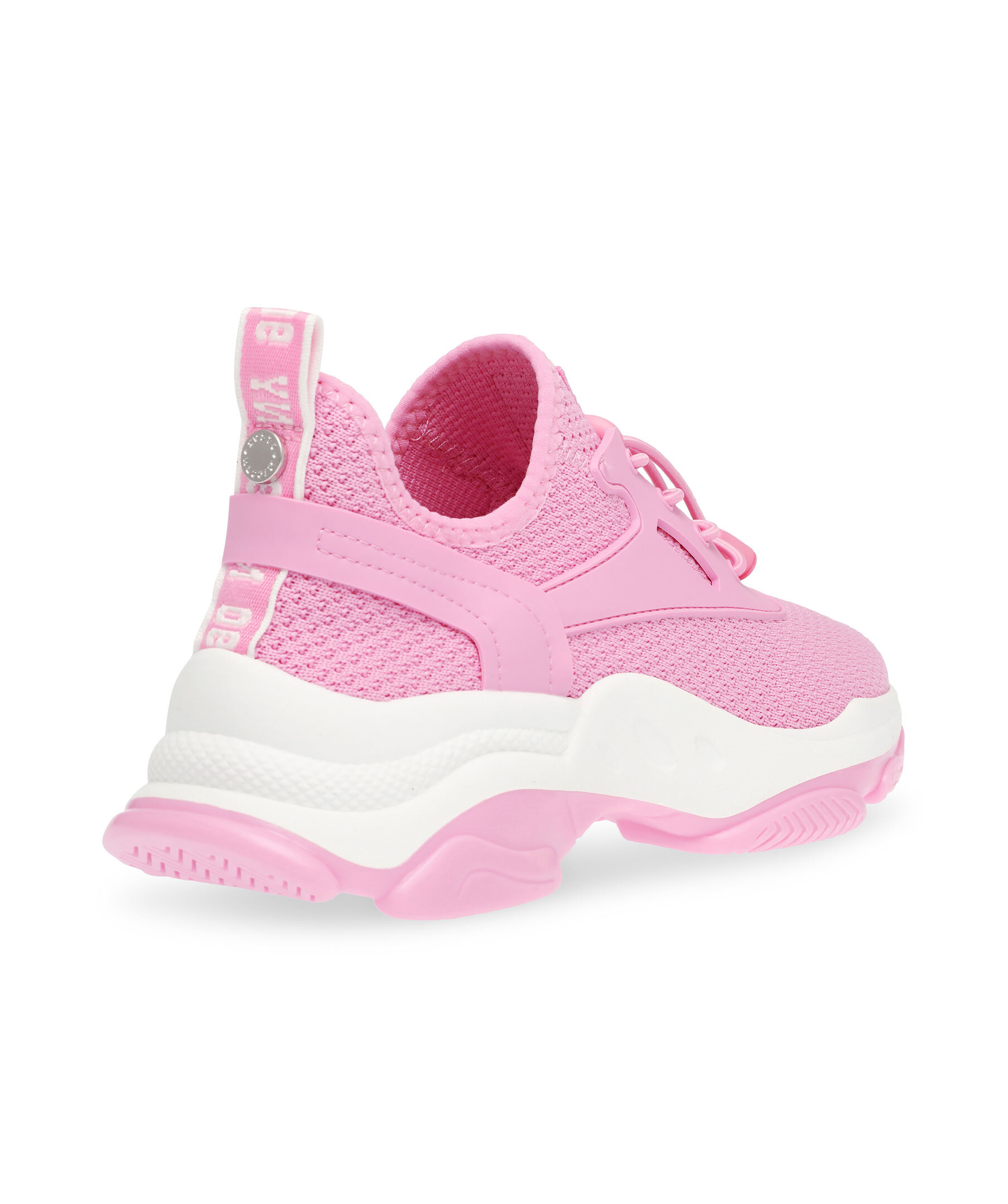 Ljusrosa sneakers med skosnören som stängs med dragsko från Steve Madden. Tillverkade i tyg och har en vit och rosa gummisula som ger maximalt stöd. Rund metallbricka bak på hälen samt plös med logotyp som går ned längs med hälen och logotyp fram på plösen. Denna sko är liten i storlek, vi rekommenderar dig därför att gå upp en storlek.