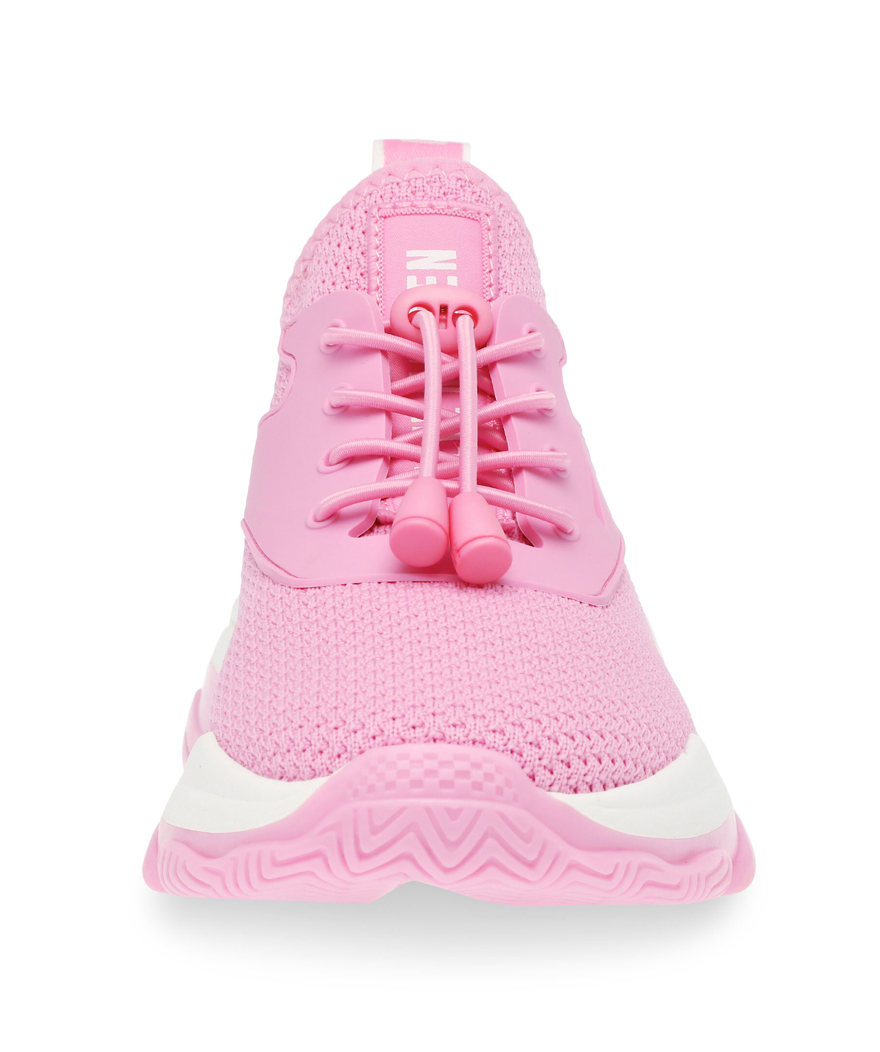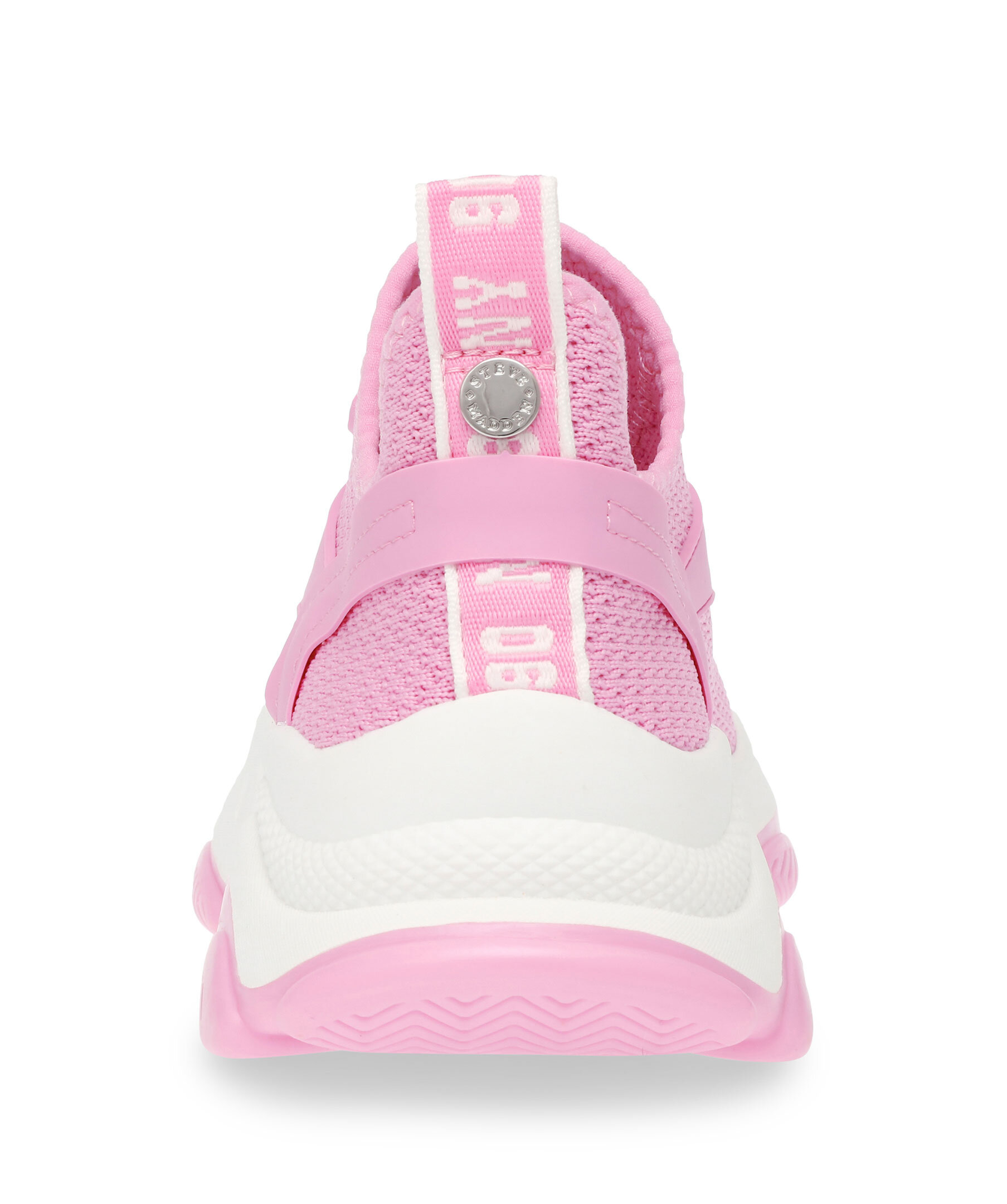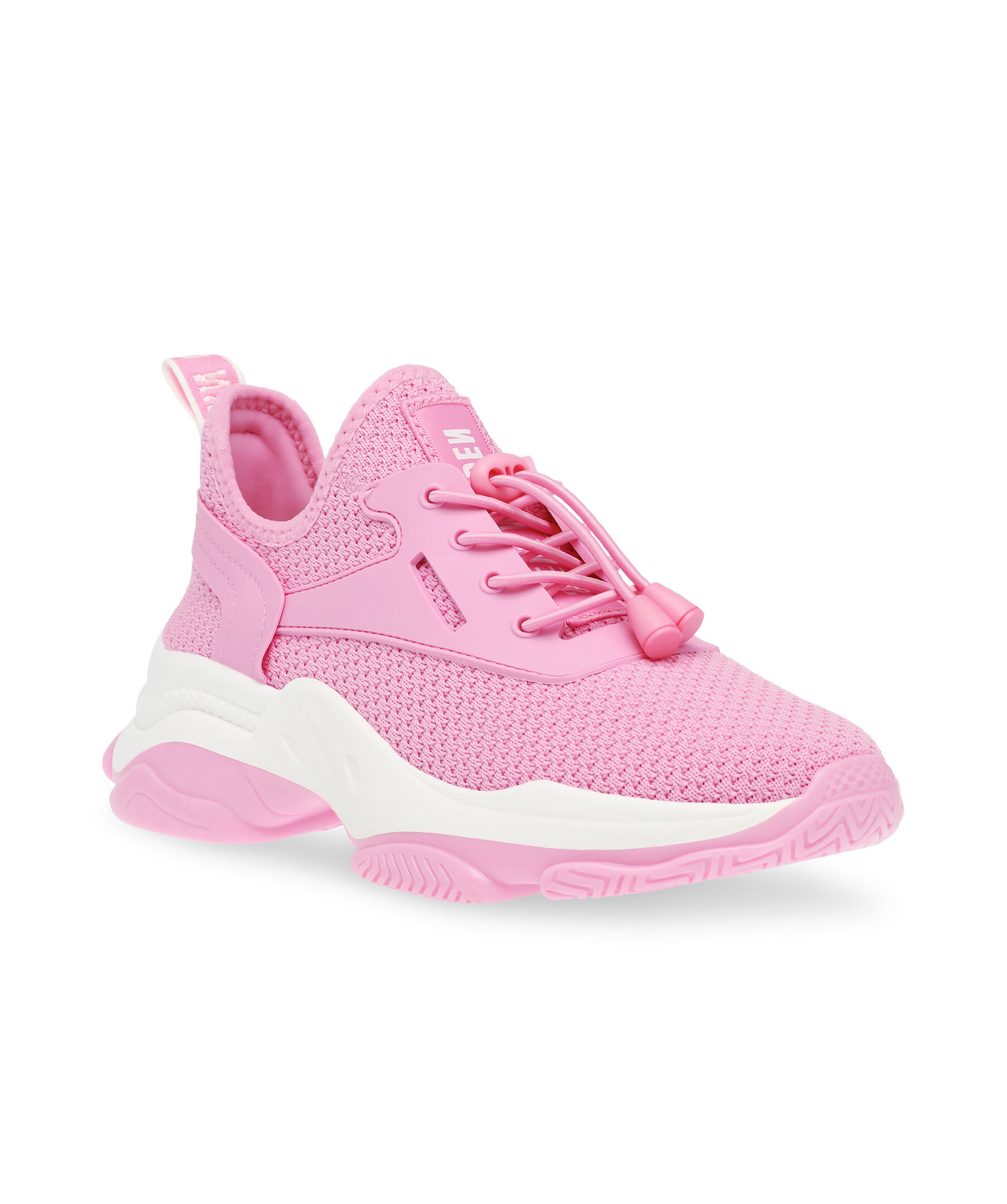 Ljusrosa sneakers med skosnören som stängs med dragsko från Steve Madden. Tillverkade i tyg och har en vit och rosa gummisula som ger maximalt stöd. Rund metallbricka bak på hälen samt plös med logotyp som går ned längs med hälen och logotyp fram på plösen. Denna sko är liten i storlek, vi rekommenderar dig därför att gå upp en storlek.