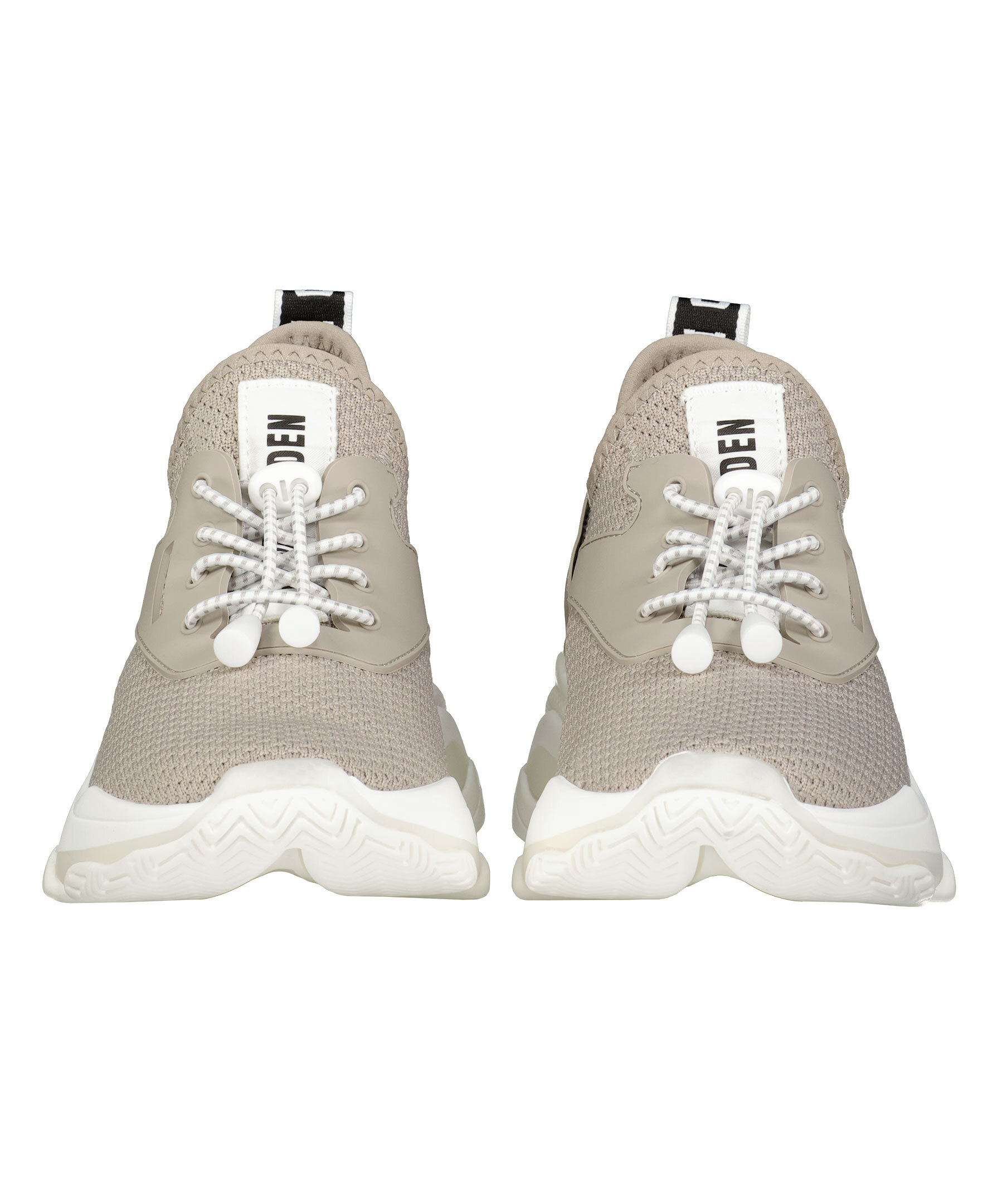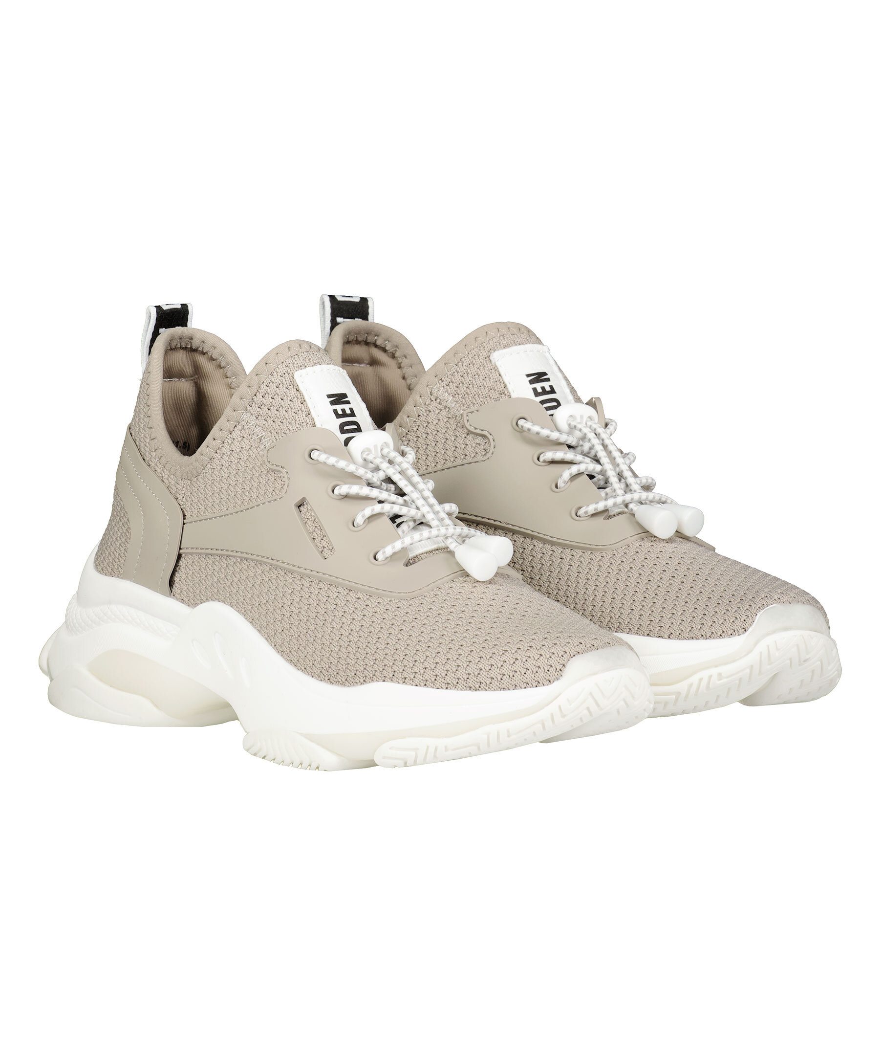 Beigea, sneakers med vit- och beigemönstrade skosnören som stängs med dragsko från Steve Madden. Tillverkade i tyg och har en vit gummisula som ger maximalt stöd. Rund metallbricka bak på hälen samt svart/vit plös med logotyp som går ned längs med hälen och svart/vit logotyp fram på plösen. Denna sko är liten i storlek, vi rekommenderar dig därför att gå upp en storlek.