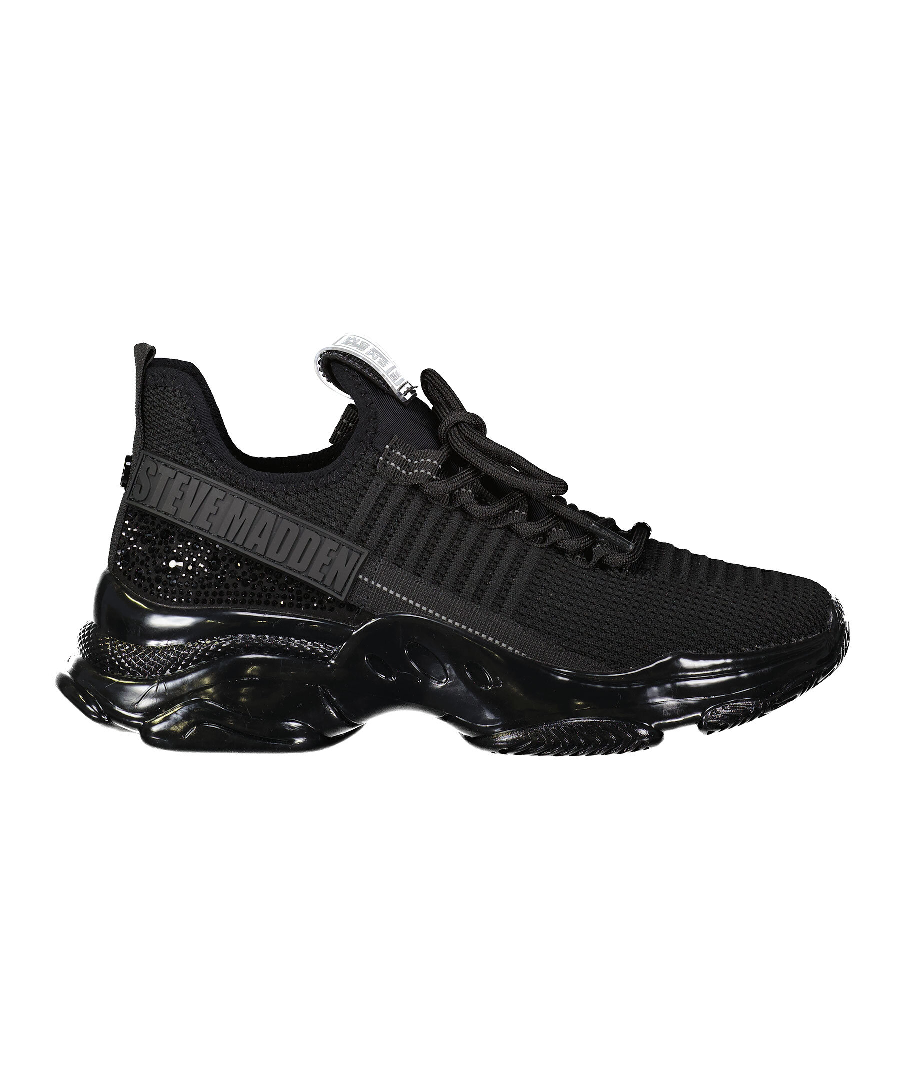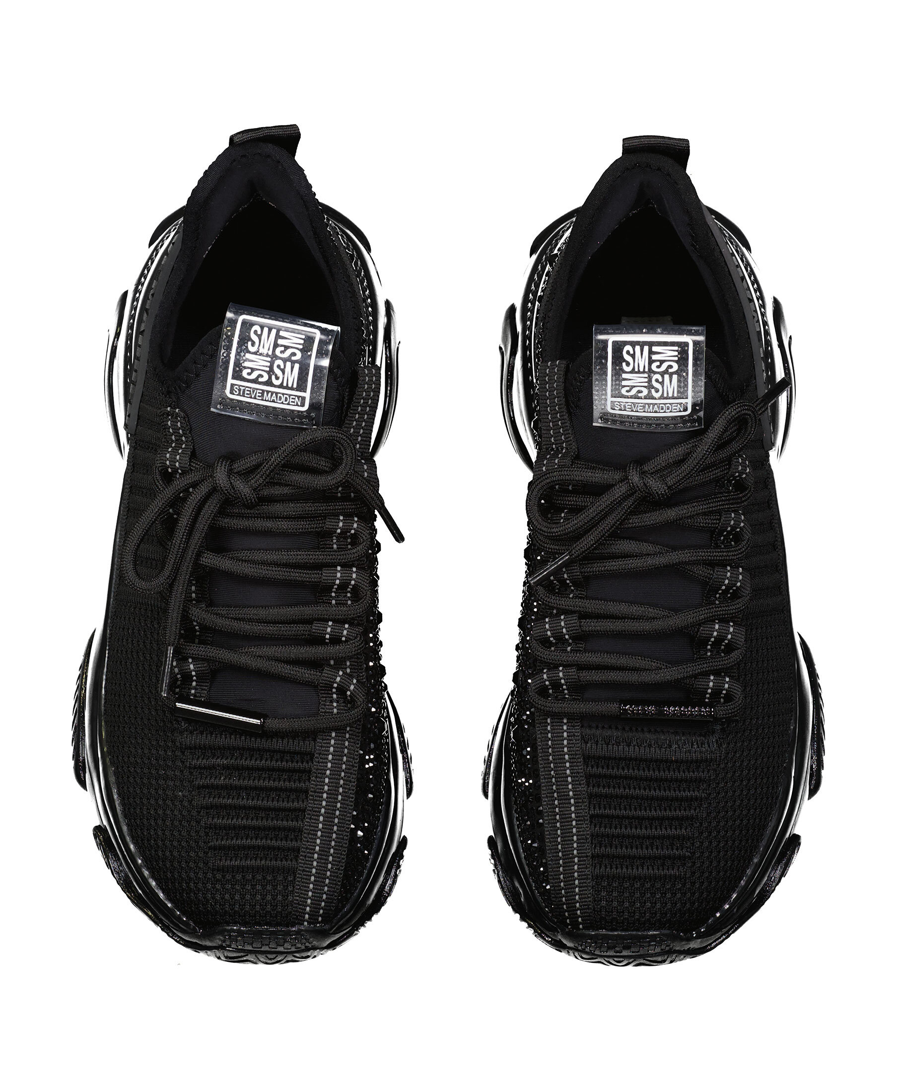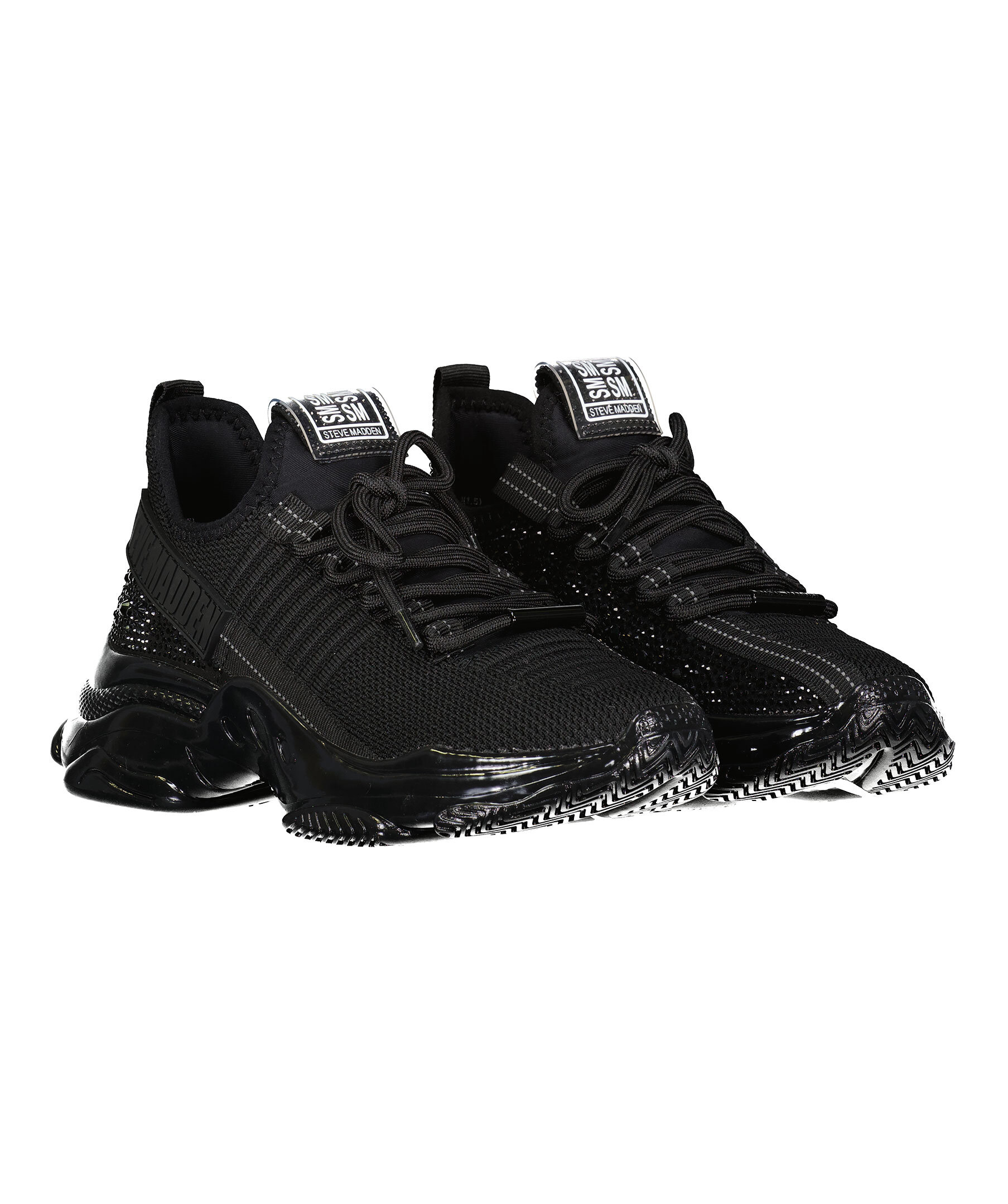 Svarta sneakers med strasstenar runt om skon från Steve Madden. Designade med både stil och prestanda i åtanke och kommer att hålla dig chic och känna dig lätt på fötterna! Tygsko med tjock gummisula som ger maximalt stöd. Smala sömmar med reflex längs snörningen och på plösen bak, metalldetalj med logotyp på snörningen fram och en rund metallbricka bak på hälen samt tunn text på plösen och utsidan.