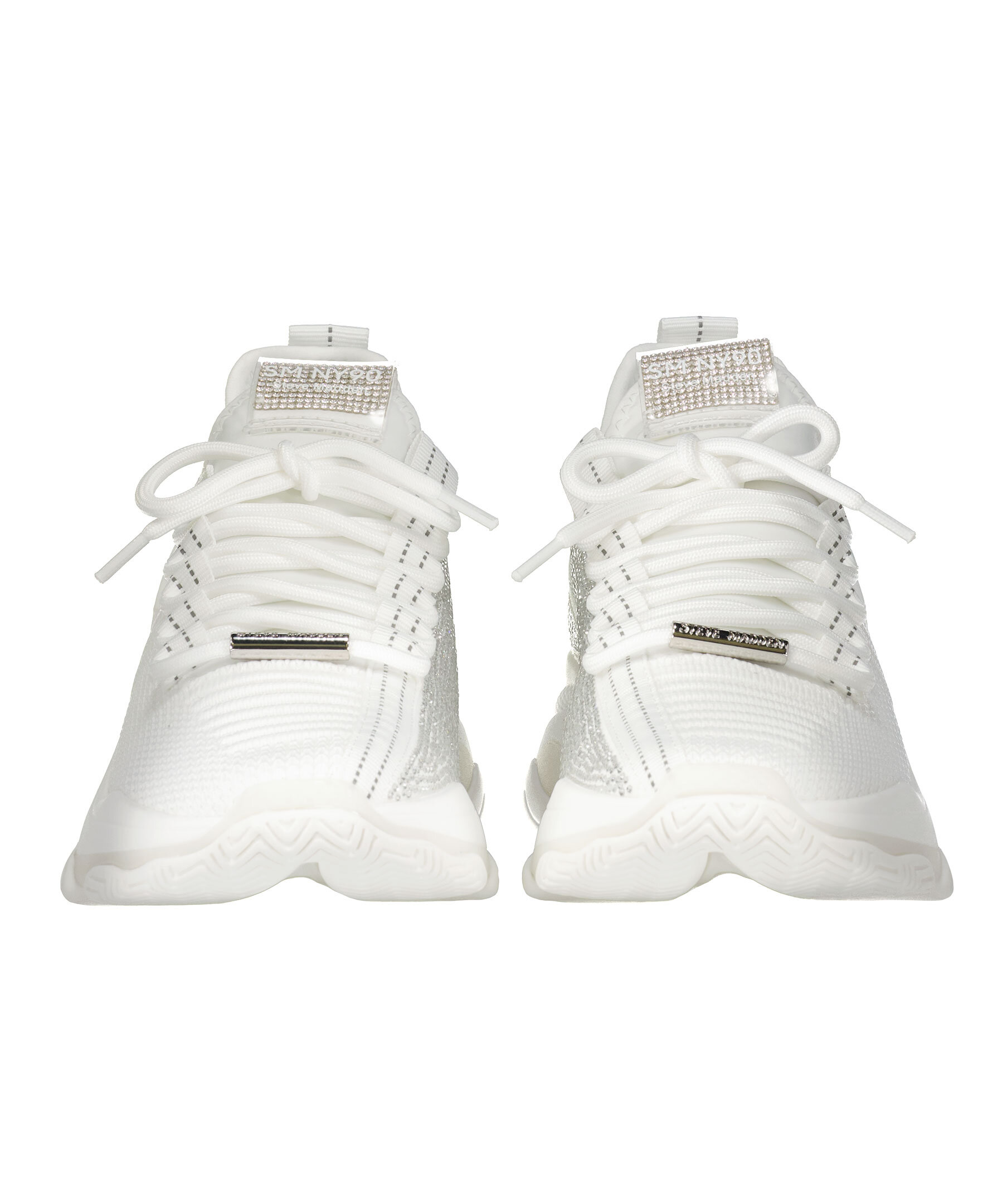 Vita sneakers med silverfärgade strasstenar runt om skon från Steve Madden. Designade med både stil och prestanda i åtanke och kommer att hålla dig chic och känna dig lätt på fötterna! Tygsko med tjock, vit gummisula som ger maximalt stöd. Smala sömmar med reflex längs snörningen och på plösen bak, metalldetalj med logotyp på snörningen fram och en rund metallbricka bak på hälen samt tunn svart text på plösen och utsidan. Skorna är små i storleken, vi rekommendera dig att beställa en storlek större än din normala storlek.