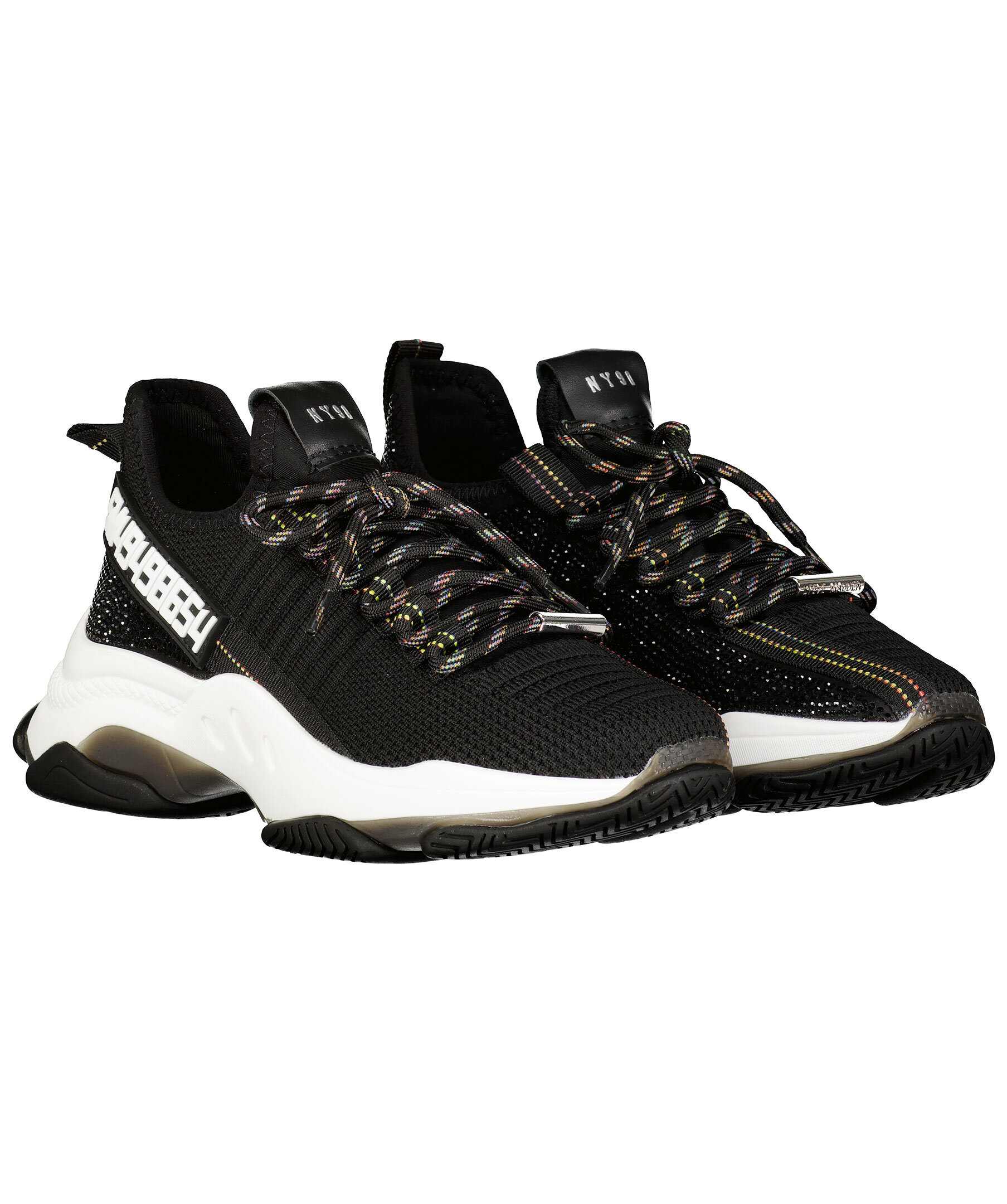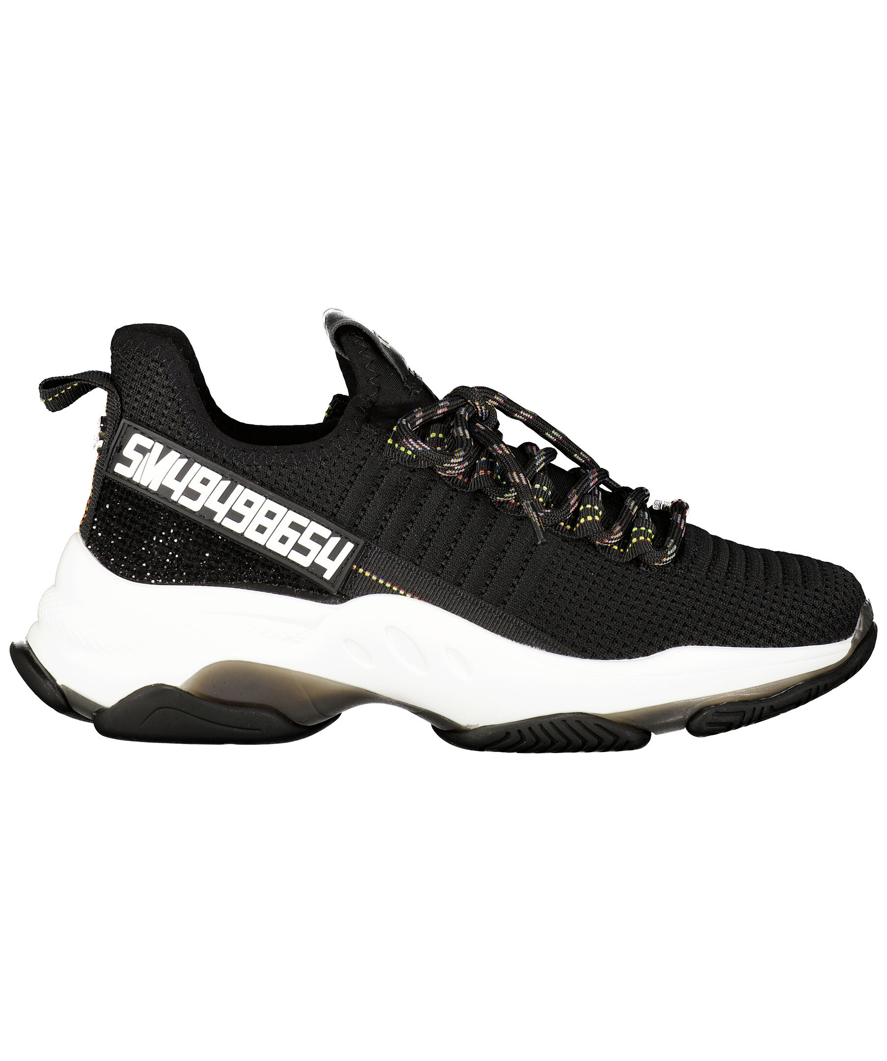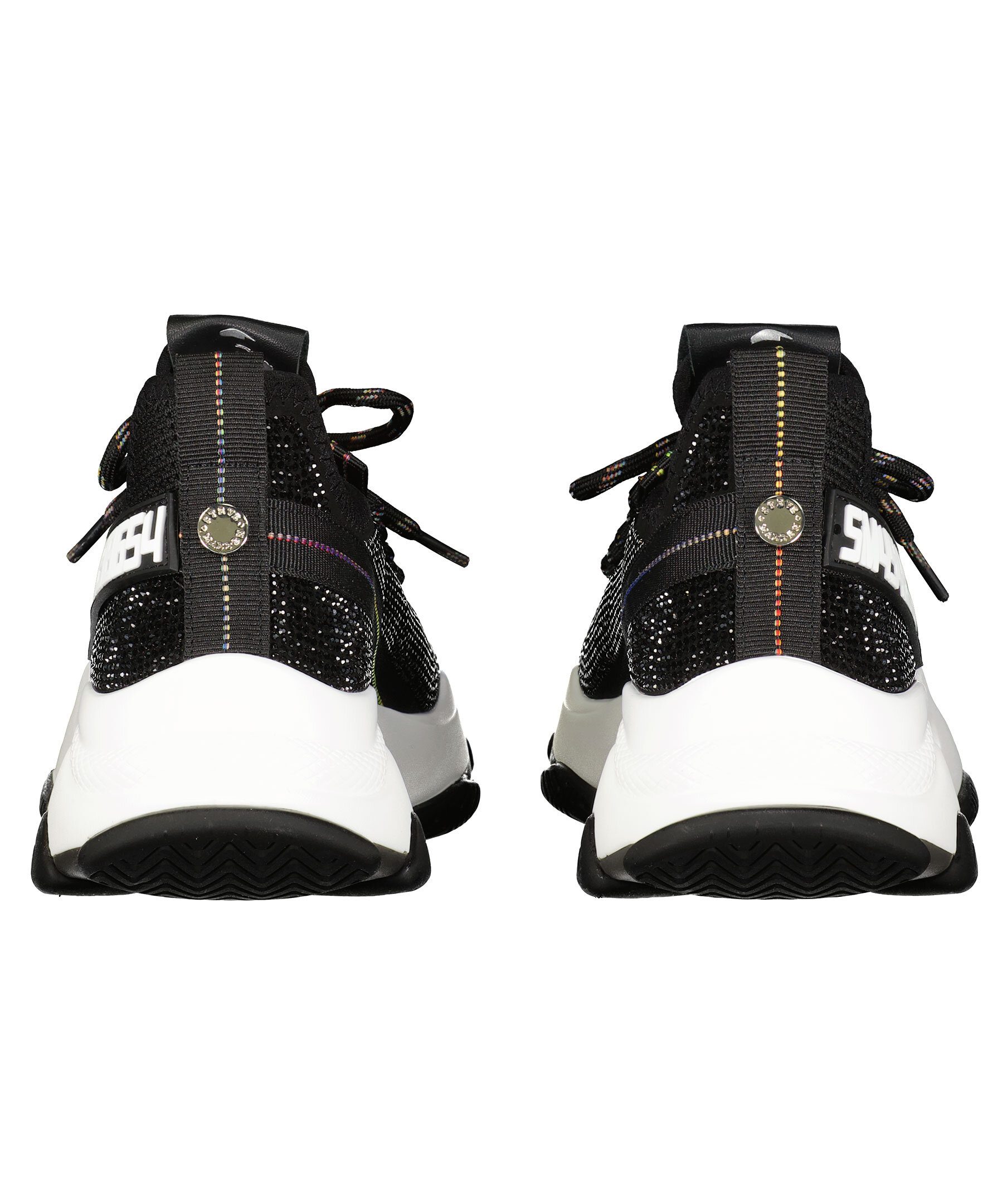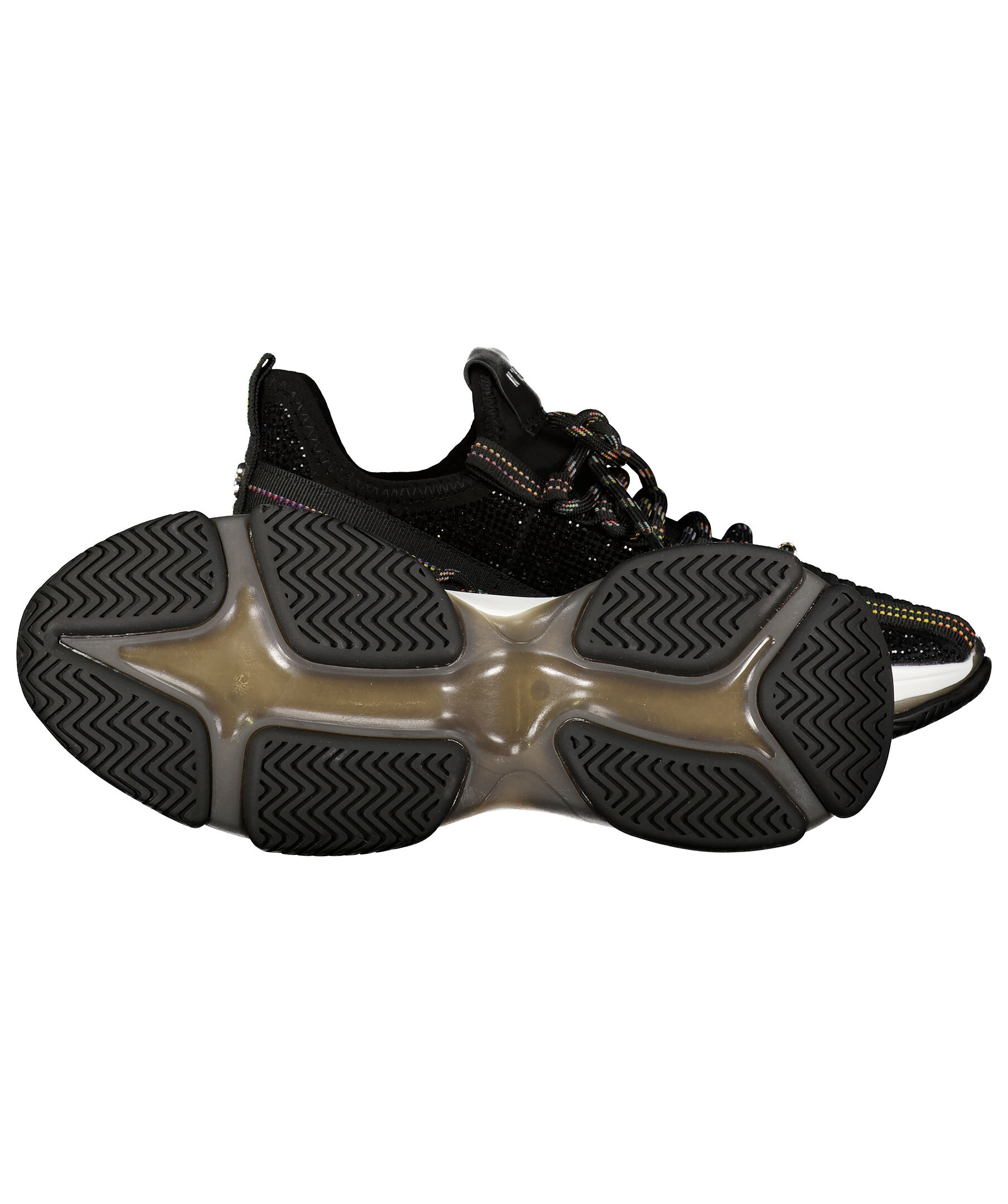 Svarta sneakers med strasstenar runt om skon från Steve Madden. Designade med både stil och prestanda i åtanke och kommer att hålla dig chic och känna dig lätt på fötterna! Tygsko med tjock, beige gummisula som ger maximalt stöd. Smala sömmar med reflex längs snörningen och på plösen bak, metalldetalj med logotyp på snörningen fram och en rund metallbricka bak på hälen samt tunn svart text på plösen och utsidan. Skorna är små i storleken, vi rekommendera dig att beställa en storlek större än din normala storlek.