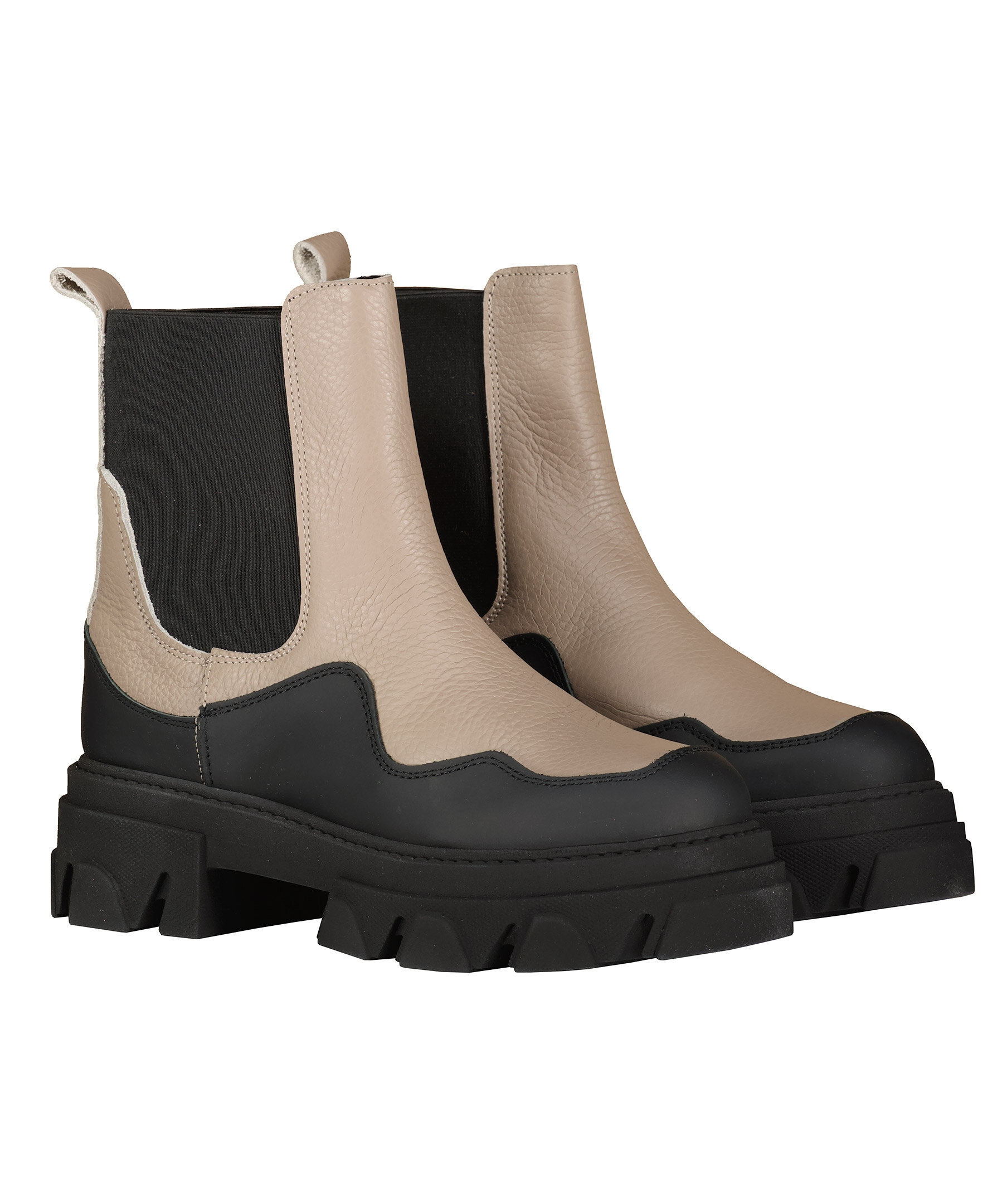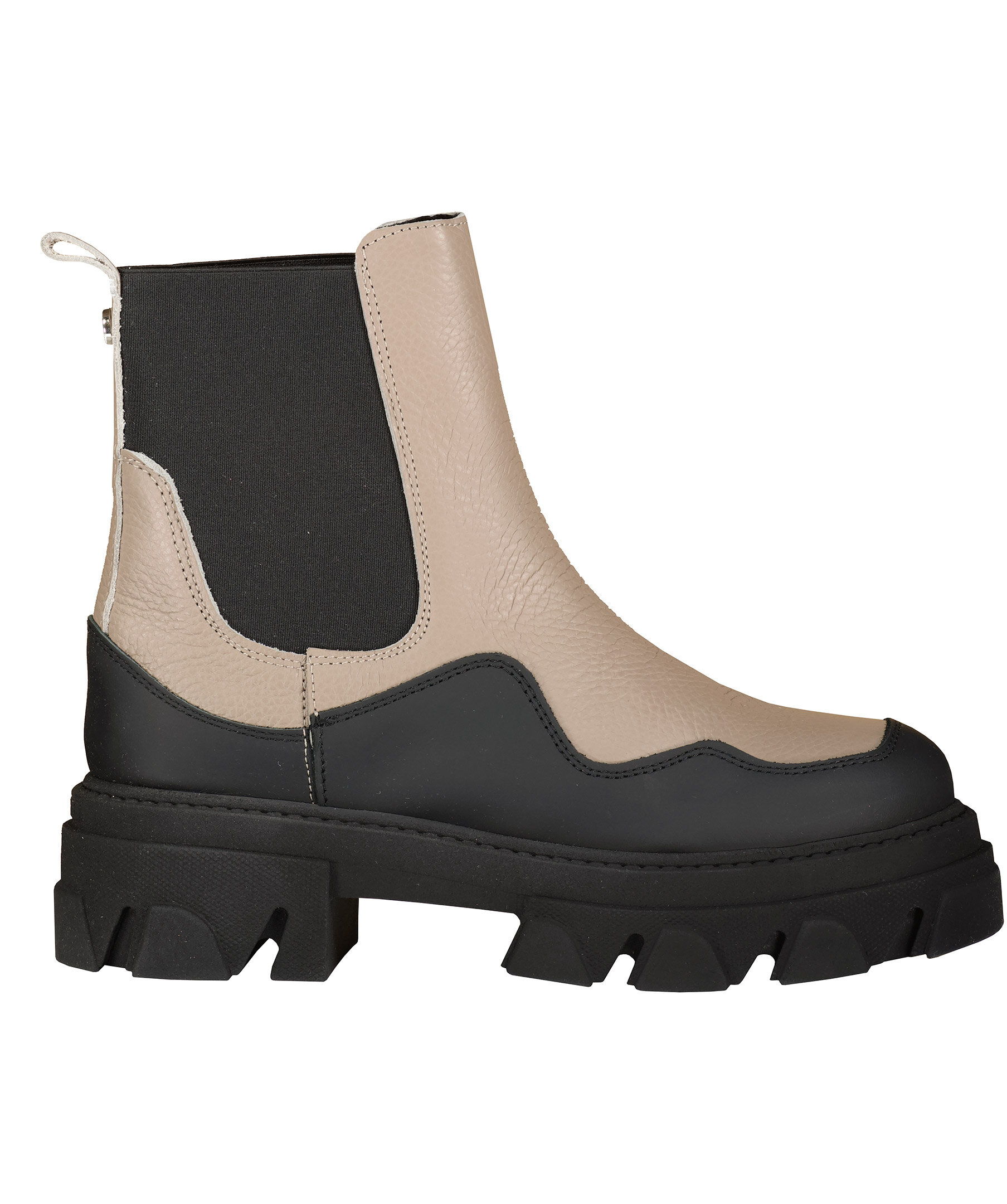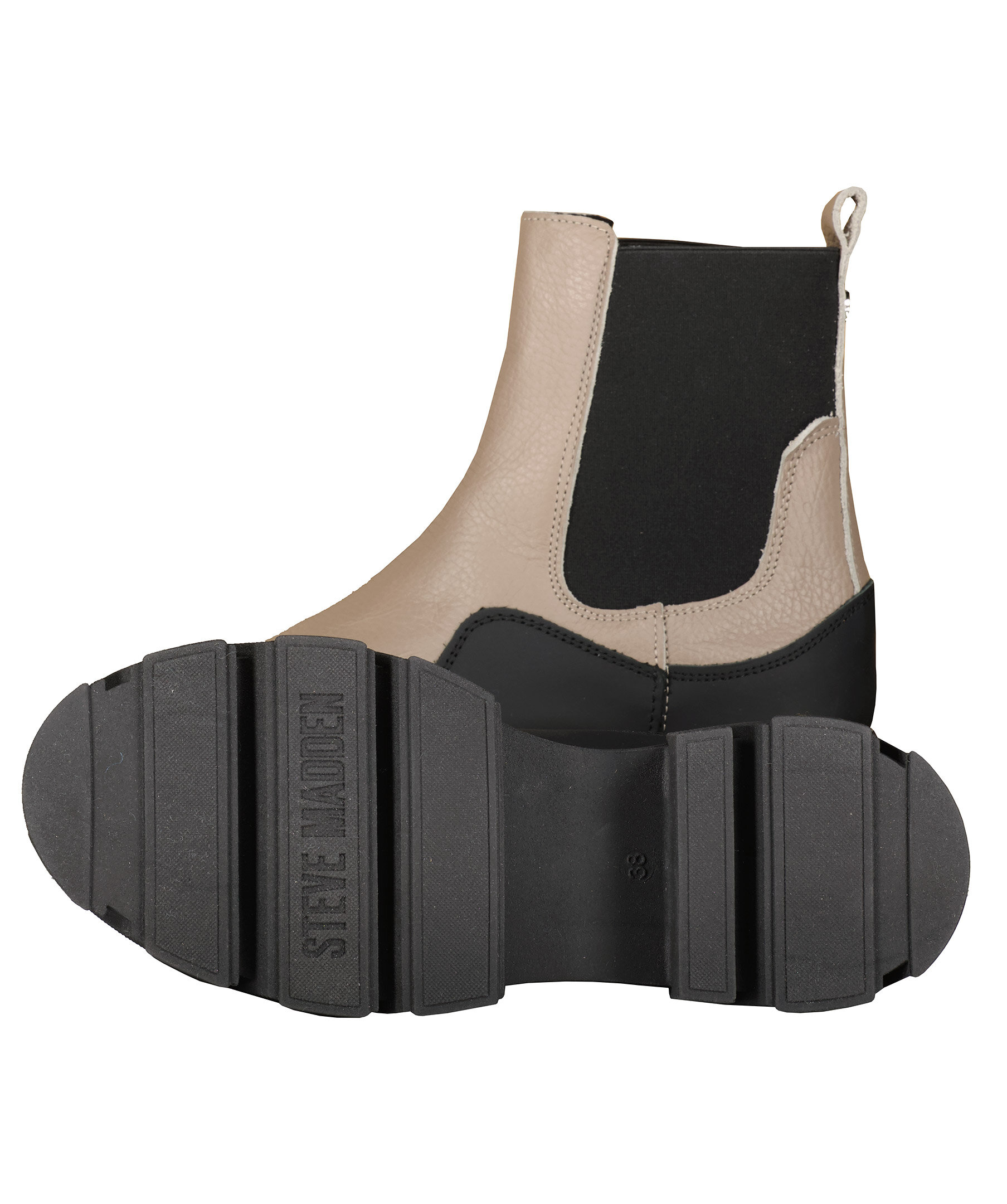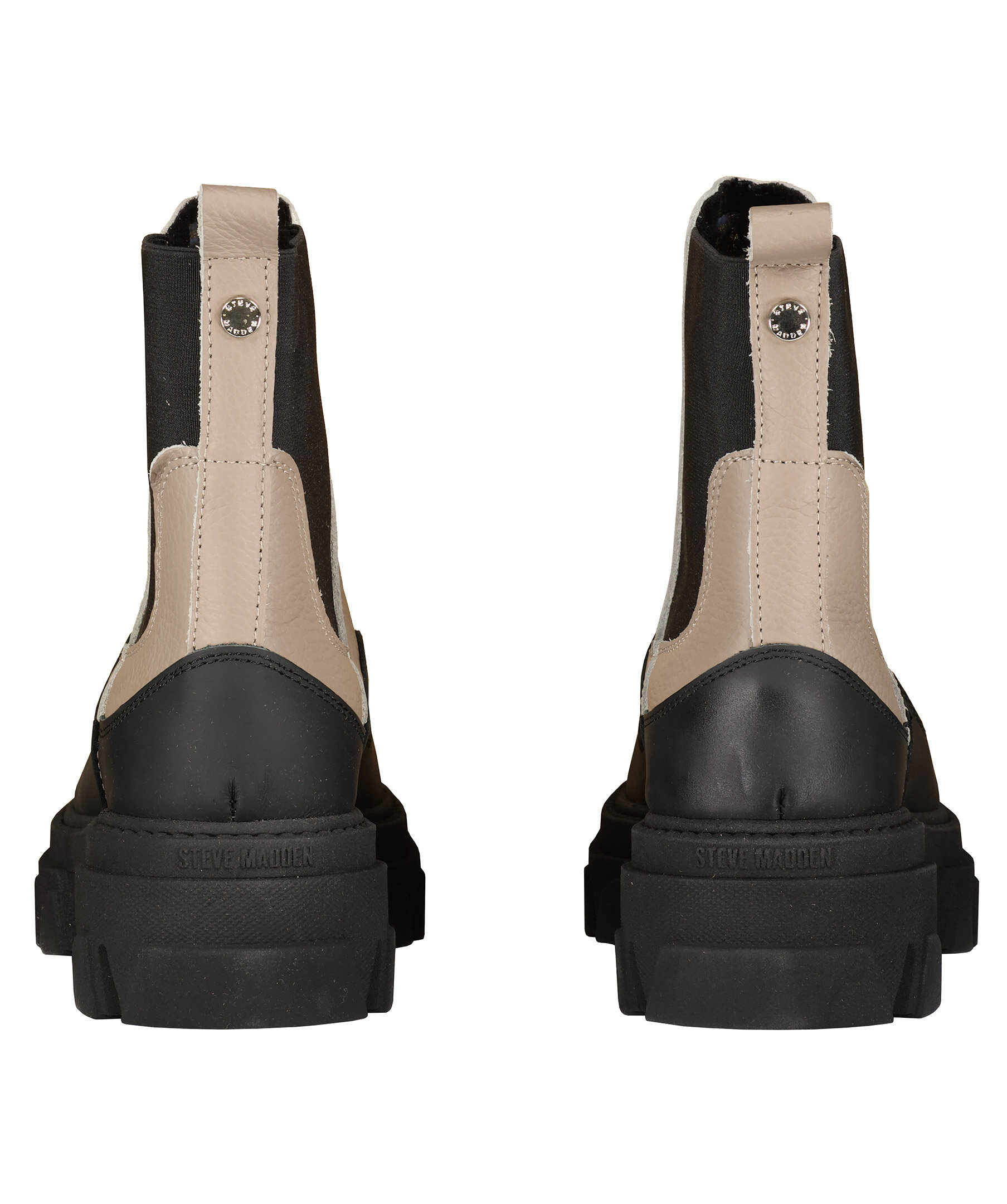 Grå beigea boots från Steve Madden i Chelseaboots modell i matt skinn med låga skaft. Grova sulor i gummi. Resår i sidan. Öglor baktill vid skaftet. Gummerad, rundad tå.