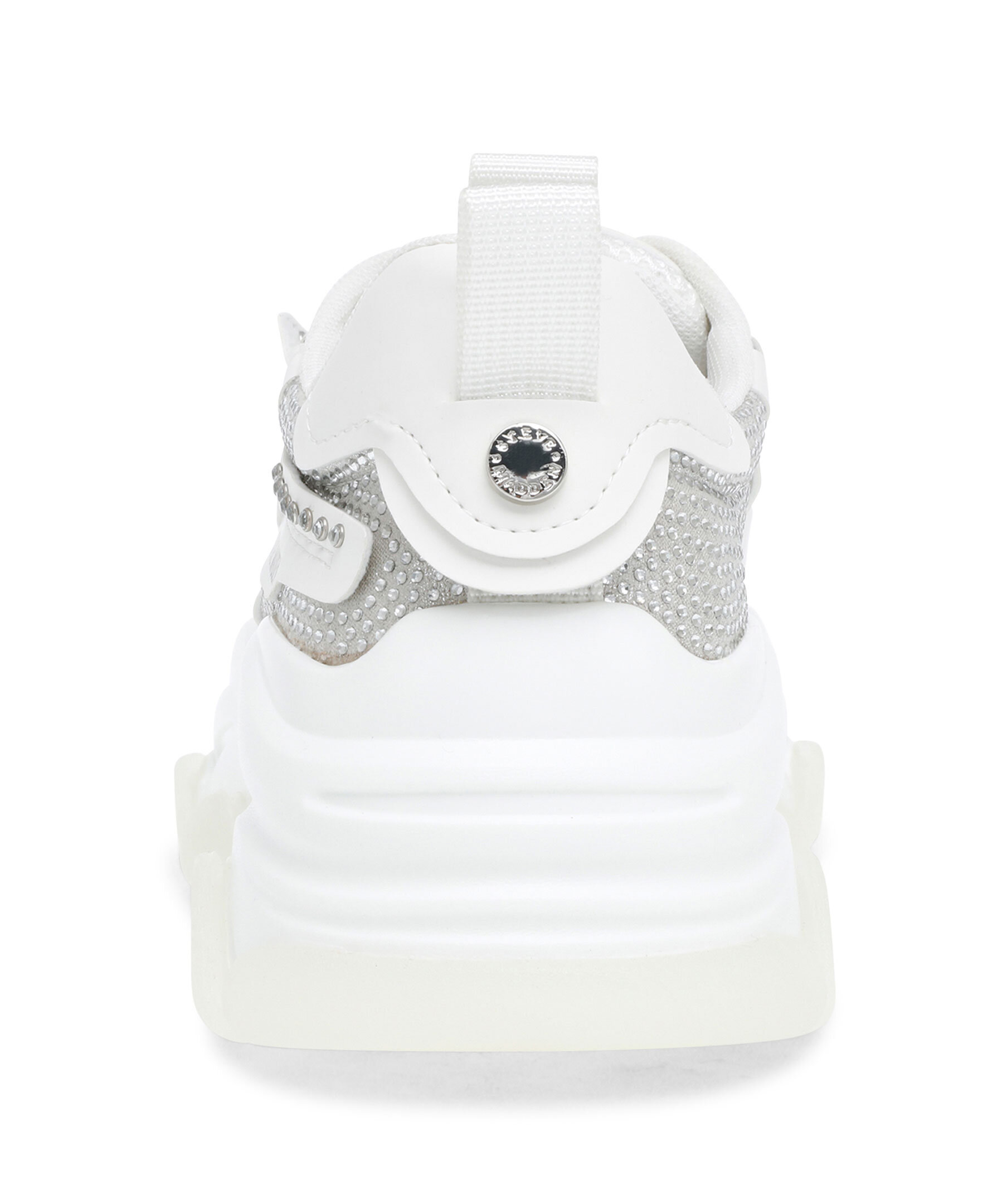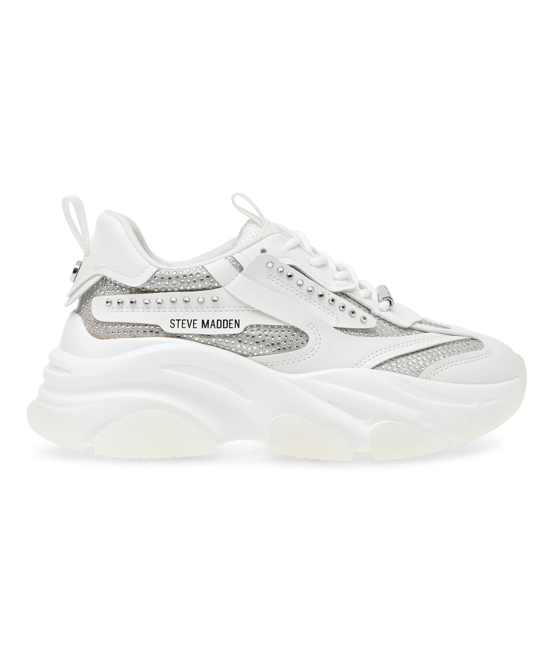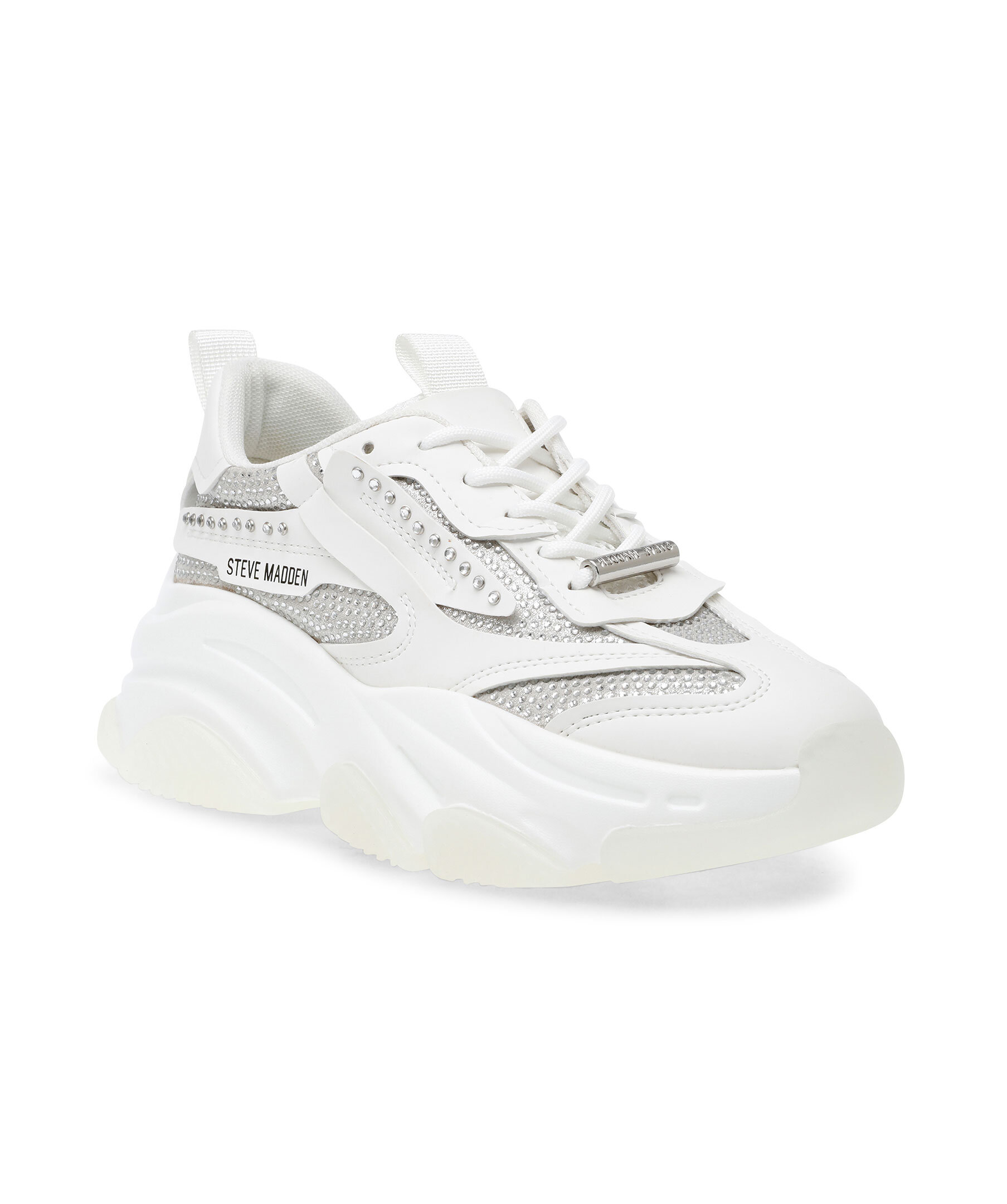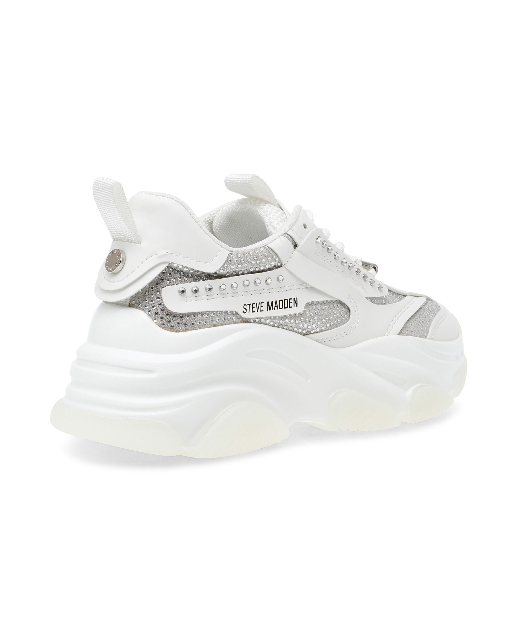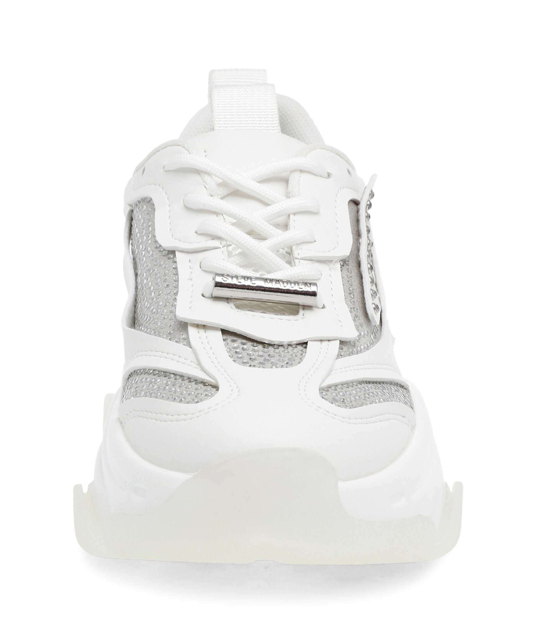 Vit sneakers från Steve Madden. Detaljer med strass. Tillverkade i konstläder och mesh. Runda skosnören med metalldetalj med stansad logotyp. Ögla på hälen och plösen. Tryckt logotyp i svart på skons yttersida. Grov sula i gummi. Rund metallbricka bak på hälen. Denna sko är liten i storlek, vi rekommenderar dig därför att gå upp en storlek.