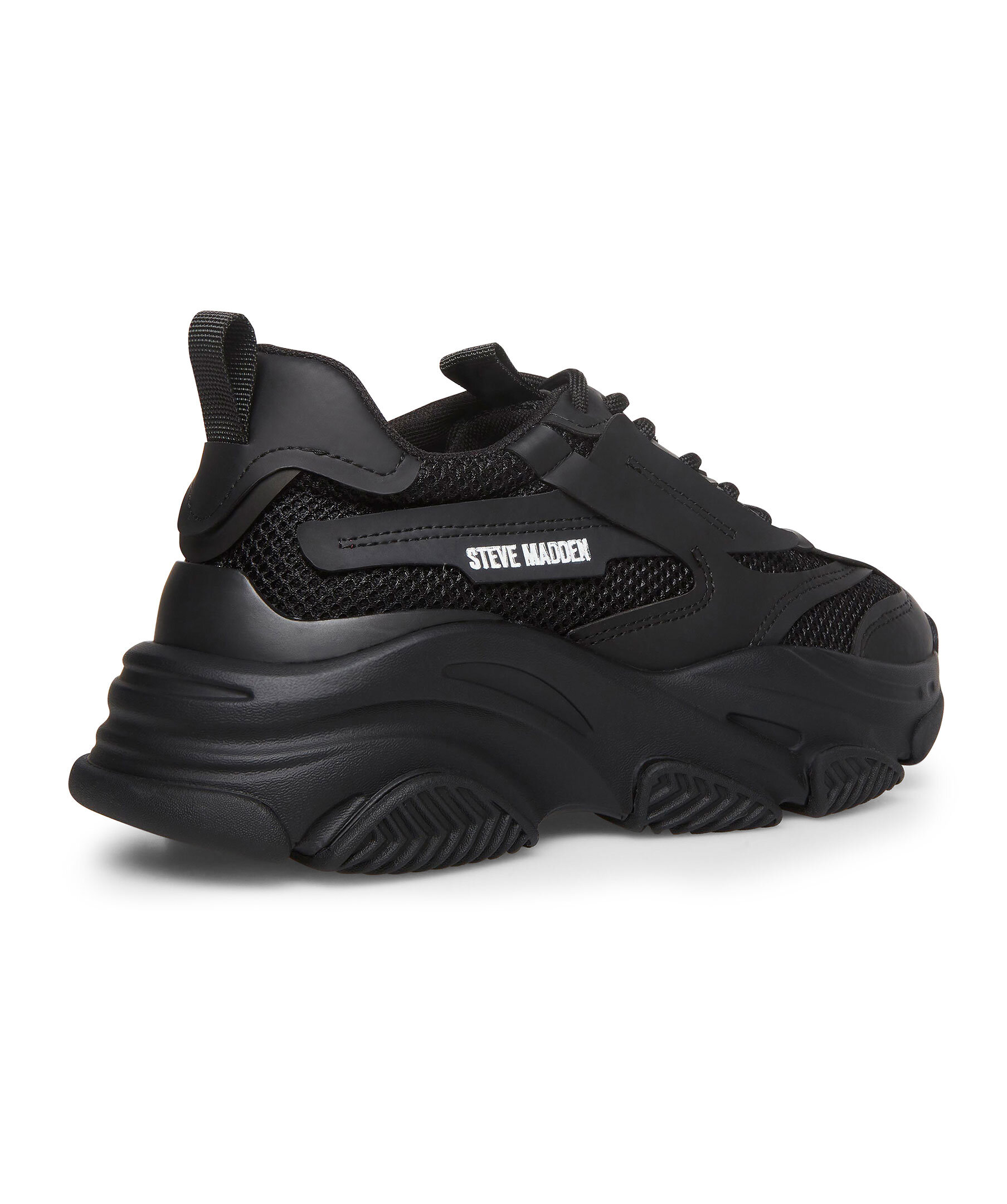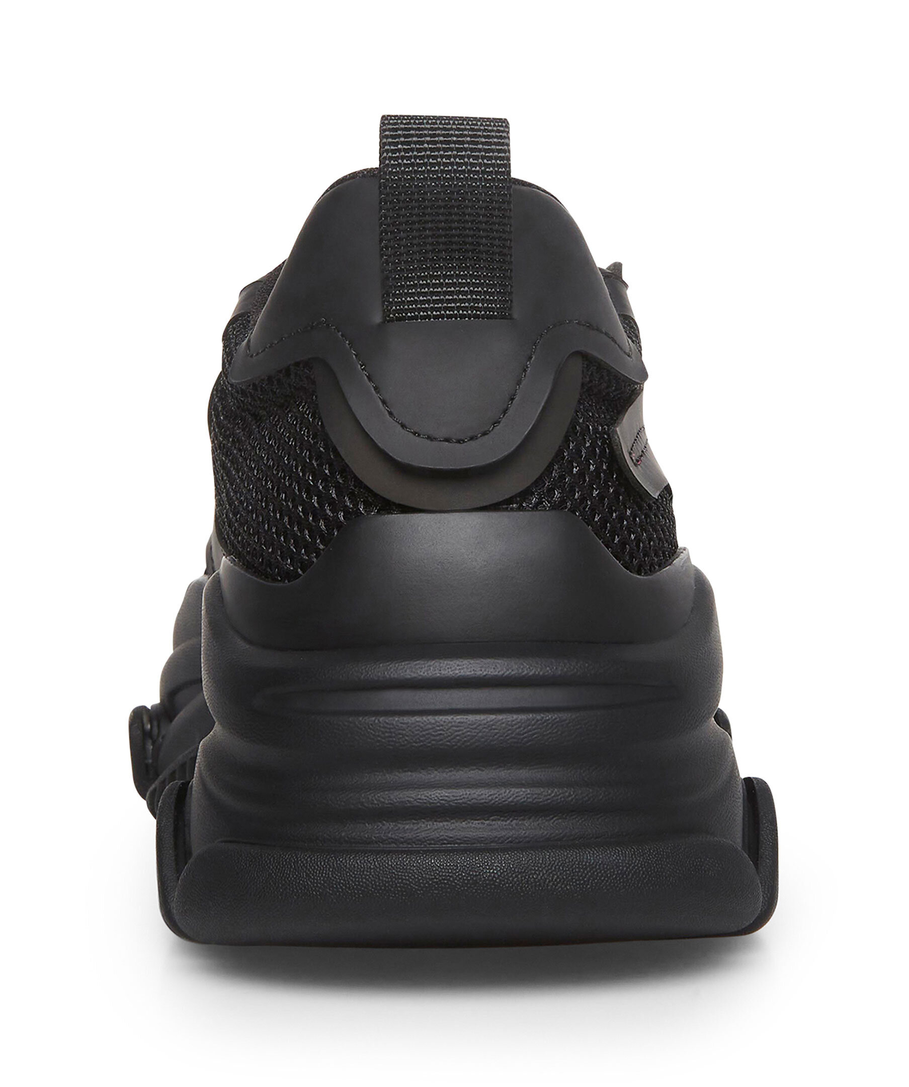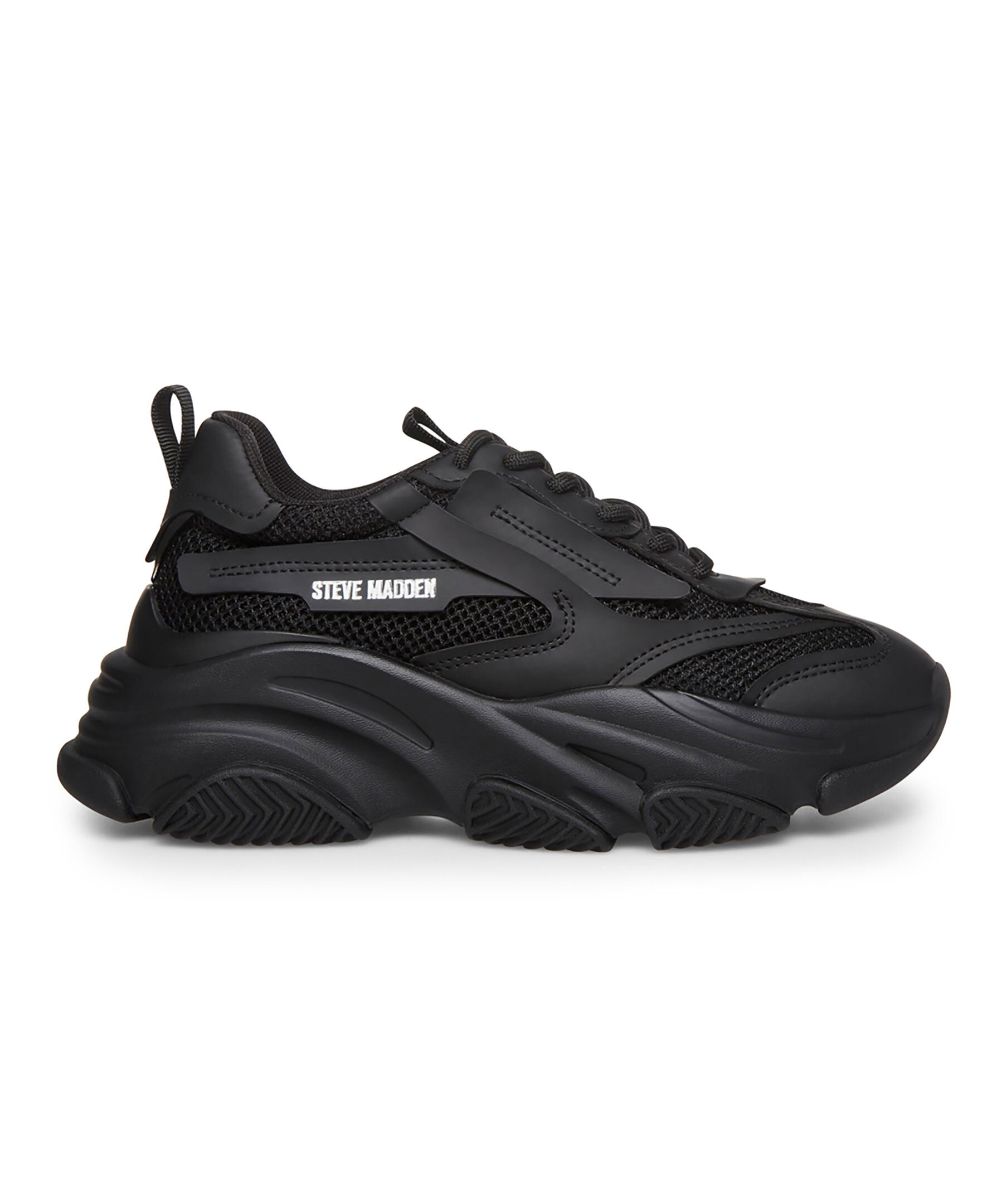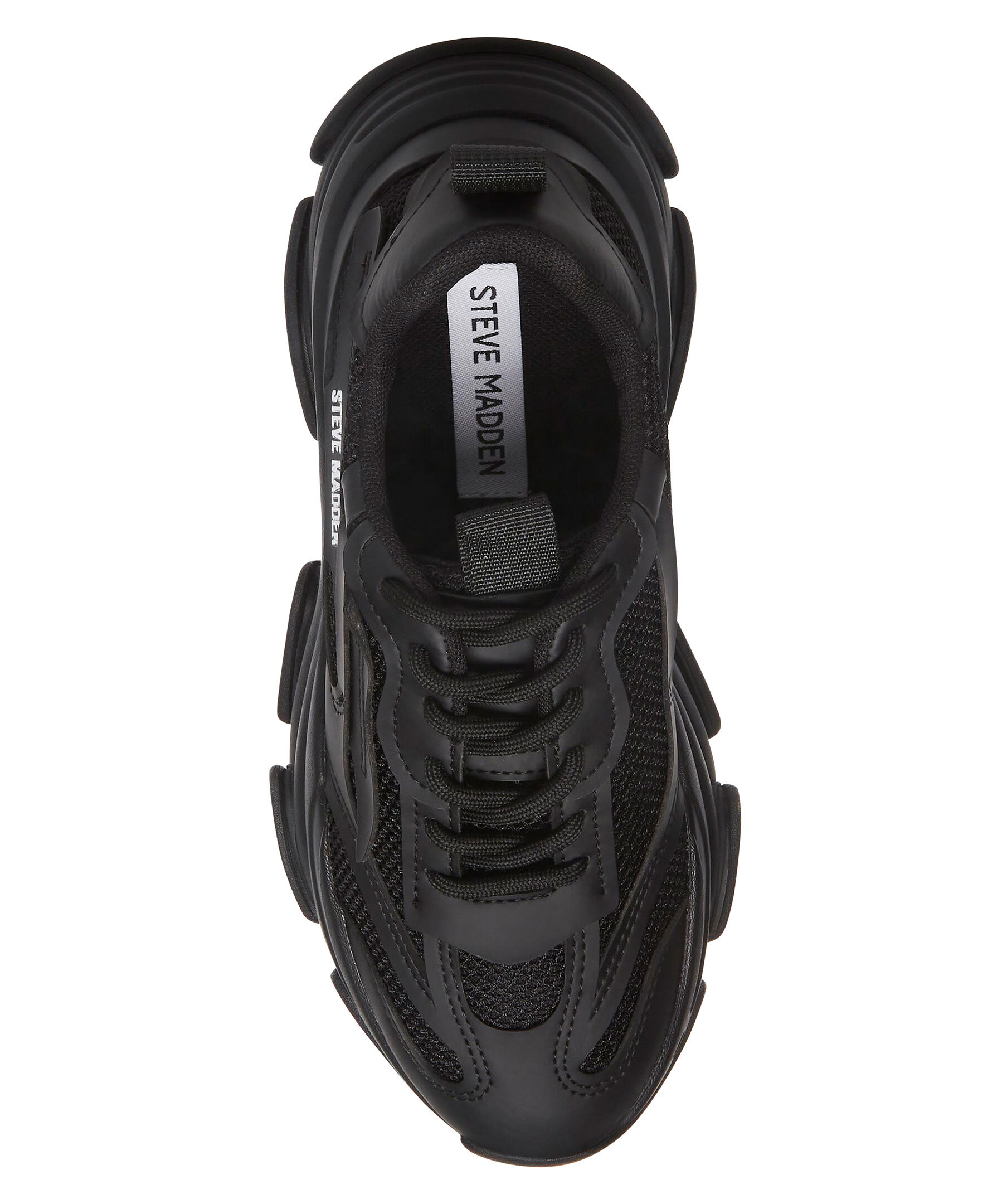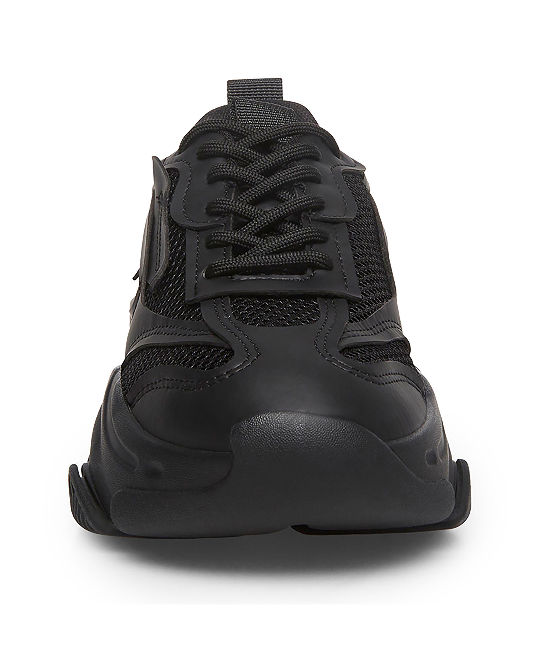 Svarta sneakers från Steve Madden. Tillverkade i konstläder och mesh. Runda skosnören med metalldetalj med stansad logotyp. Ögla på hälen och plösen. Tryckt logotyp i svart på skons yttersida. Grov sula i gummi. Rund metallbricka bak på hälen. Denna sko är liten i storlek, vi rekommenderar dig därför att gå upp en storlek.