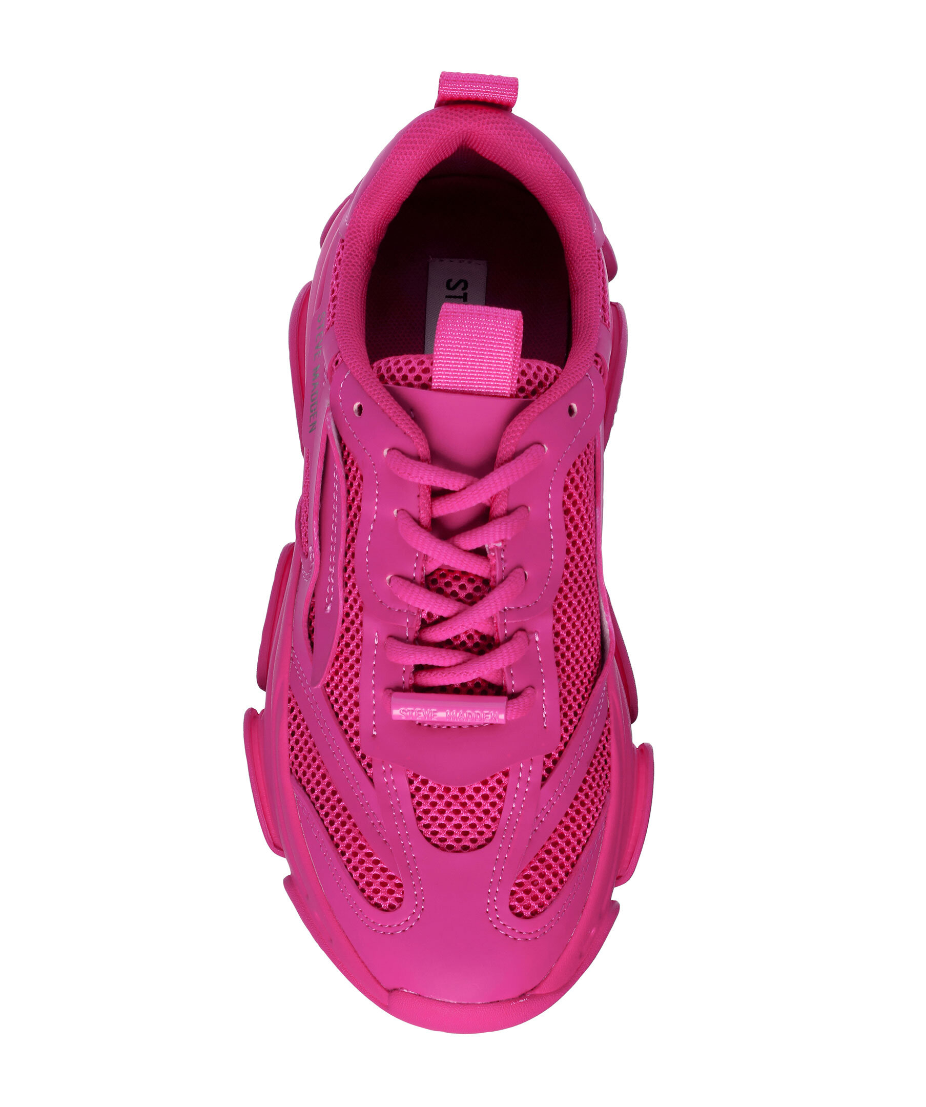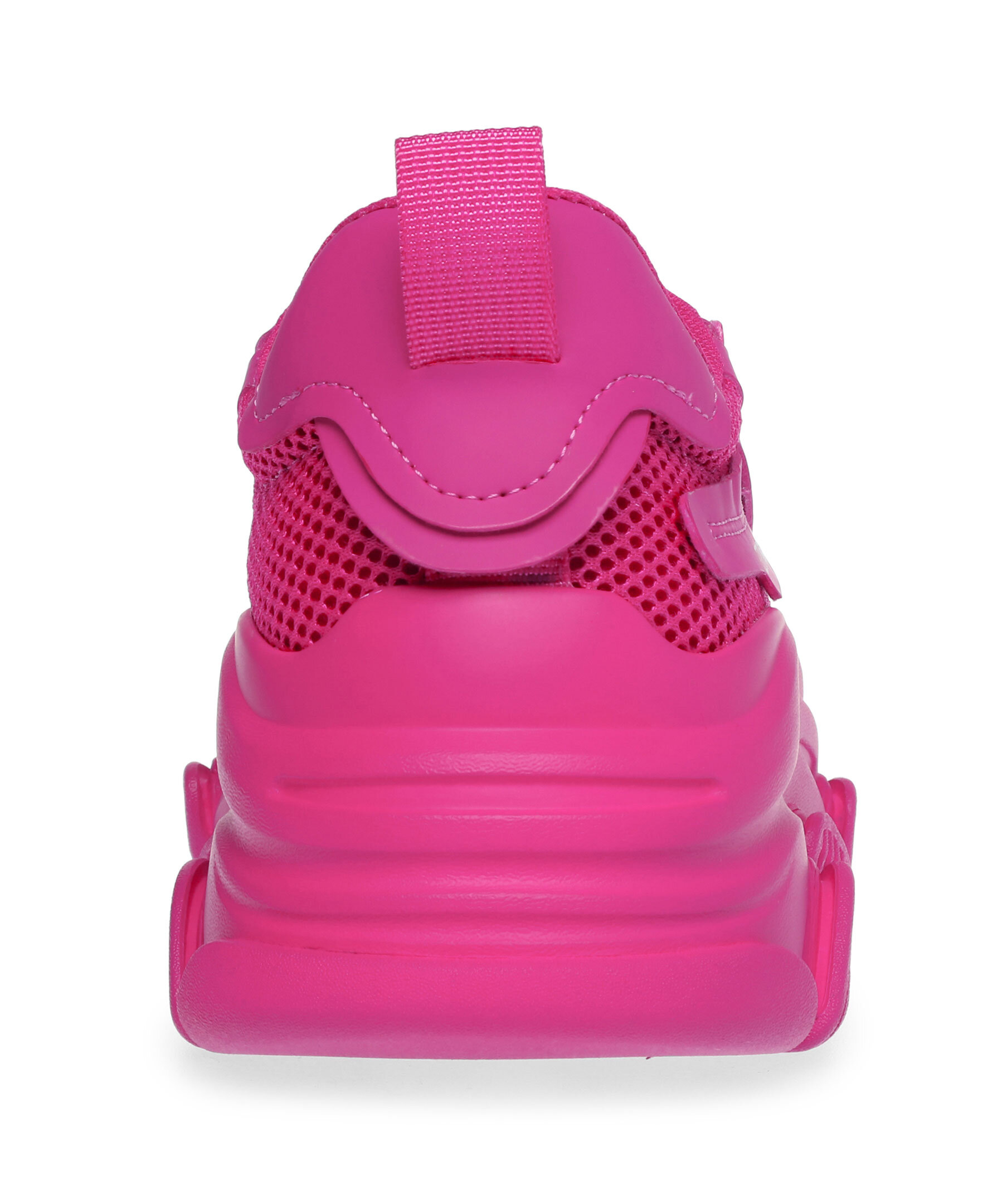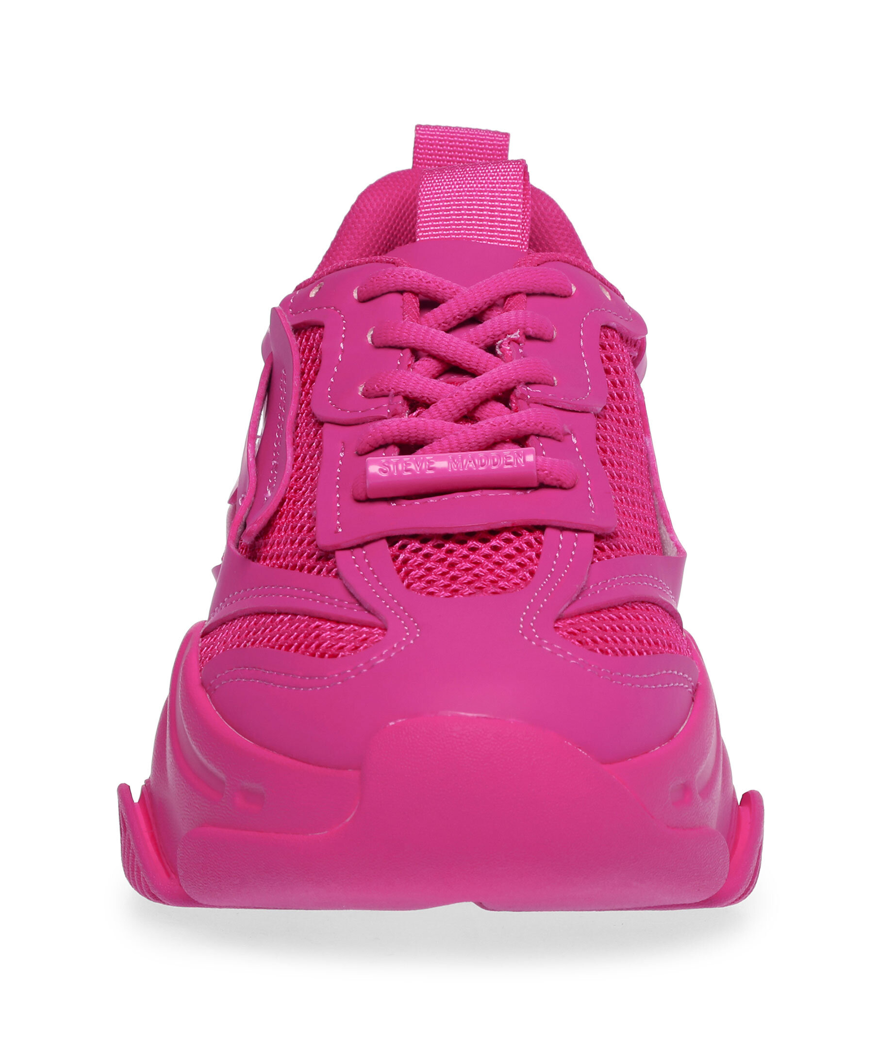Rosa sneakers från Steve Madden. Tillverkade i konstläder och mesh. Runda skosnören med metalldetalj med stansad logotyp. Ögla på hälen och plösen. Tryckt logotyp i svart på skons yttersida. Grov sula i gummi. Rund metallbricka bak på hälen. Denna sko är liten i storlek, vi rekommenderar dig därför att gå upp en storlek.