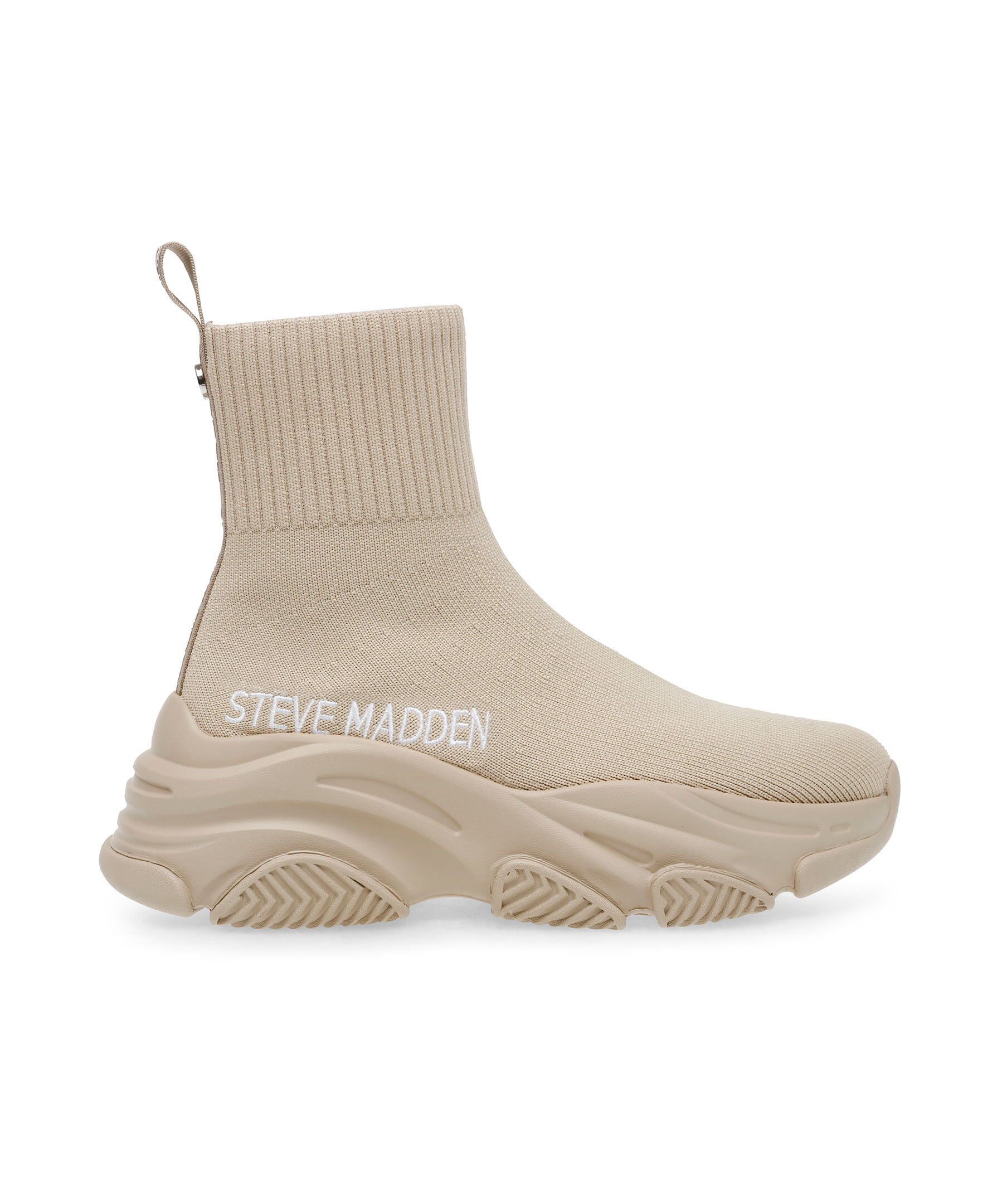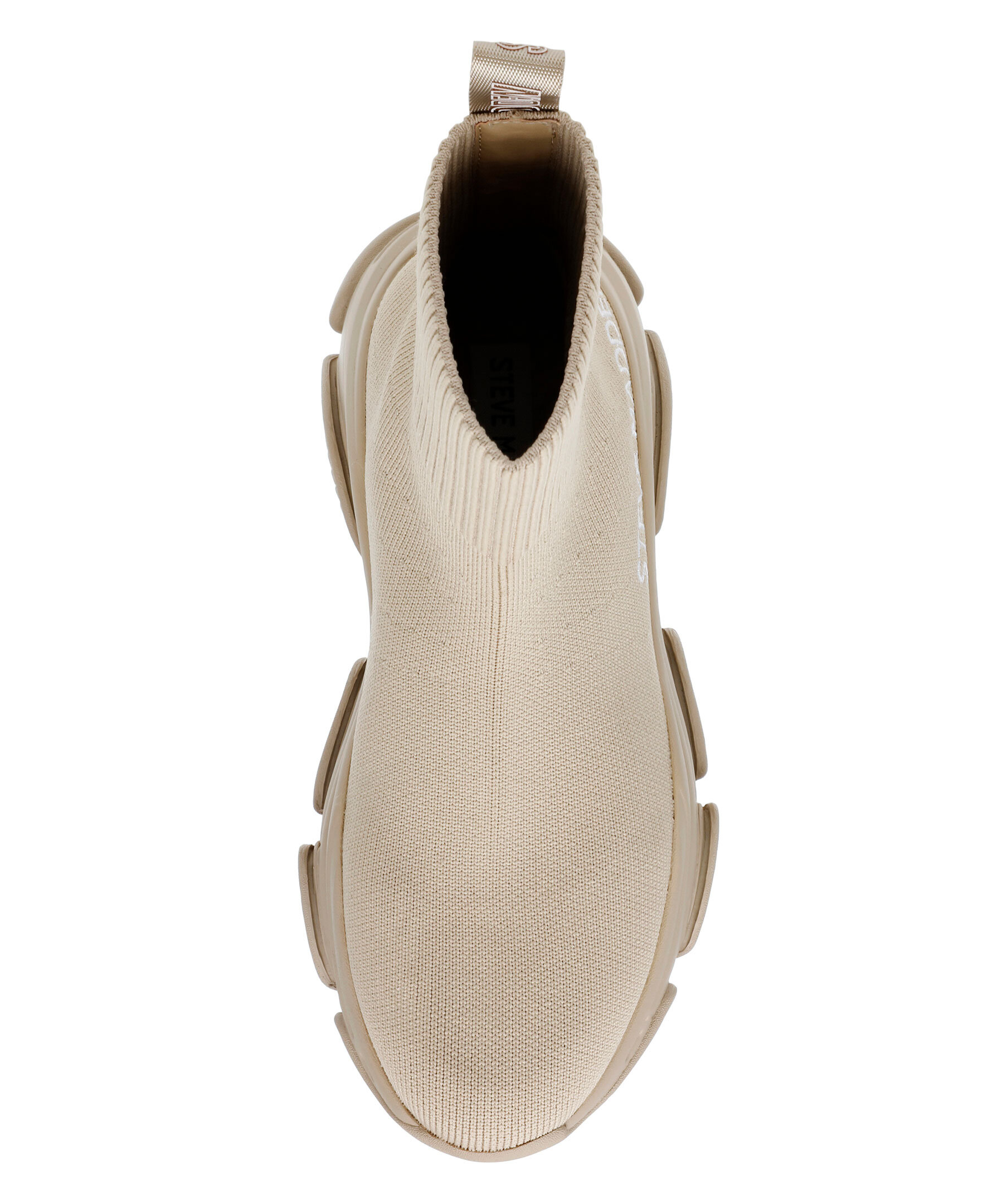 Beigea sockboots från Steve Madden. Grov sula i gummi. Broderad logotyp i vitt. På skons yttersida. Ögla i hälen med logotyp. Rund metallbricka bak på hälen.