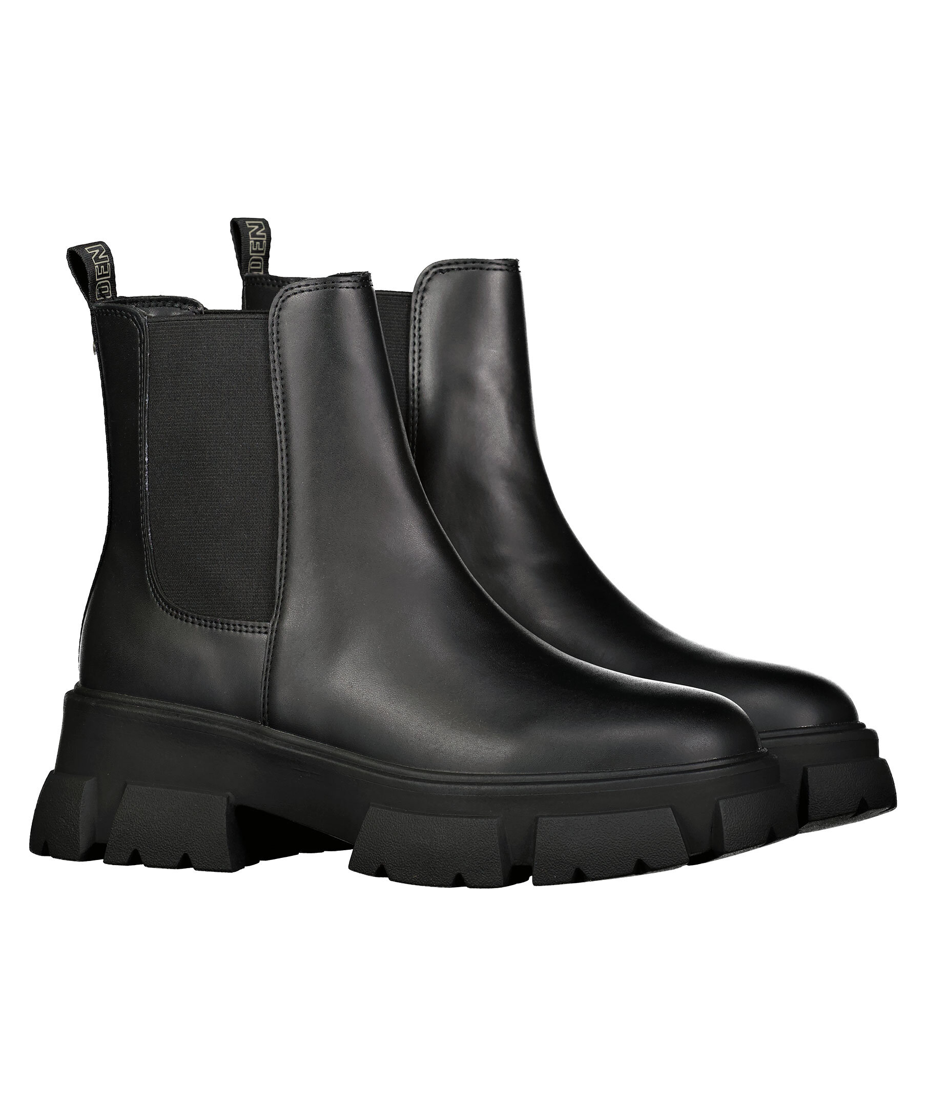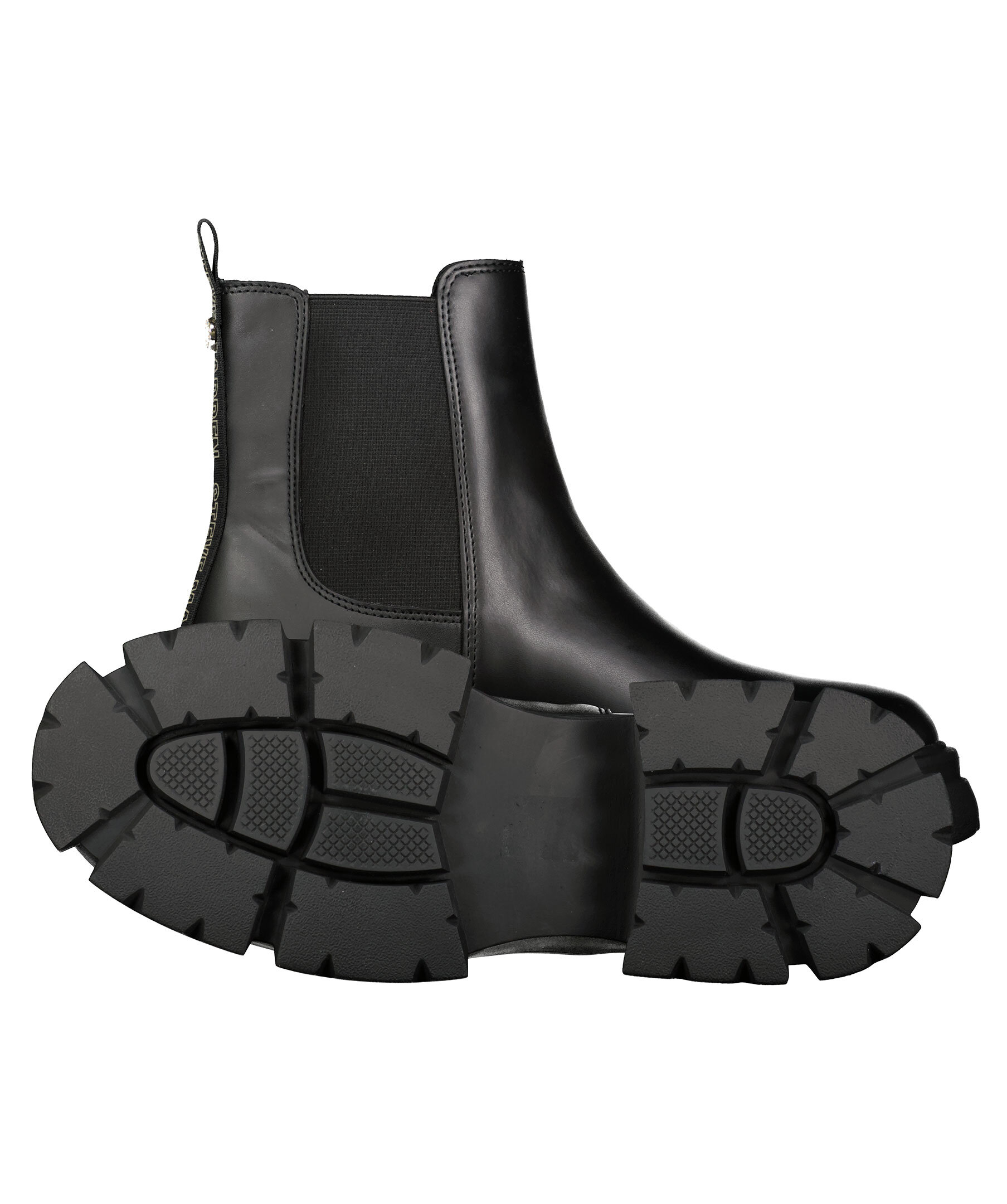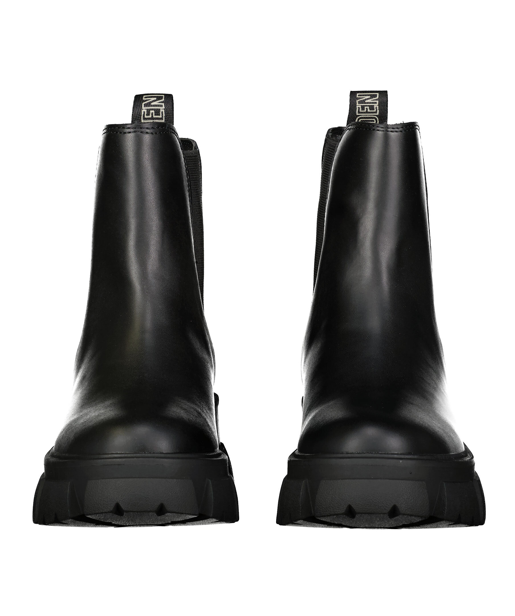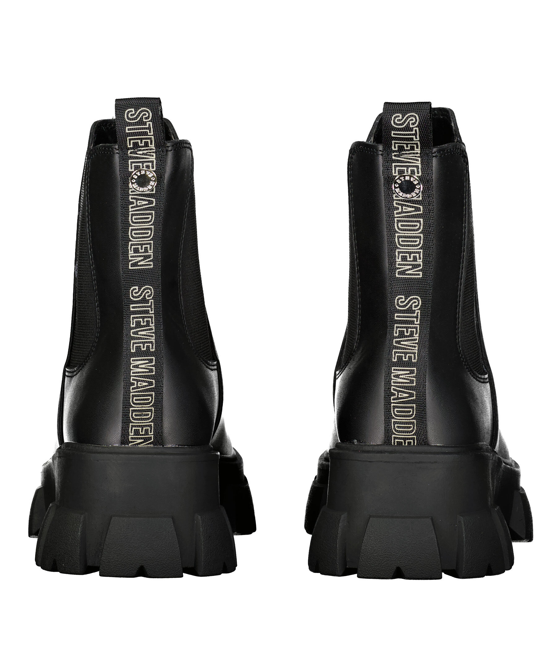 Svarta boots från Steve Madden med en grov sula. Tillverkad i läder och har en tjock sula i gummi. Rundad tå och logotyp i textil längs med ankeln baktill. Normal i storlek. Skafthöjd: 14 cm, Skaftbredd: 26 cm, Klackhöjd: 6 cm.