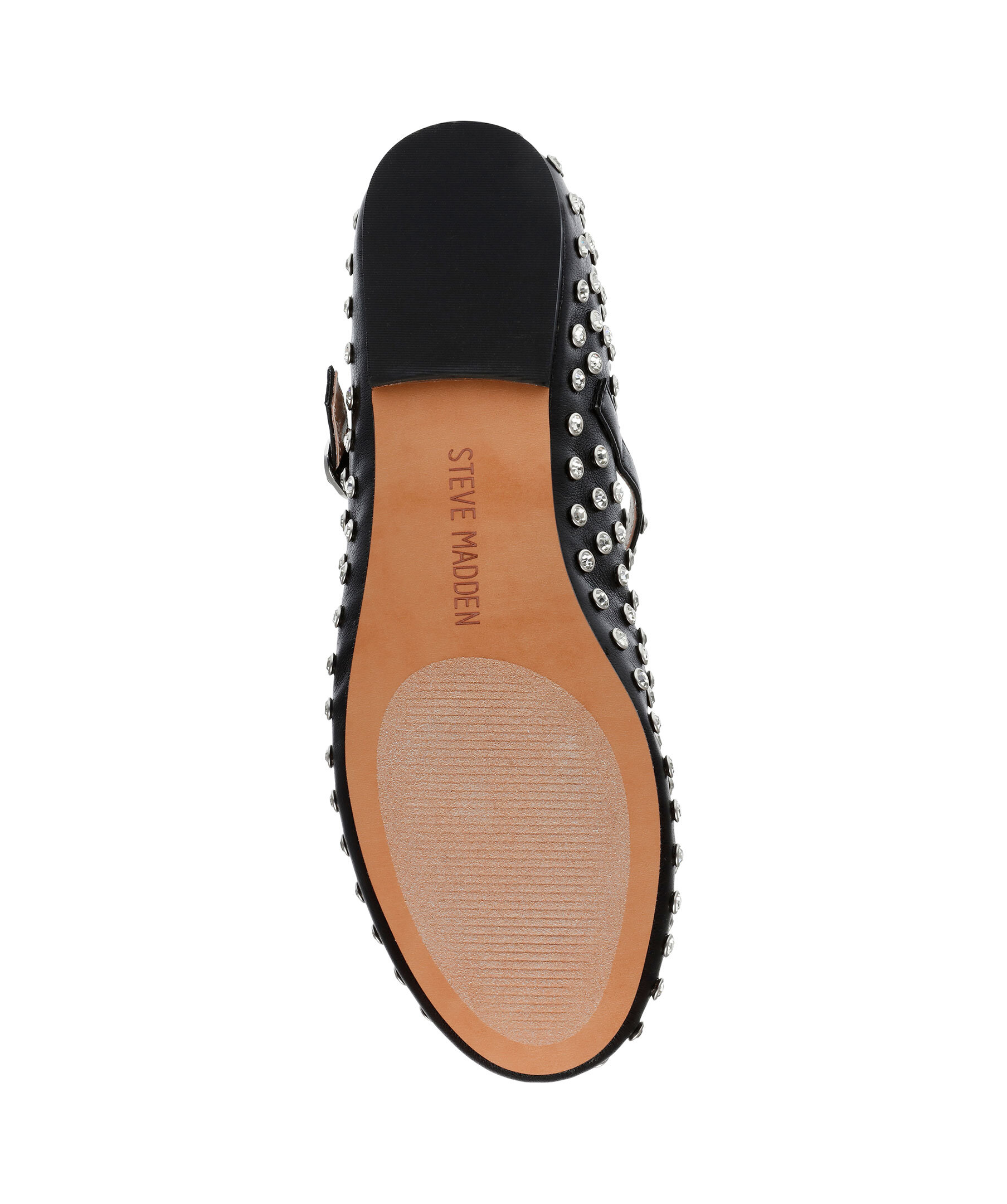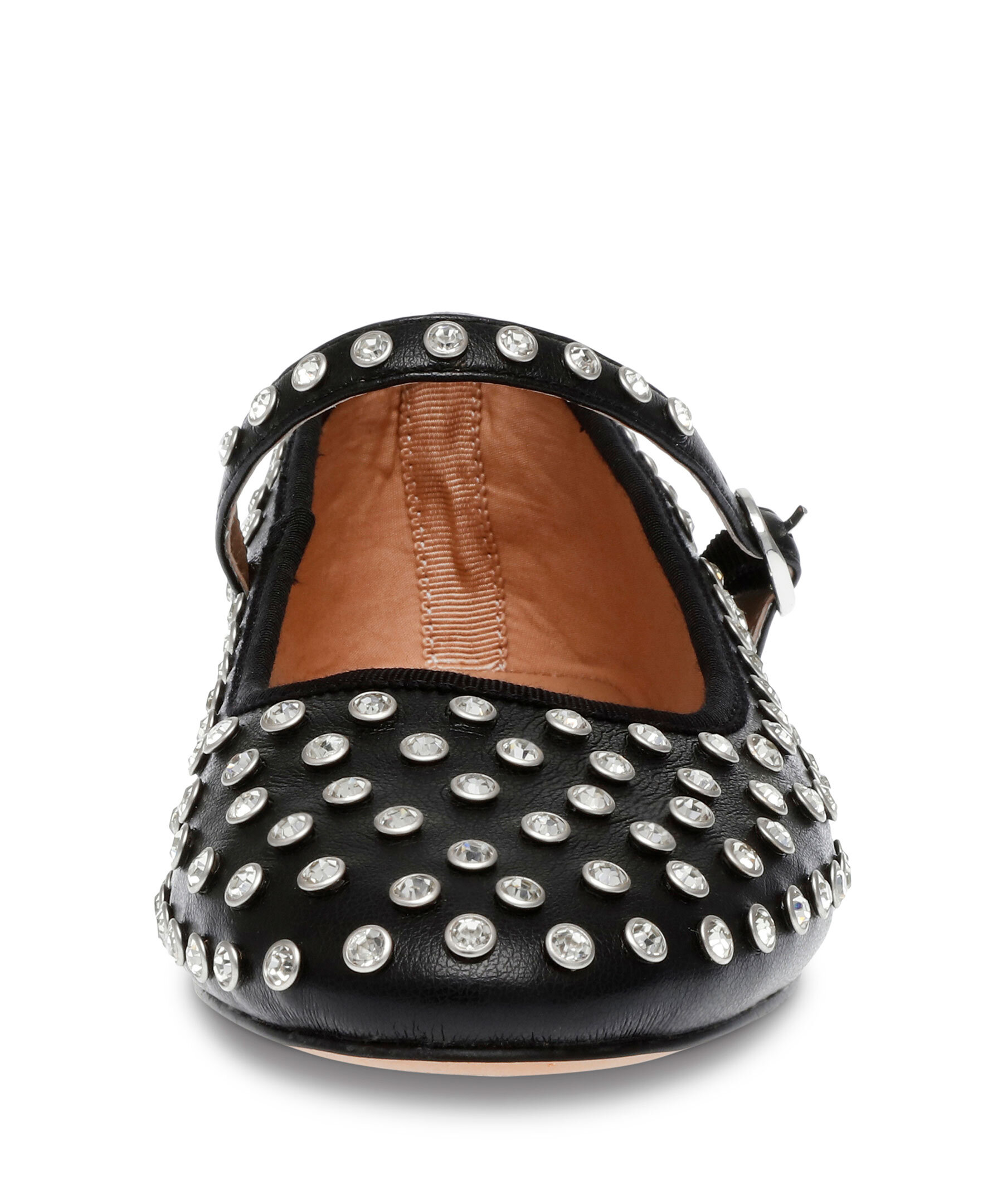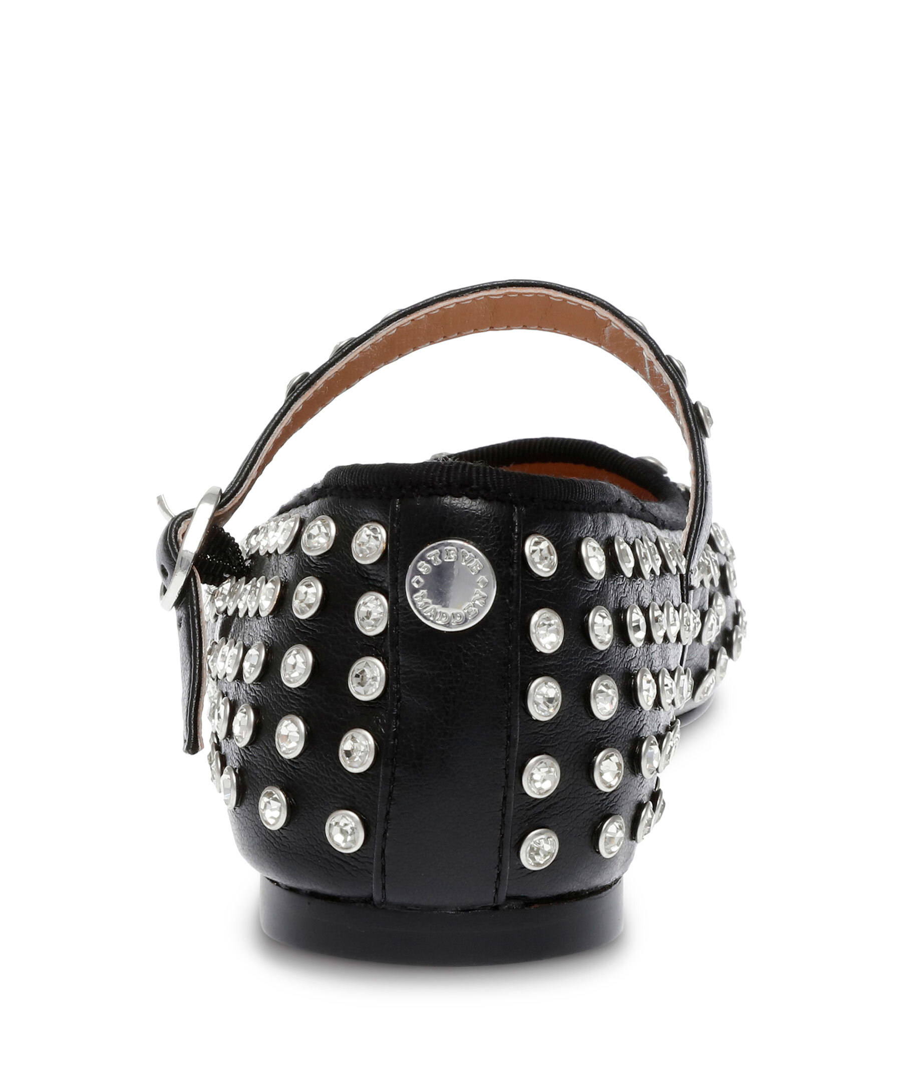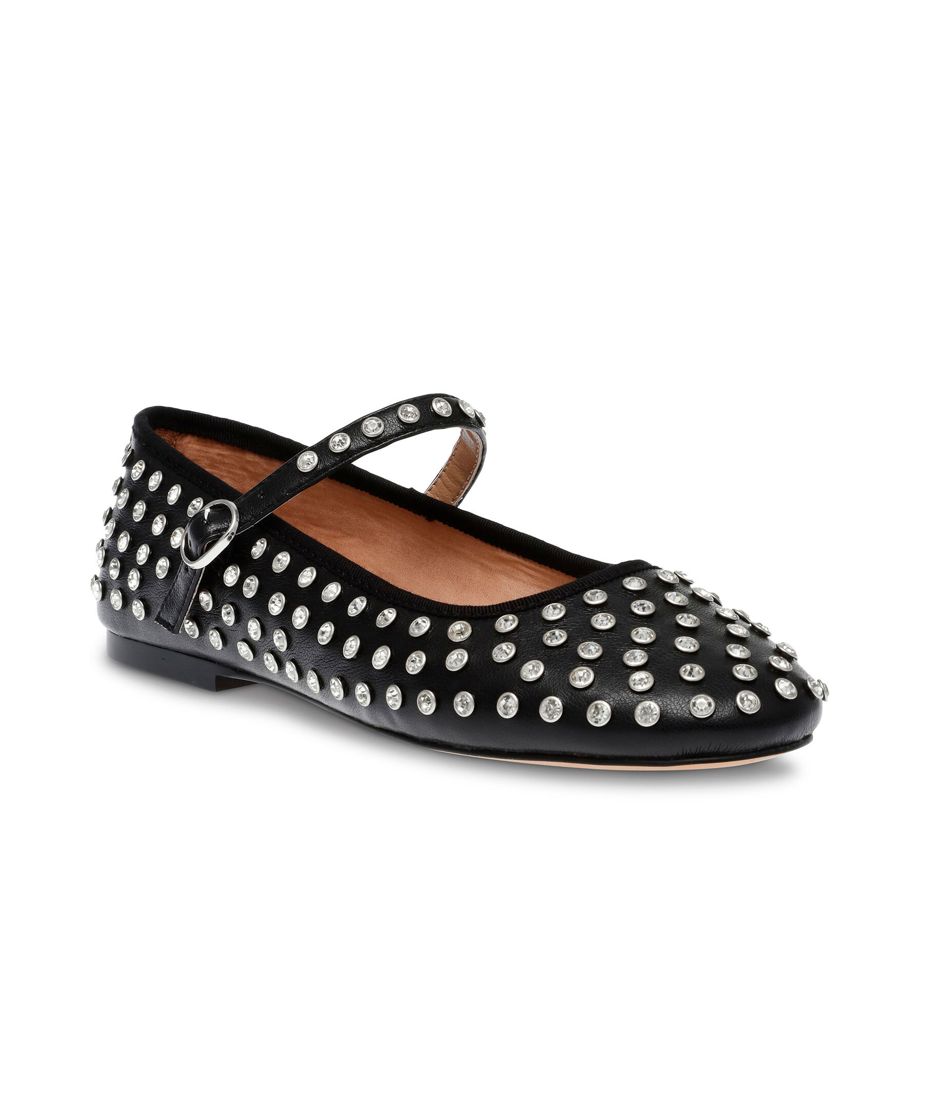 Svarta ballerinaskor från Steve Madden. Skorna har en platt sula och ett smalt spännband över foten. Strassnitar över hela skon. Tillverkade i ett syntetisk material.