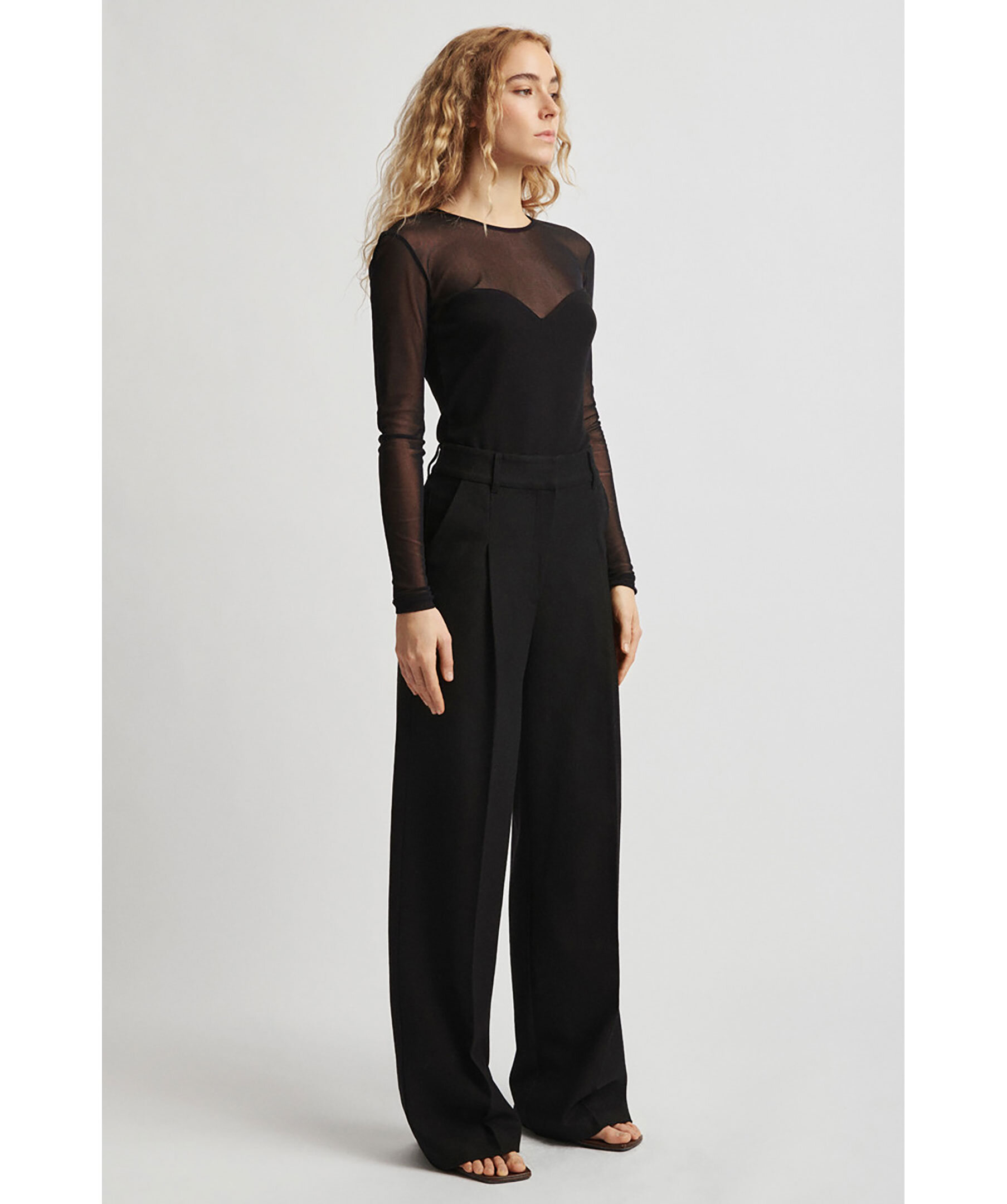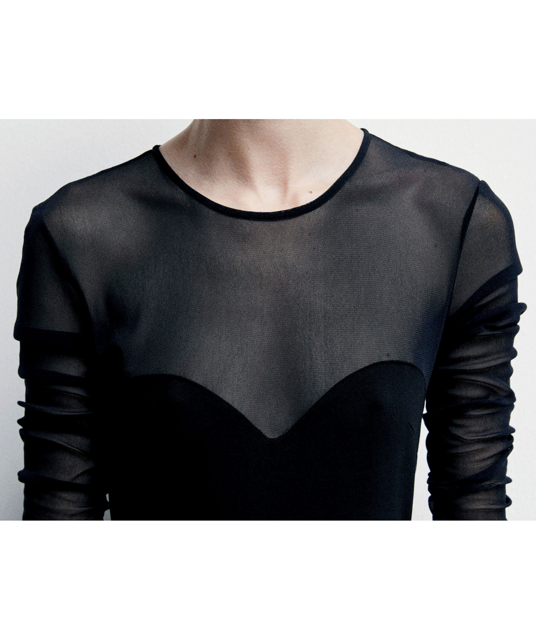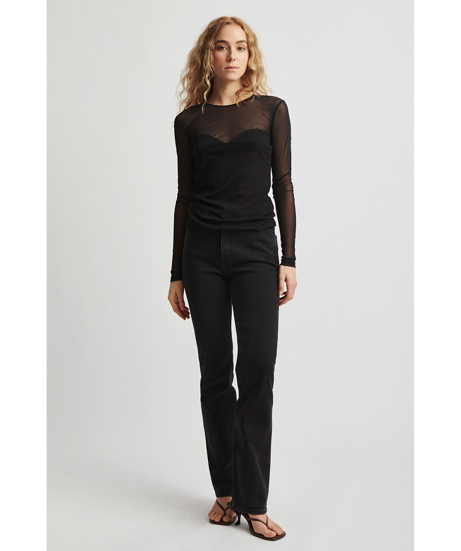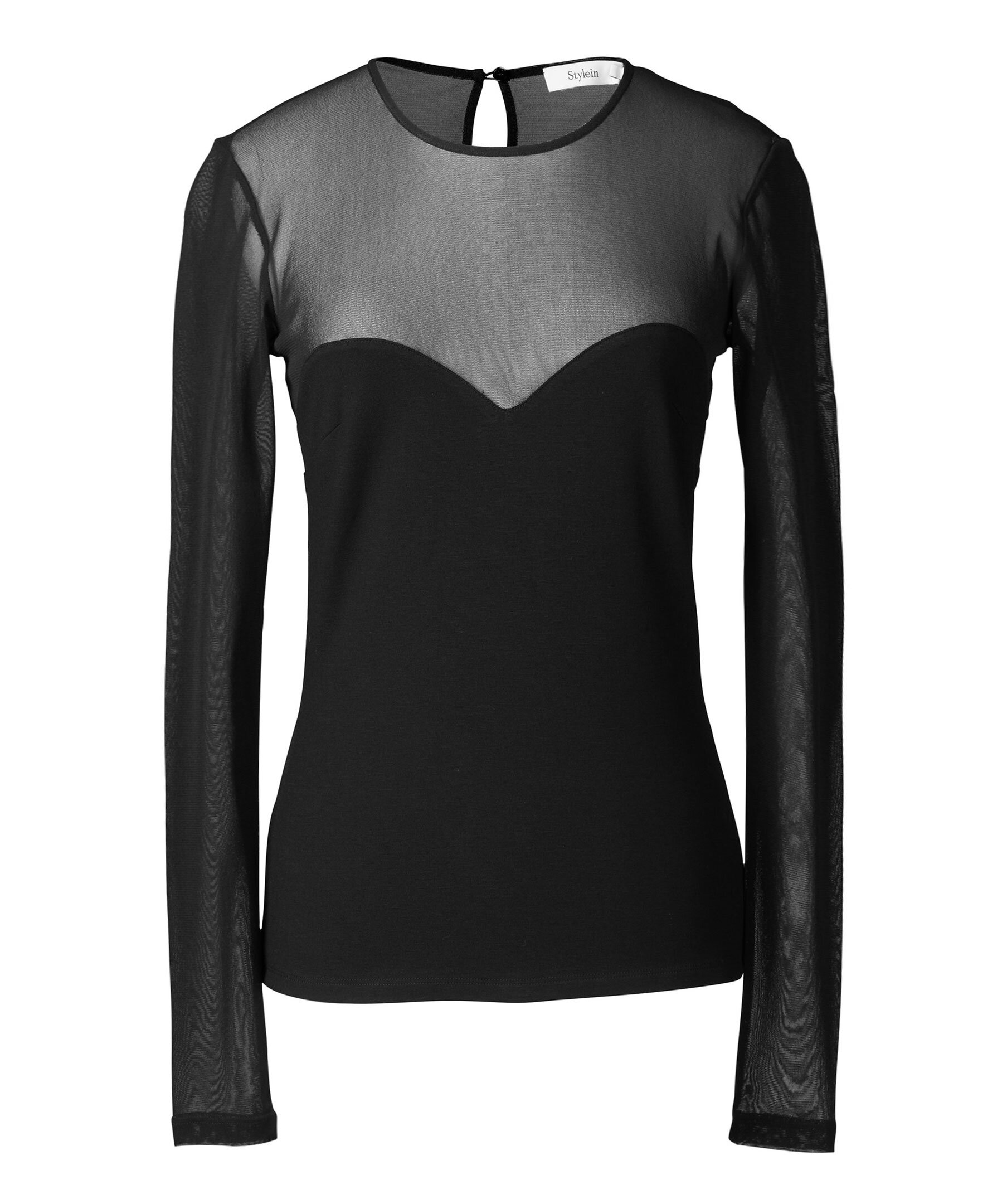 Svart slimmad topp från Stylein. Sweetheart ringning med mesh upptill. Långa ärmar i mesh. Rundad hals. Knapp baktill för stängning. Tillverkad av jersey tyg och en mesh blandning.